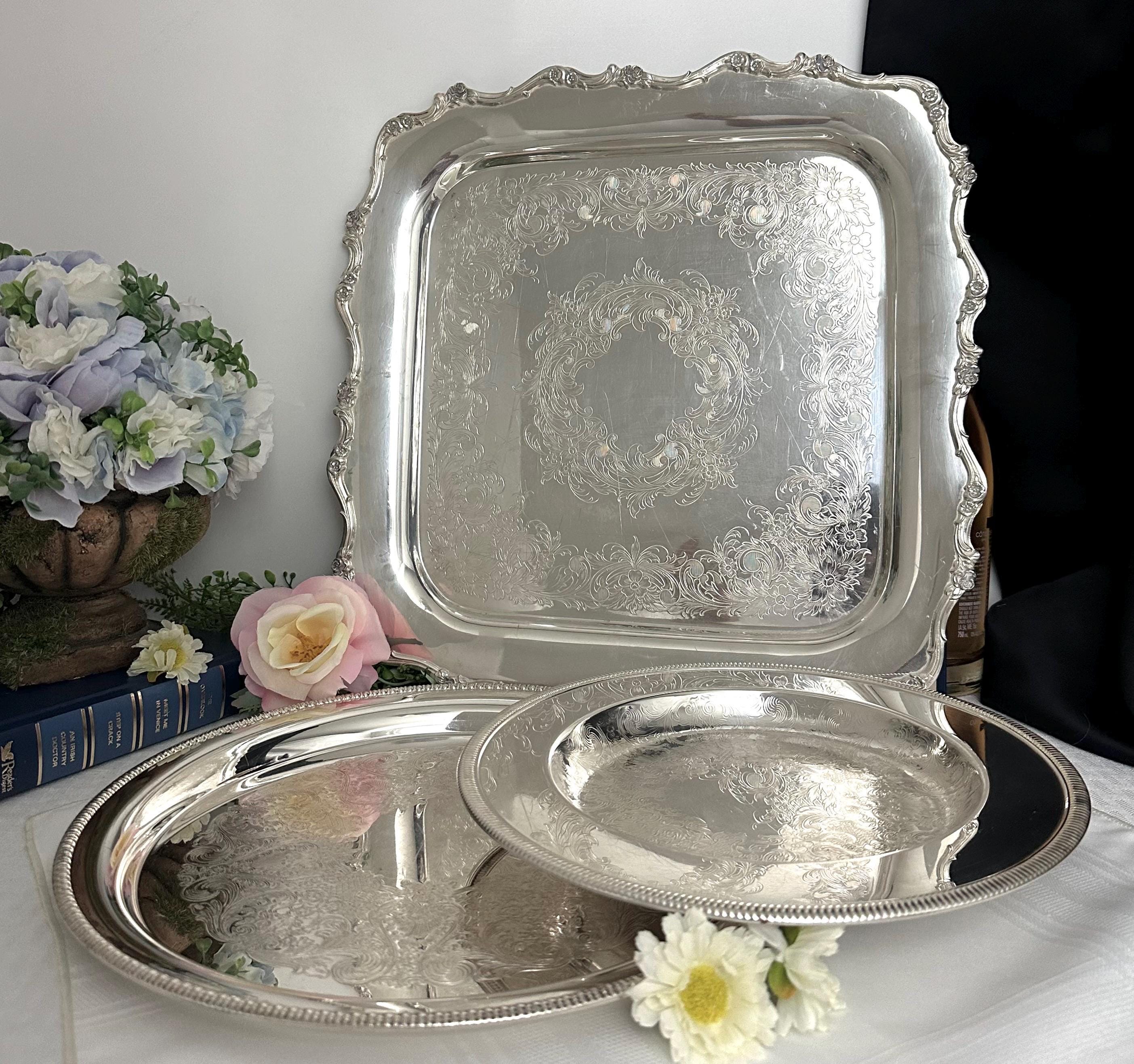 The trays are: 1- Square from Wilcox in the American Rose Pattern measuring 15 x15 inches, 1 - 12 inch diameter round tray with unknown maker, 1 - 10 inch round from unknown maker. There are surface scratches on them noted in the pictures.