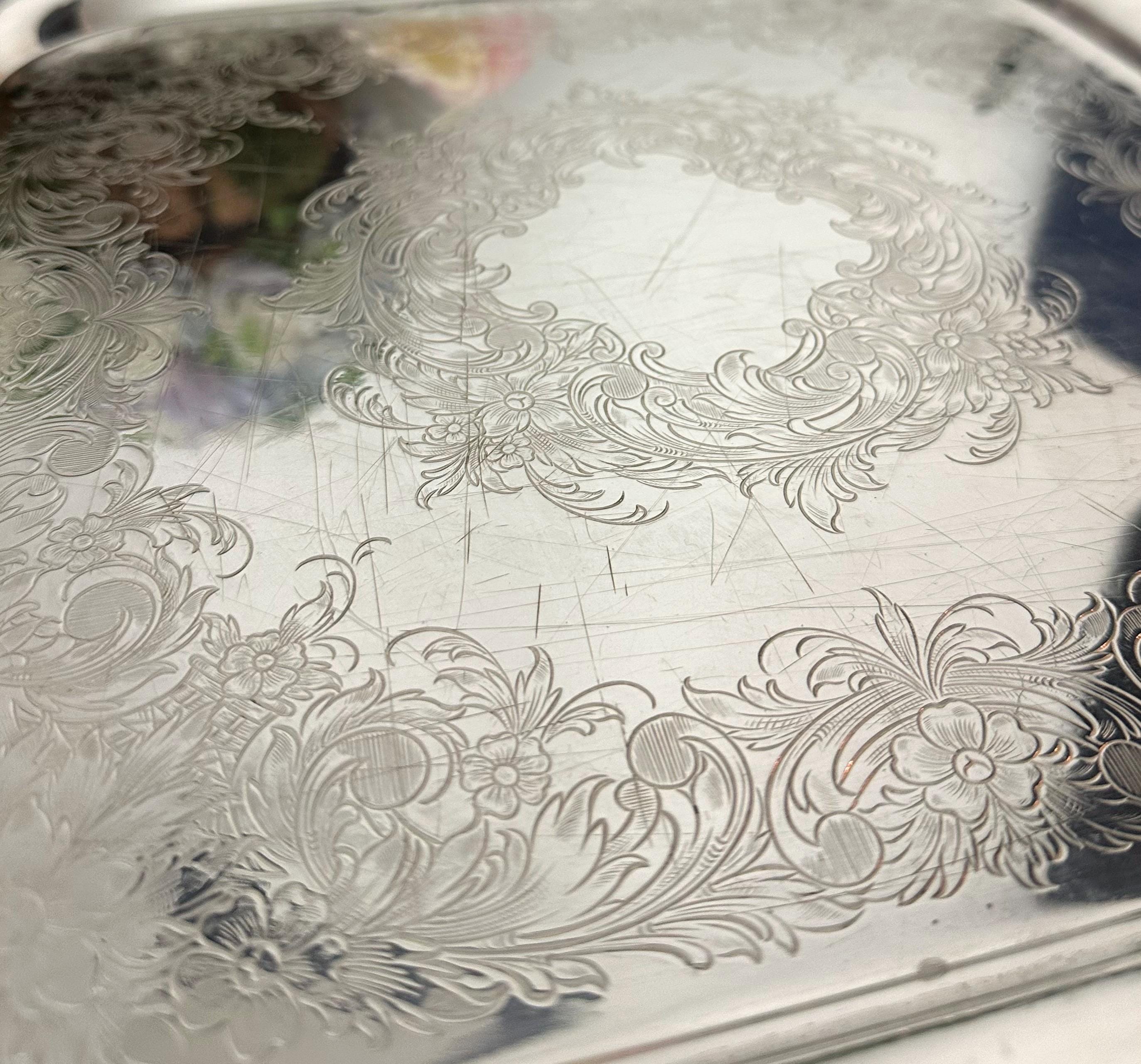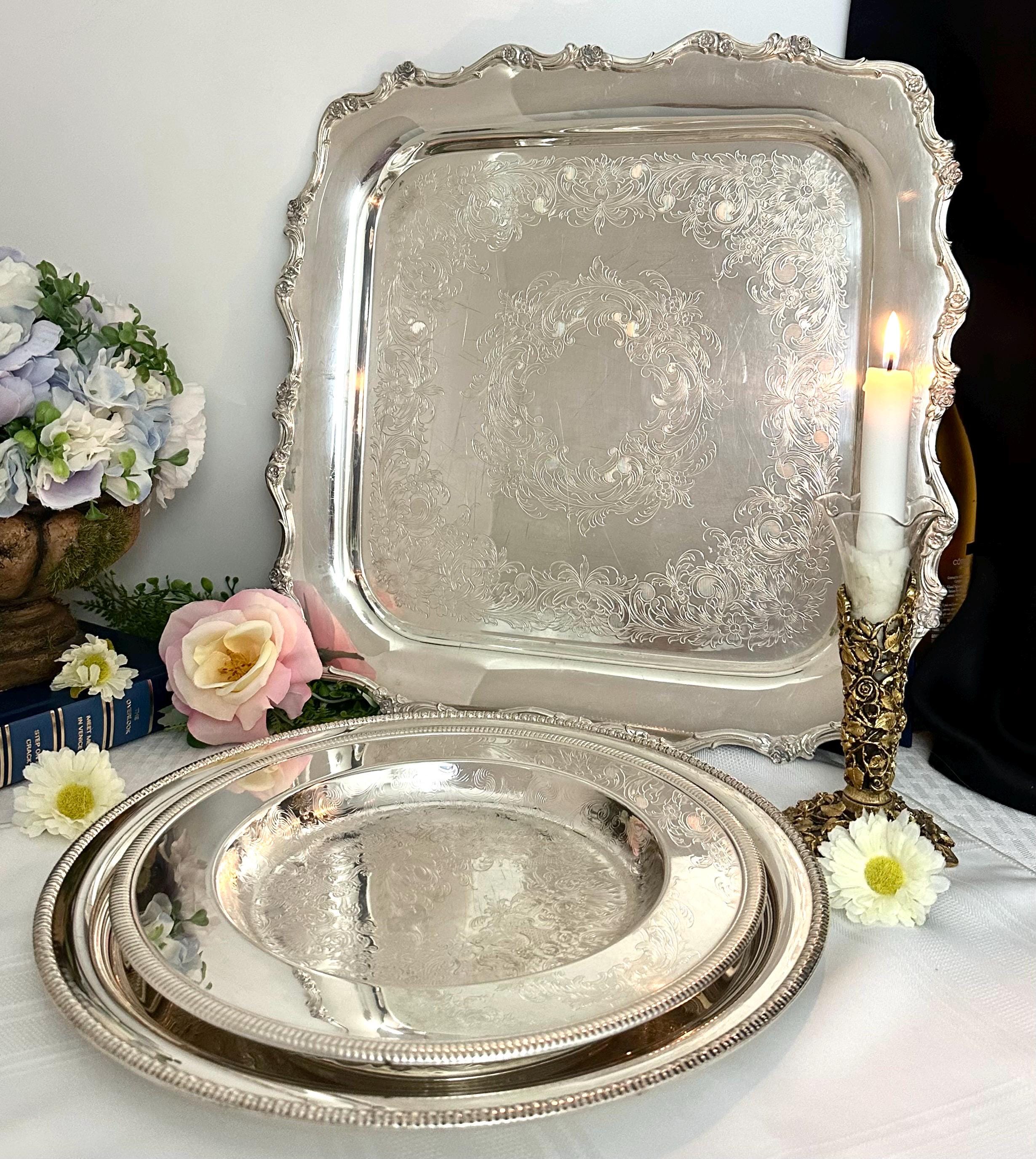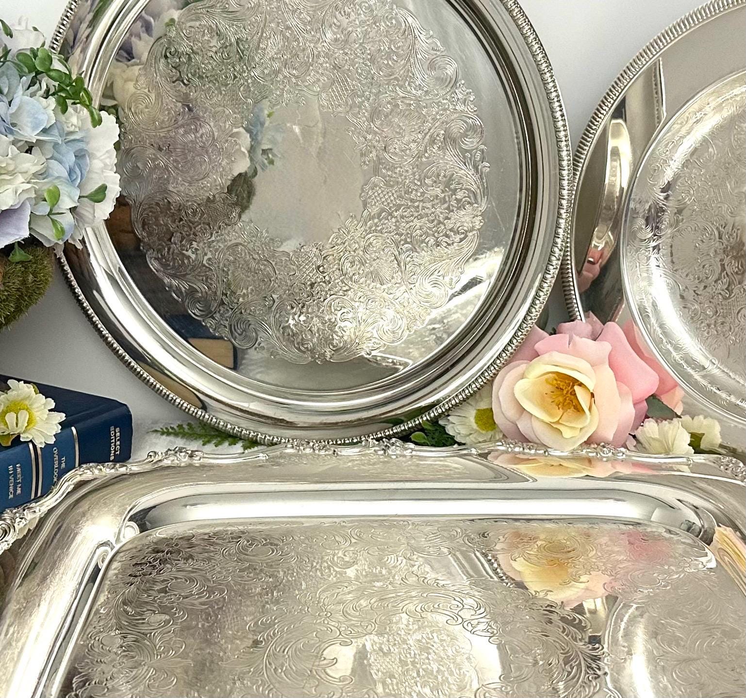 This is for a set of vintage silver plated serving trays with a mixed pattern designs. These trays are in various sizes, making them versatile for serving tea or other items in style. The silver plated composition adds a touch of elegance and sophistication to any tea or serving experience, perfect for adding a touch of vintage charm to your home or special occasions.
