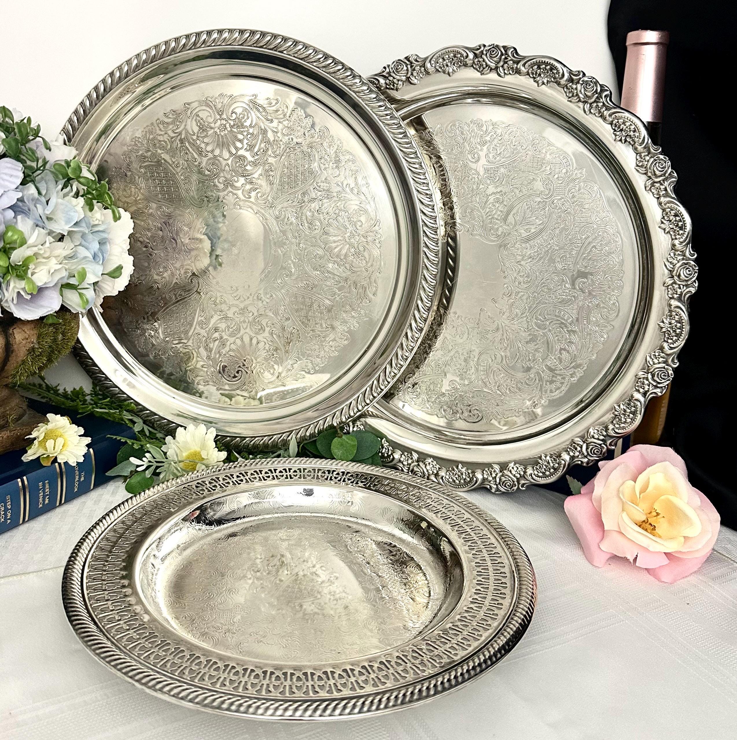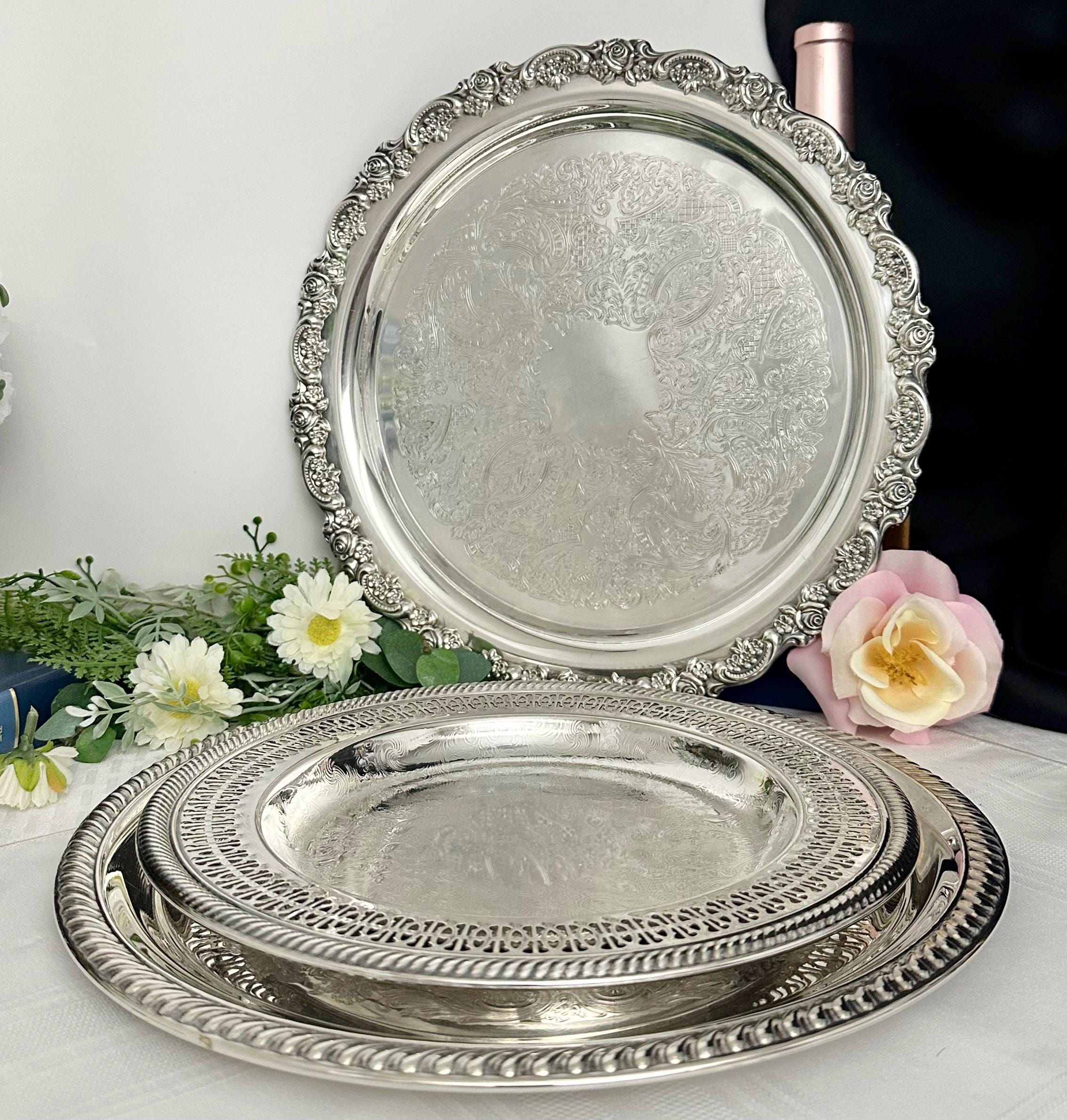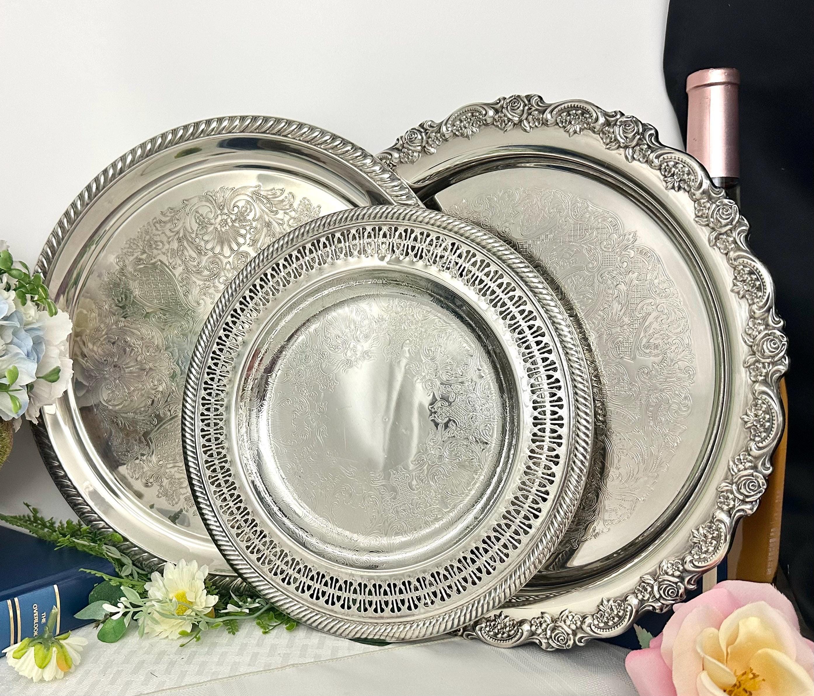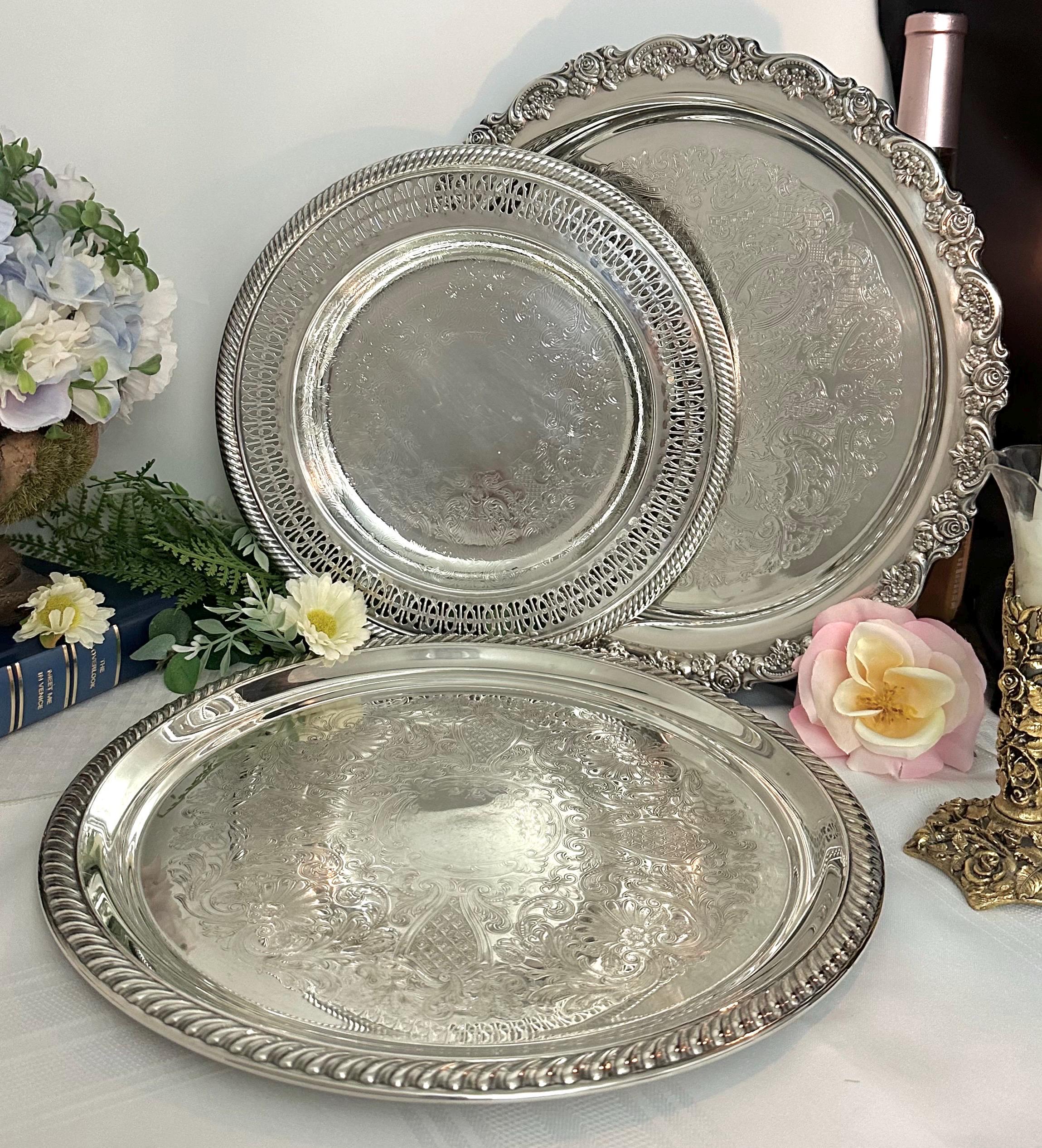 Included are - 1 International Silver tray measuring 10 inch diameter, 1 - Oneida tray measuring 12.25 inches and 1 - Alvin tray measuring 12 inches. These will have vintage surface scratches on them noted in the pictures.