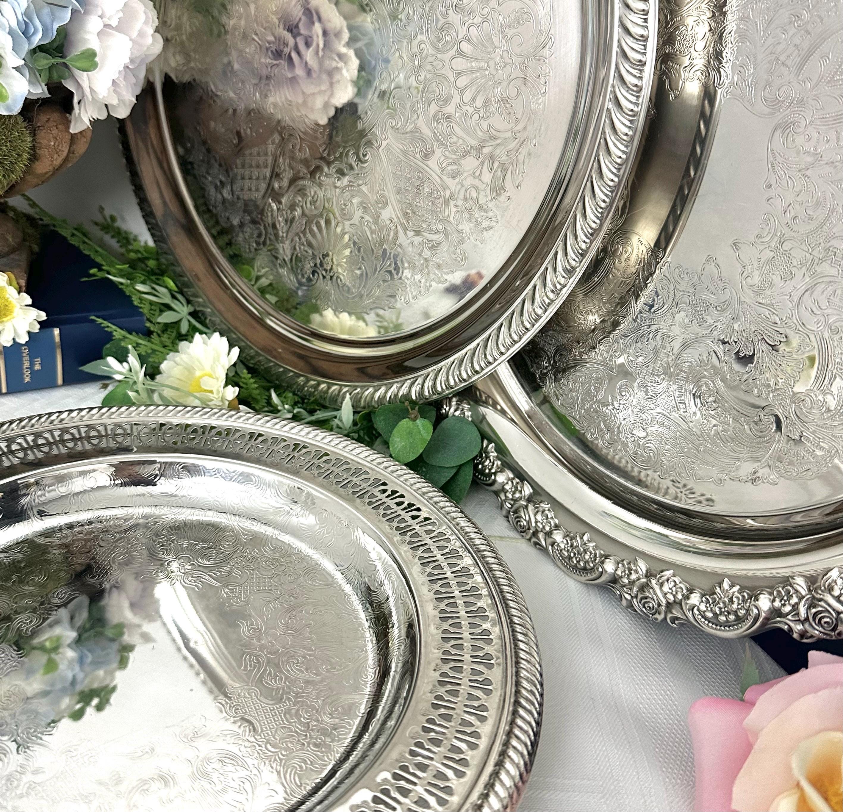 This is for a set of vintage silver plated serving trays, perfect for adding a touch of elegance to any tea or coffee service. The trays feature a mixed pattern design and are made of silver plate, giving them a luxurious and timeless look. Perfect for use as decorative pieces or for serving food, these trays are sure to enhance the charm of any table setting.