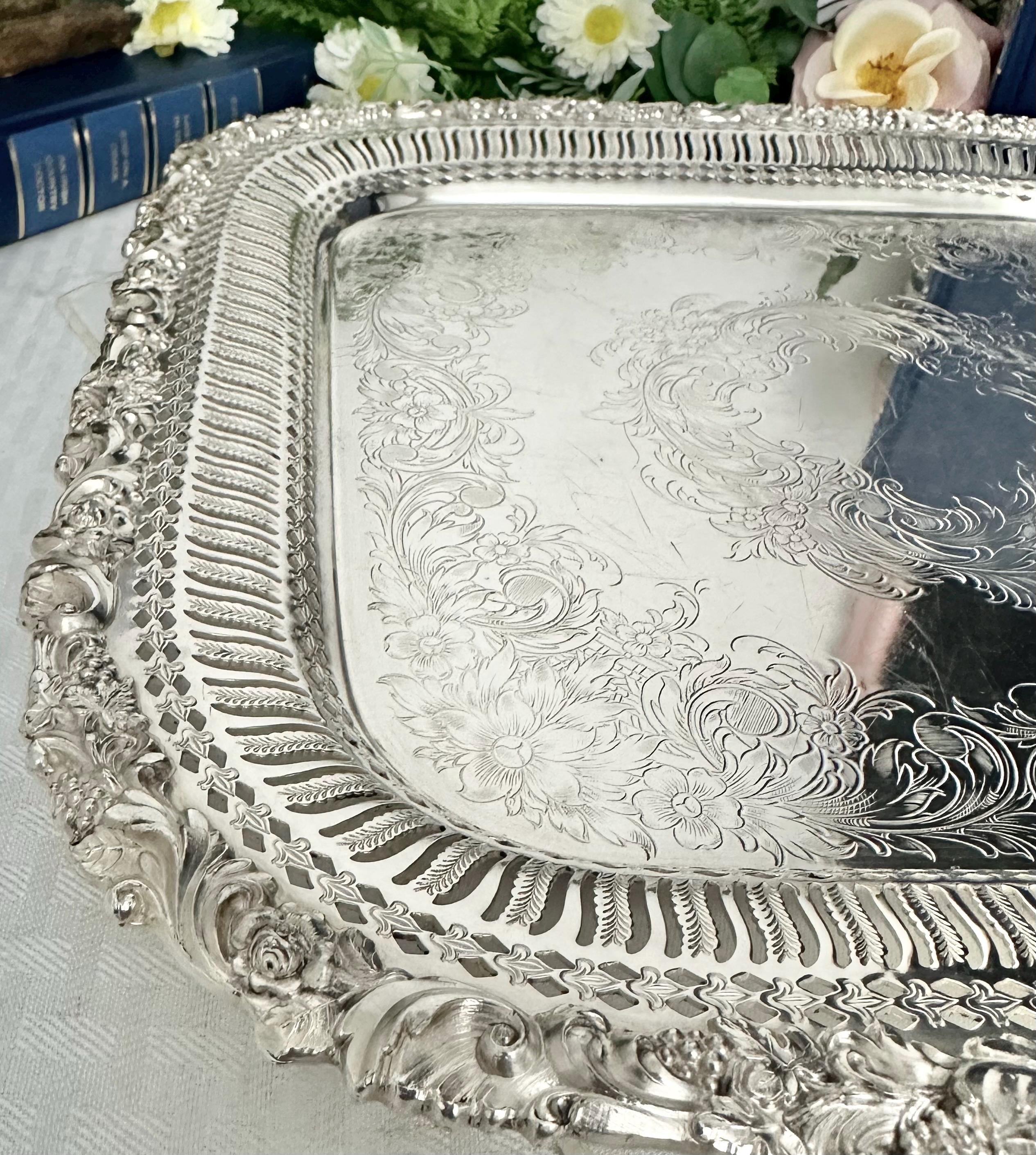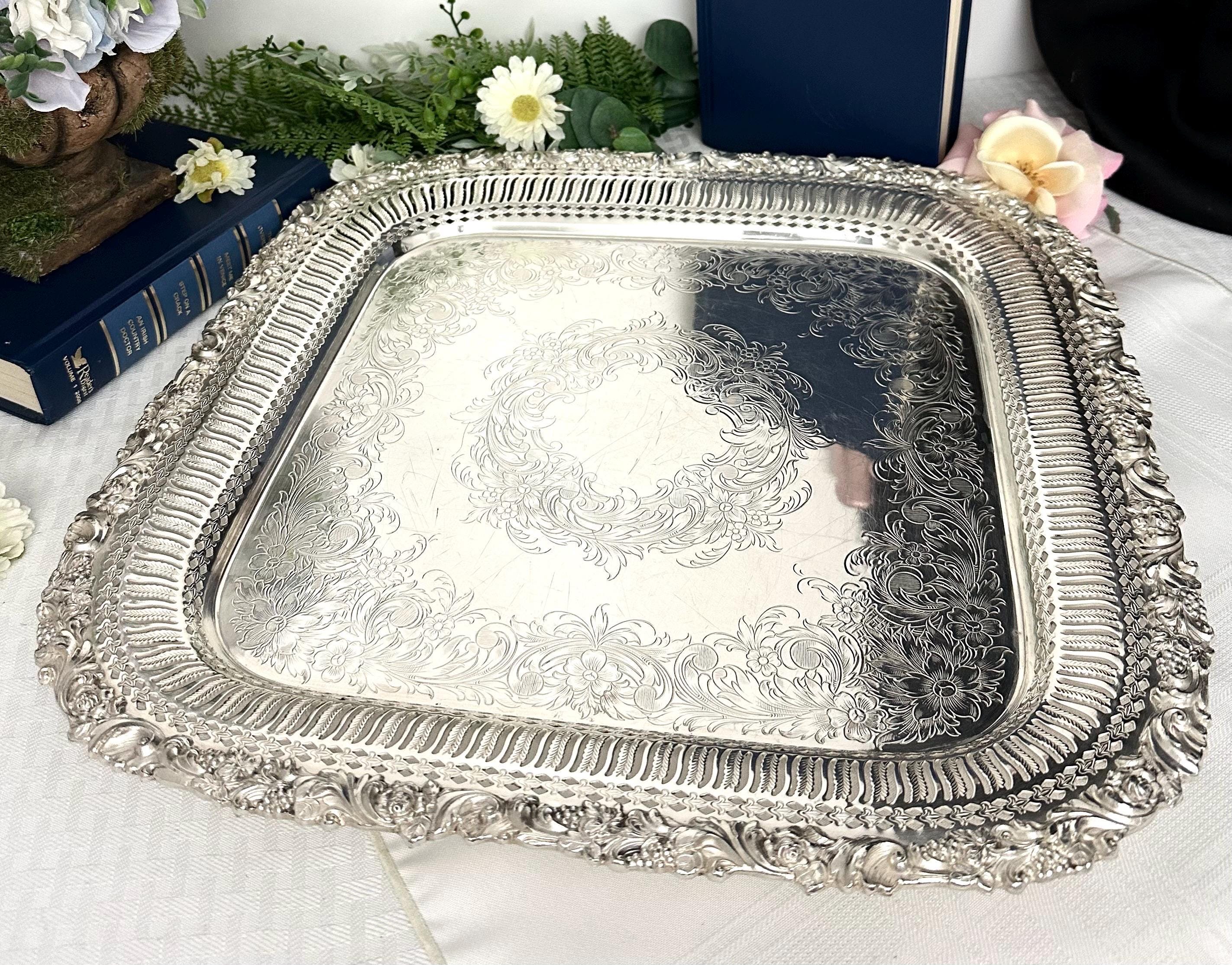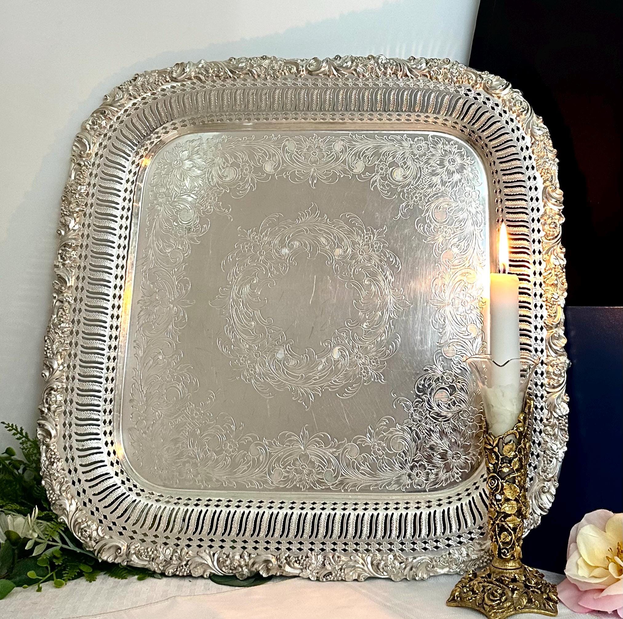This high-quality ornate Silver Plated tea service Tray is a vintage piece with a square shape and a pierced edge design, giving it a Victorian style. The tray is made of silver plate and has a depth and width of 16 inches - providing ample space for serving and displaying various items. This would have been used as a Serving tray, tea set tray or Butler's Tray.