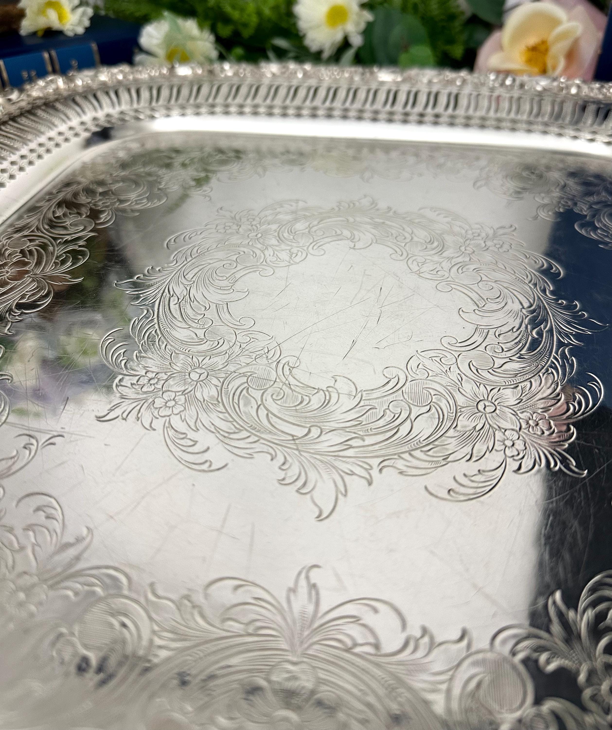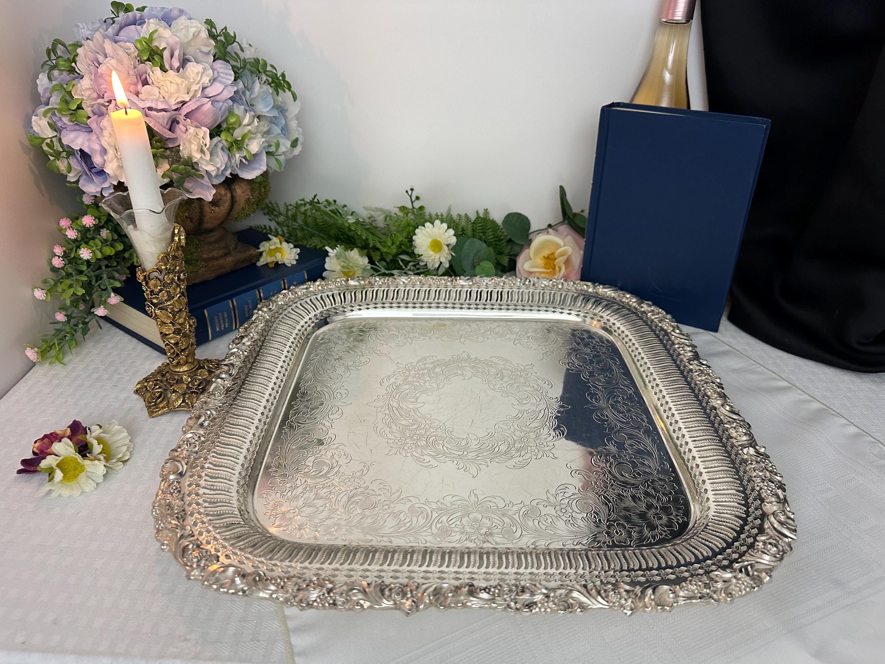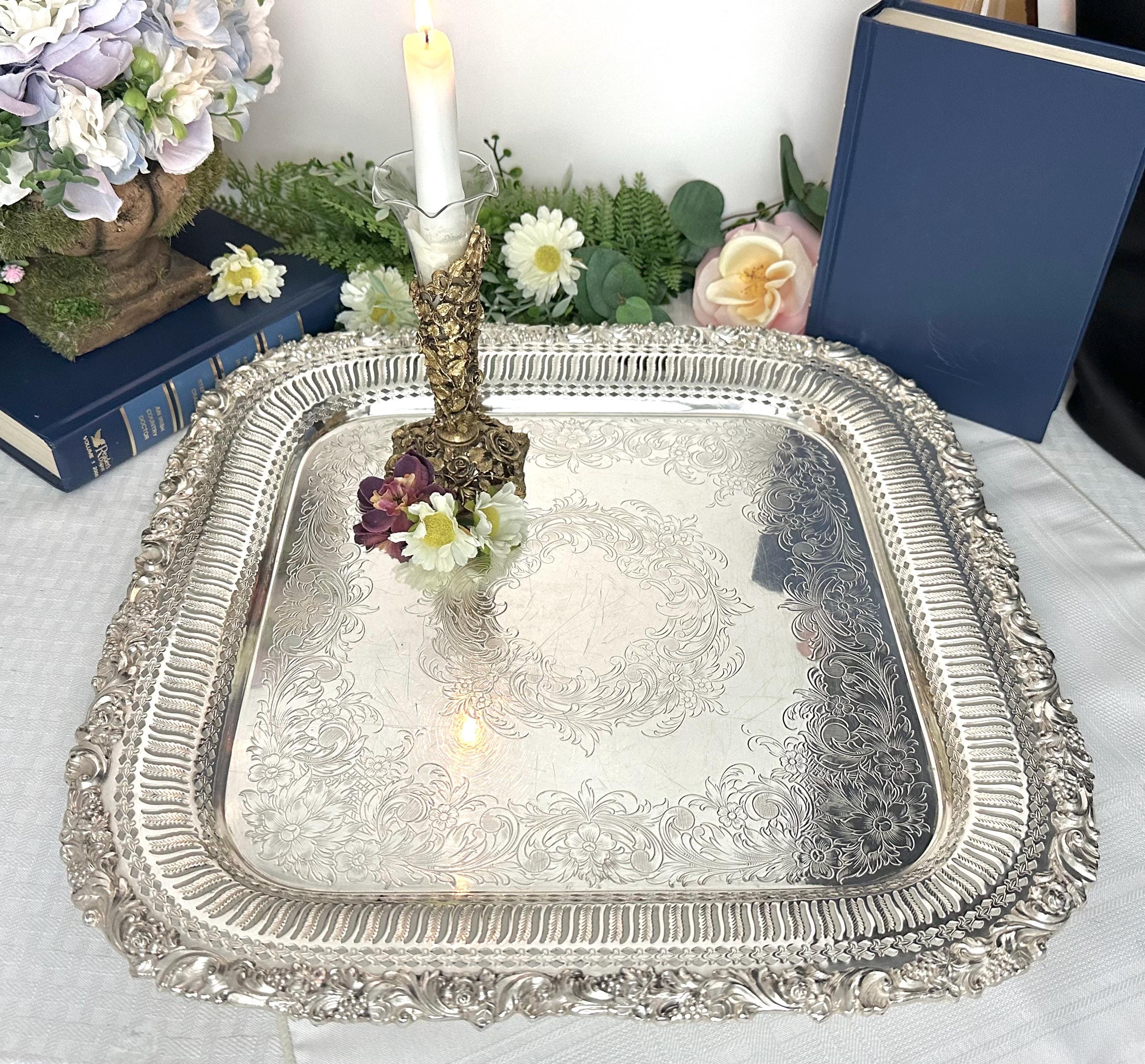 This high-quality ornate Silver Plated tea service Tray is a vintage piece with a square shape and a pierced edge design, giving it a Victorian style. The tray is made of silver plate and has a depth and width of 16 inches - providing ample space for serving and displaying various items. This would have been used as a Serving tray, tea set tray or Butler's Tray.