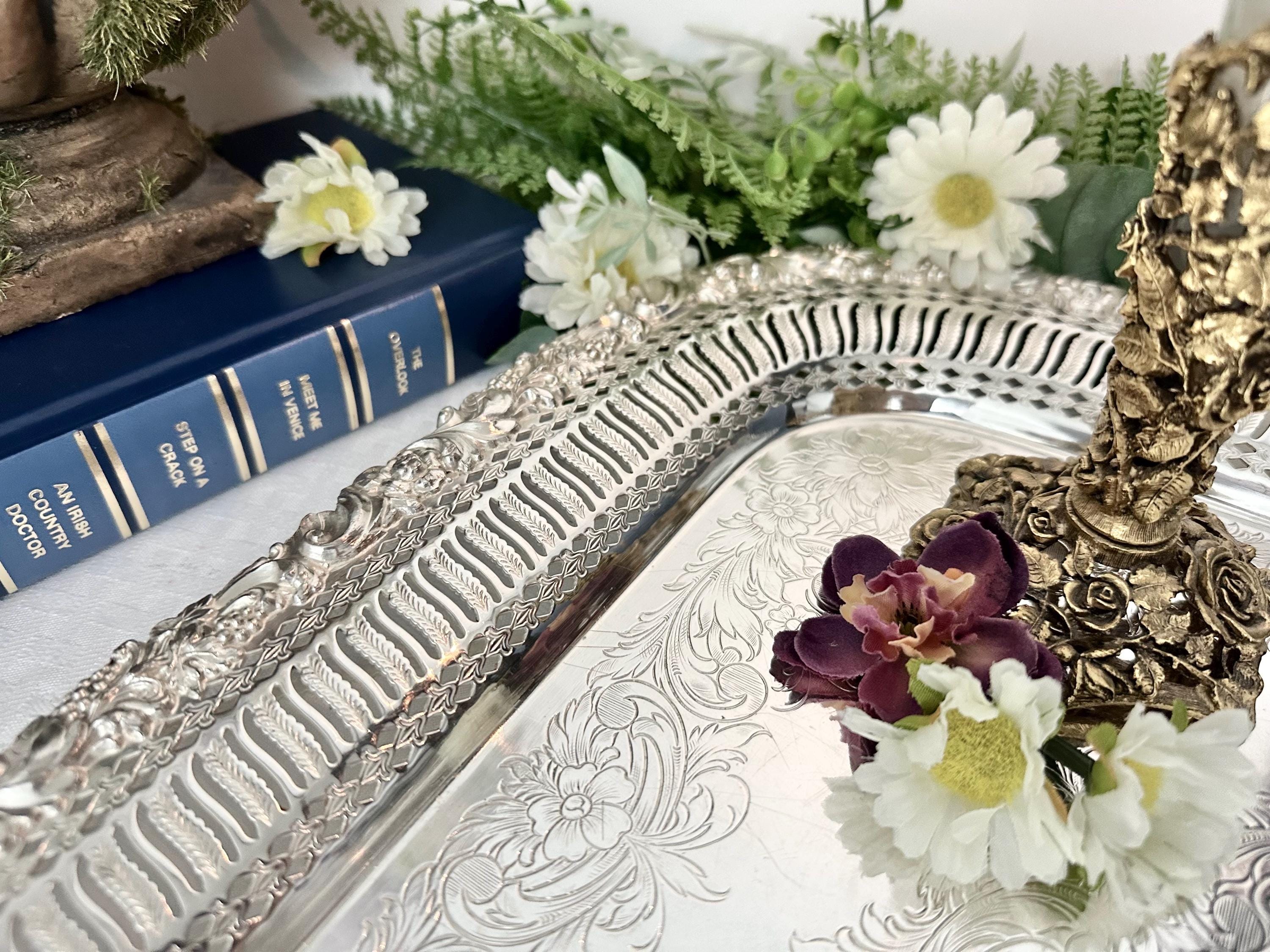 Its antique charm and elegant design make it a versatile piece that can add a touch of sophistication to any table setting or display. The piece is very intricate with the edge and the floral design and piercing. There are age appropriate surface scratches as noted in the pictures with the silver plate being in wonderful condition as noted in the pictures.