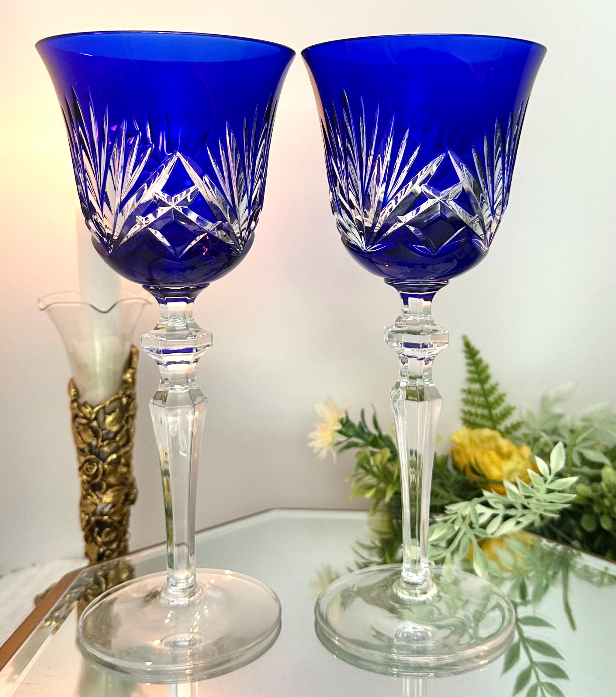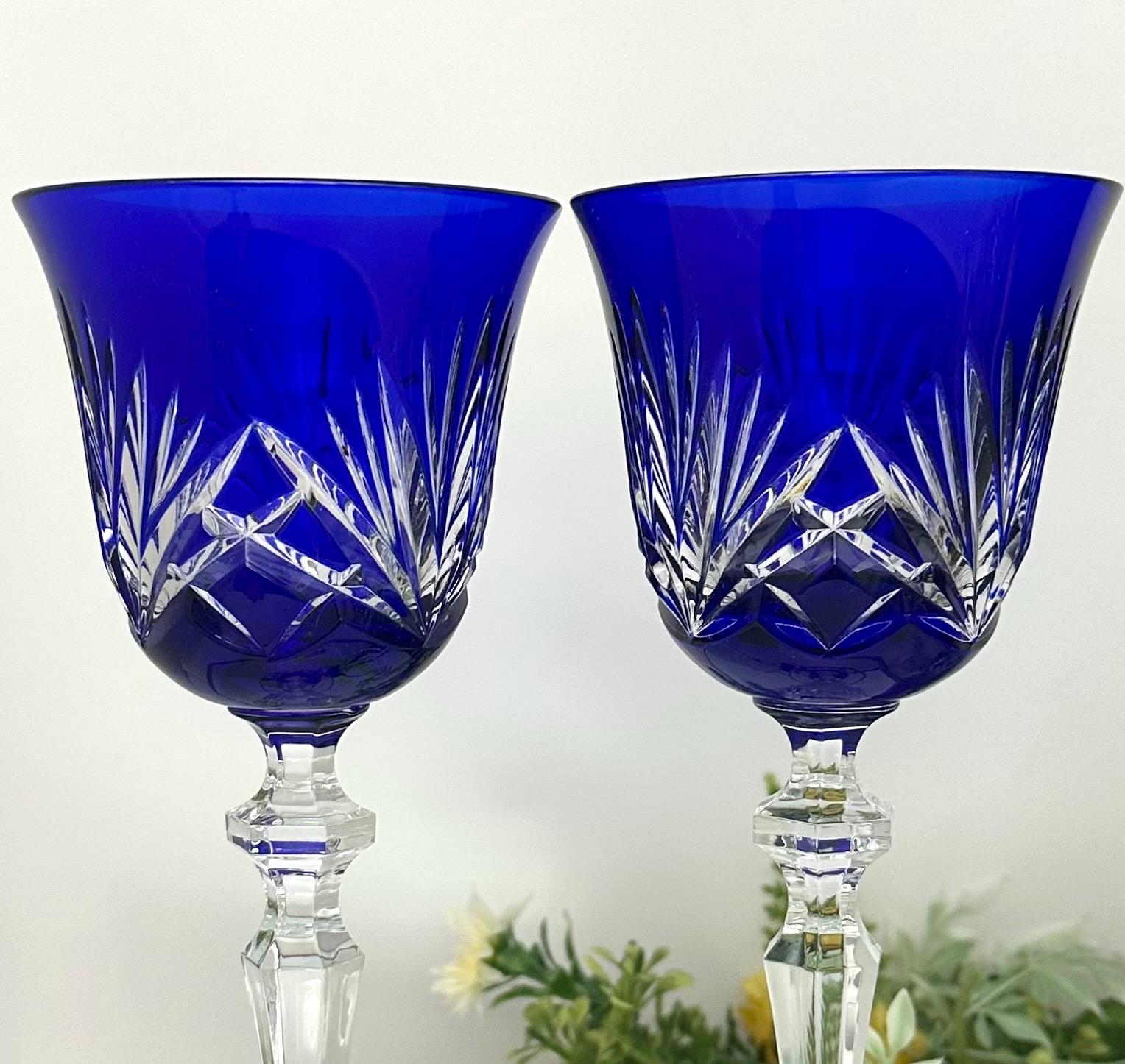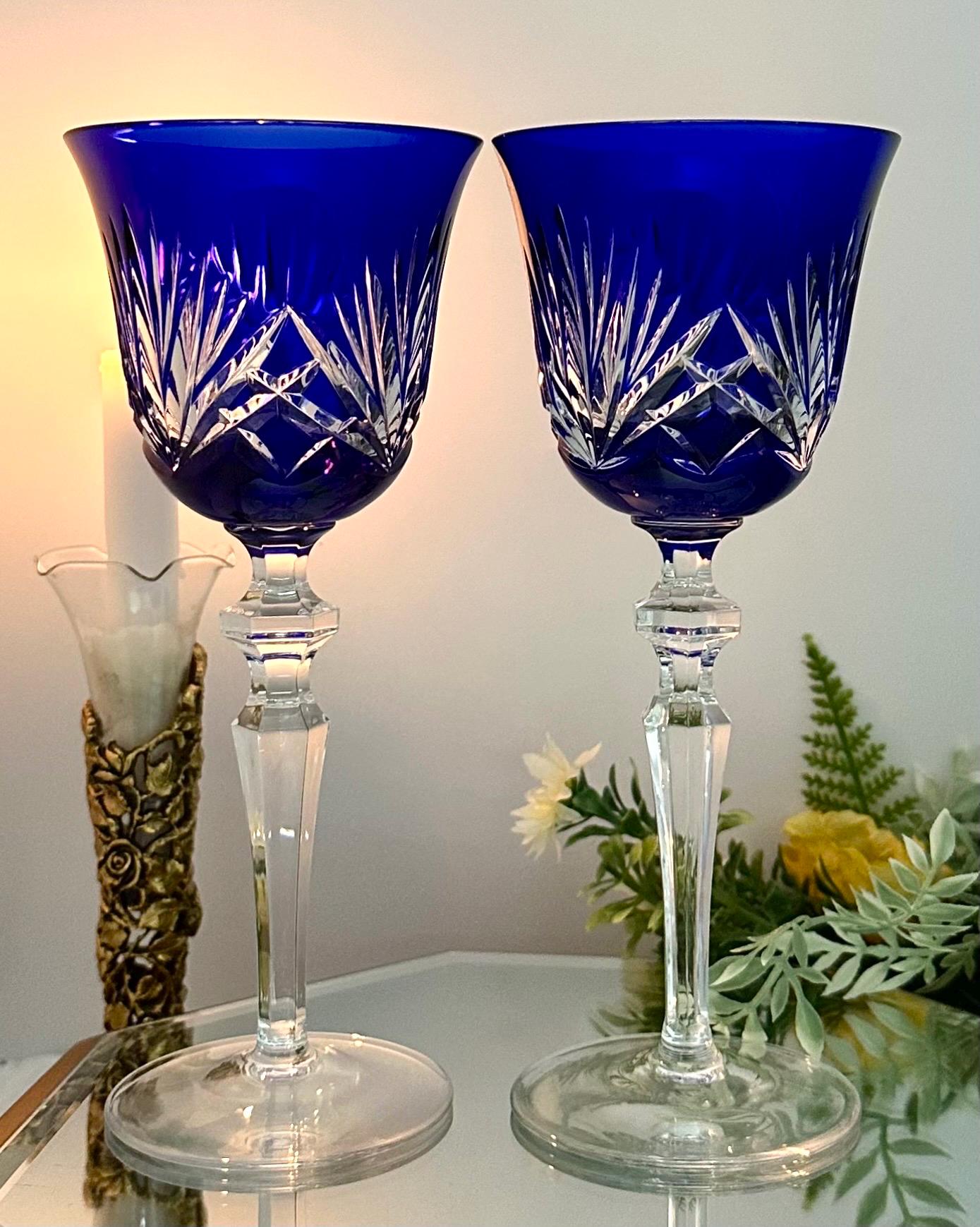 Handmade in Germany during the 1960s to 1999, these Bohemian-style glasses feature fan cuts on the bowl and a striking cobalt blue color. The 8 1/4 inch wine hocks are perfect for all occasions and should be hand washed to maintain their original beauty. These collectible items from Gorham will make for a charming addition to any barware collection, showcasing the artistry and craftsmanship of vintage glassware.