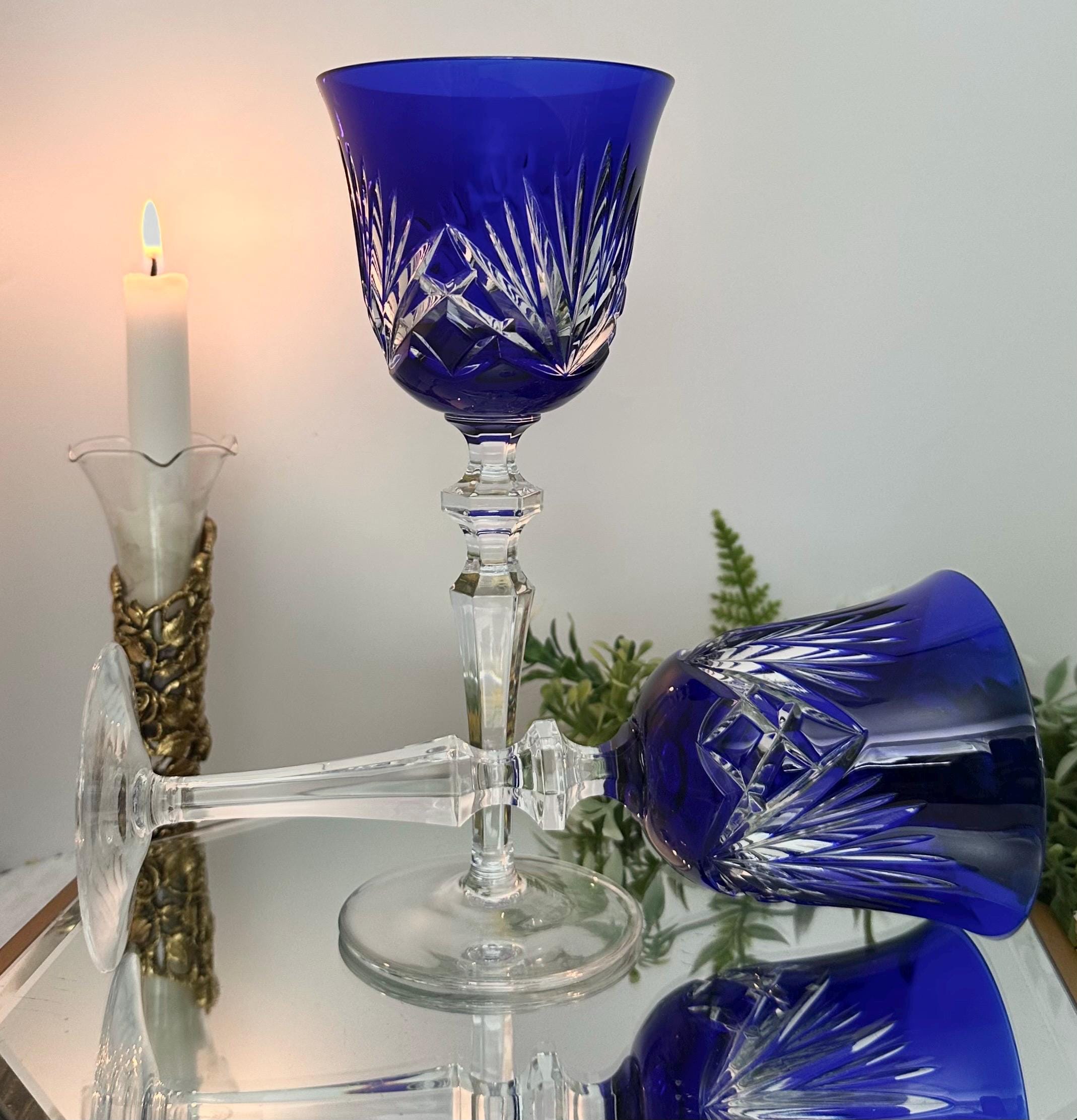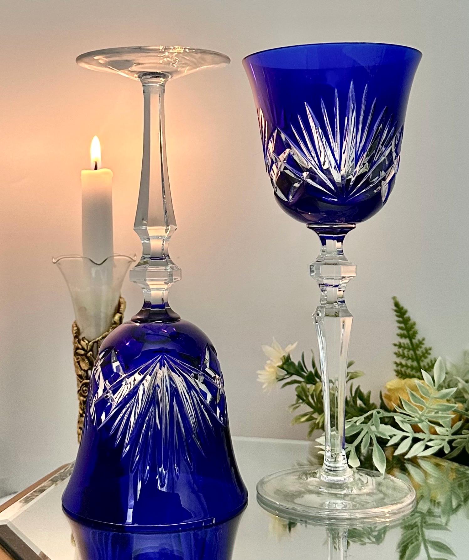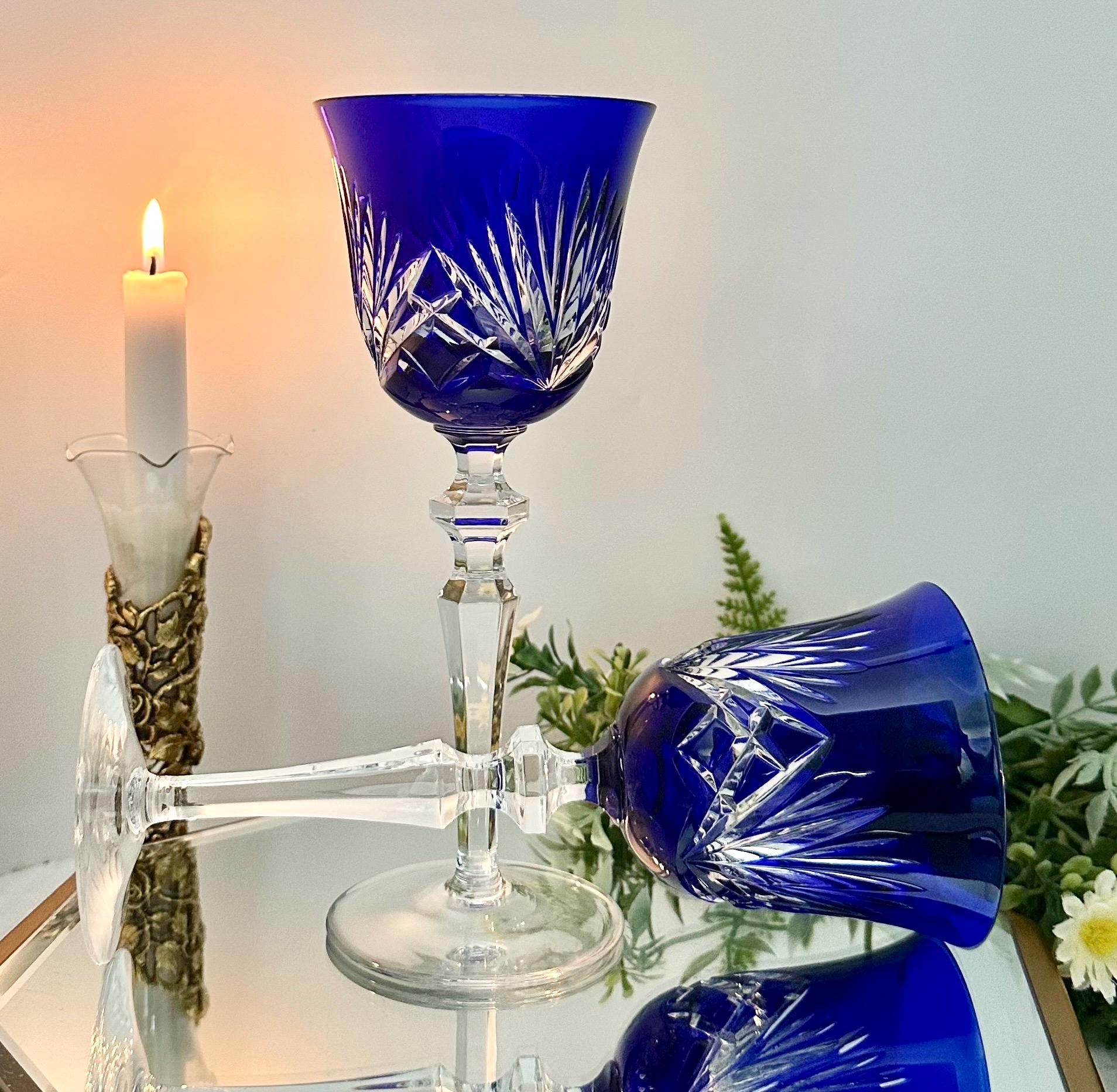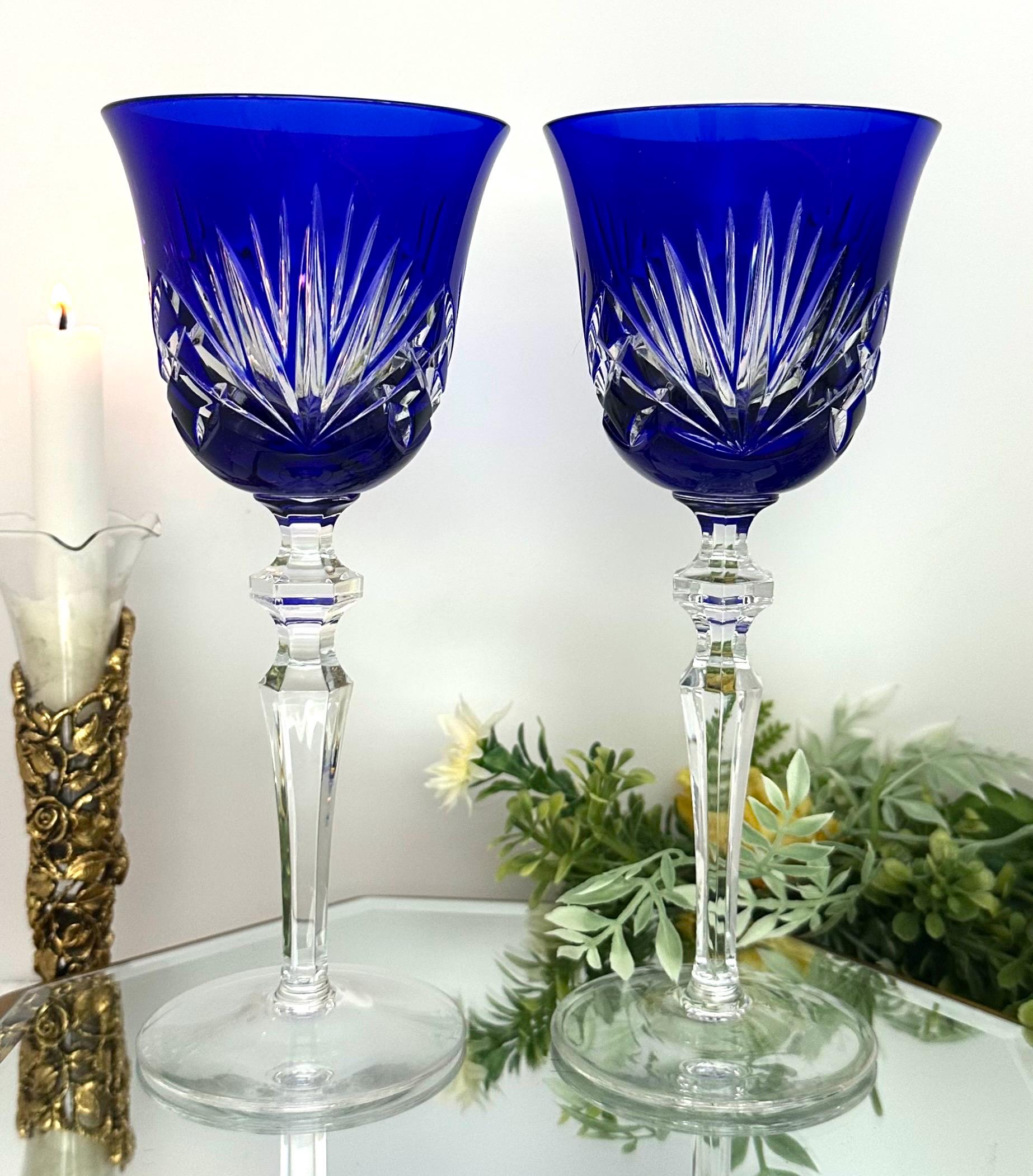 Handmade in Germany during the 1960s to 1999, these Bohemian-style glasses feature fan cuts on the bowl and a striking cobalt blue color. The 8 1/4 inch wine hocks are perfect for all occasions and should be hand washed to maintain their original beauty. These collectible items from Gorham will make for a charming addition to any barware collection, showcasing the artistry and craftsmanship of vintage glassware.