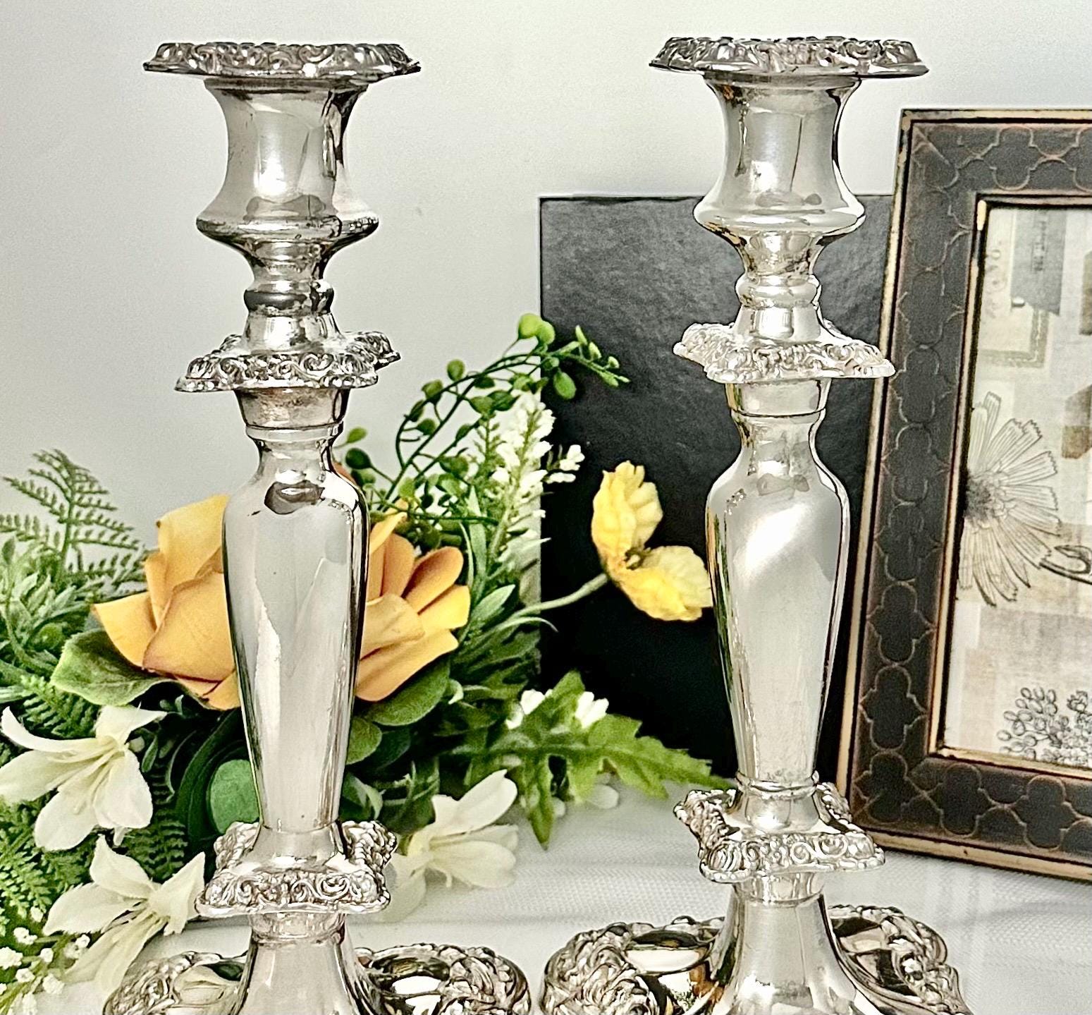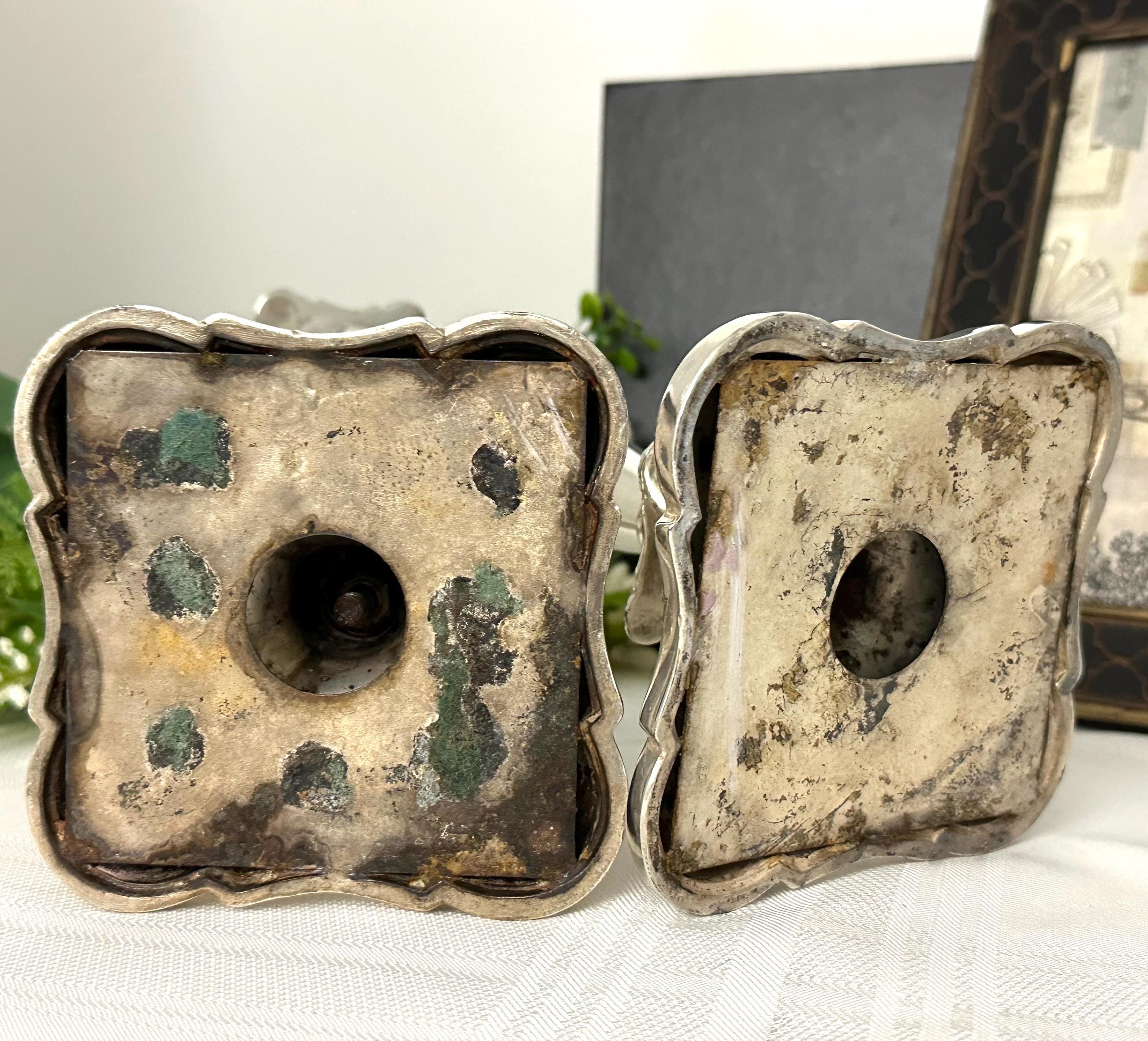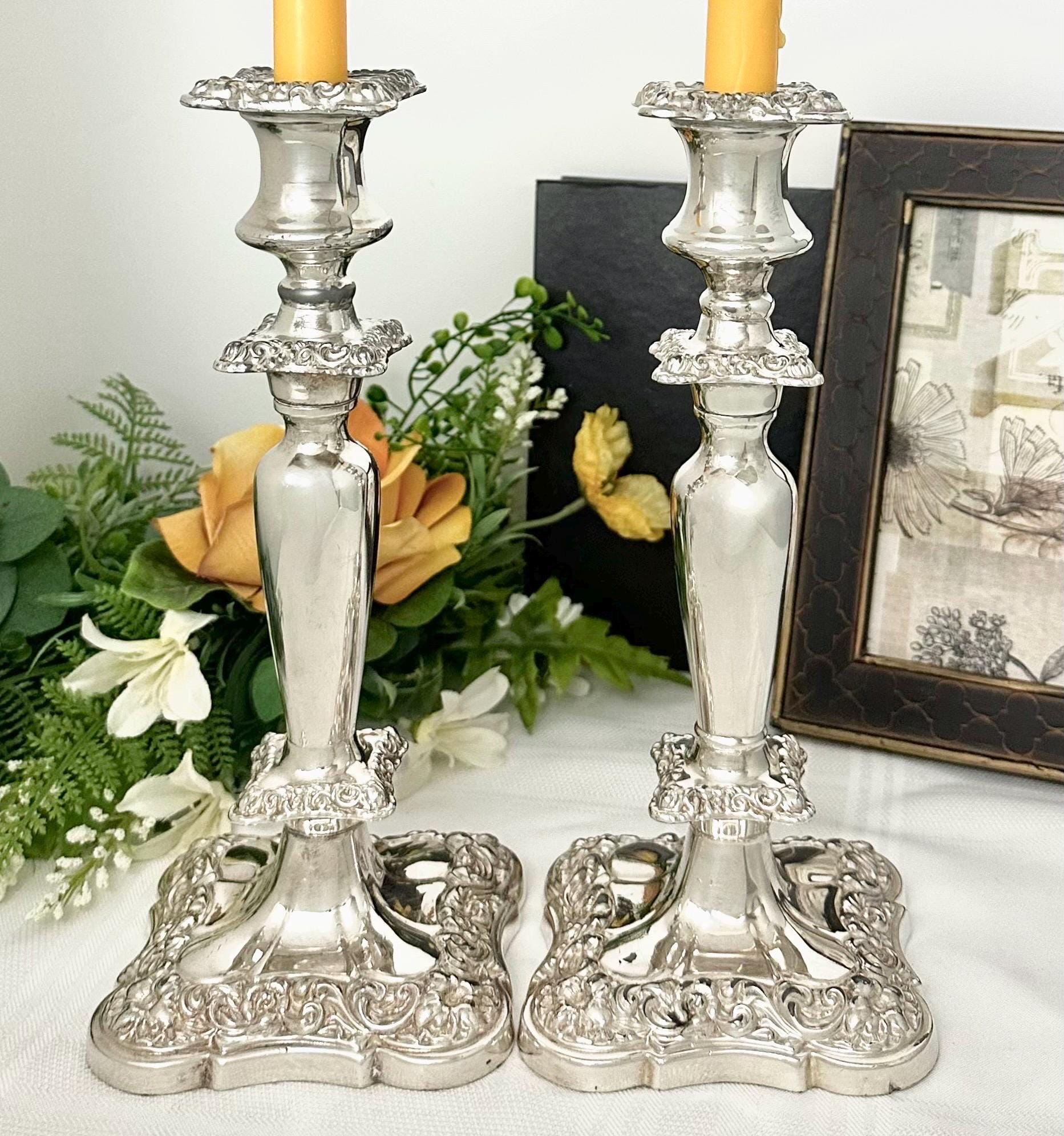 These would date to the late 19th to early 20th century per the thick copper under metal as around this period the under metals changed. This pair of candle holders are heavy and sturdy, measuring 10 inches in height and 4 inches in depth and width. The elegant design and silver composition make them a timeless and classic decor piece for any home.