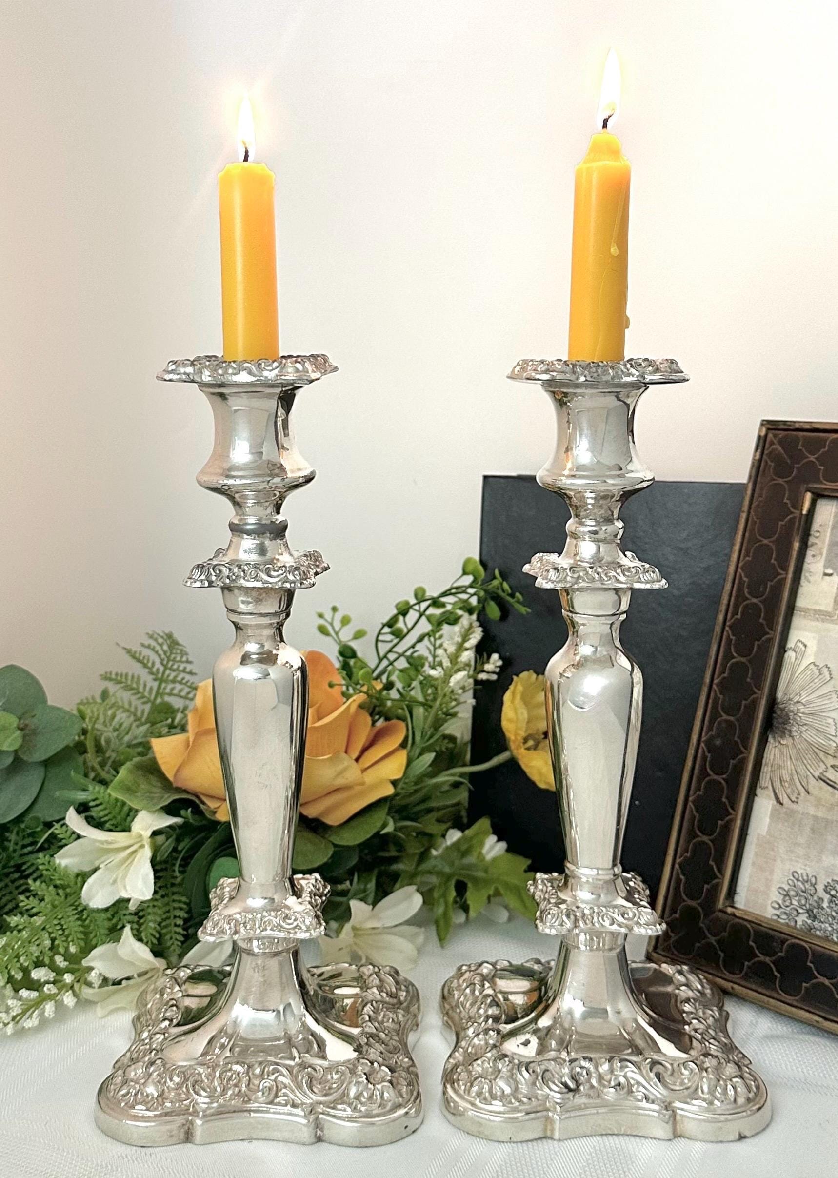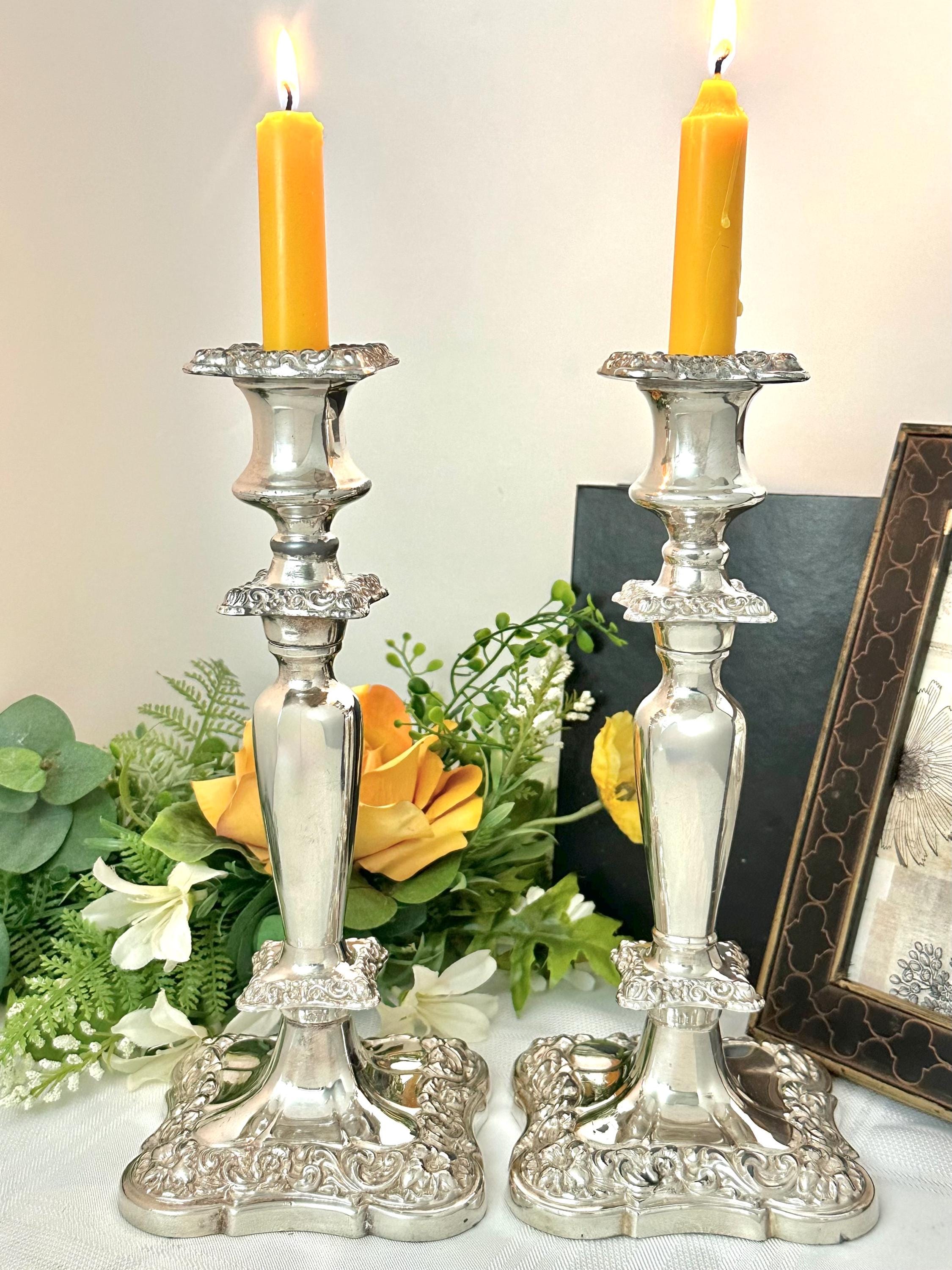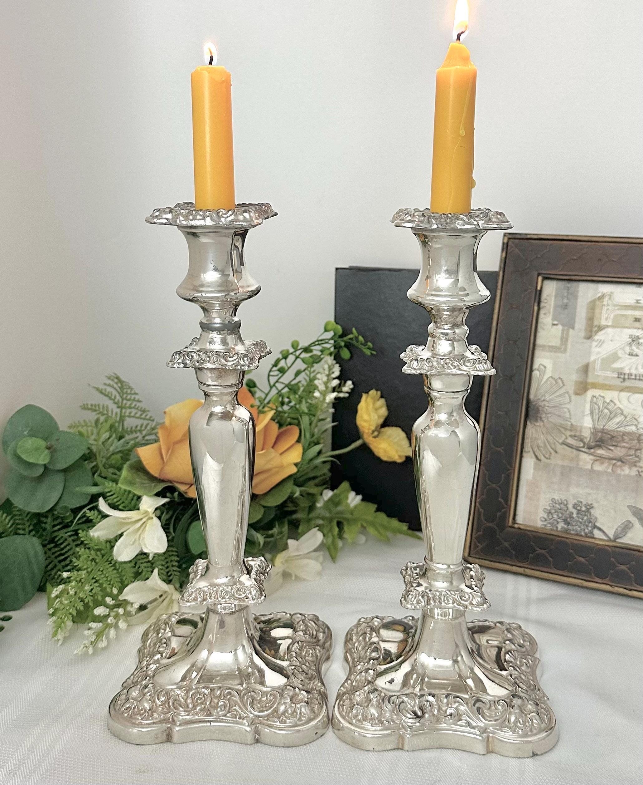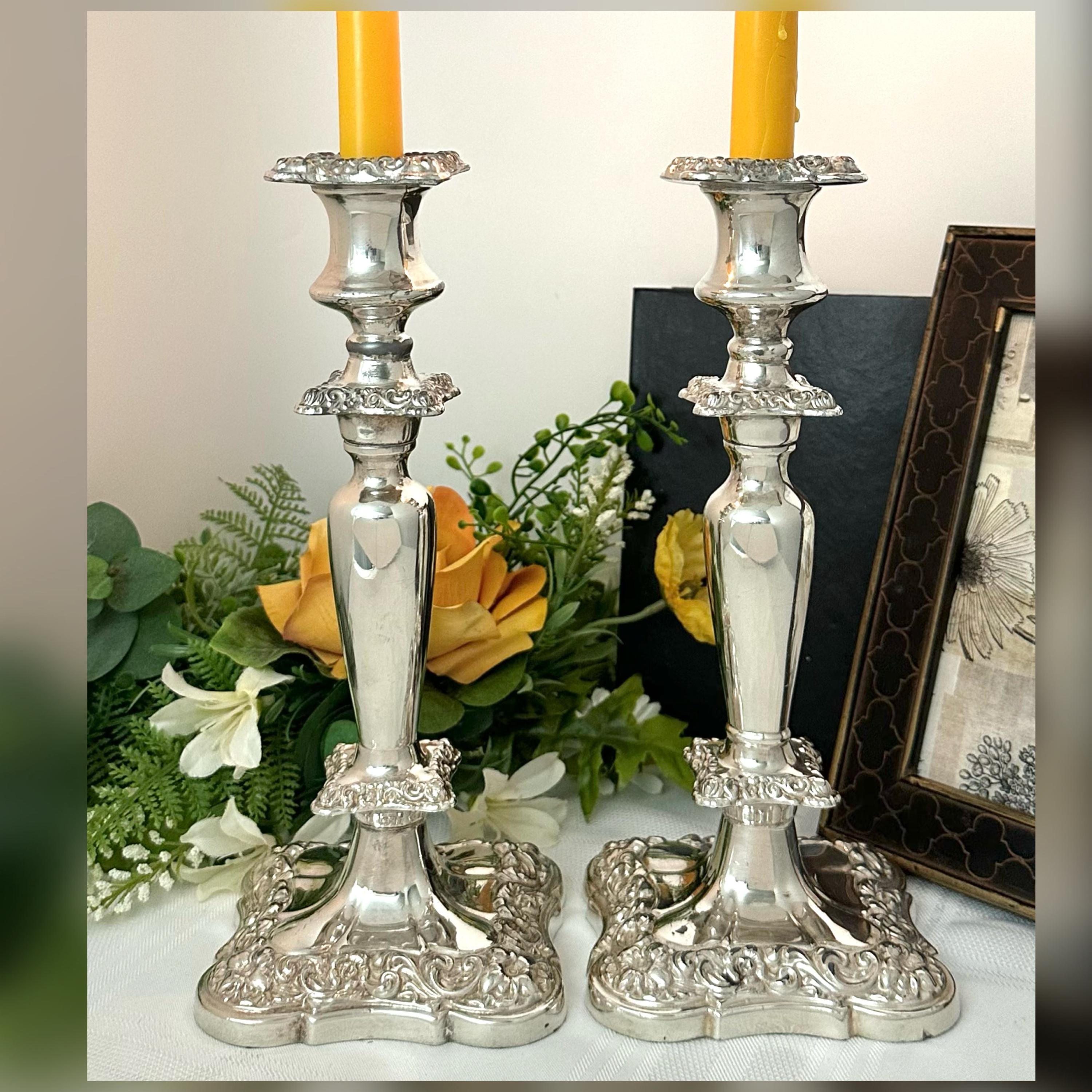 These would date to the late 19th to early 20th century per the thick copper under metal as around this period the under metals changed. This pair of candle holders are heavy and sturdy, measuring 10 inches in height and 4 inches in depth and width. The elegant design and silver composition make them a timeless and classic decor piece for any home.