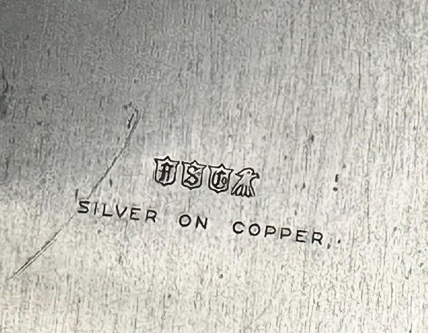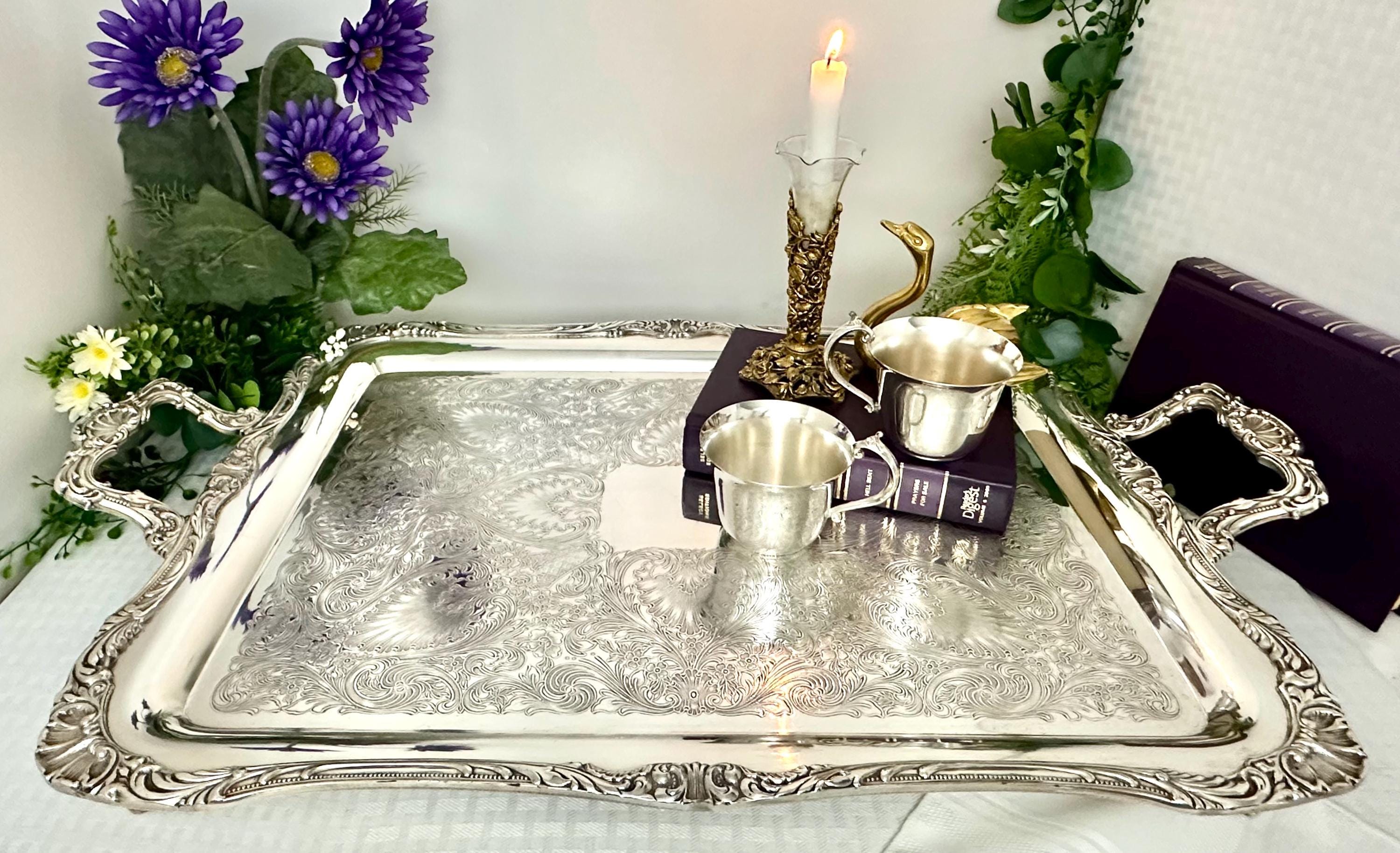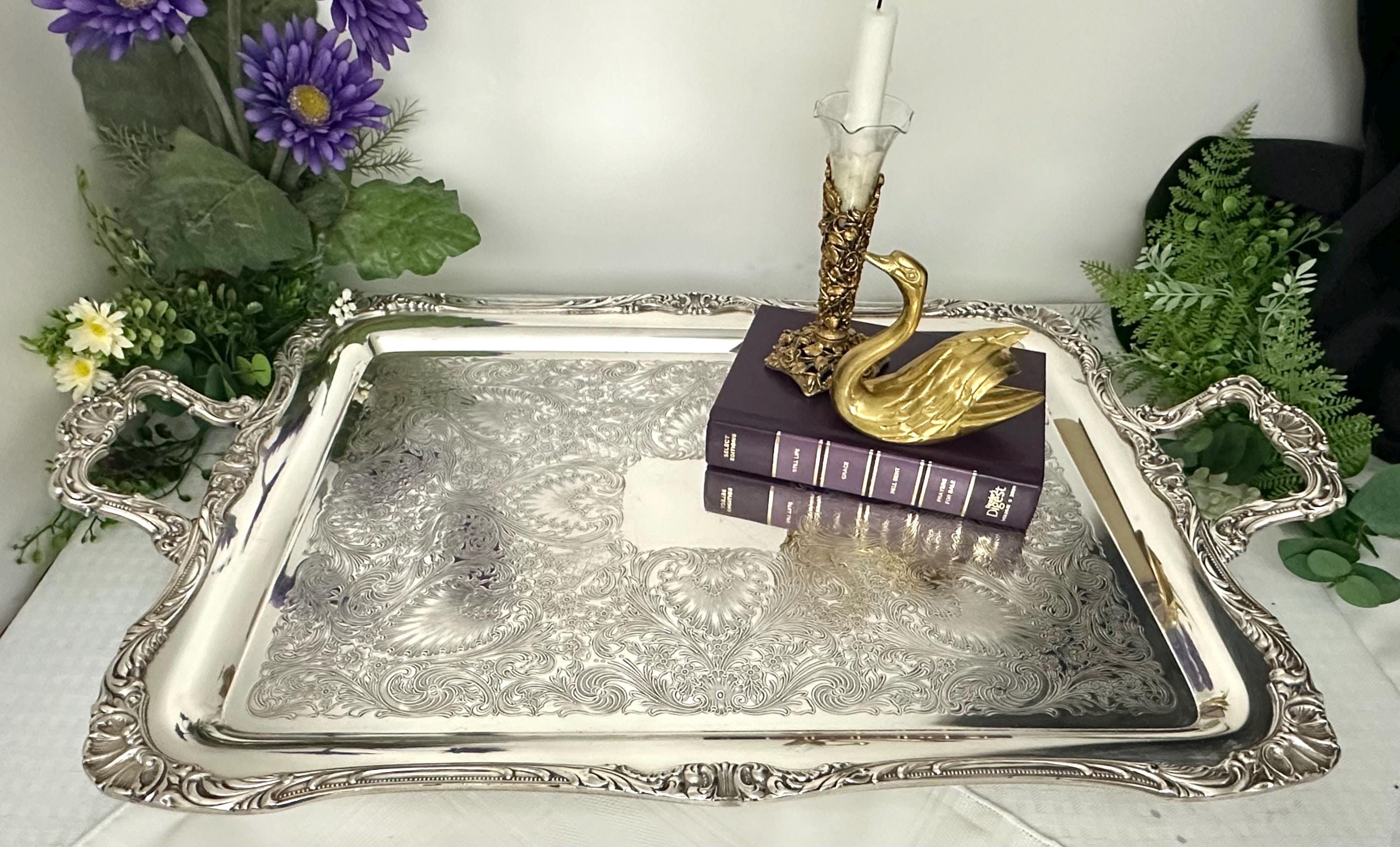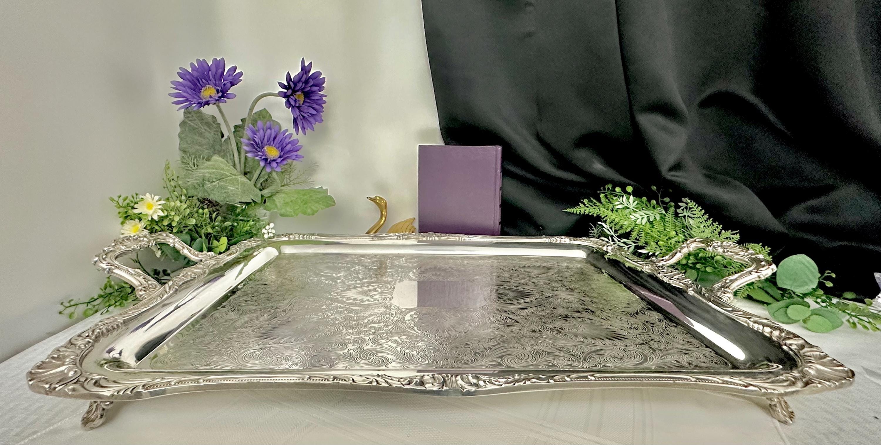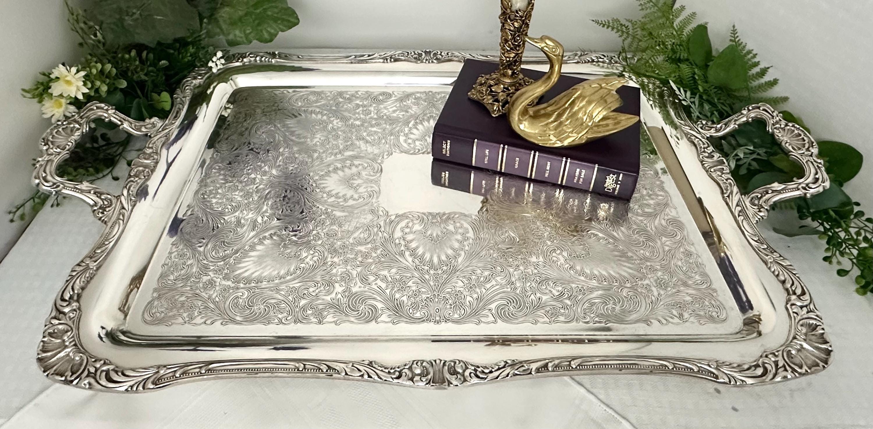 With a depth of 16.5 inches and a width of 27.5 inches, this footed tray is perfect for tea service or as a decorative piece to hold items like candlesticks. This was most likely Made in the United States, this silver plated tray has a height of 3.5 inches as sits on small feet. This polished vintage tray will be a stunning addition to any antique collection. The trays silver plate is in good condition with age appropriate surface scratches.