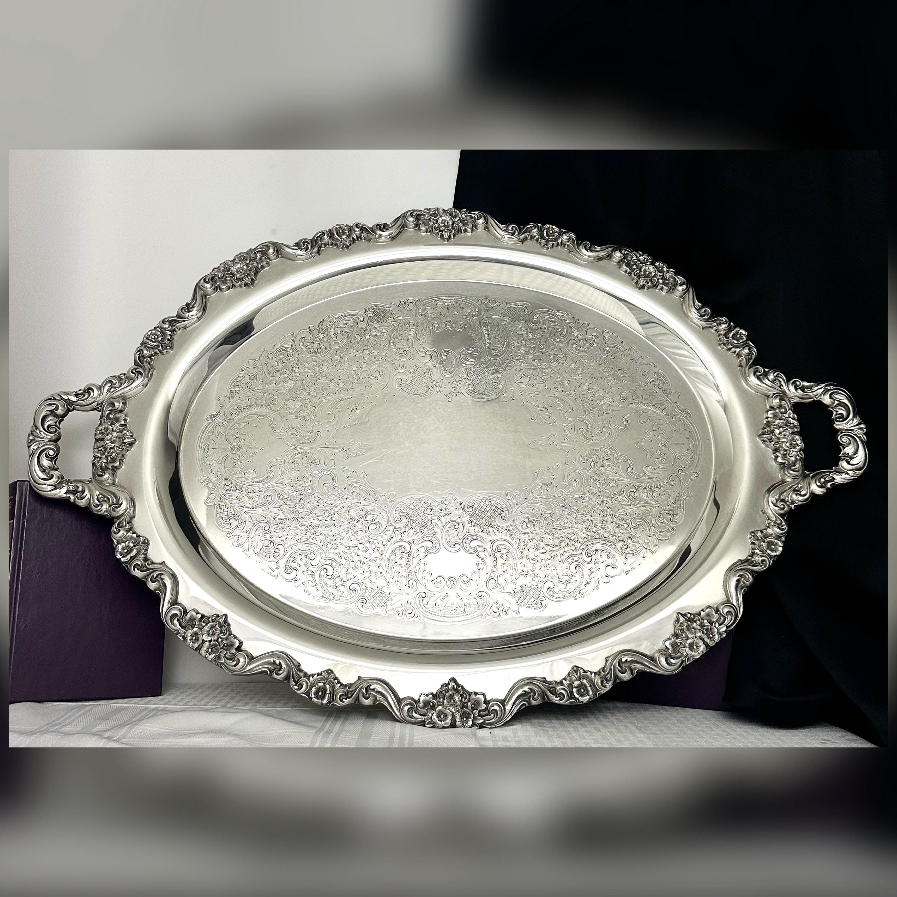 Elevate your serving experience with this large oval Lancaster Rose Serving Tray, a stunning piece crafted by Poole Silver. With its intricate Victorian pattern, this tray brings a touch of elegance to any butler's tea service or formal gathering. The tray measures: 30 inches wide x 20 inches deep and a height of 2.5 inches tall. The makers name is on the back along with pattern number 400 600.