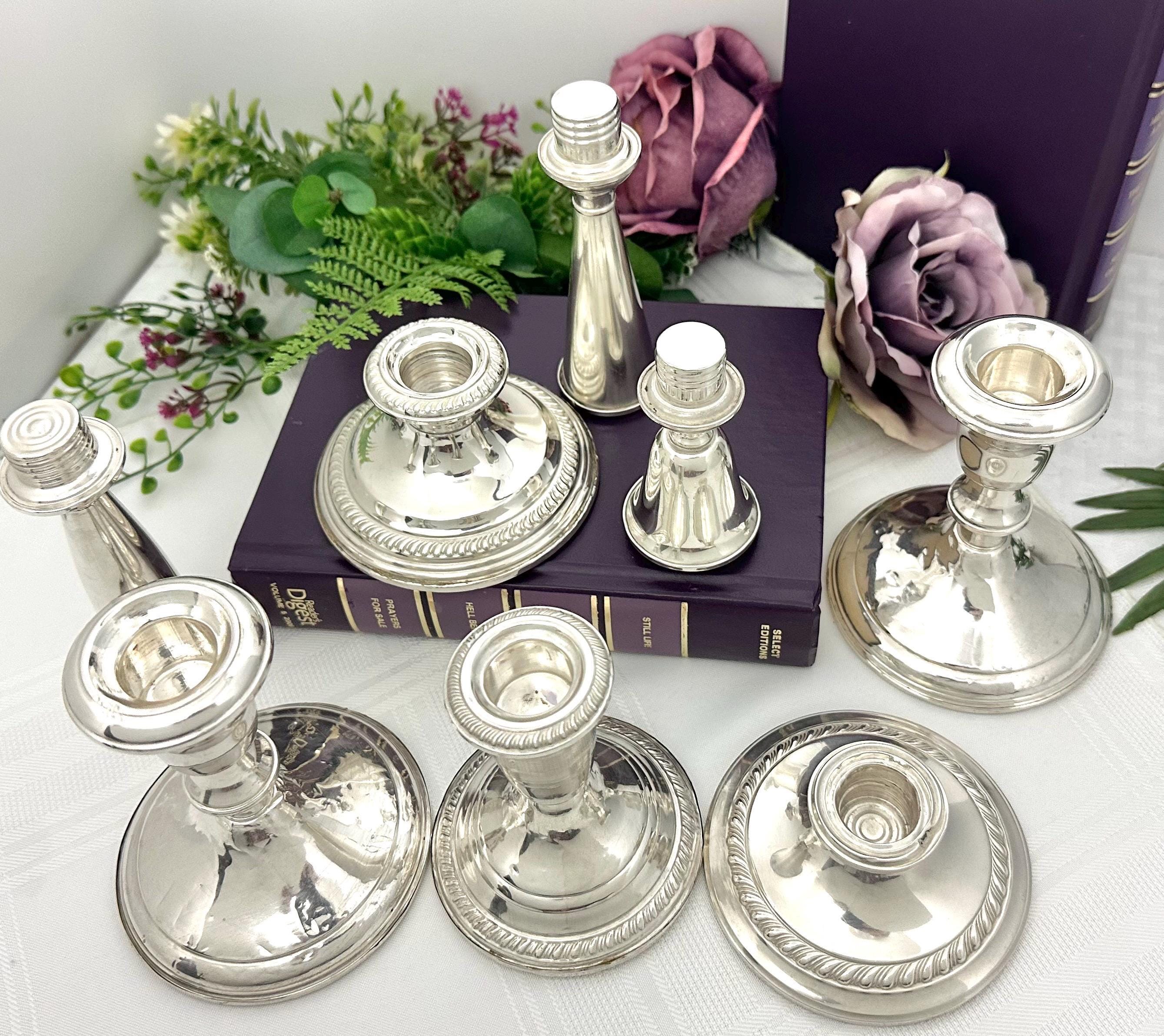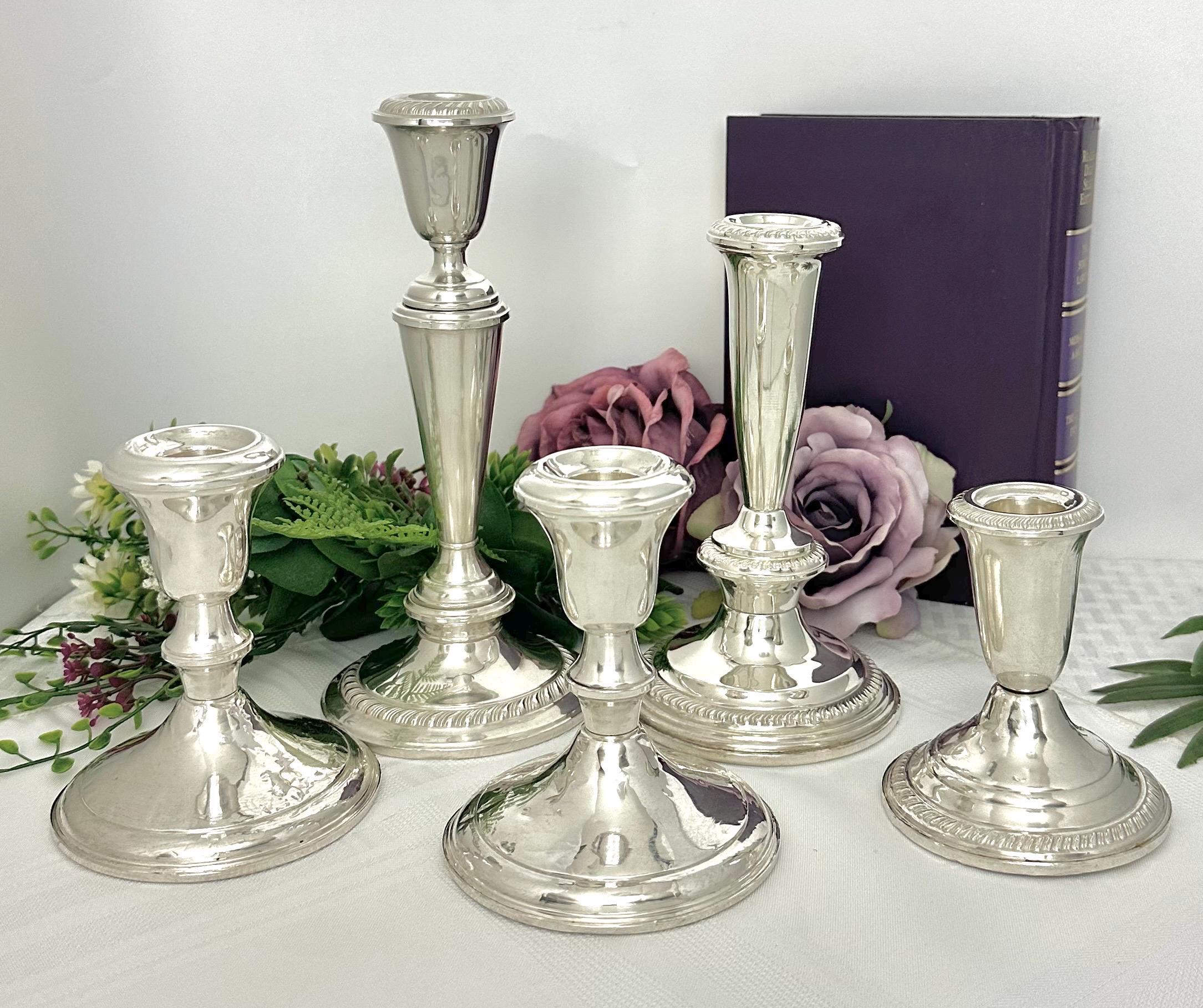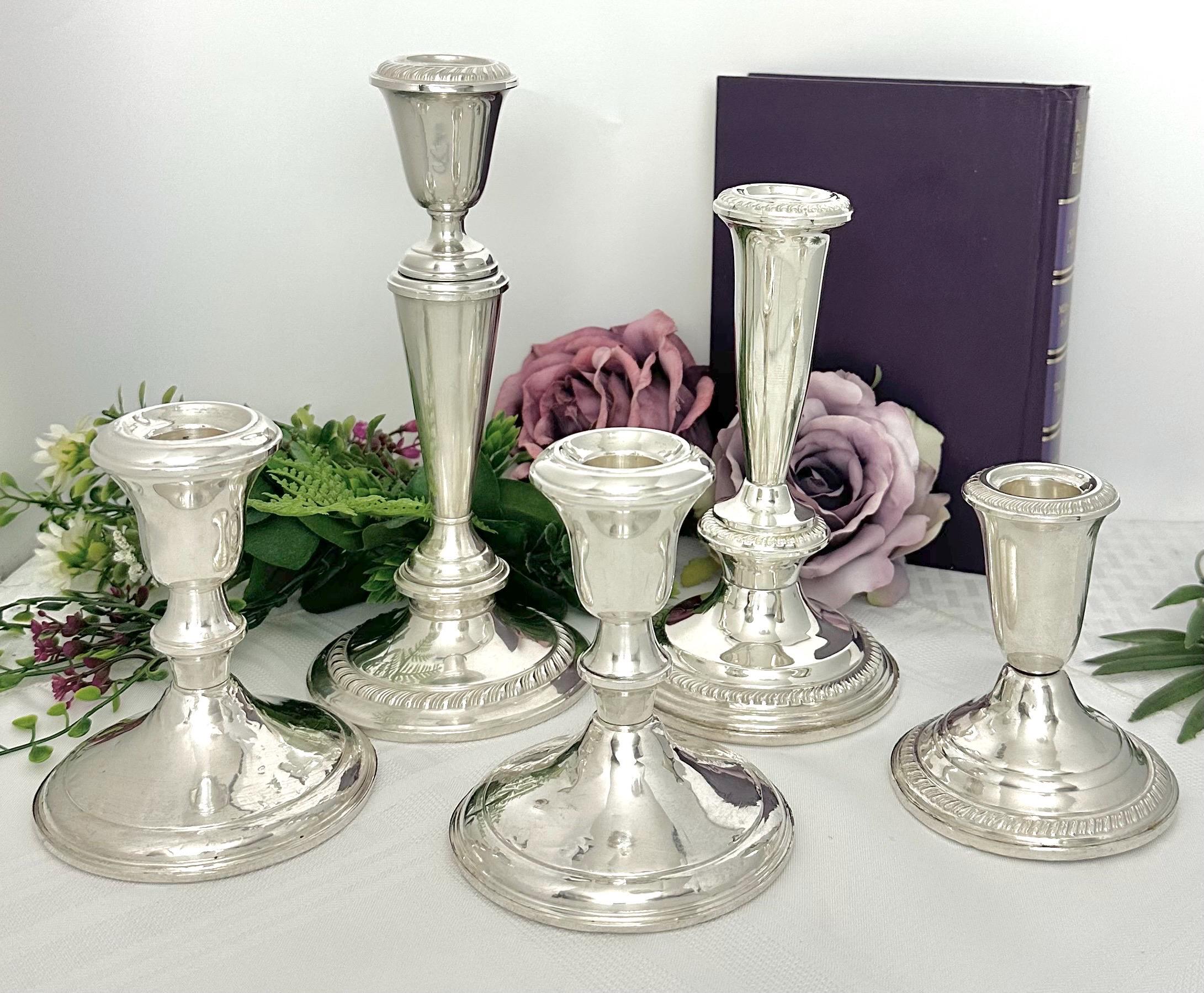 This is for a set of 5 sterling silver candle holders made by various makers, offering a variety of sizes to accommodate different needs. Each candle holder is crafted from high-quality .925 sterling silver, giving them a timeless and elegant look that can enhance any space.
