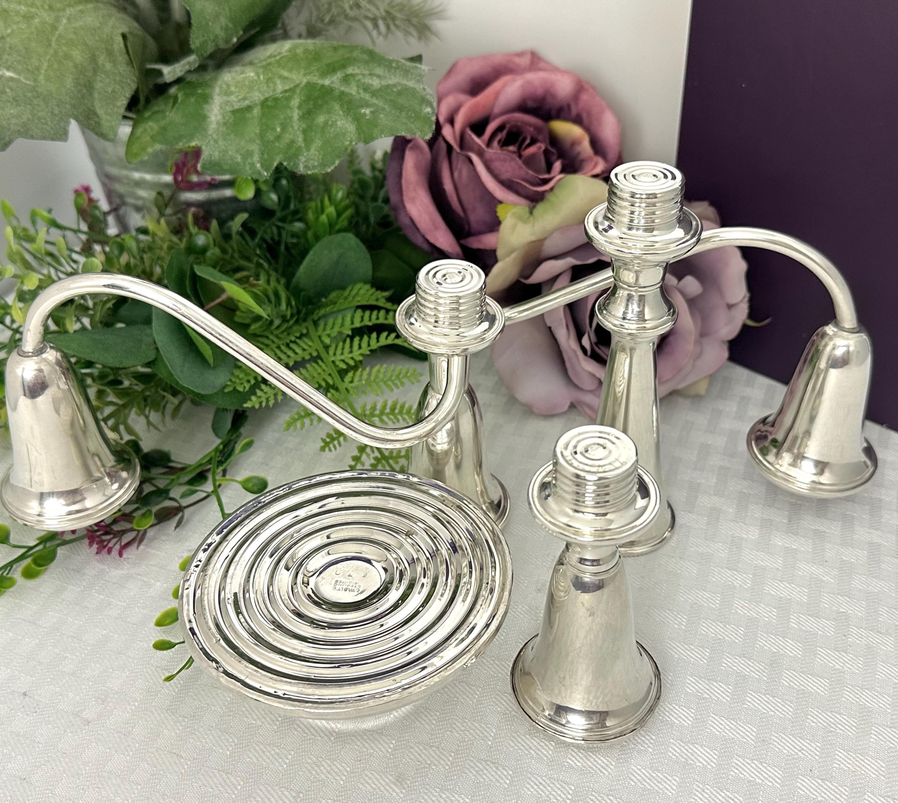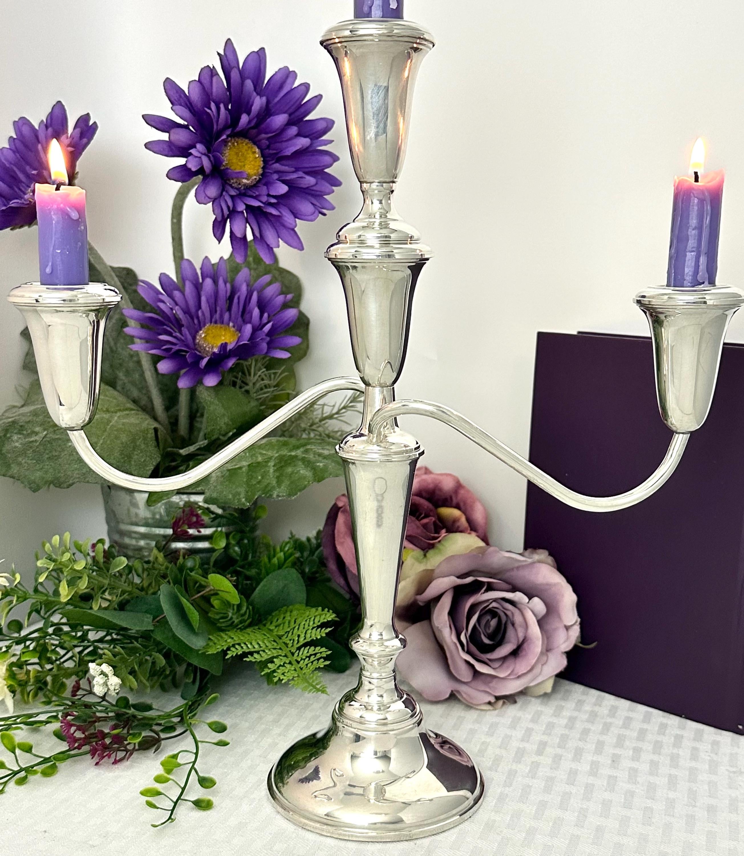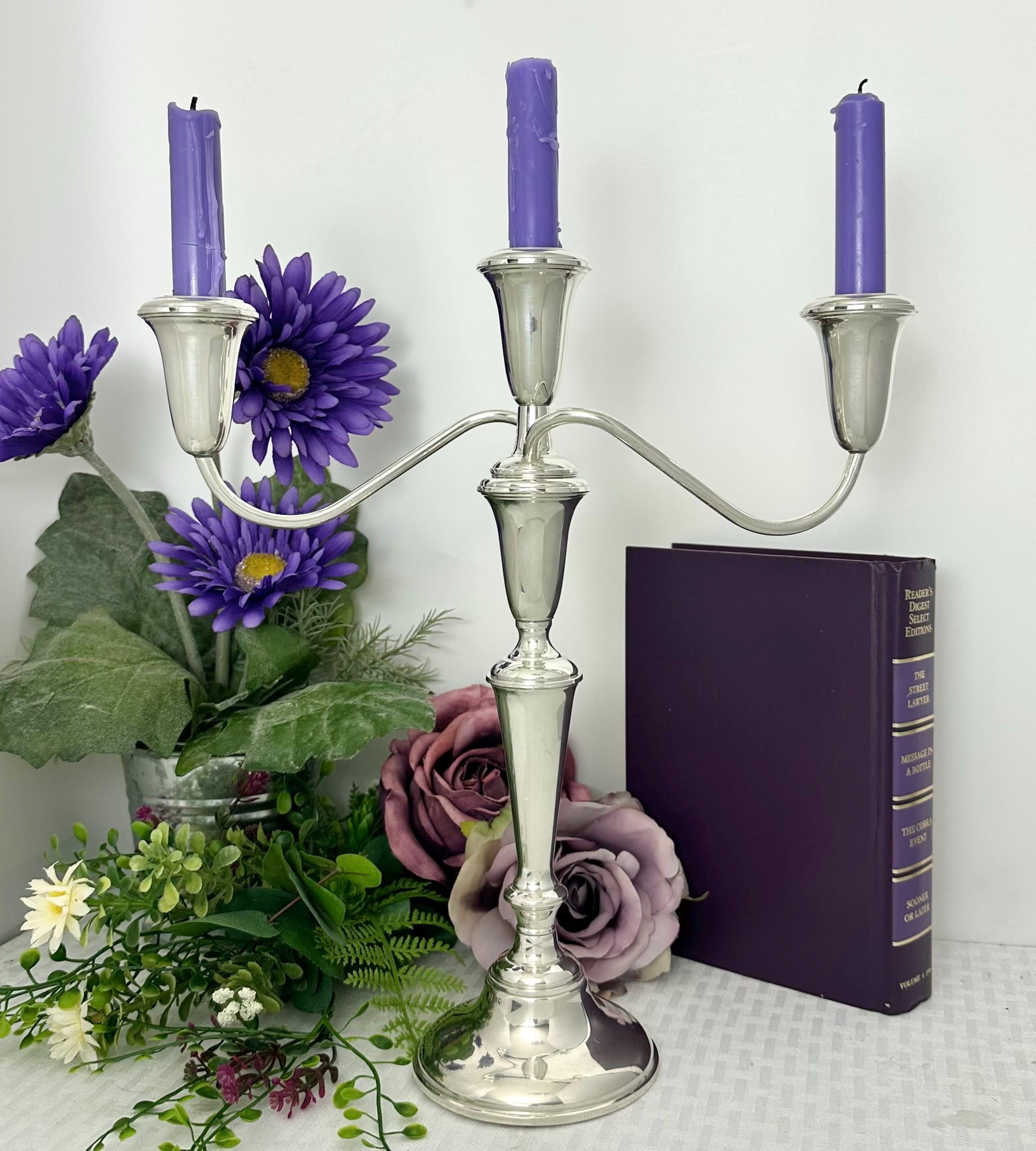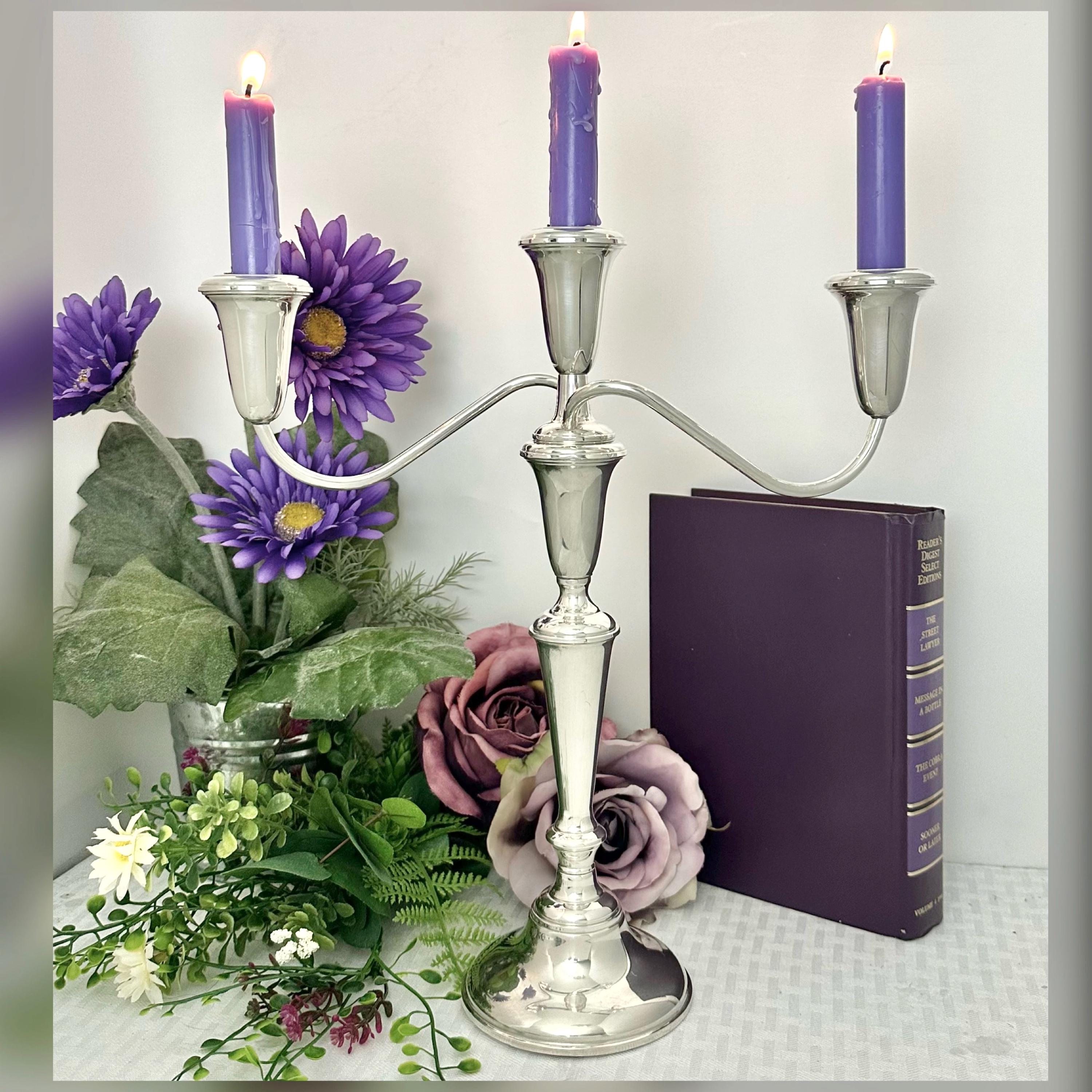 This is for a tall Sterling Silver Empire Candelabra. This is a vintage piece crafted with sterling silver (.925) that features a three-arm design, making it a versatile and functional addition to any home decor.