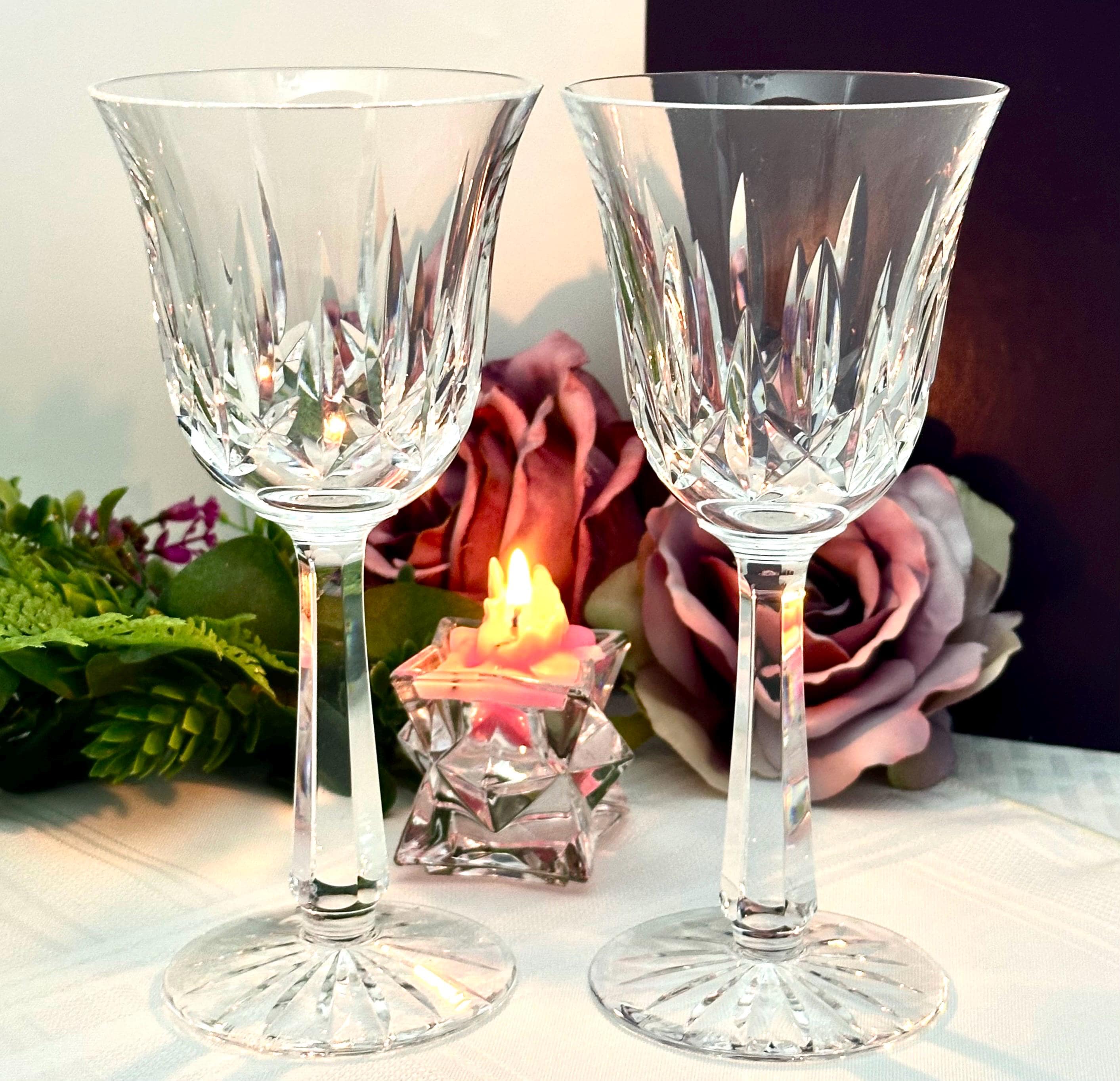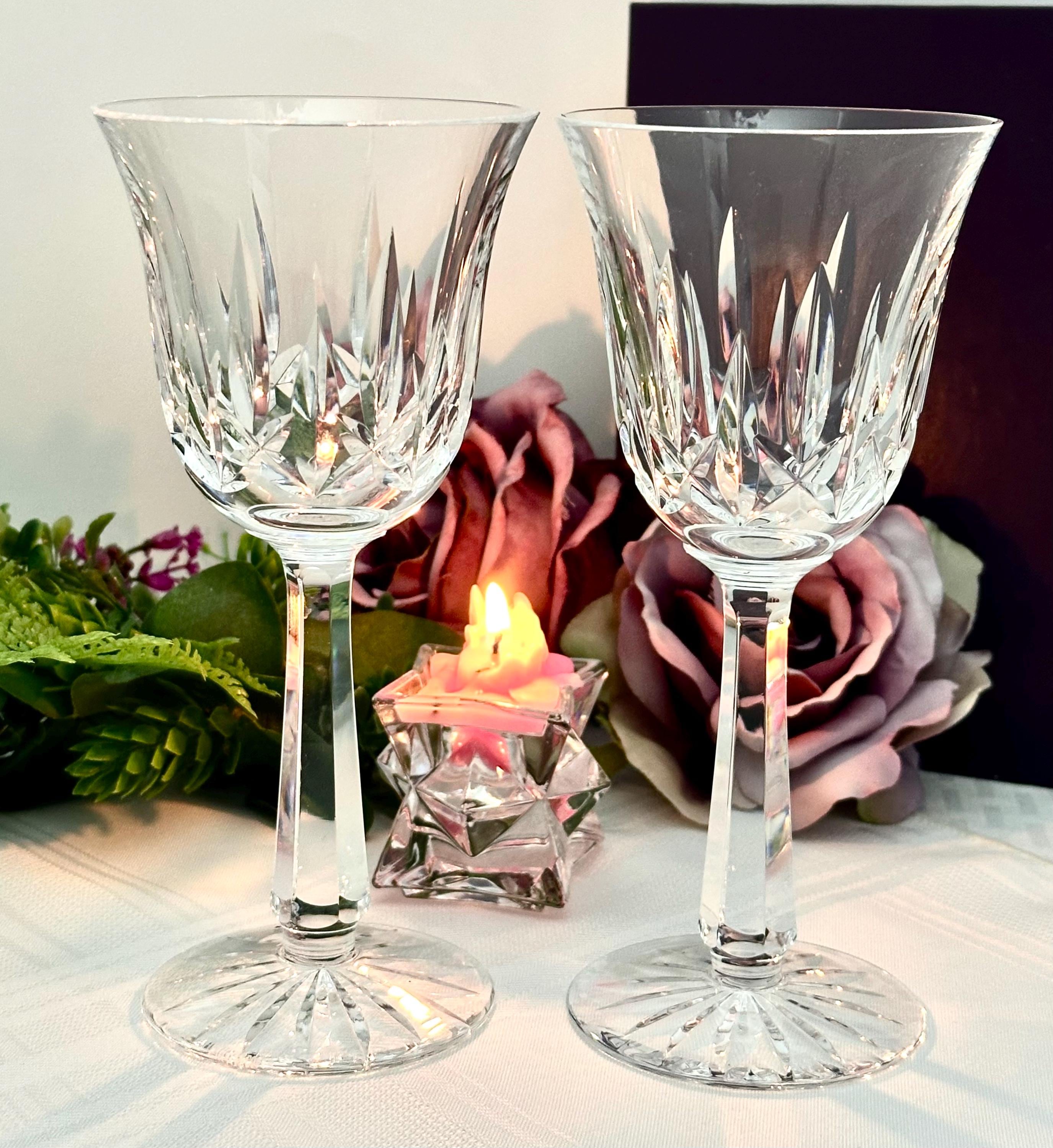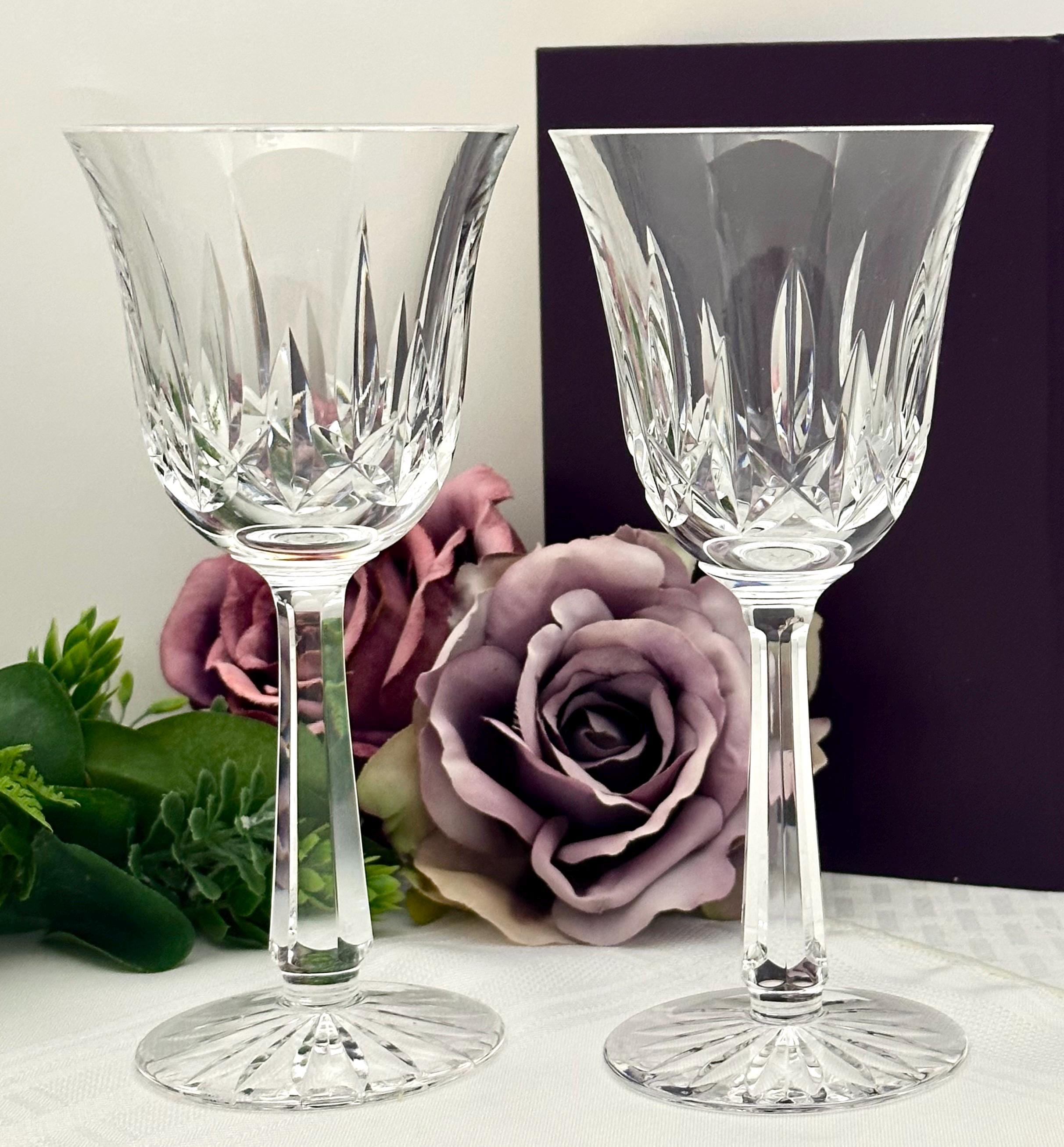 Handmade by the renowned Waterford brand, these traditional styled wine glasses stand at 7 5/8 inches tall, making them a unique and exquisite pieces of barware for collectors and wine enthusiasts alike.