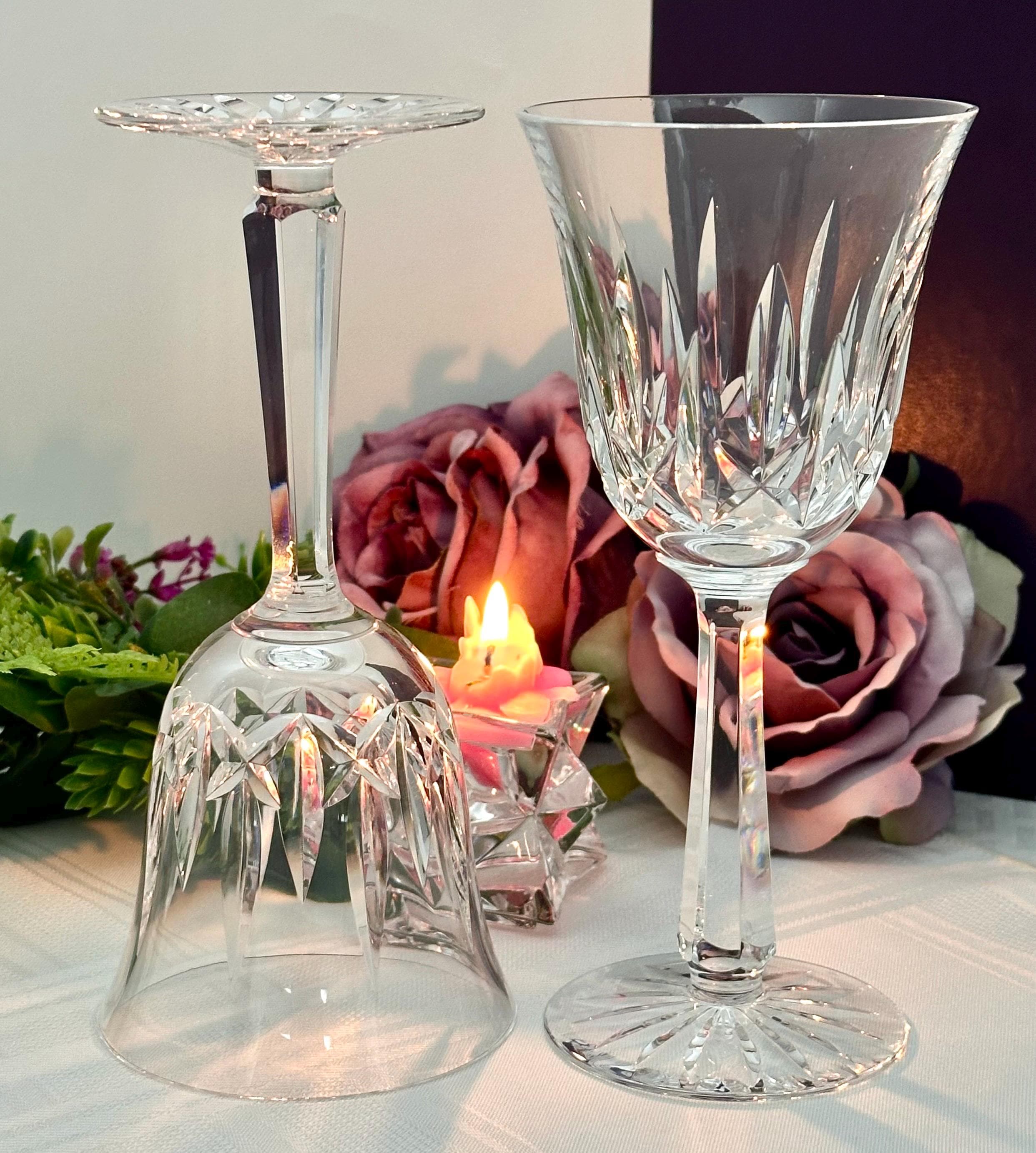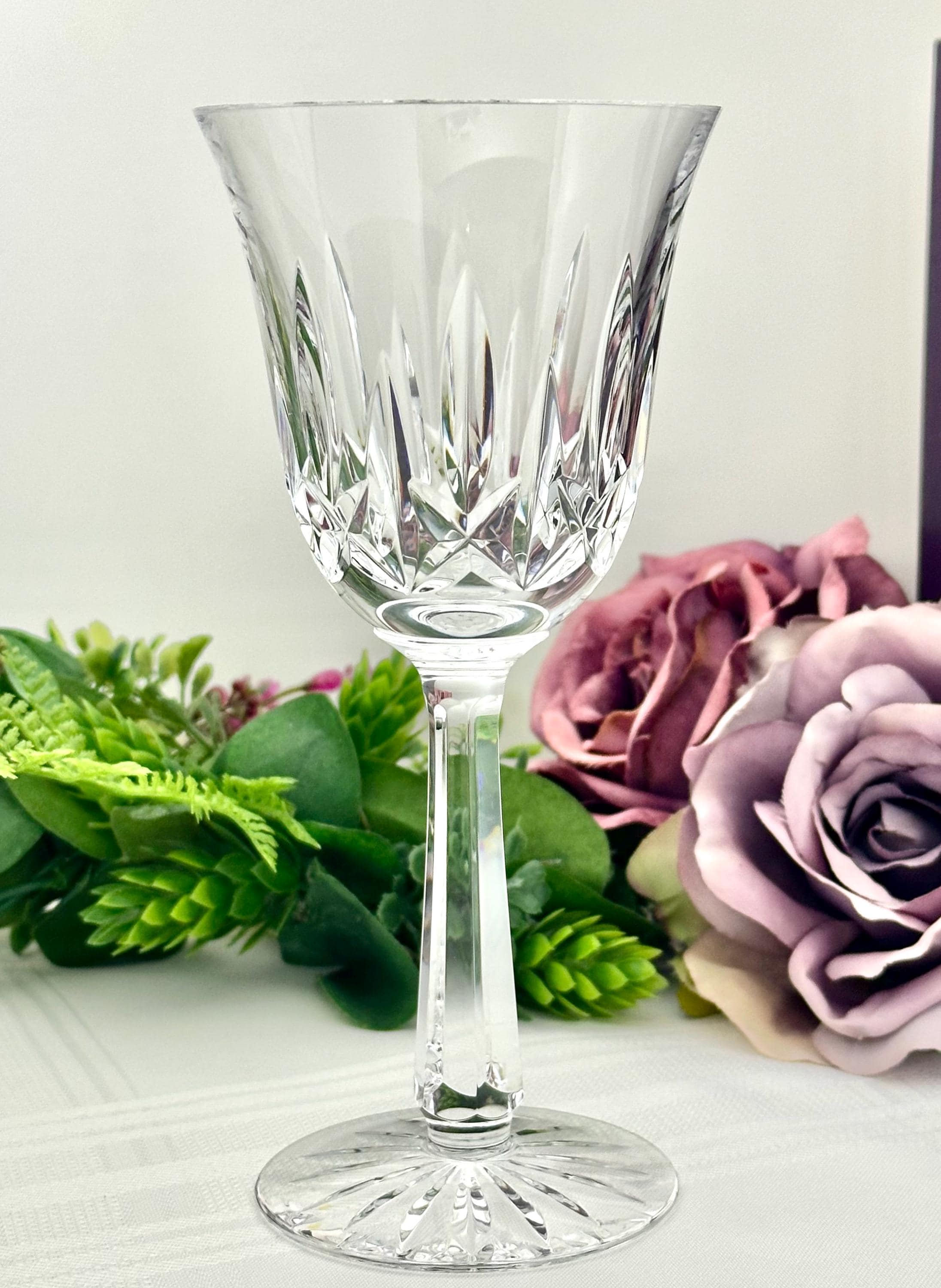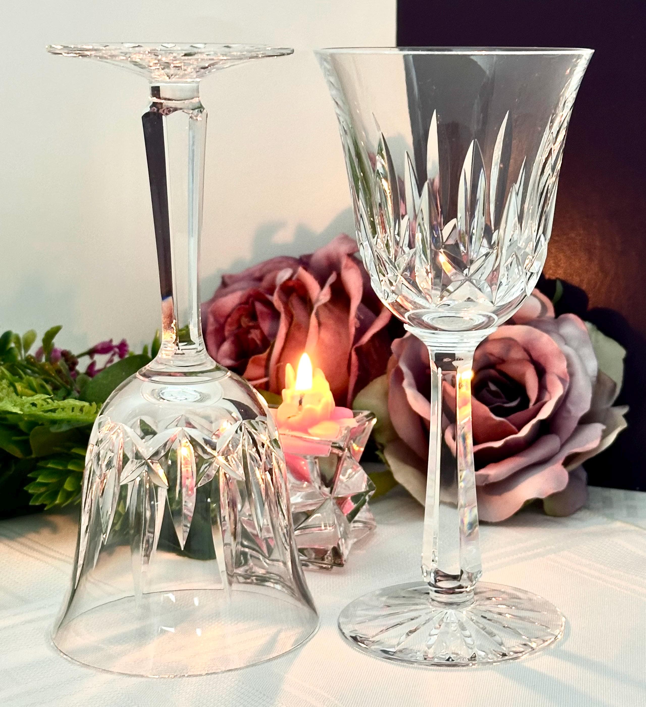 Handmade by the renowned Waterford brand, these traditional styled wine glasses stand at 7 5/8 inches tall, making them a unique and exquisite pieces of barware for collectors and wine enthusiasts alike.