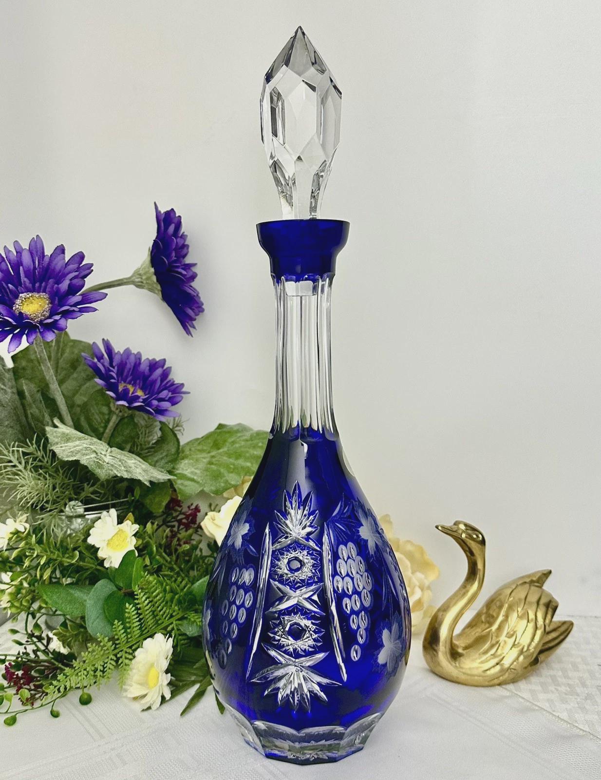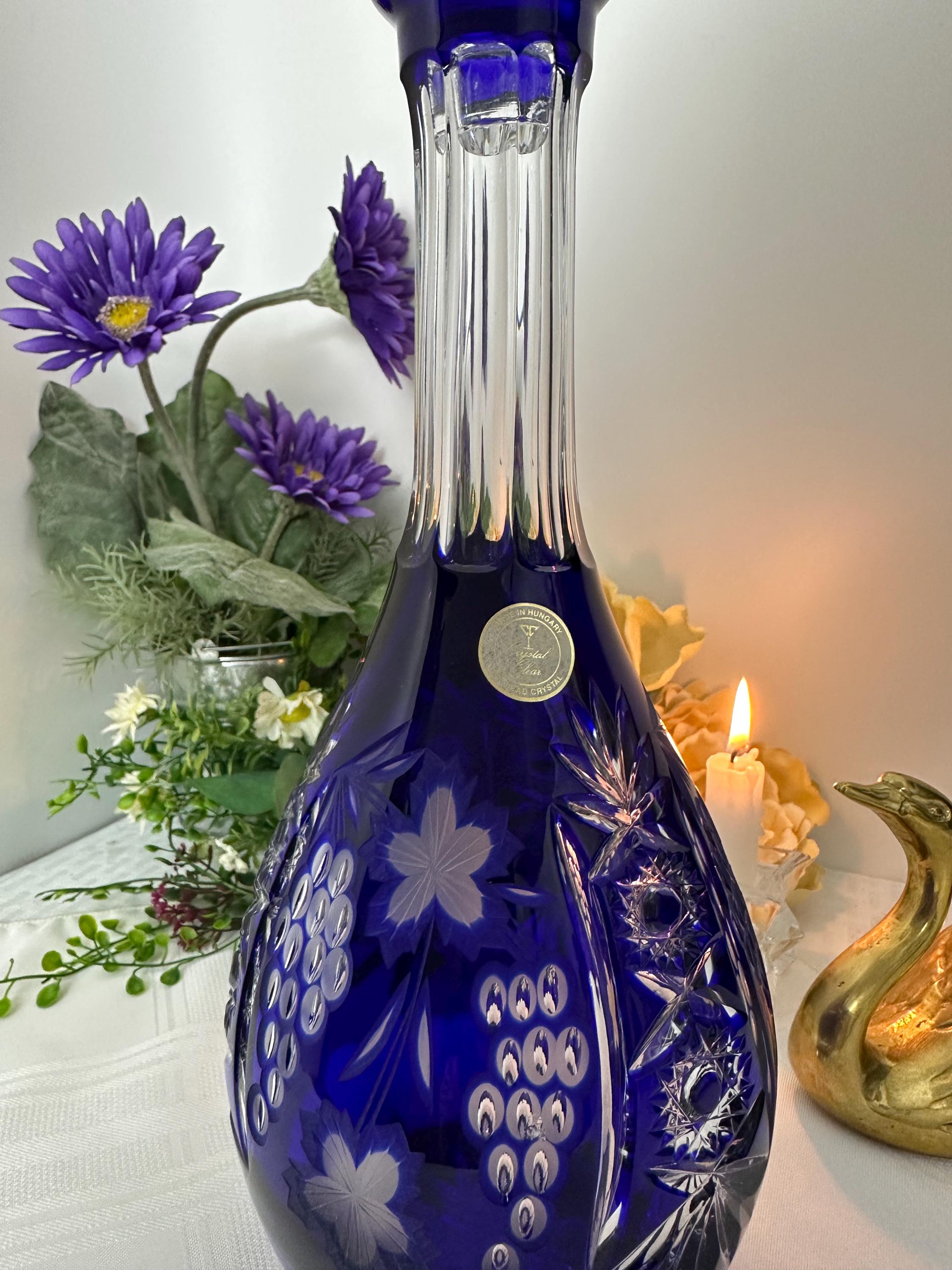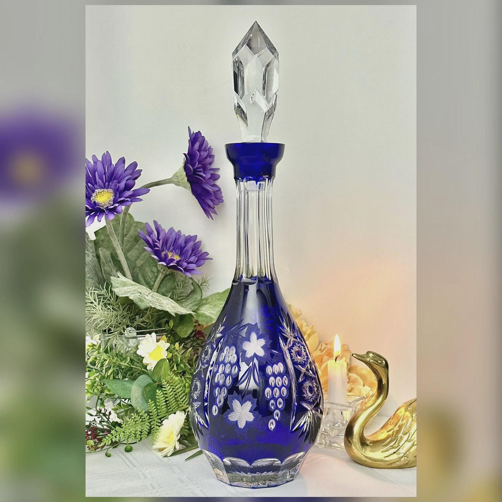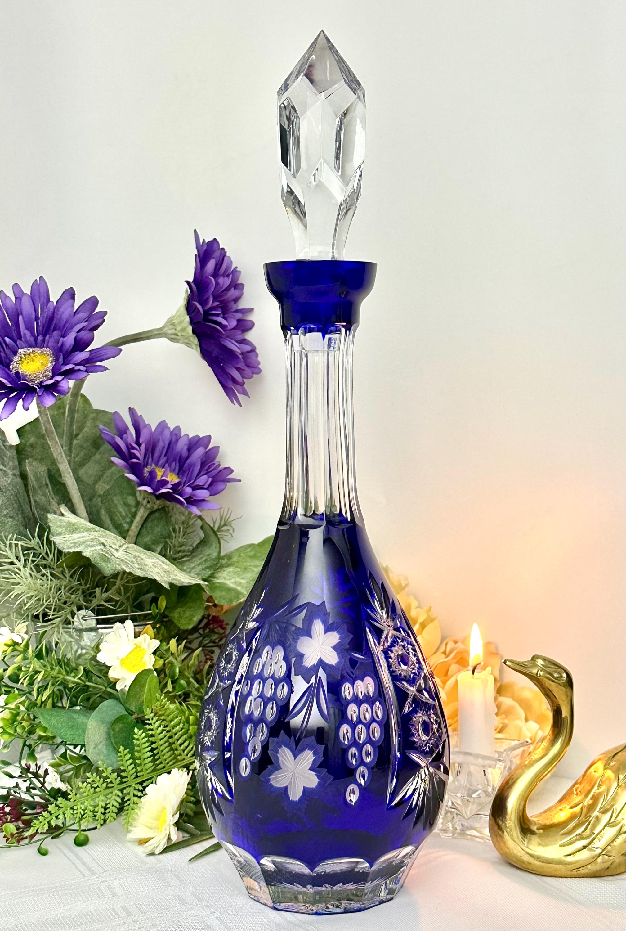 This is for a Blue decanter from Crystal Clear Industries. This tall Blue Cut Decanter is a vintage and elegant piece of barware perfect for all occasions. Made of glass with a beautiful grapes pattern and a large clear cut stopper, this round decanter exudes a Bohemian style.