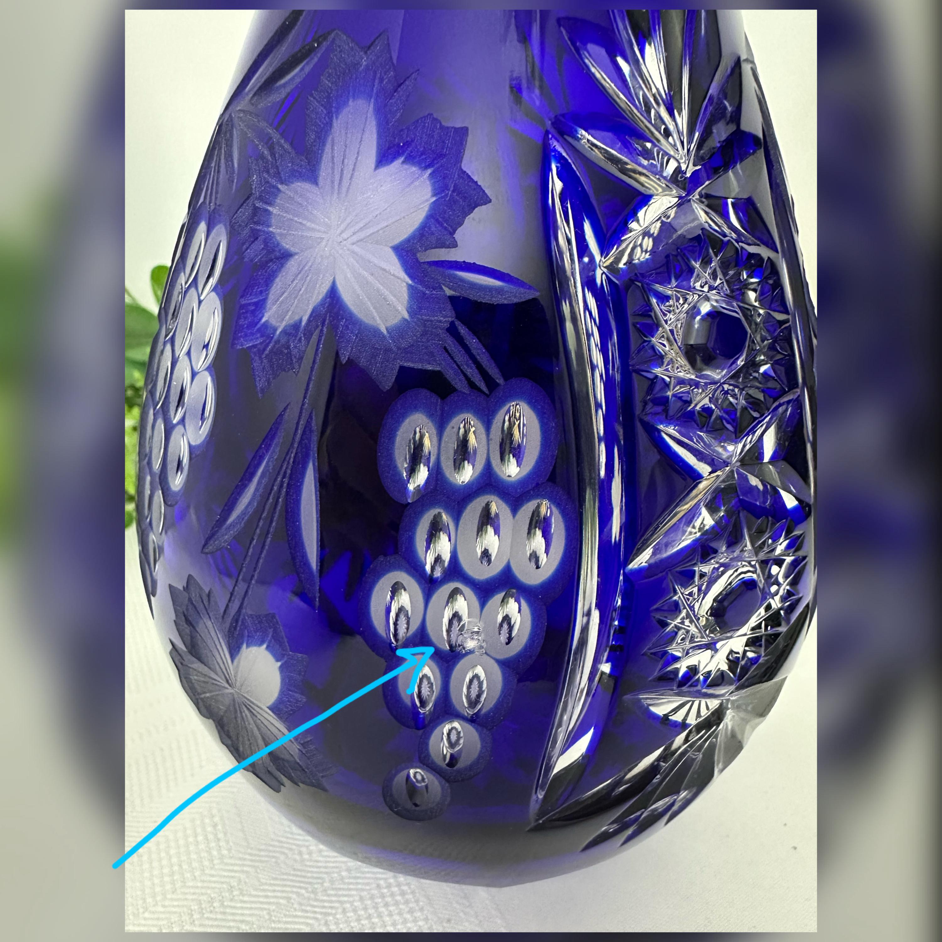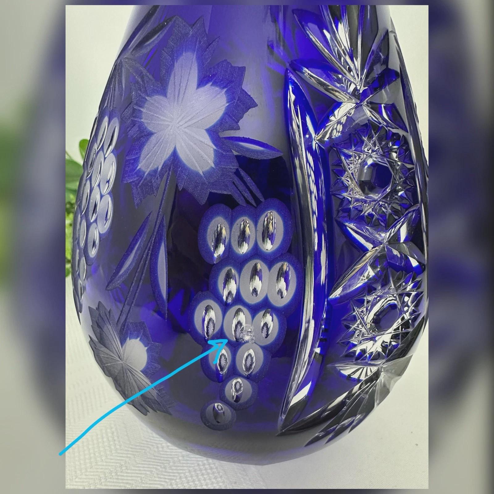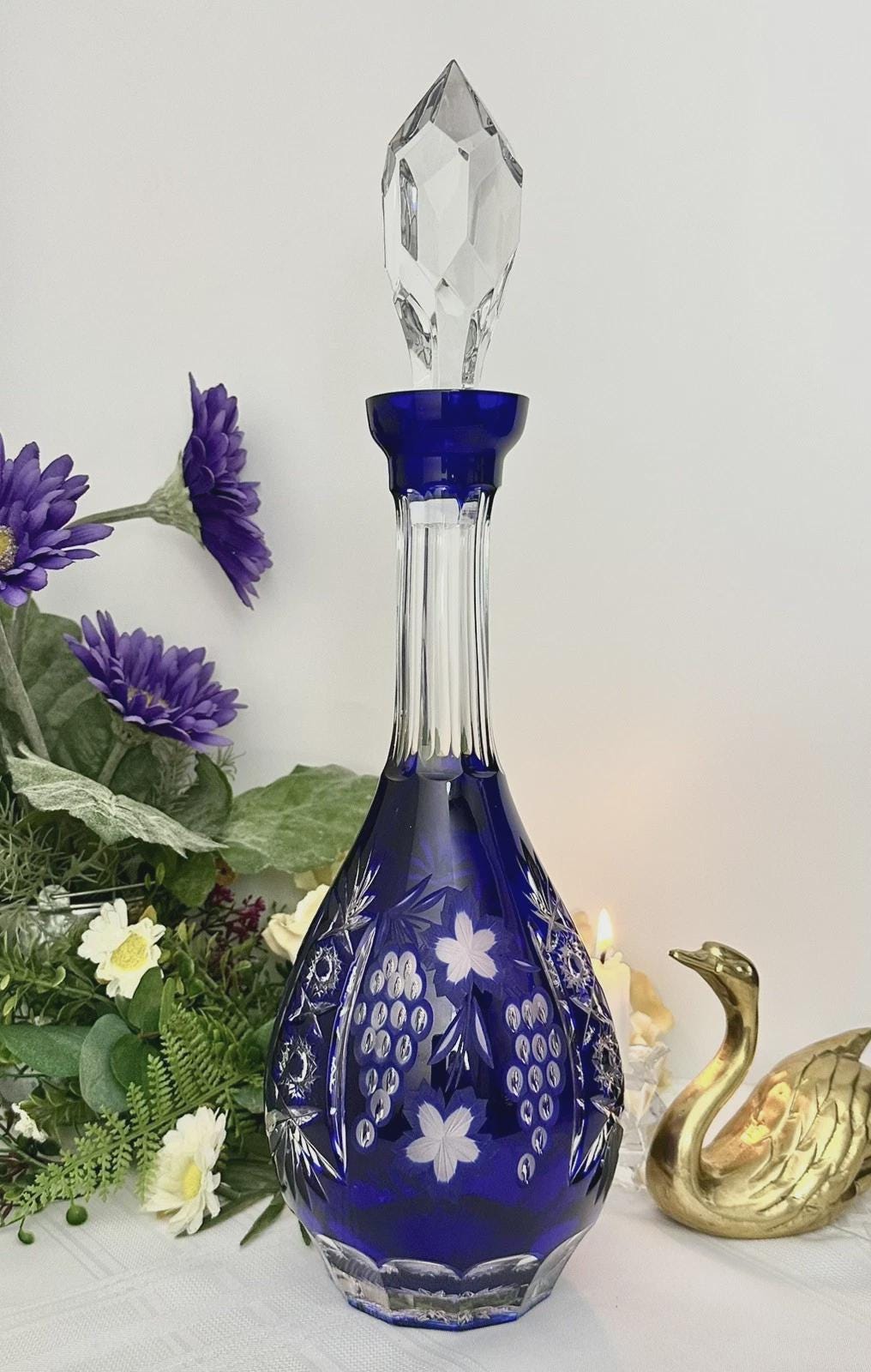This is for a Blue decanter from Crystal Clear Industries. This tall Blue Cut Decanter is a vintage and elegant piece of barware perfect for all occasions. Made of glass with a beautiful grapes pattern and a large clear cut stopper, this round decanter exudes a Bohemian style.