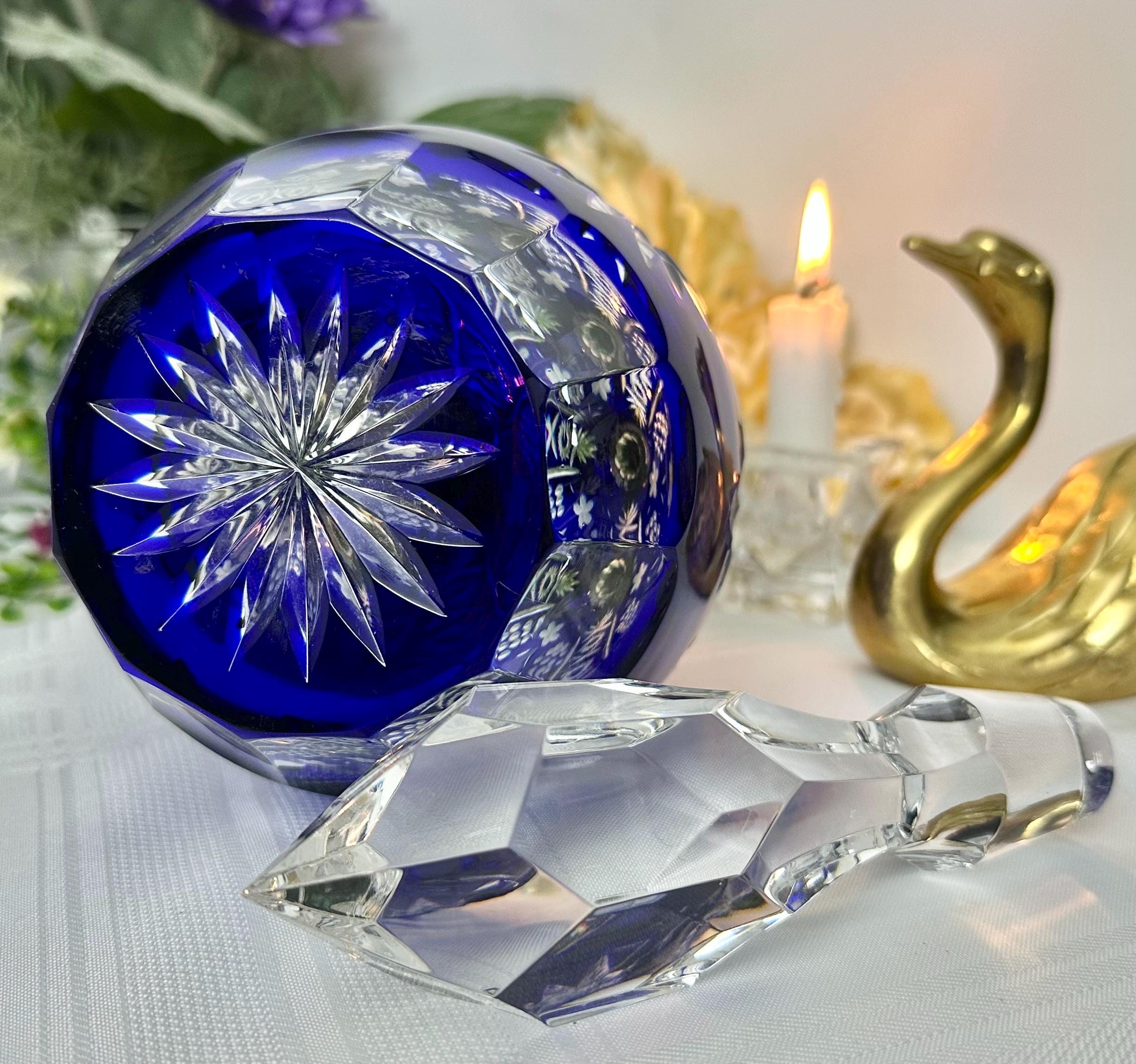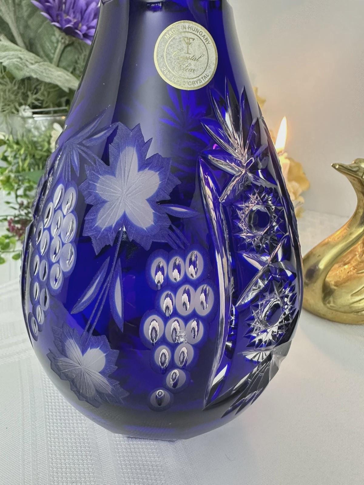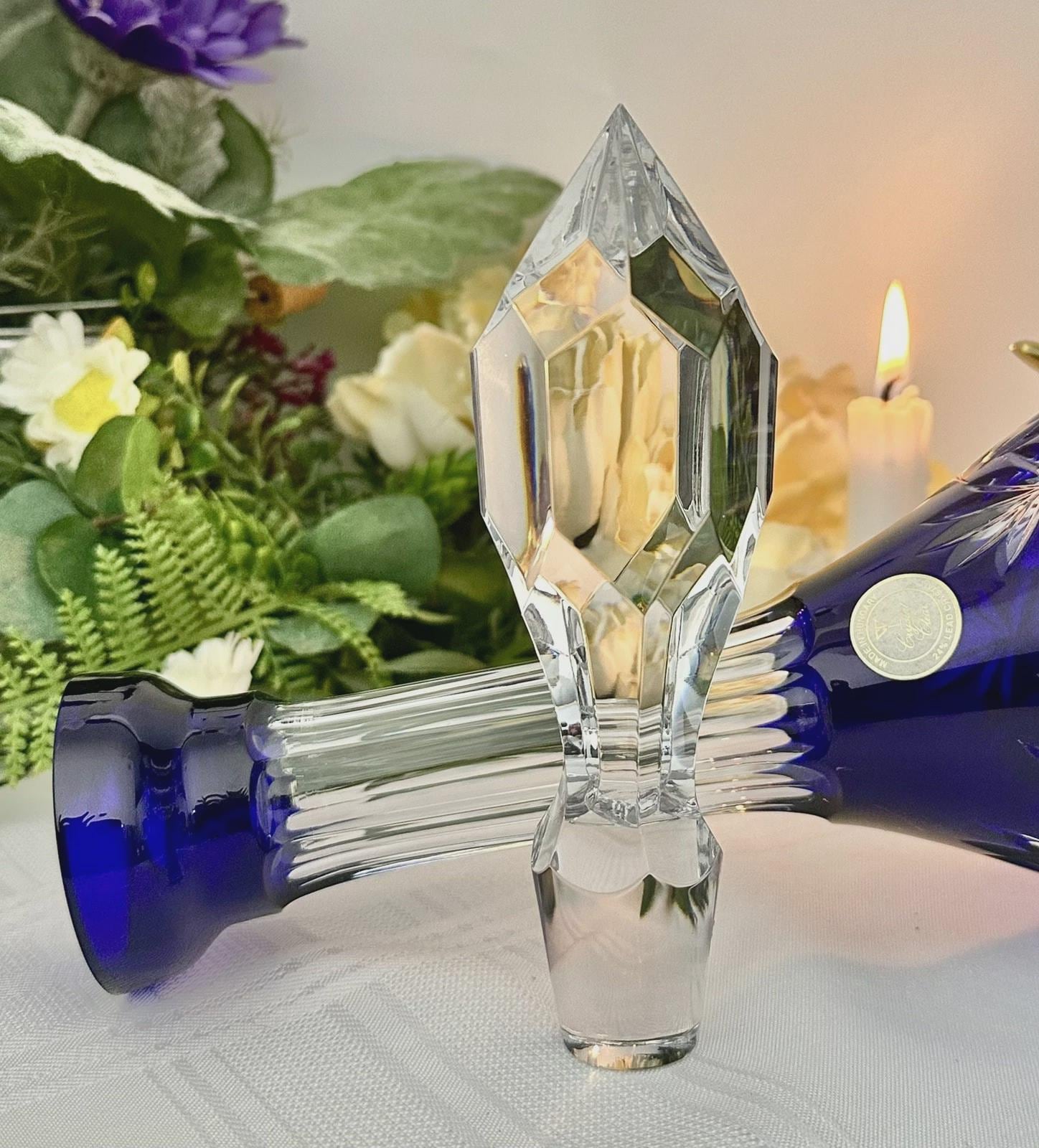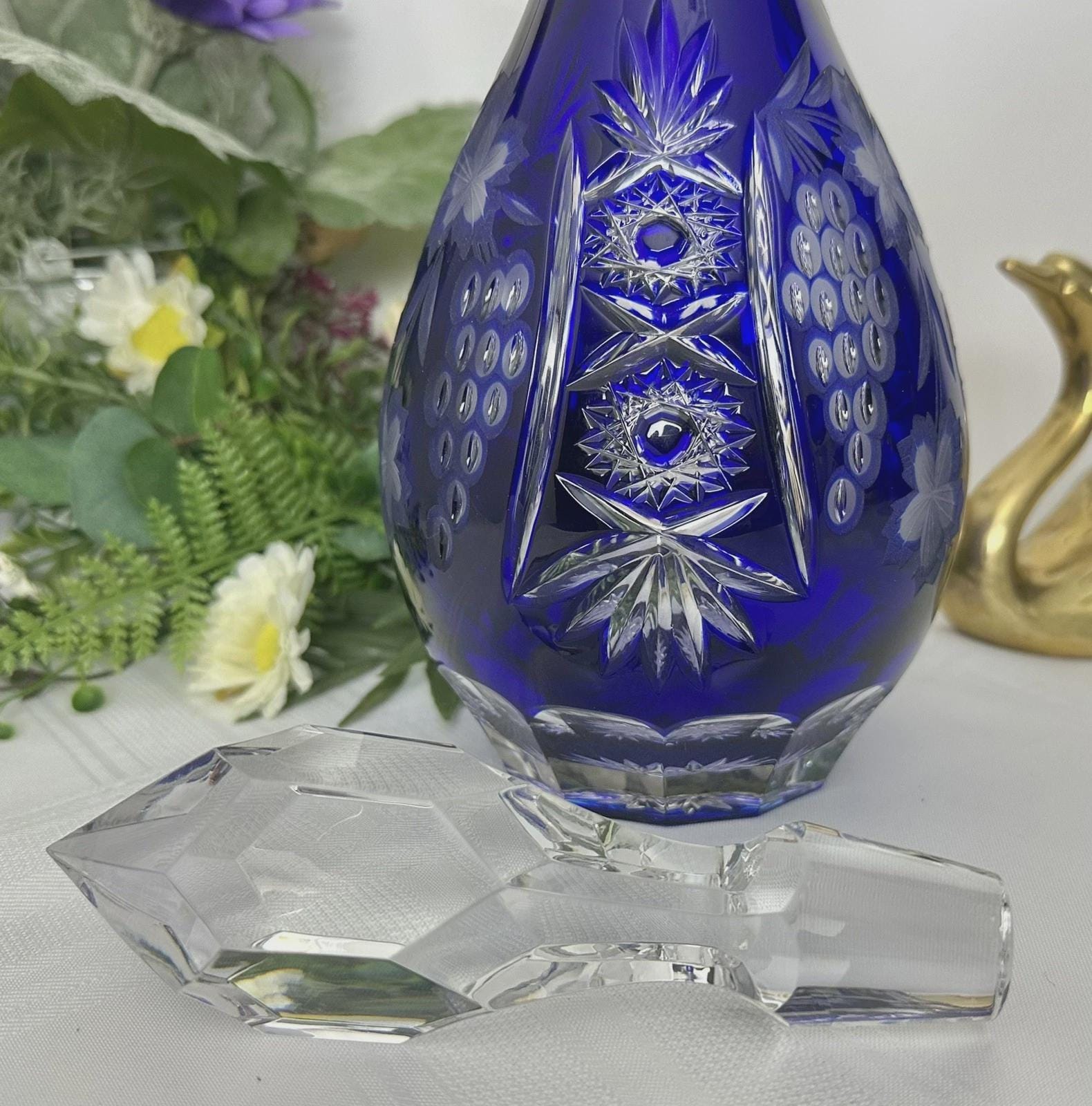 This is for a Blue decanter from Crystal Clear Industries. This tall Blue Cut Decanter is a vintage and elegant piece of barware perfect for all occasions. Made of glass with a beautiful grapes pattern and a large clear cut stopper, this round decanter exudes a Bohemian style.