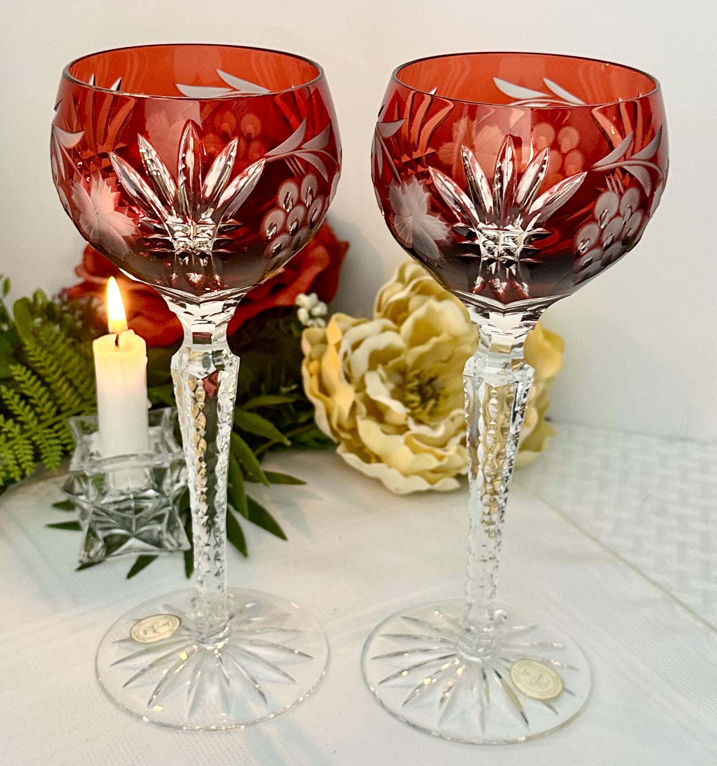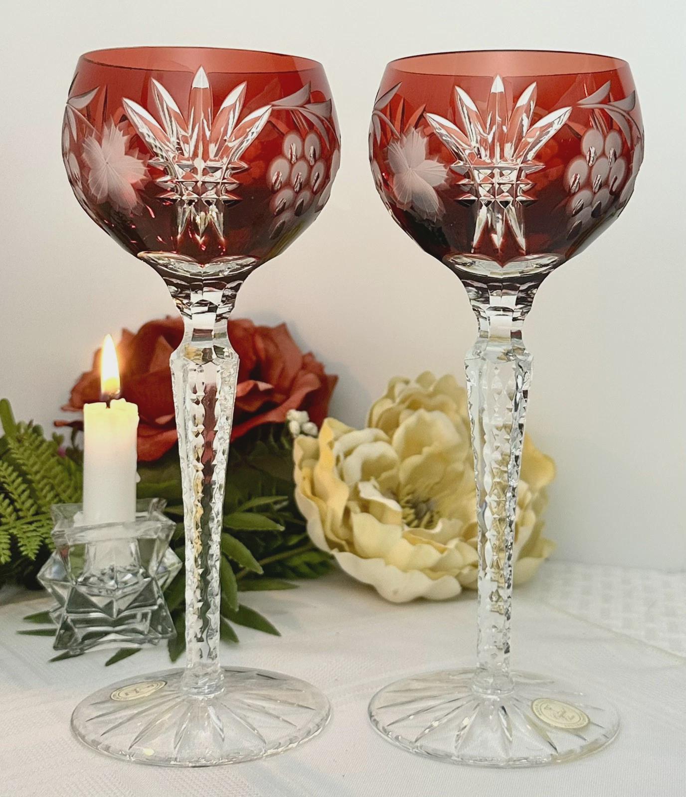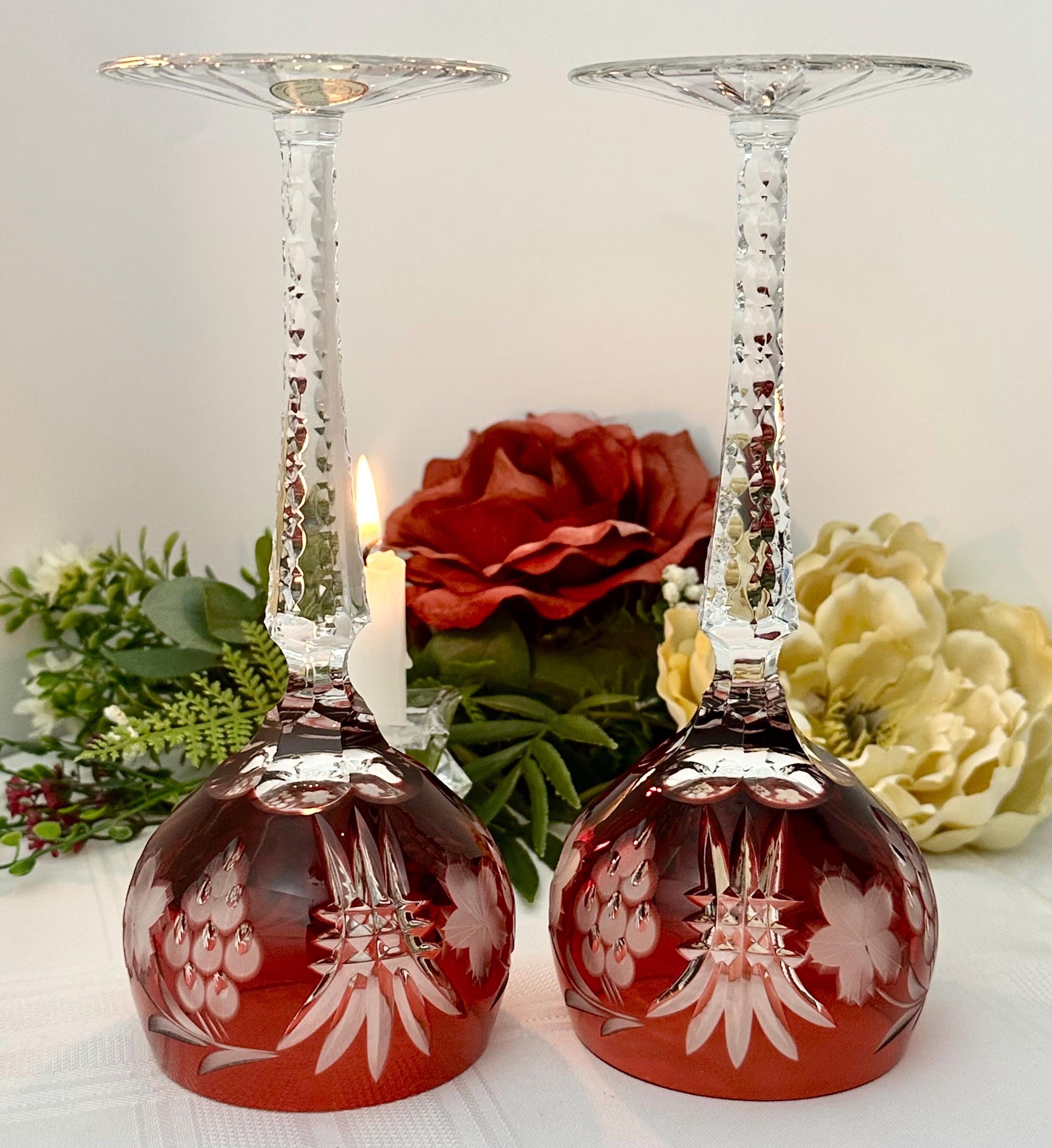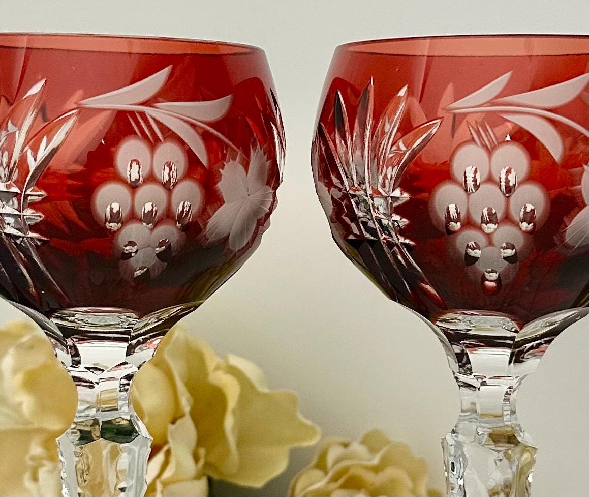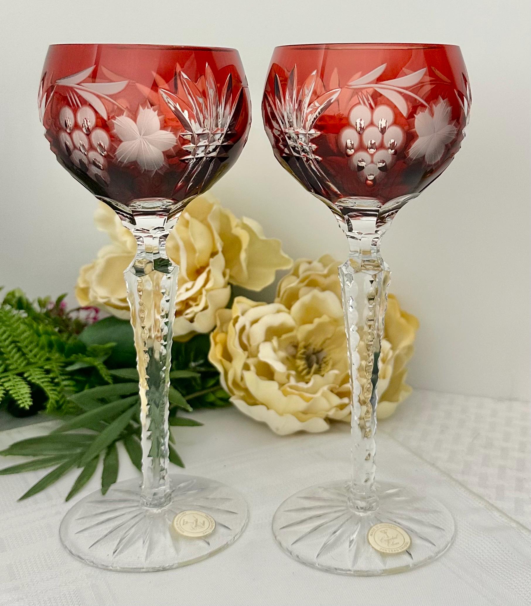 This is for a set of two Vintage Red Hock Wine Glasses featuring a bohemian cut to clear design. The stemmed, etched glasses are handmade in Hungary and have a notched stem and a star cut foot make them a unique addition to any barware collection. The beautiful hand crafted Red cut to clear blown glasses are 8 1/4 inches tall with a diameter of 2 7/8 inches.