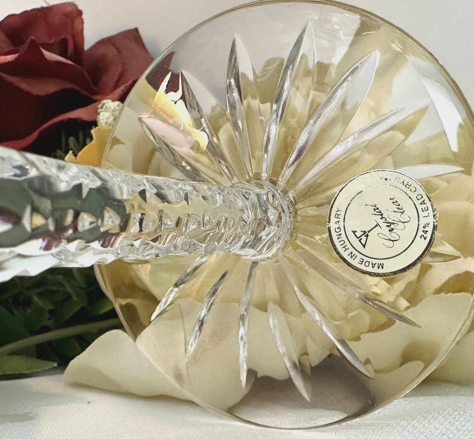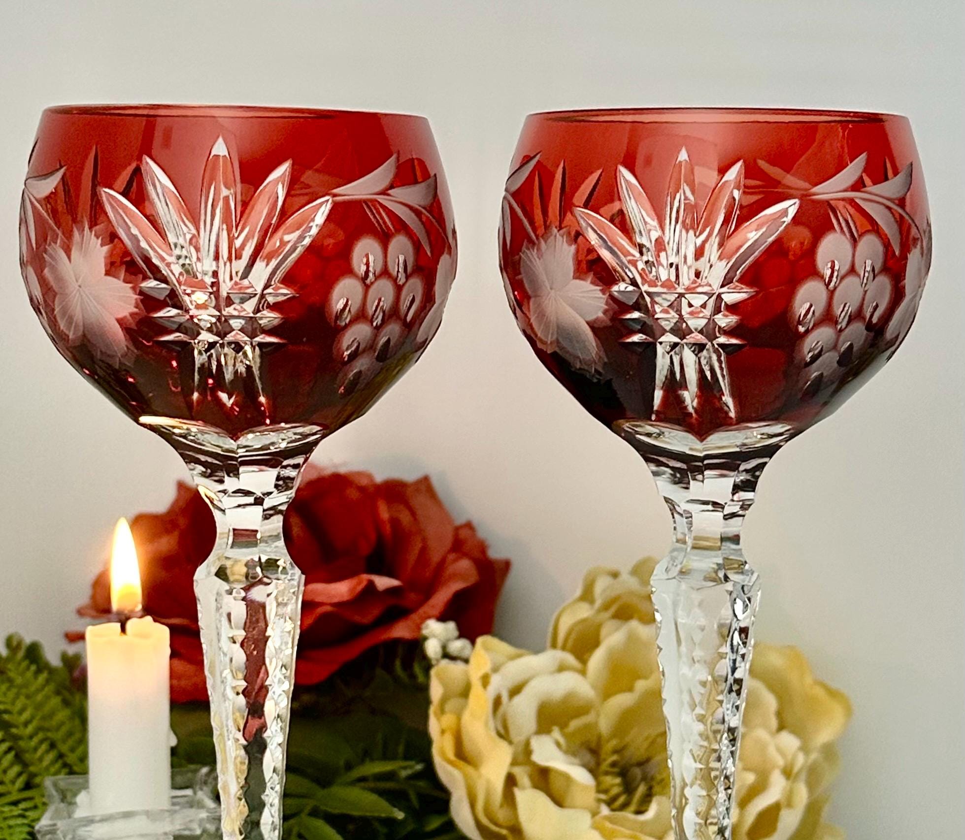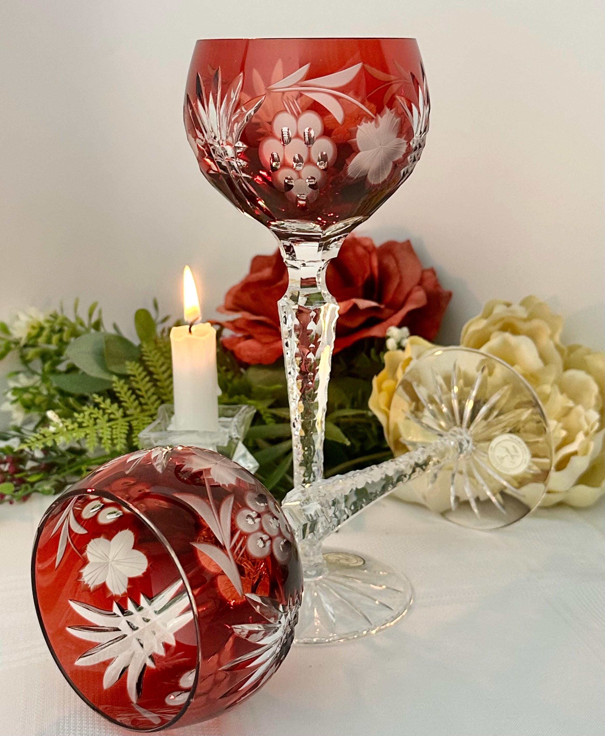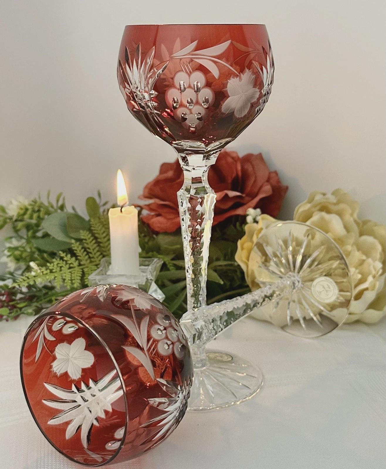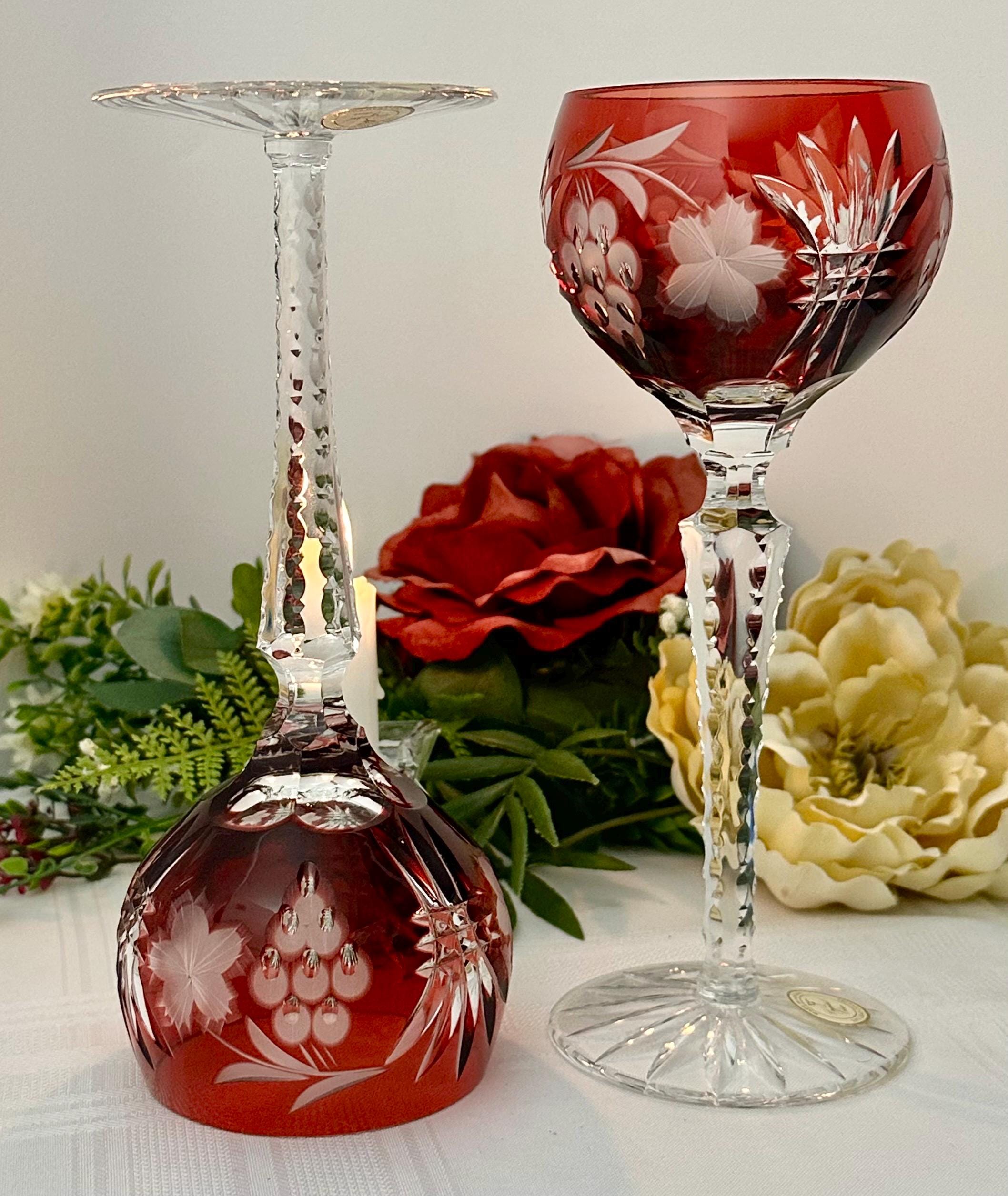 This is for a set of two Vintage Red Hock Wine Glasses featuring a bohemian cut to clear design. The stemmed, etched glasses are handmade in Hungary and have a notched stem and a star cut foot make them a unique addition to any barware collection. The beautiful hand crafted Red cut to clear blown glasses are 8 1/4 inches tall with a diameter of 2 7/8 inches.