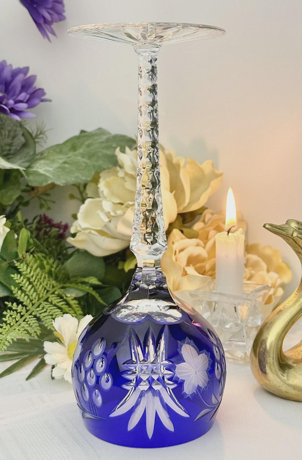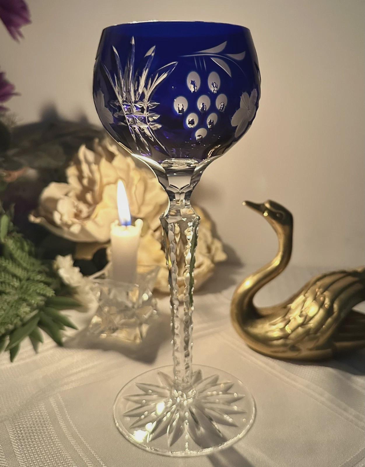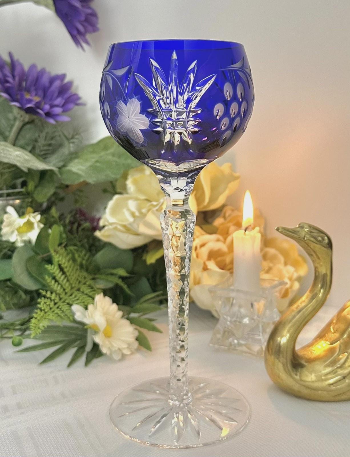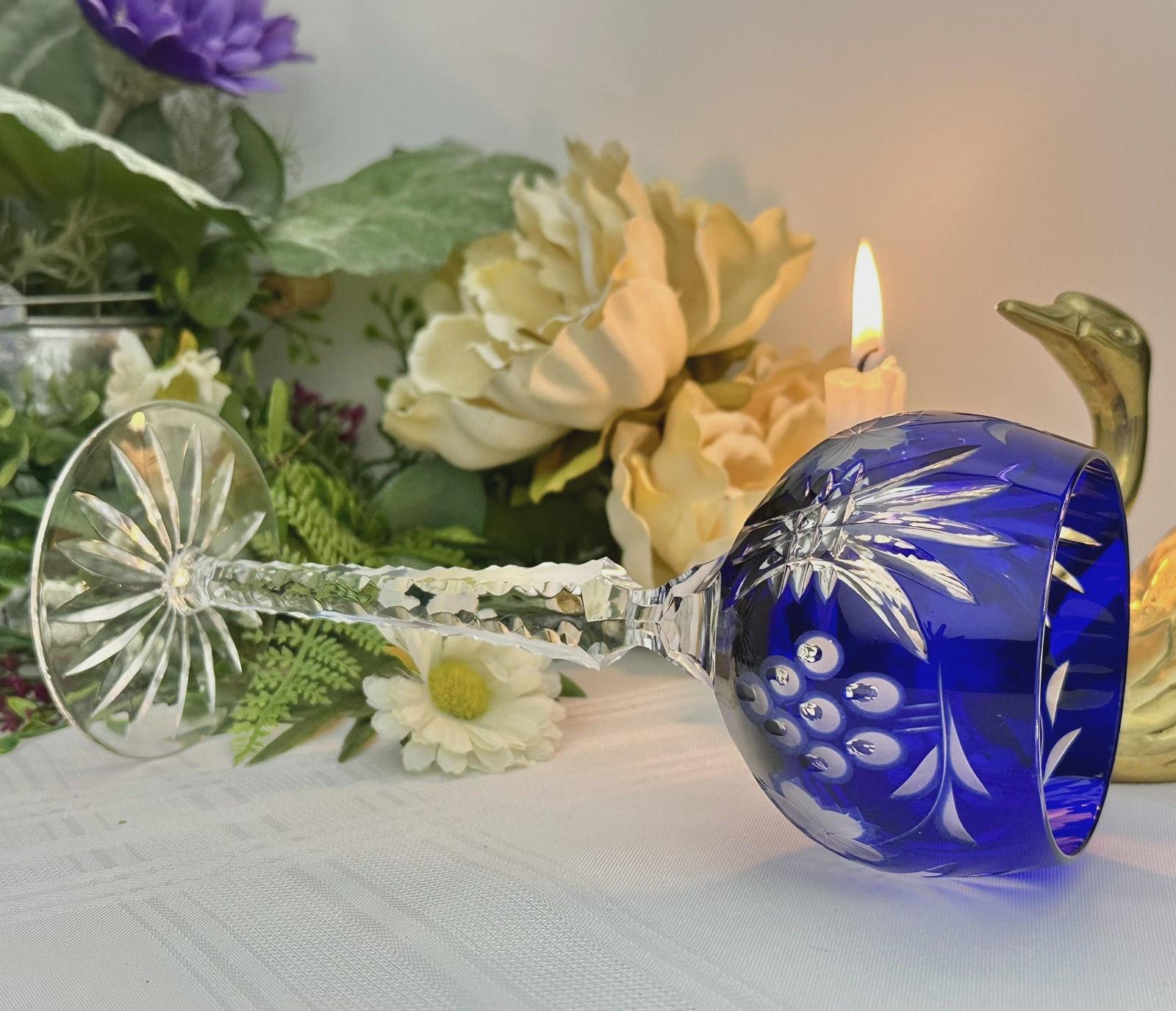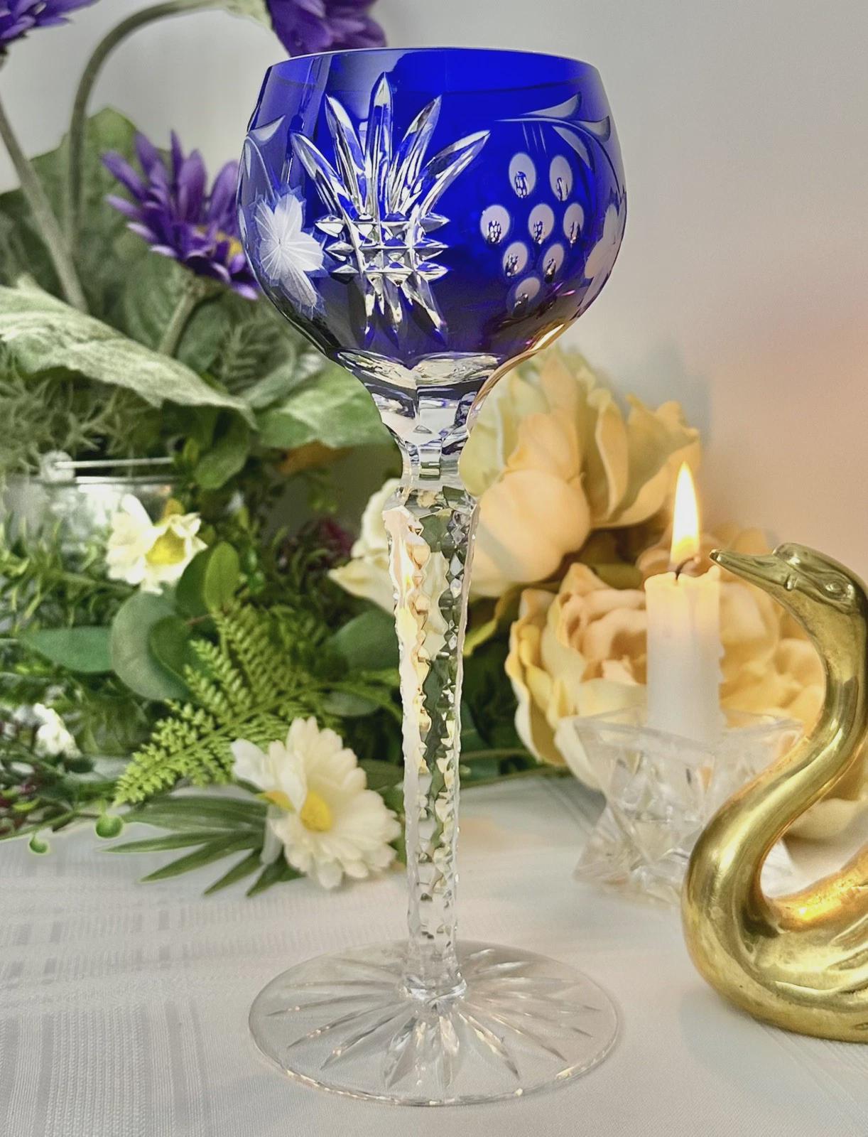 This is for 1 Vintage Blue / Cobalt Blue Hock Wine Glass featuring a bohemian cut to clear design. The stemmed, etched glass is handmade in Hungary and has a notched stem and a star cut foot make for a unique addition to any barware collection. The beautiful Blue hand crafted blown glass measures 8 1/4 inches tall with a diameter of 2 7/8 inches.