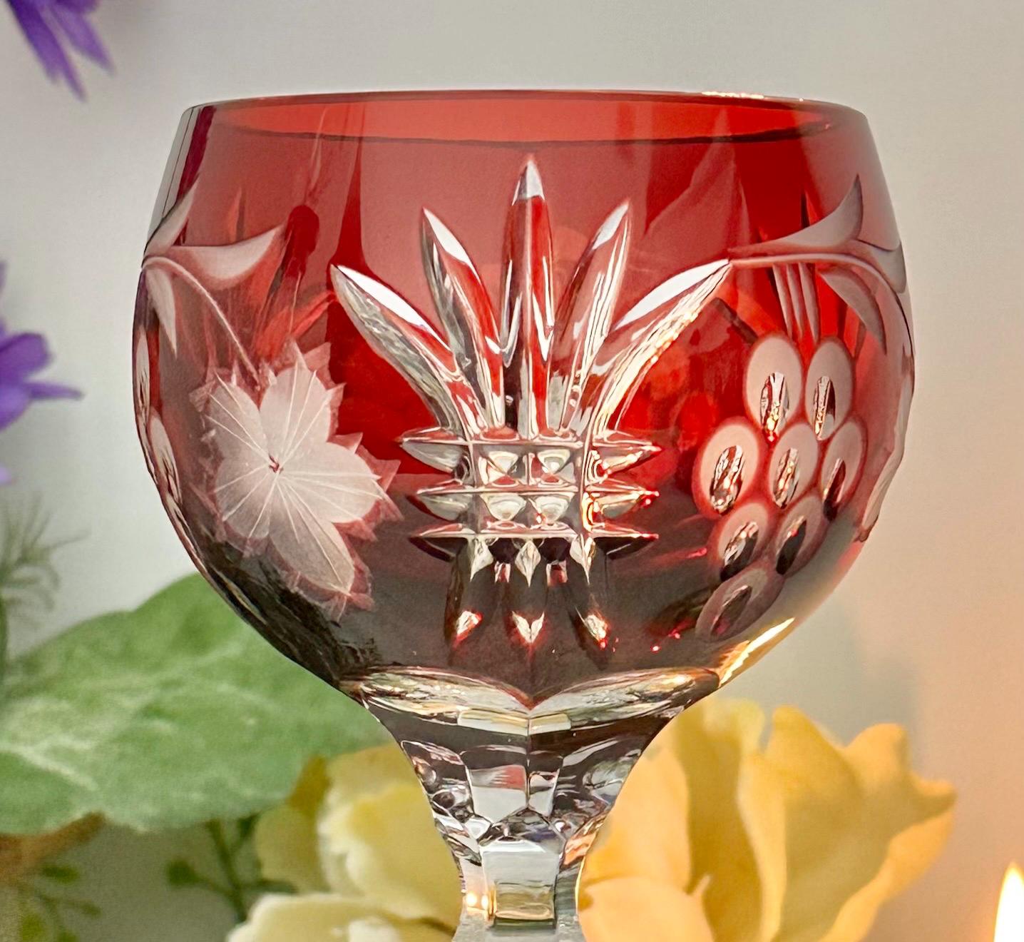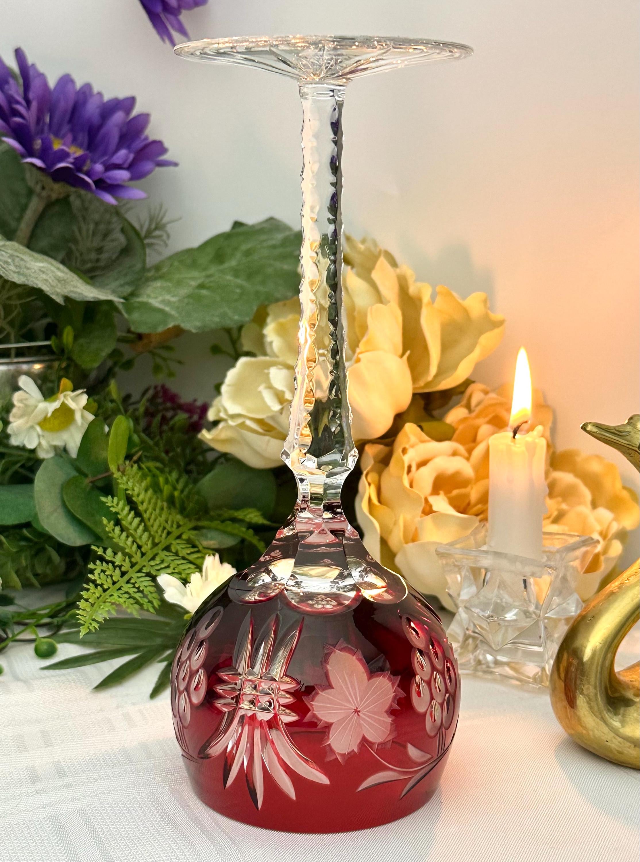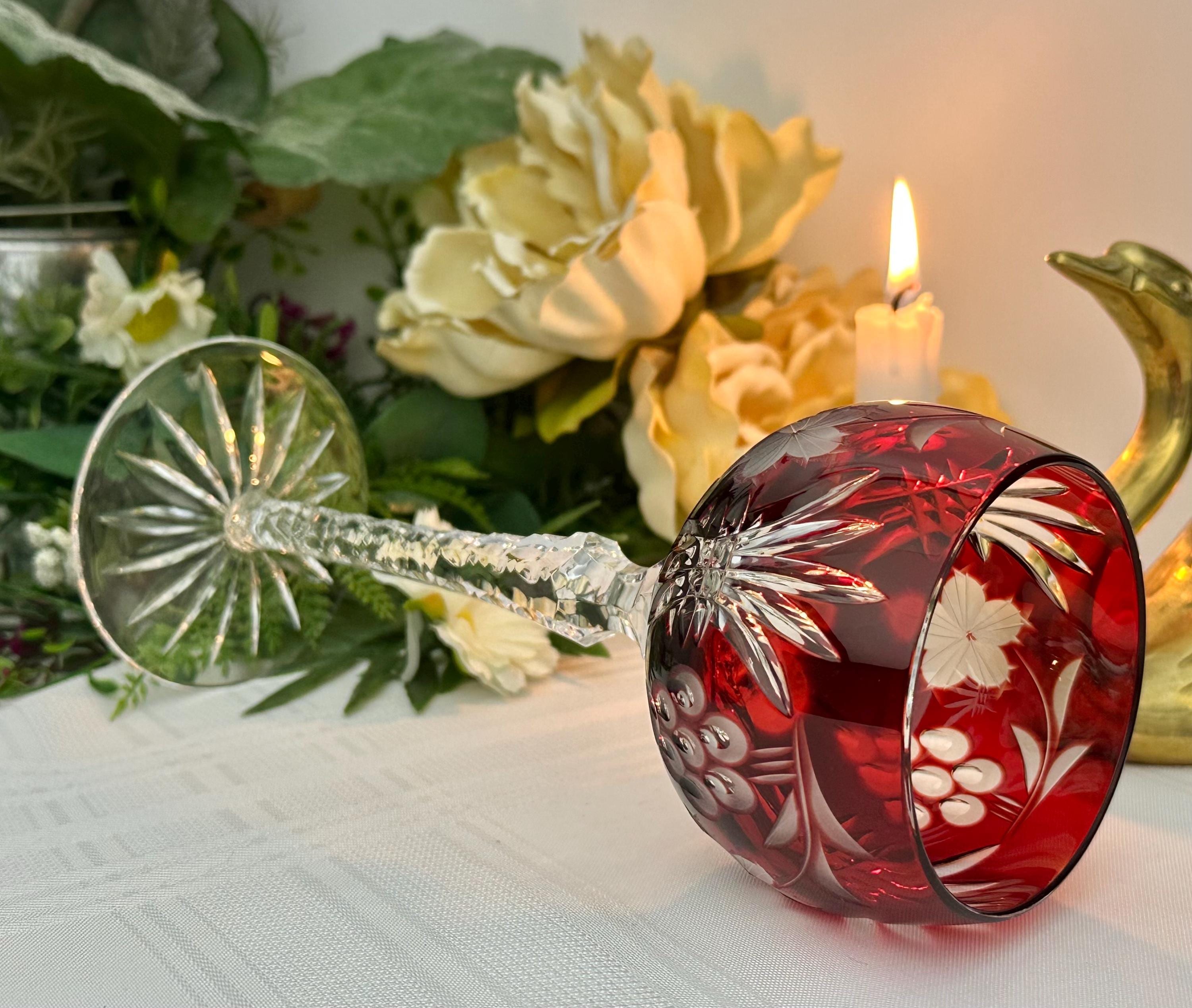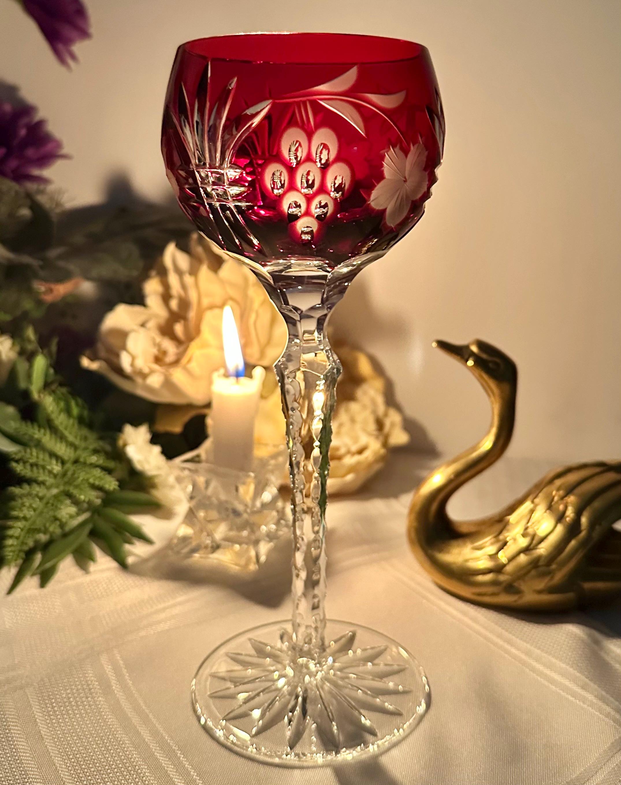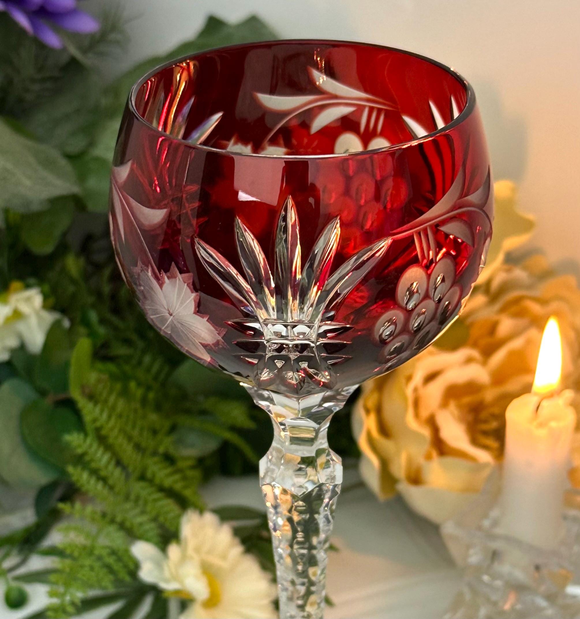 This is for 1 Vintage Red Hock Wine Glass featuring a bohemian cut to clear design. The stemmed, etched glass is handmade in Hungary and has a notched stem and a star cut foot make for a unique addition to any barware collection. The beautiful Red hand crafted blown glass measures 8 1/4 inches tall with a diameter of 2 7/8 inches.