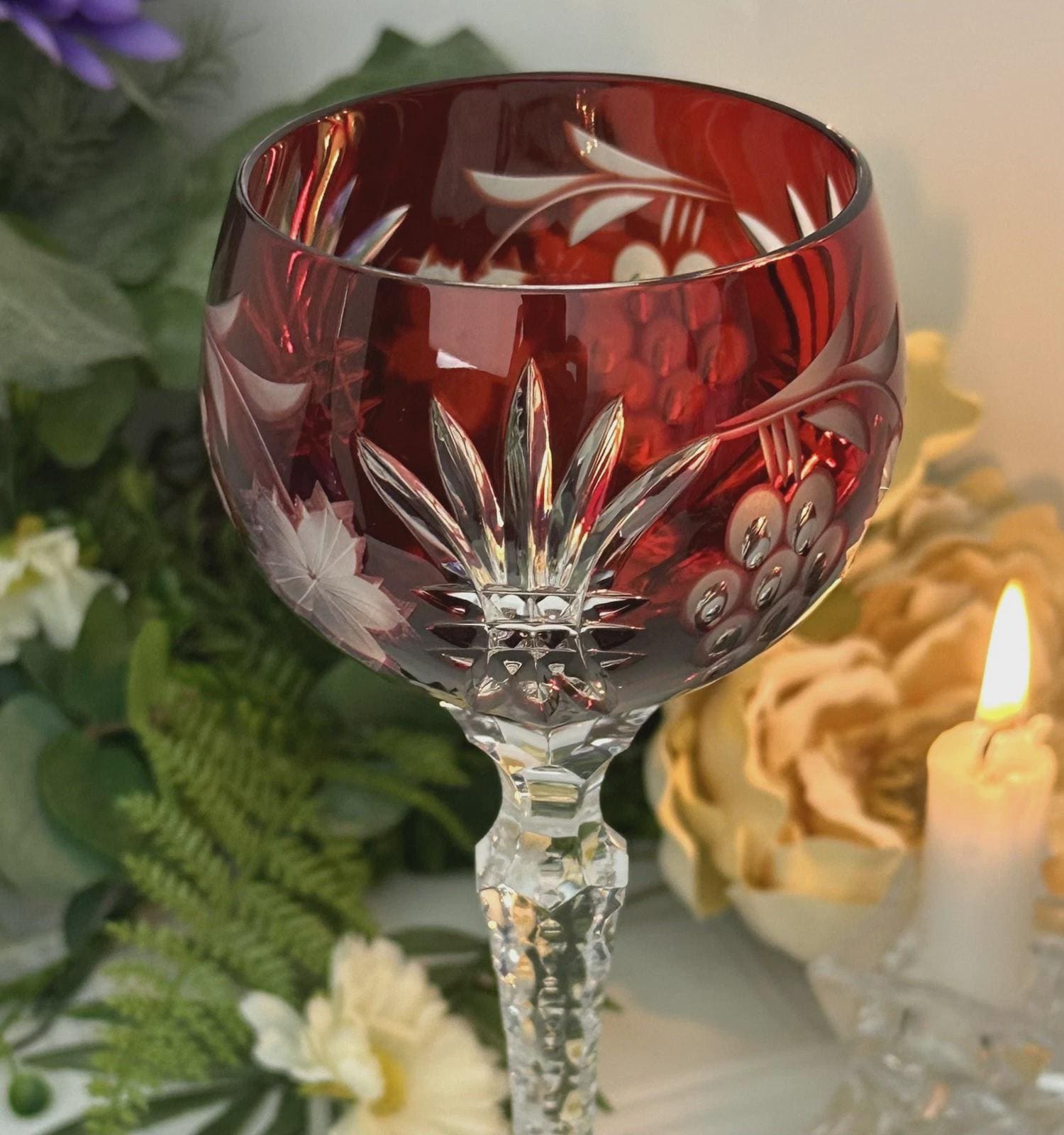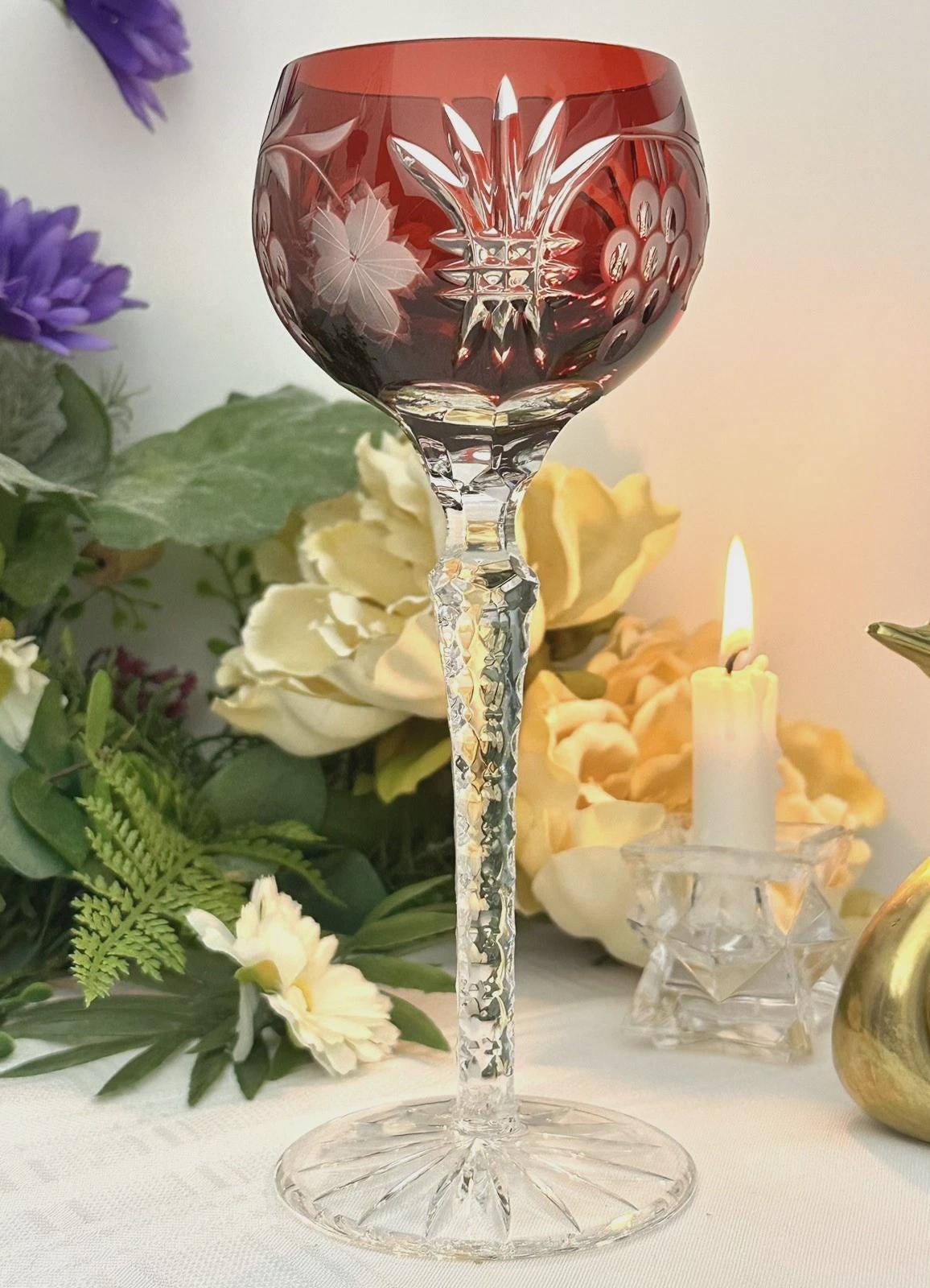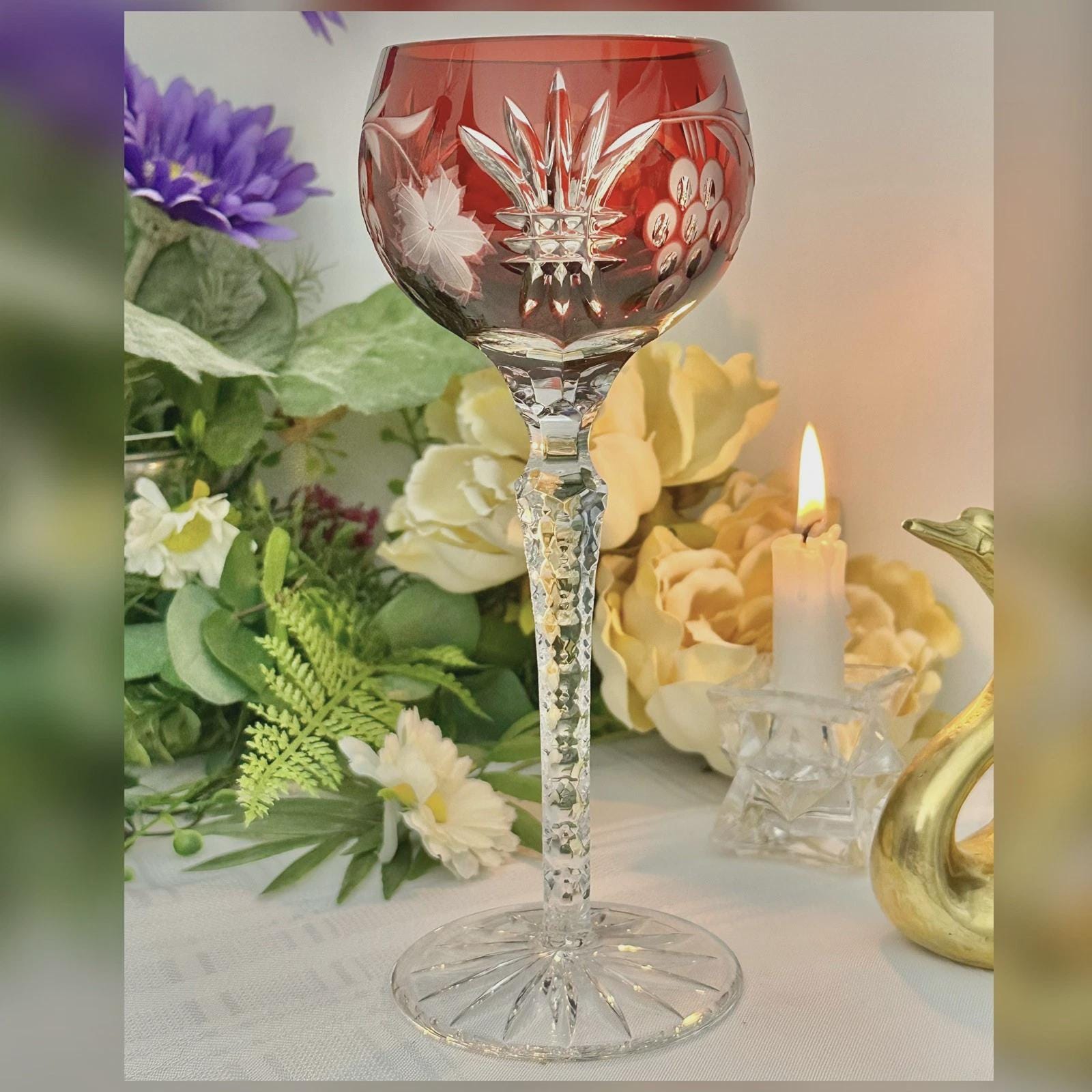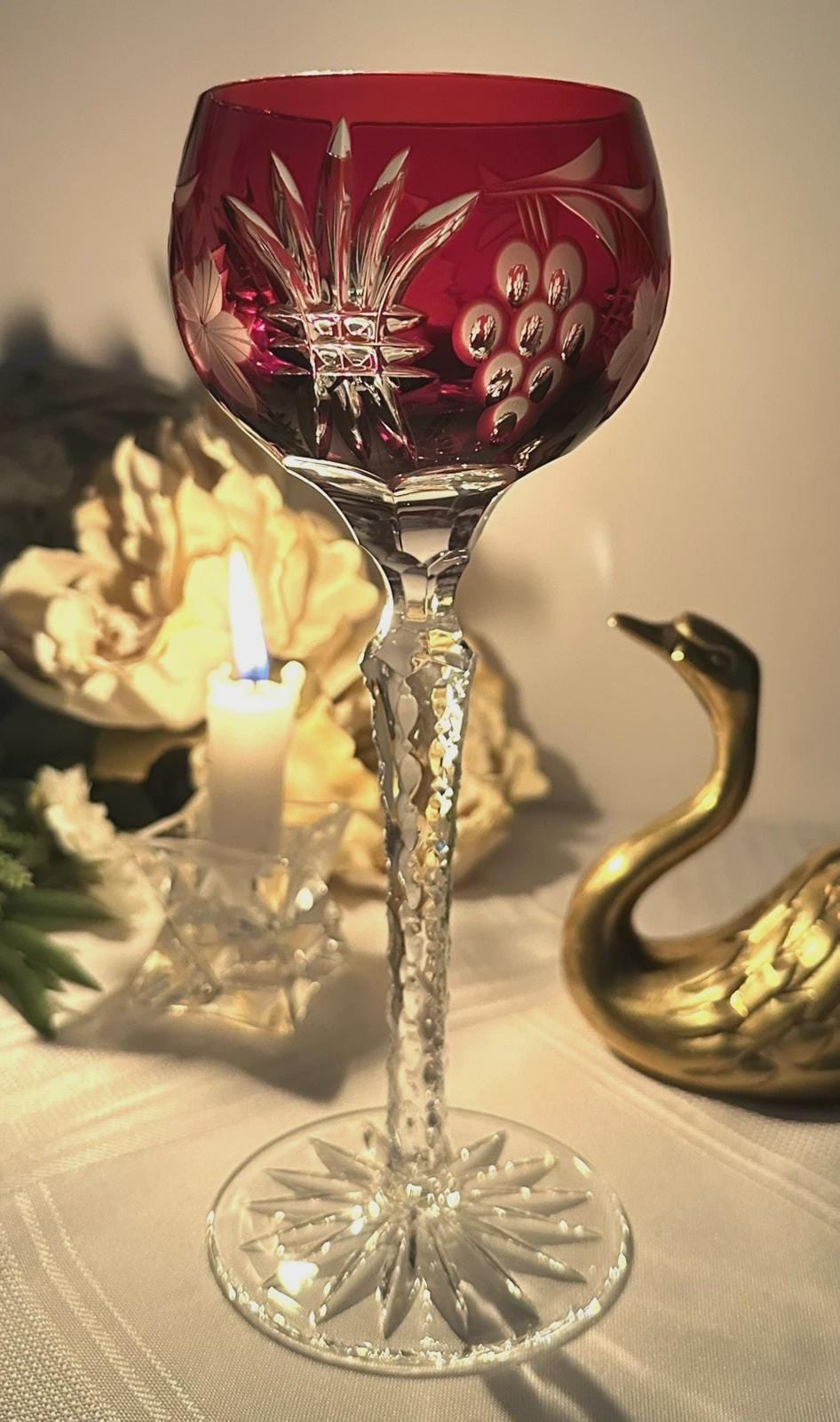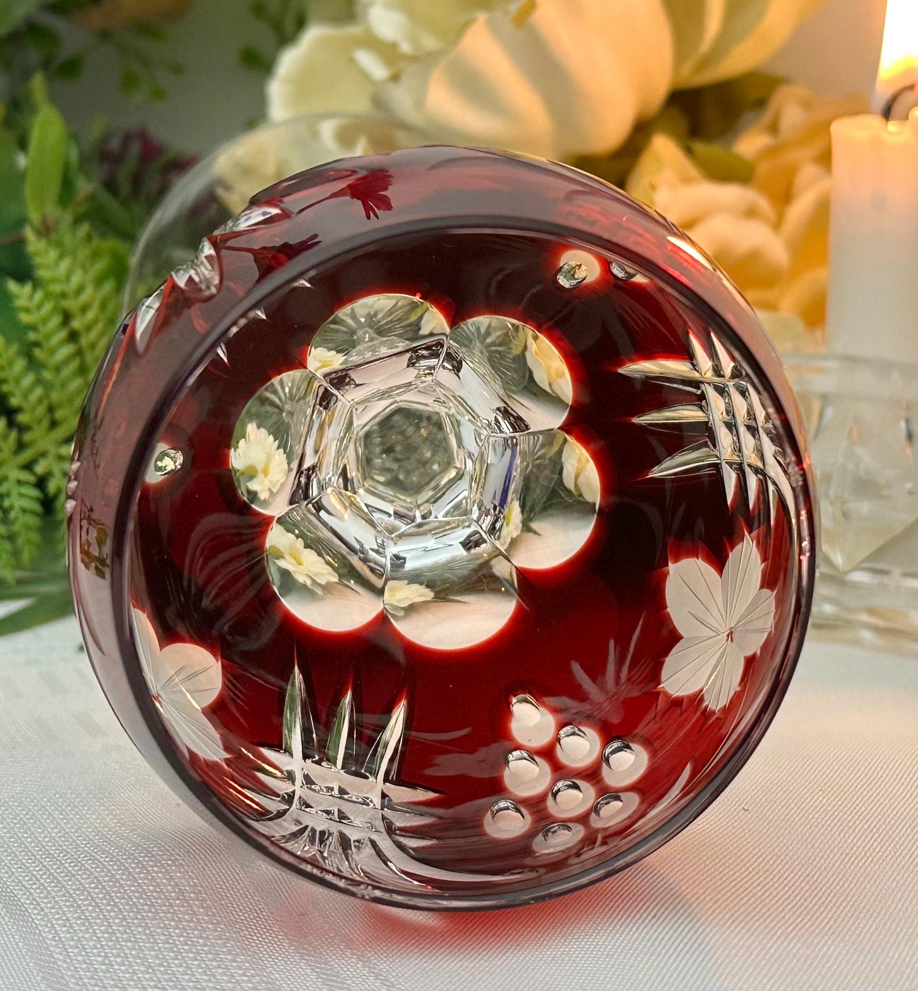 This is for 1 Vintage Red Hock Wine Glass featuring a bohemian cut to clear design. The stemmed, etched glass is handmade in Hungary and has a notched stem and a star cut foot make for a unique addition to any barware collection. The beautiful Red hand crafted blown glass measures 8 1/4 inches tall with a diameter of 2 7/8 inches.