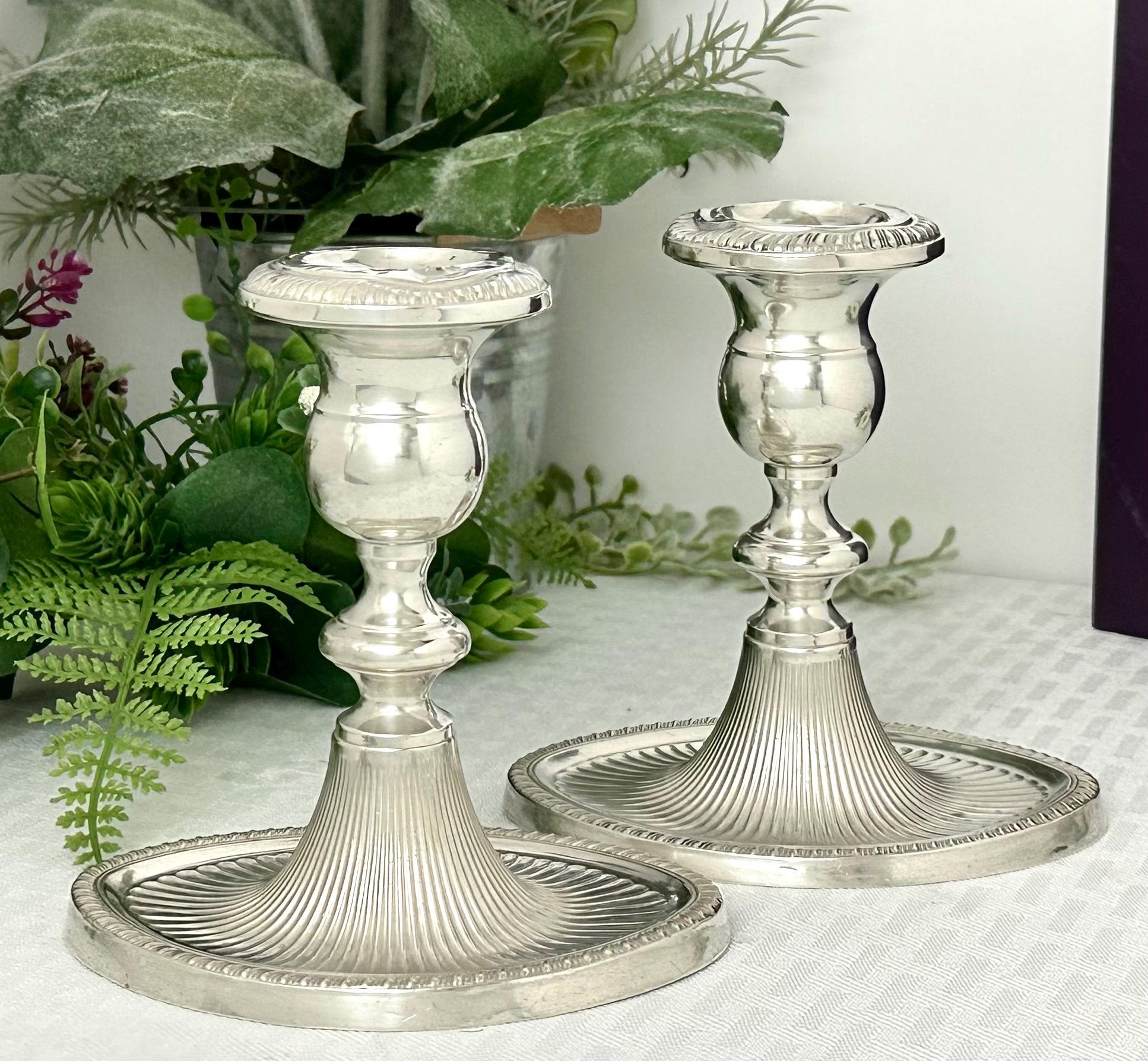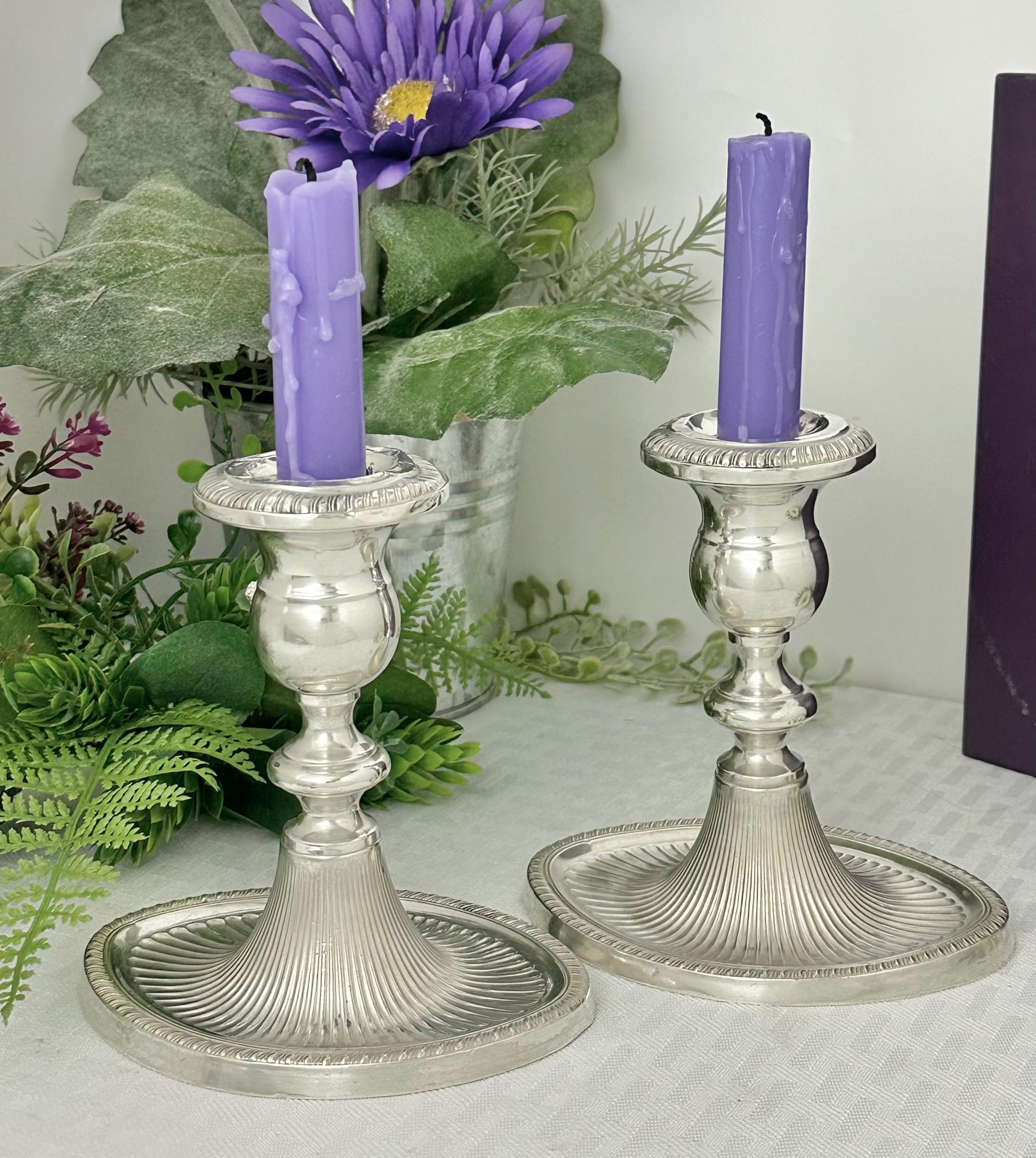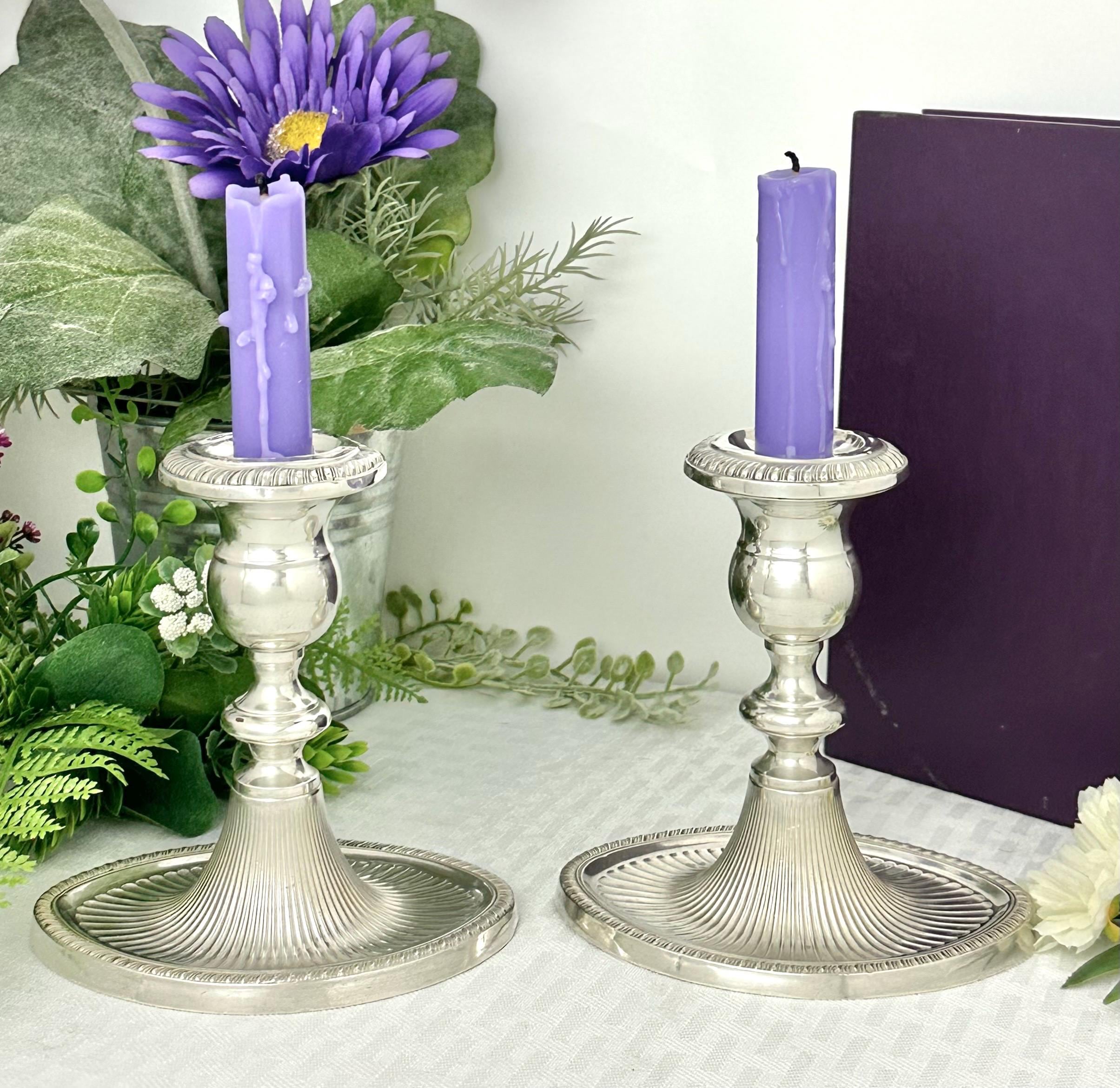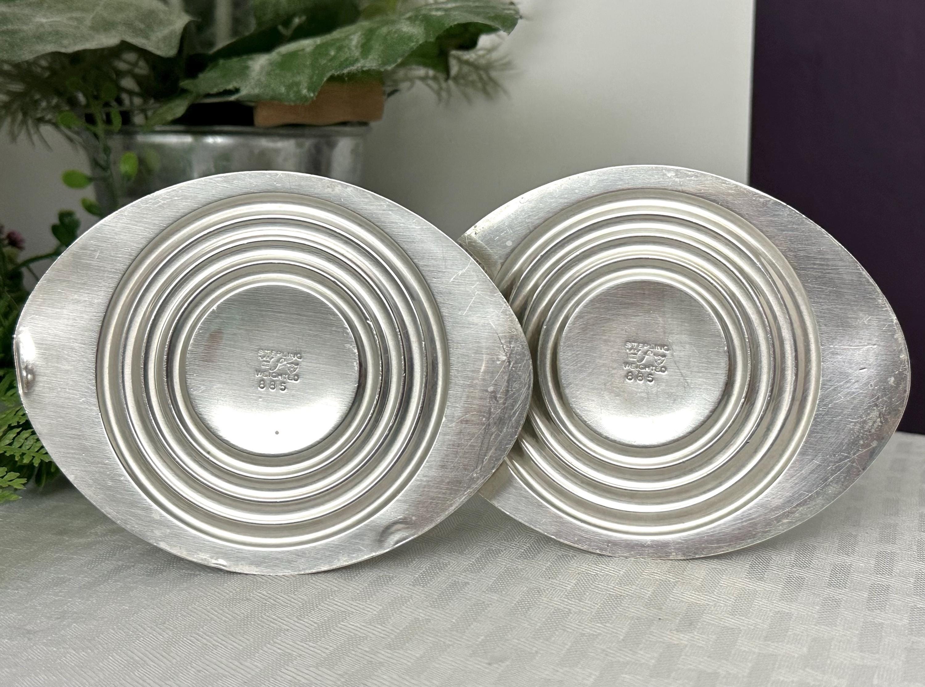 This is for a beautiful Vintage Pair of Sterling Silver Candle Holders from Fisher Silversmiths. These have an Art Deco styling with a fluted base design. Crafted from sterling silver (.925), these console candlesticks are elegantly designed with a depth of 3 1/2 inches and a width of 4 3/4 inches. The height of each candle holder is 4 3/4 inches, making them a stunning centerpiece for any room in your home.