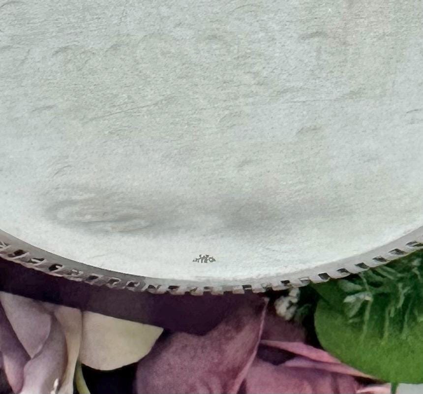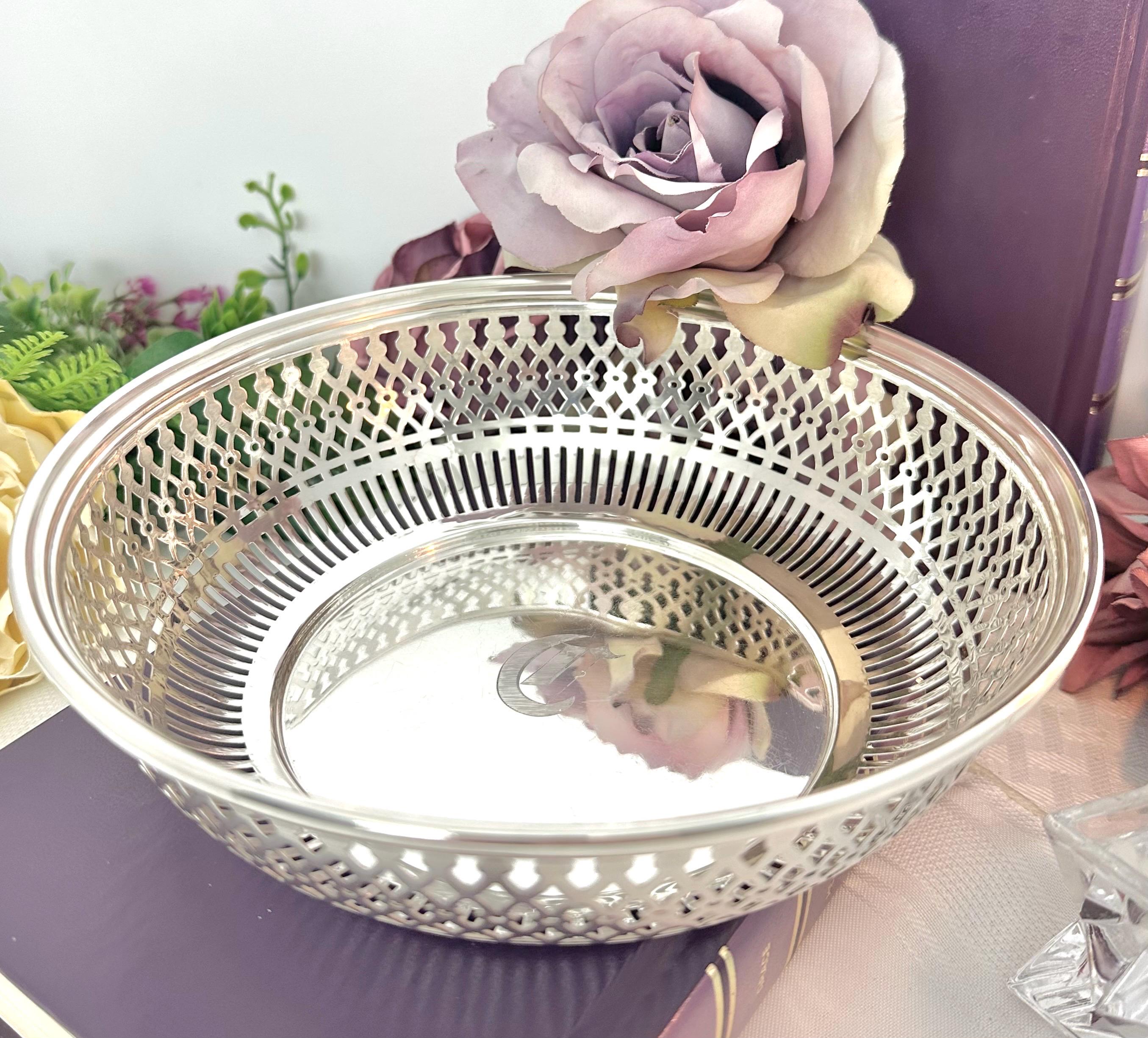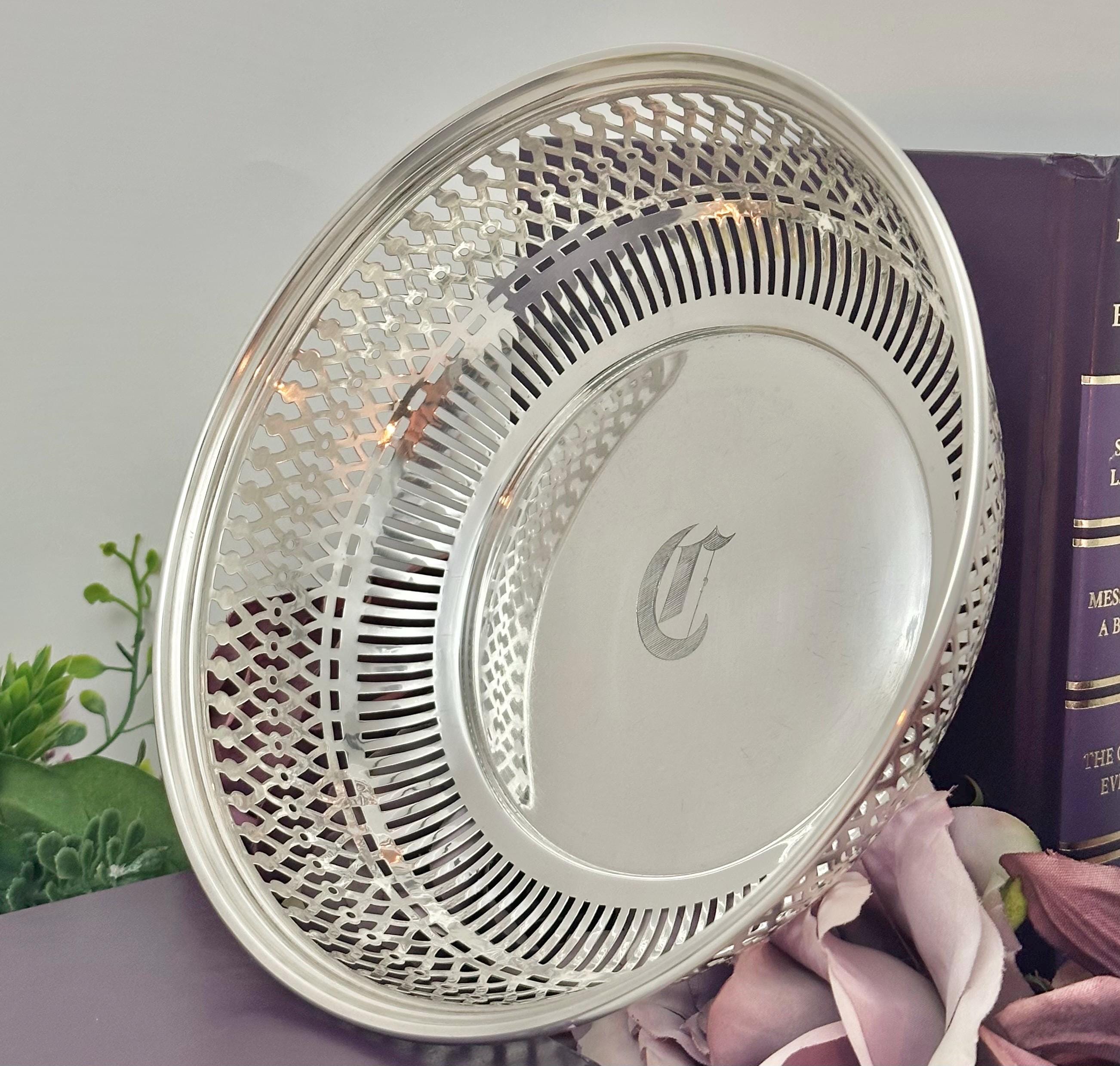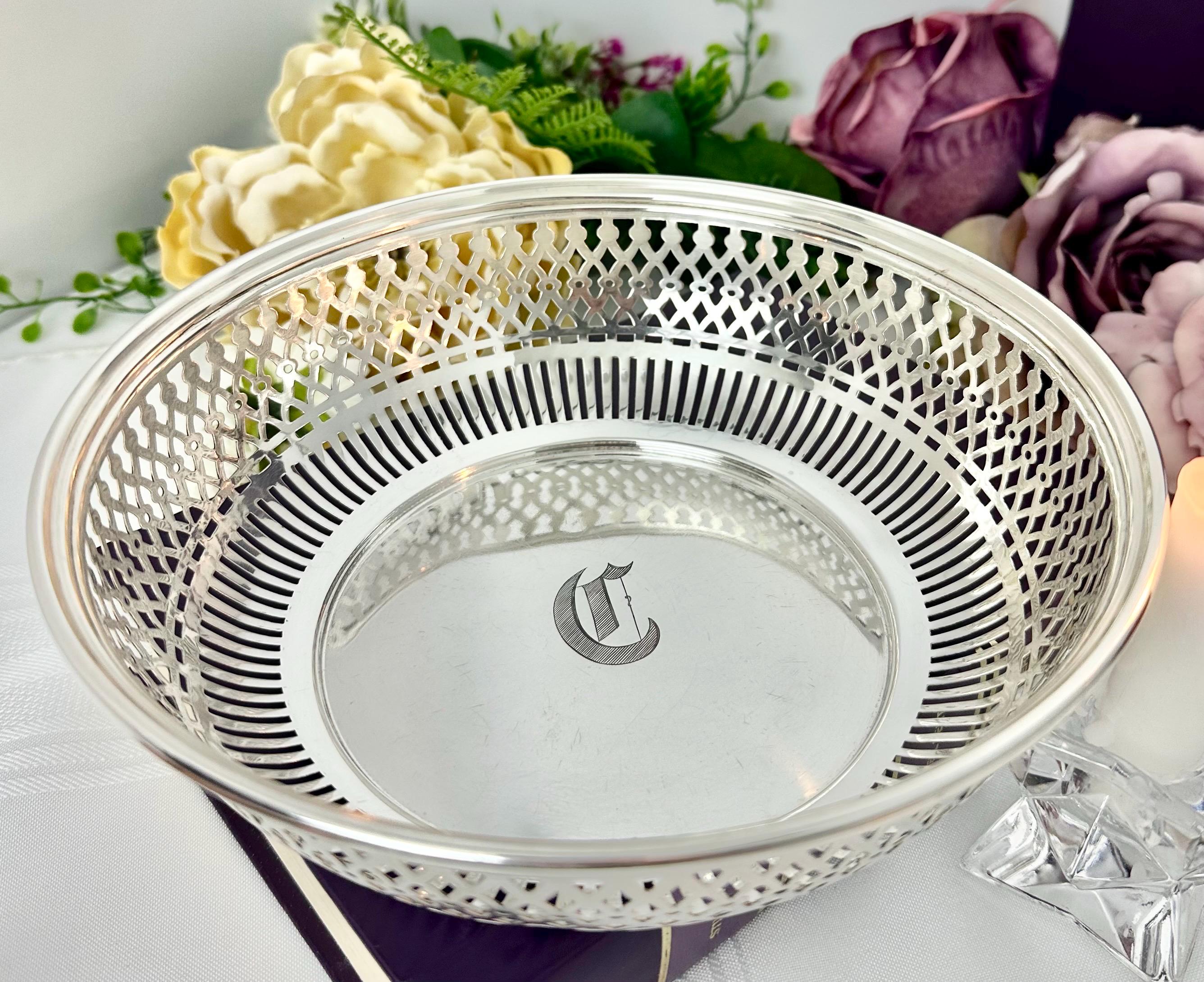 This is for a vintage Sterling Silver bowl from Manchester. The bowl features a pierced rim design and is monogrammed with what looks like a "D". The bowl is marked on the base with the Manchester logo of an M with a sword, Sterling and pattern number 2095/1.