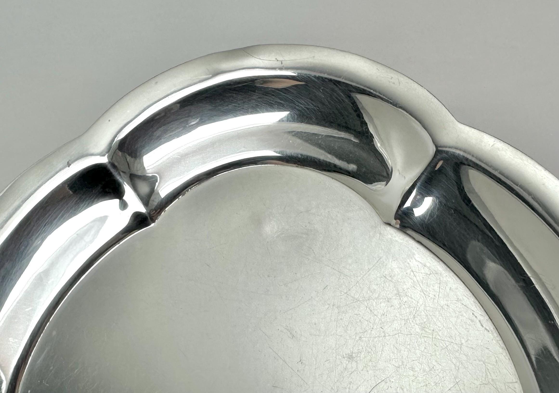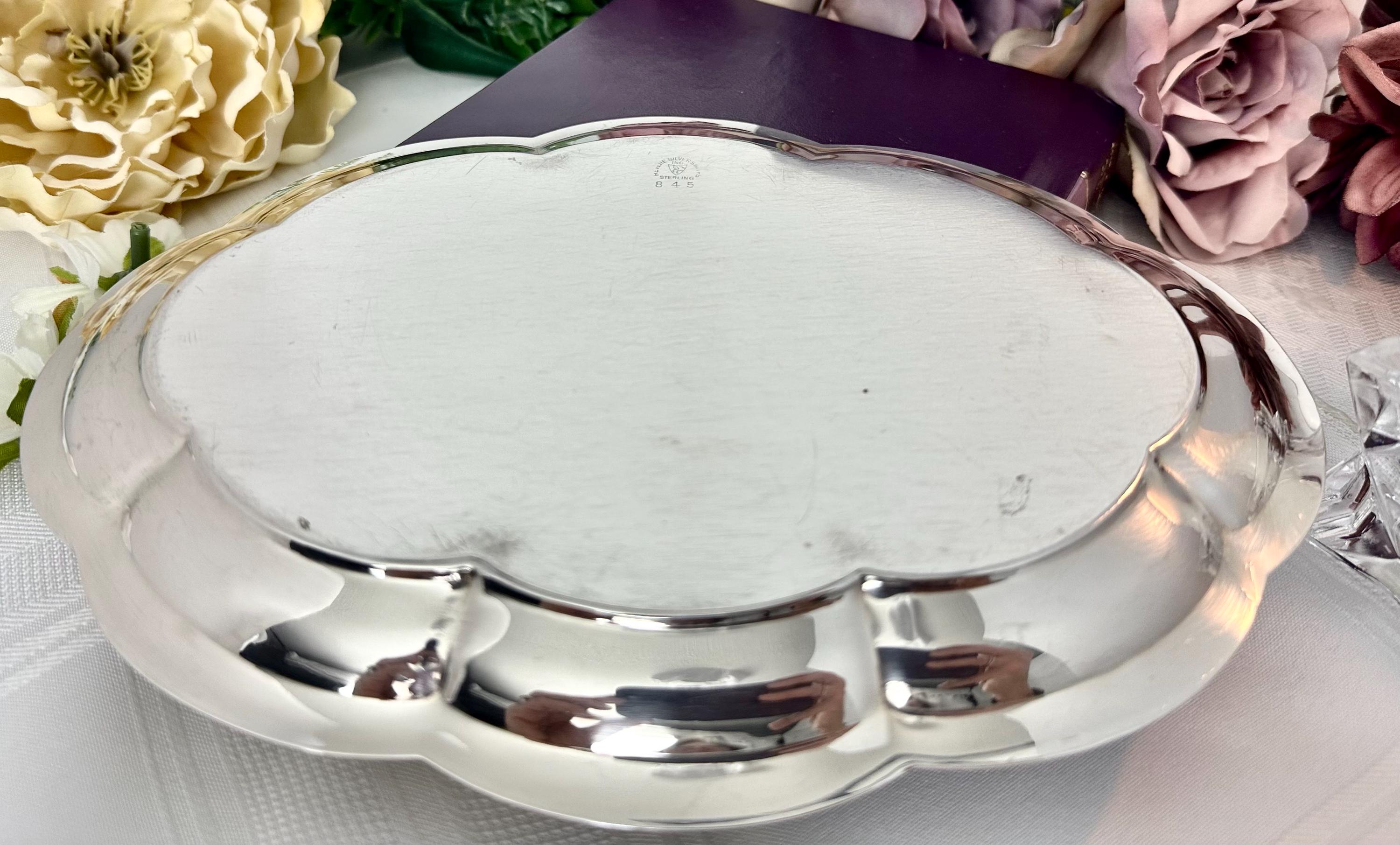 This elegant and classic tray was crafted in the United States, showcasing the high quality and craftsmanship of Revere Silversmiths. There is one pinpoint sized mark shown in the pictures. With all vintage Sterling items there are slight surface scratches due to use. It is polished and ready to display or use to hold anything from change to candles or as a serving item for cookies and or candy!