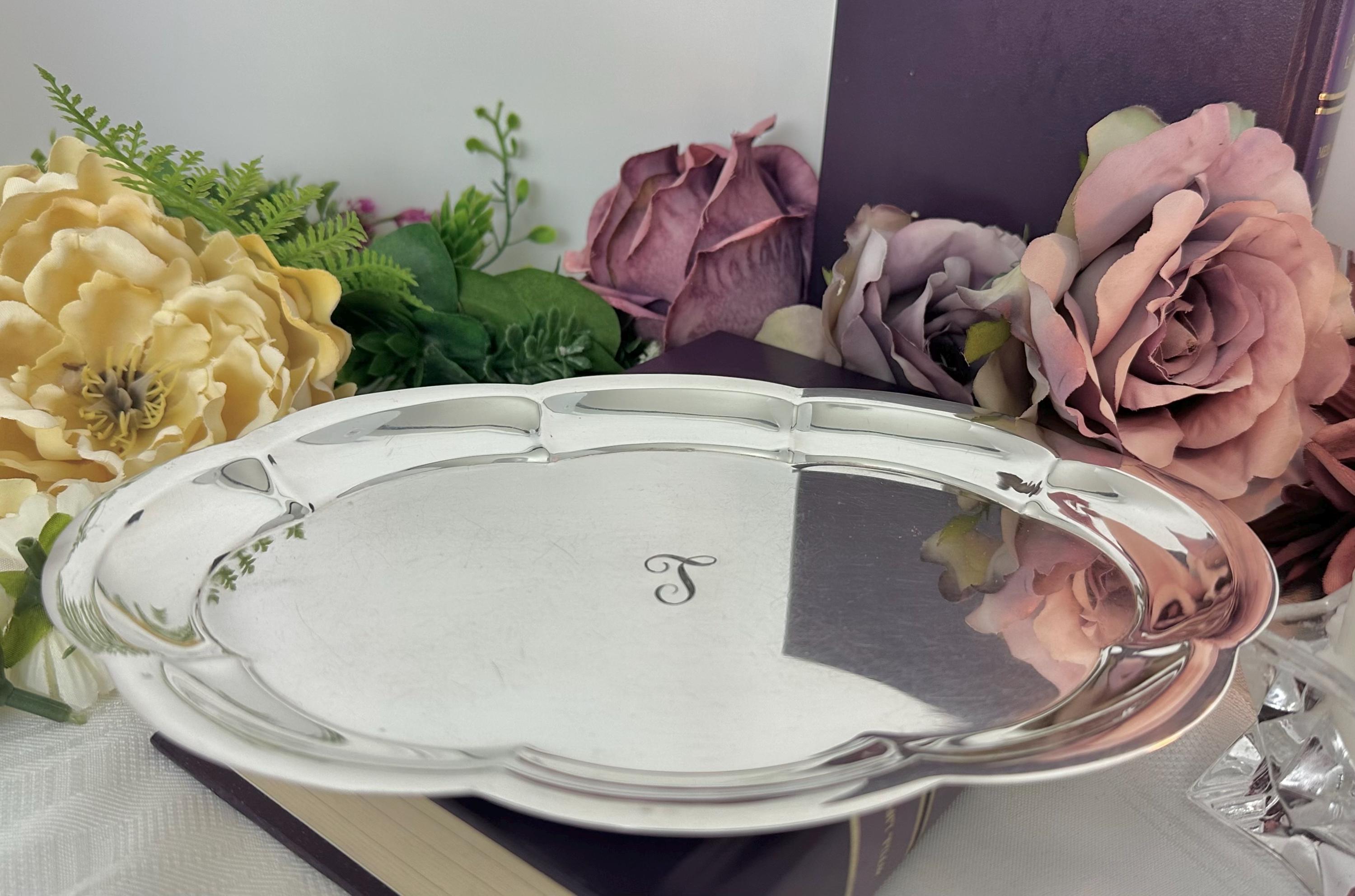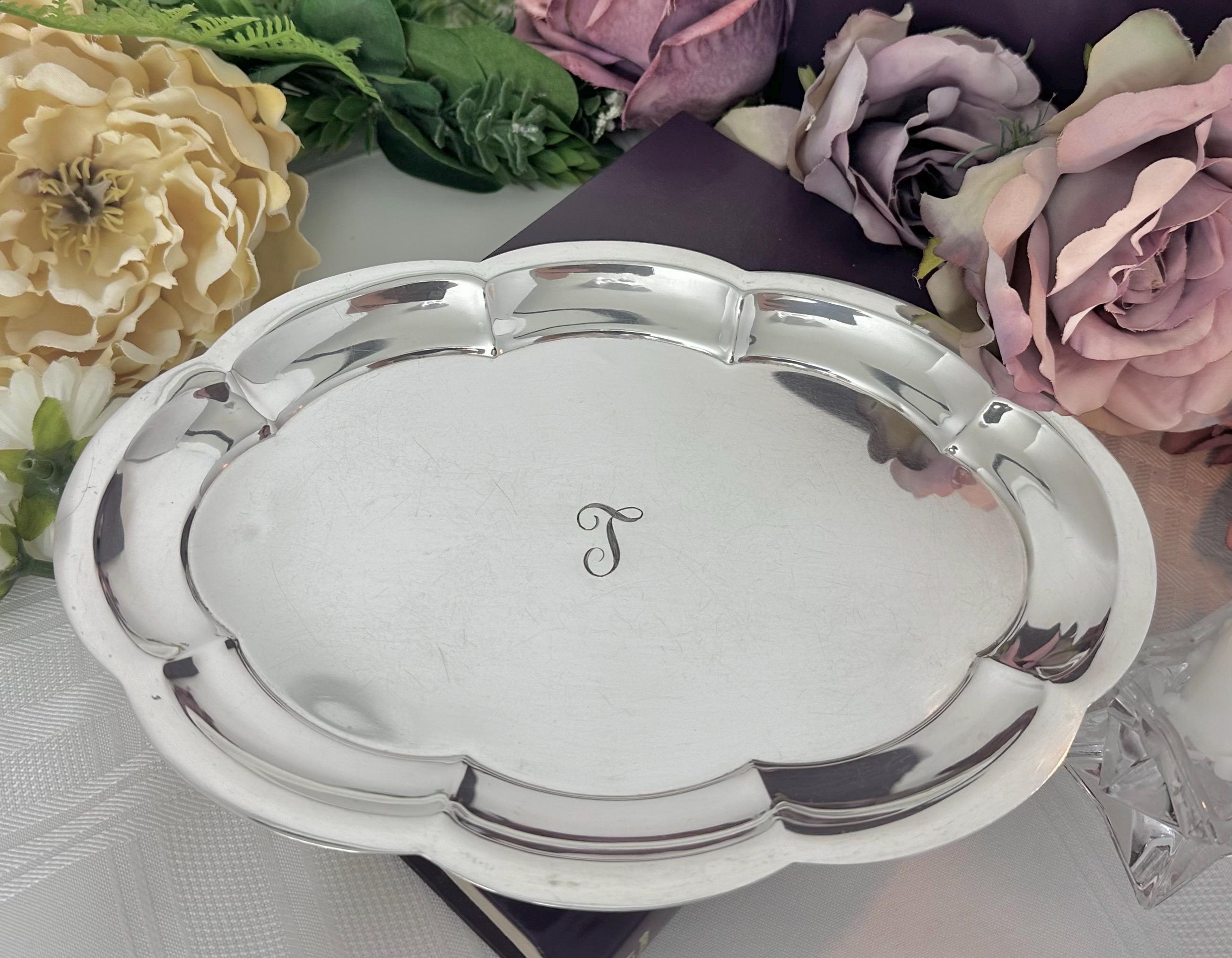 This is for a vintage Revere Silversmiths Sterling Scalloped Rim Plate. The tray measures 9.25" wide with a depth of 6.5 inches. This is monogrammed and crafted with sterling silver (.925). It is marked with pattern number 845 and has a monogram of either L or T. This has a weight of 205 grams.