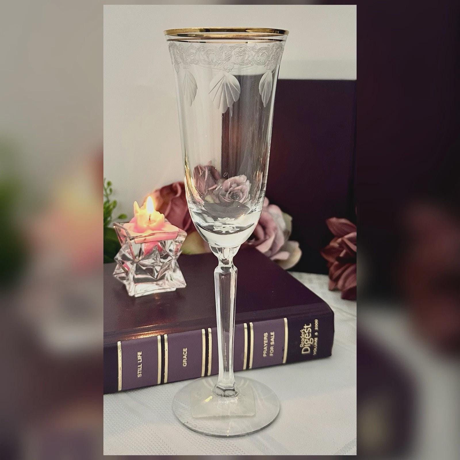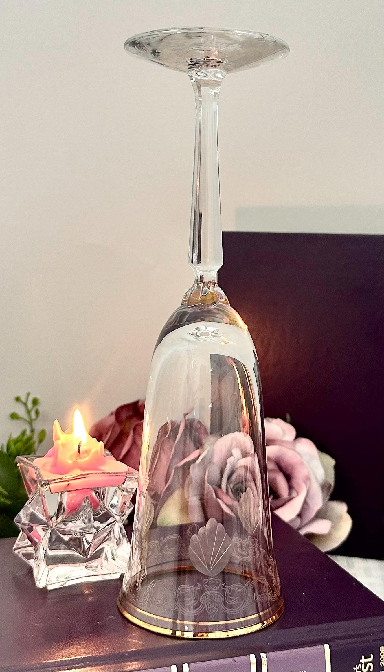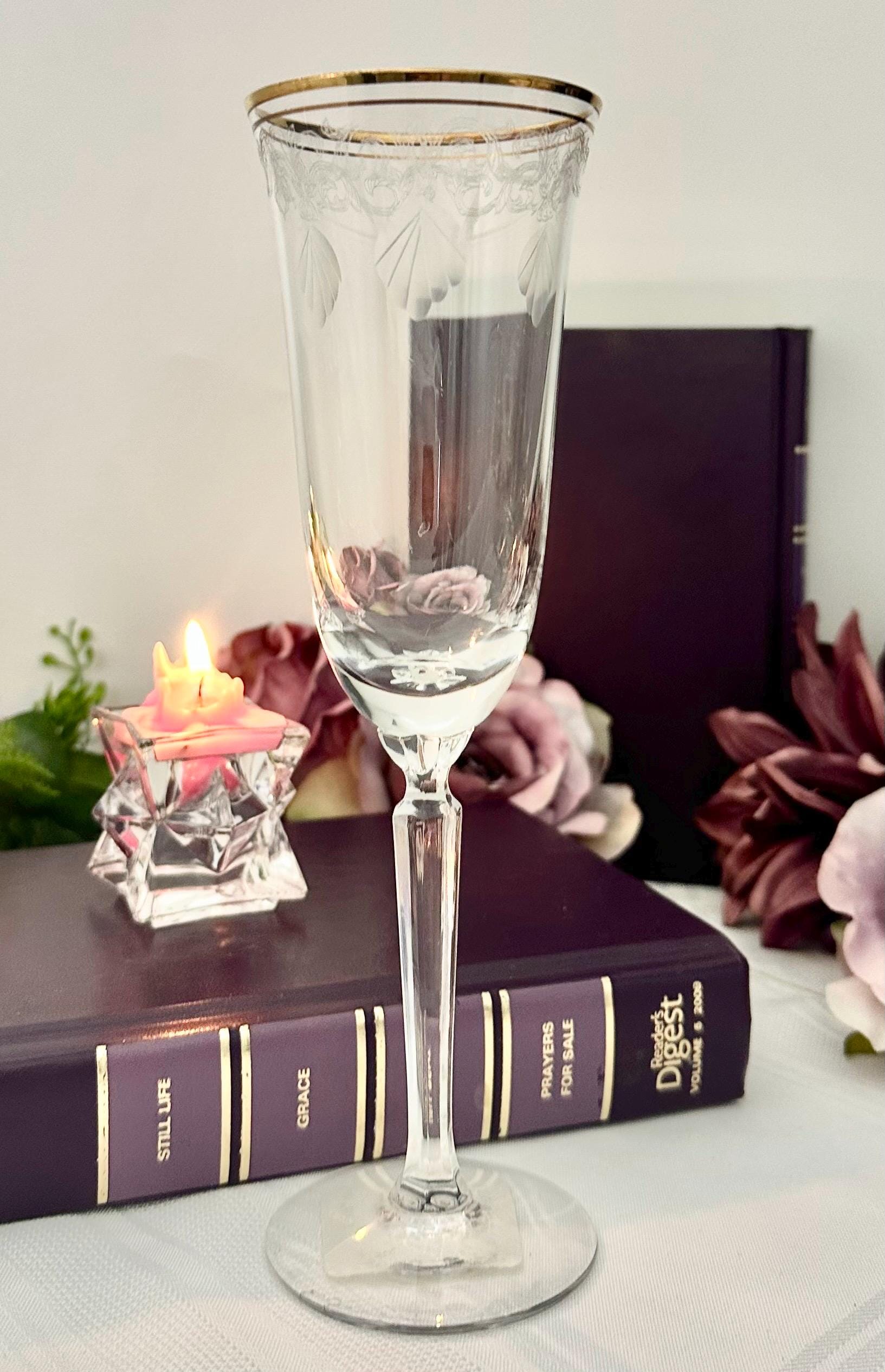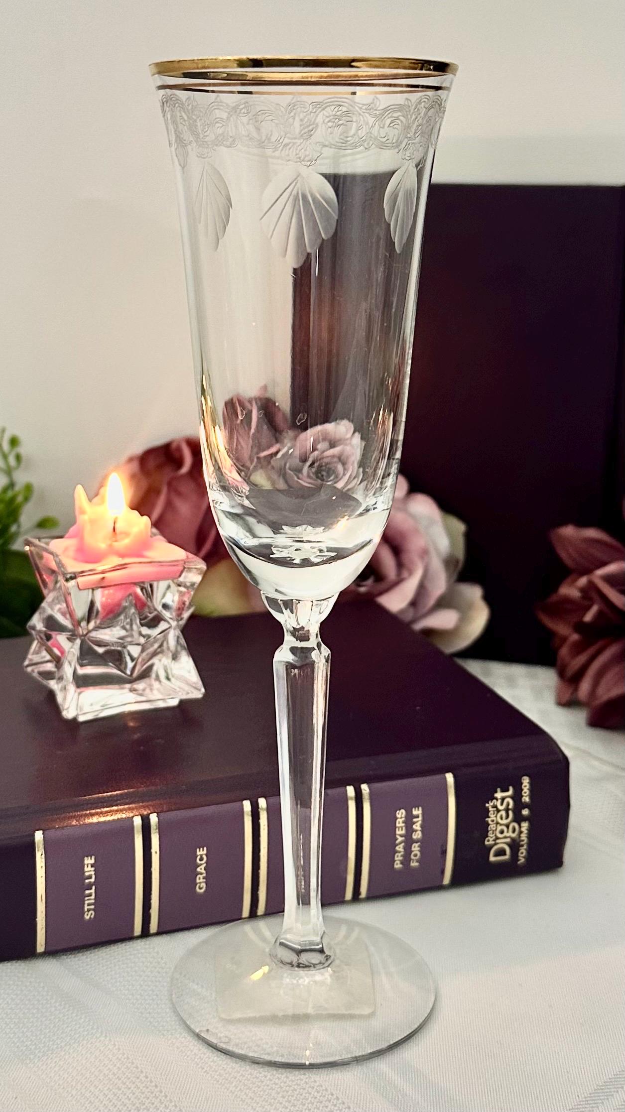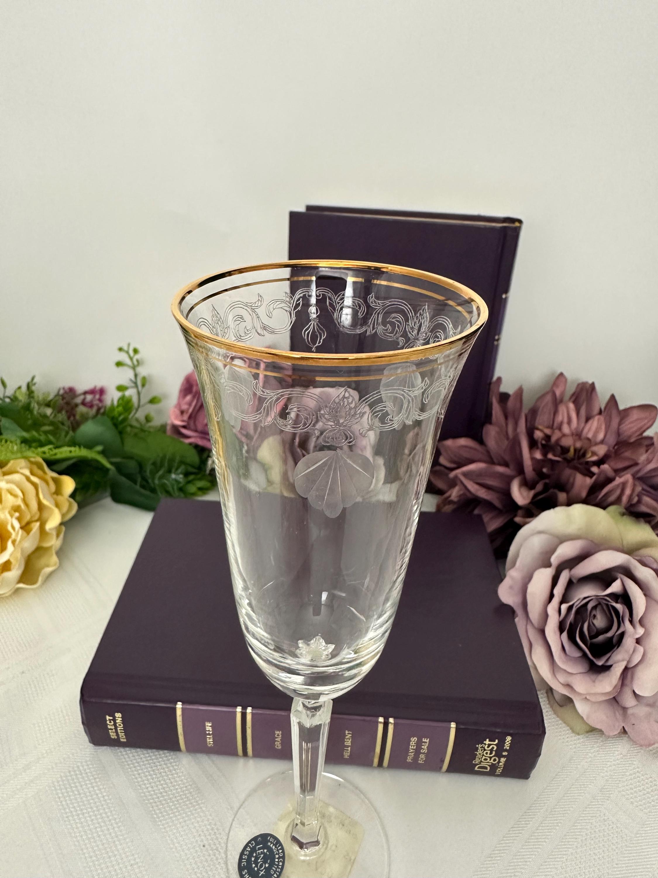 This is for 1 Vintage Lenox Classic Shell Gold Trimmed Champagne Glass, new old stock with the original sales tag on the bottom of the foot. This includes one elegant drinking / toasting glass with a round shape and an etched shell and swirl pattern etched on the top of the bowl under the gold accents. This vintage Champagne Flute measures 7 3/4 inches tall with a diameter of 3 5/8 inches.