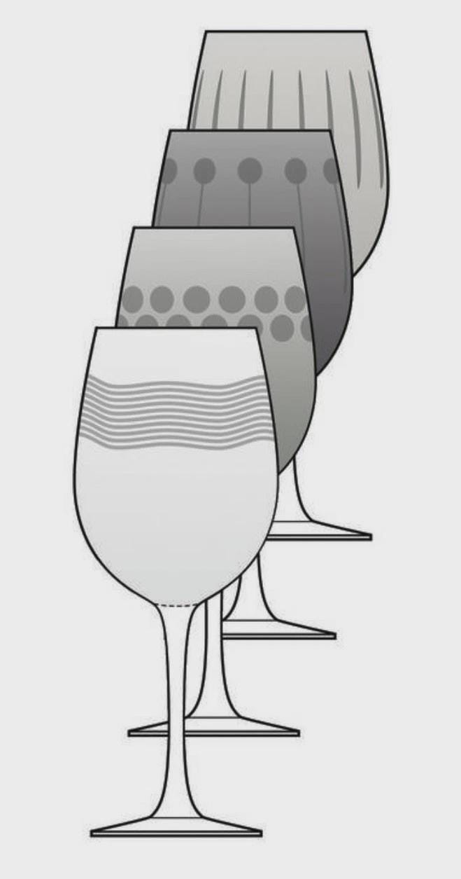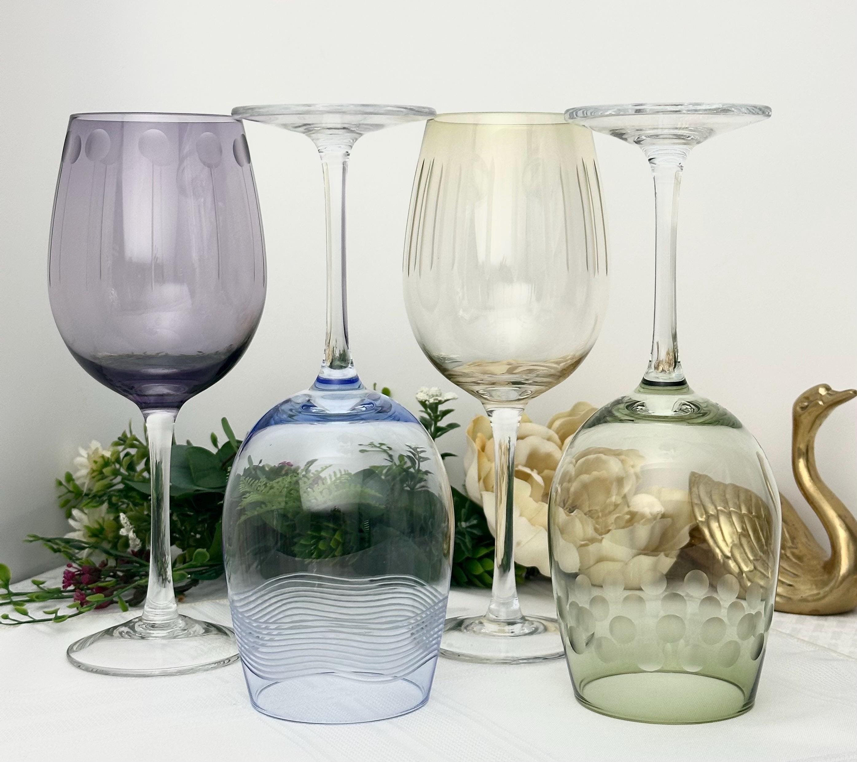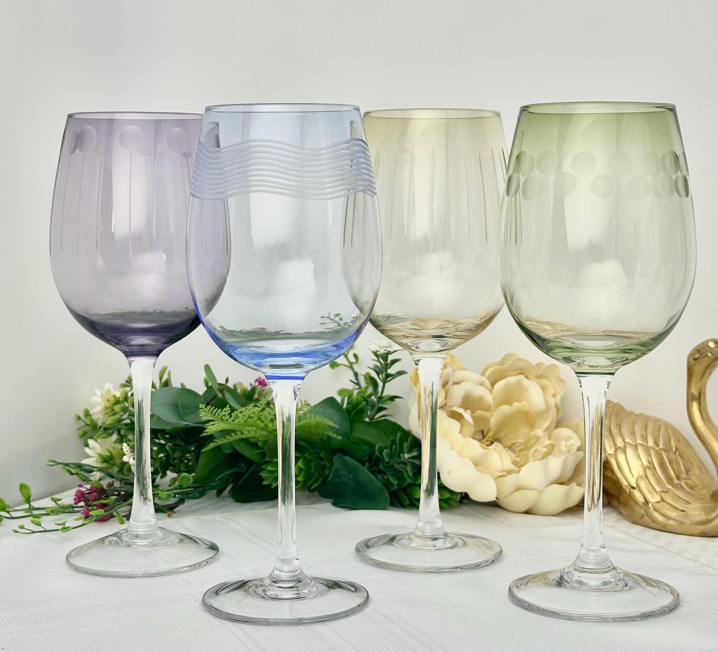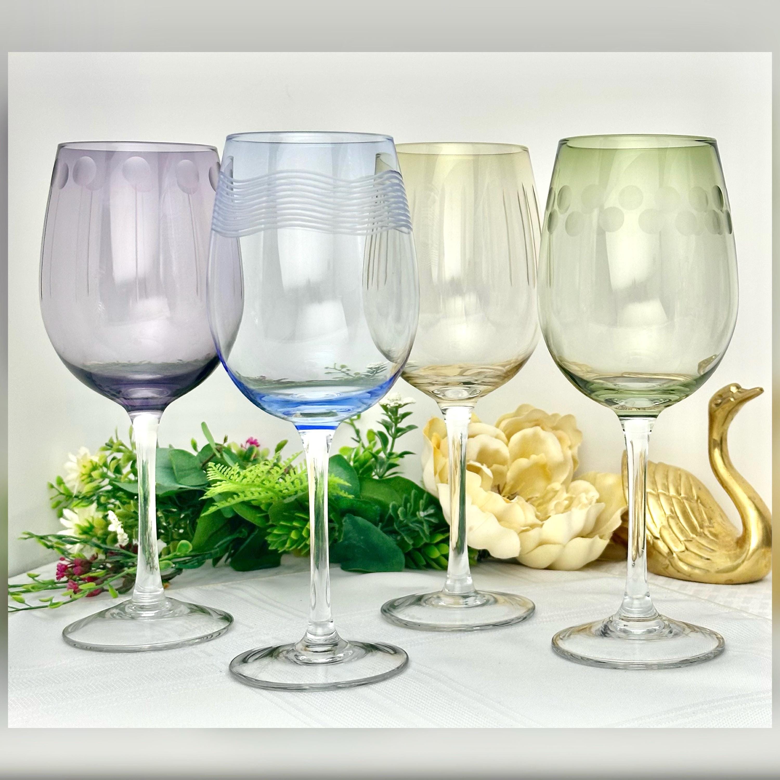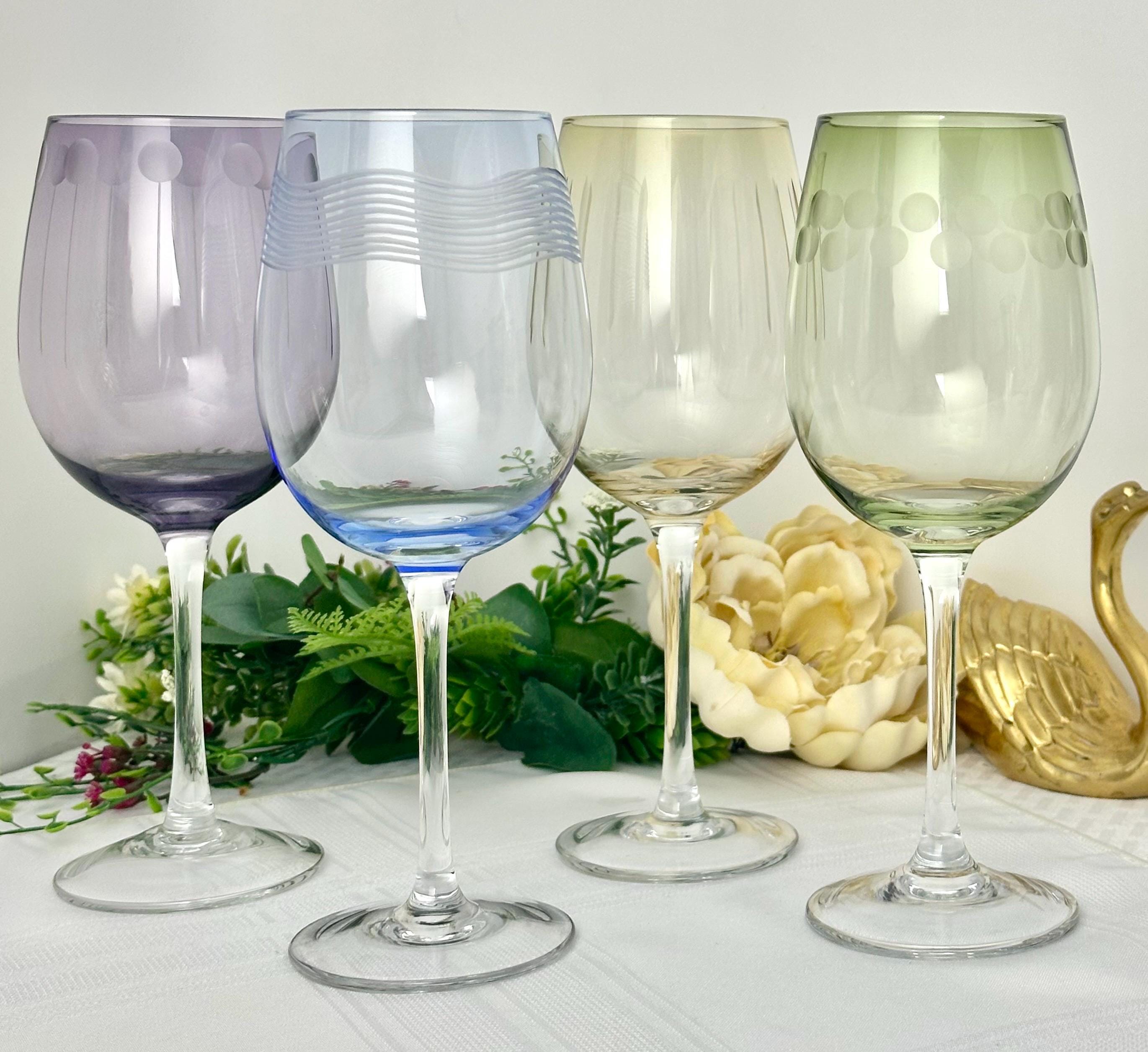 This is for a Mikasa Cheers White Wine Glass set of four 8.75" goblets. These have a contemporary design, featuring a dotted , swirl and vertical etched patterns while the bowl is in a pastel color and a clear stem. The bowl has a rim diameter of 2 3/4 inches and were produced from 2005 to 2015.