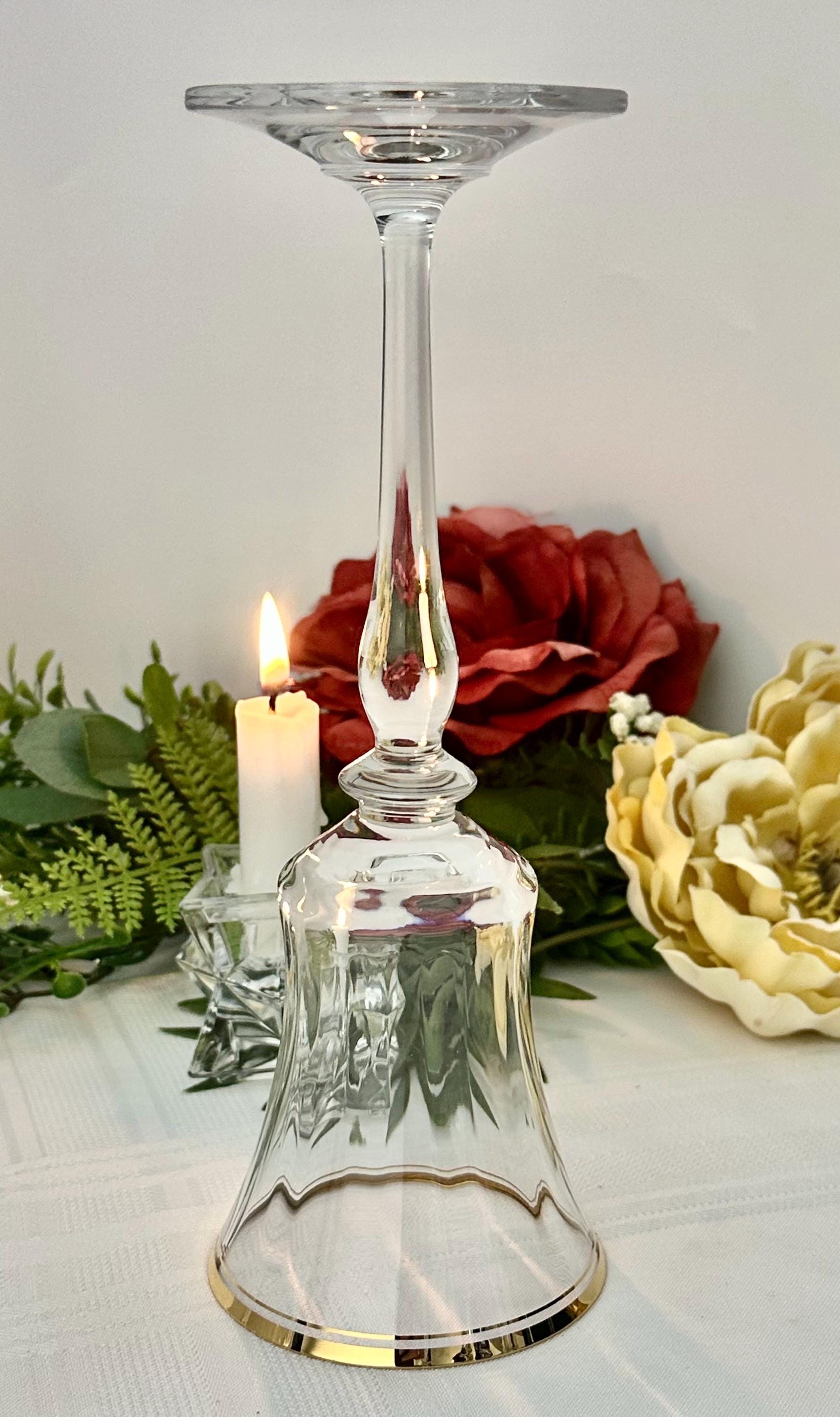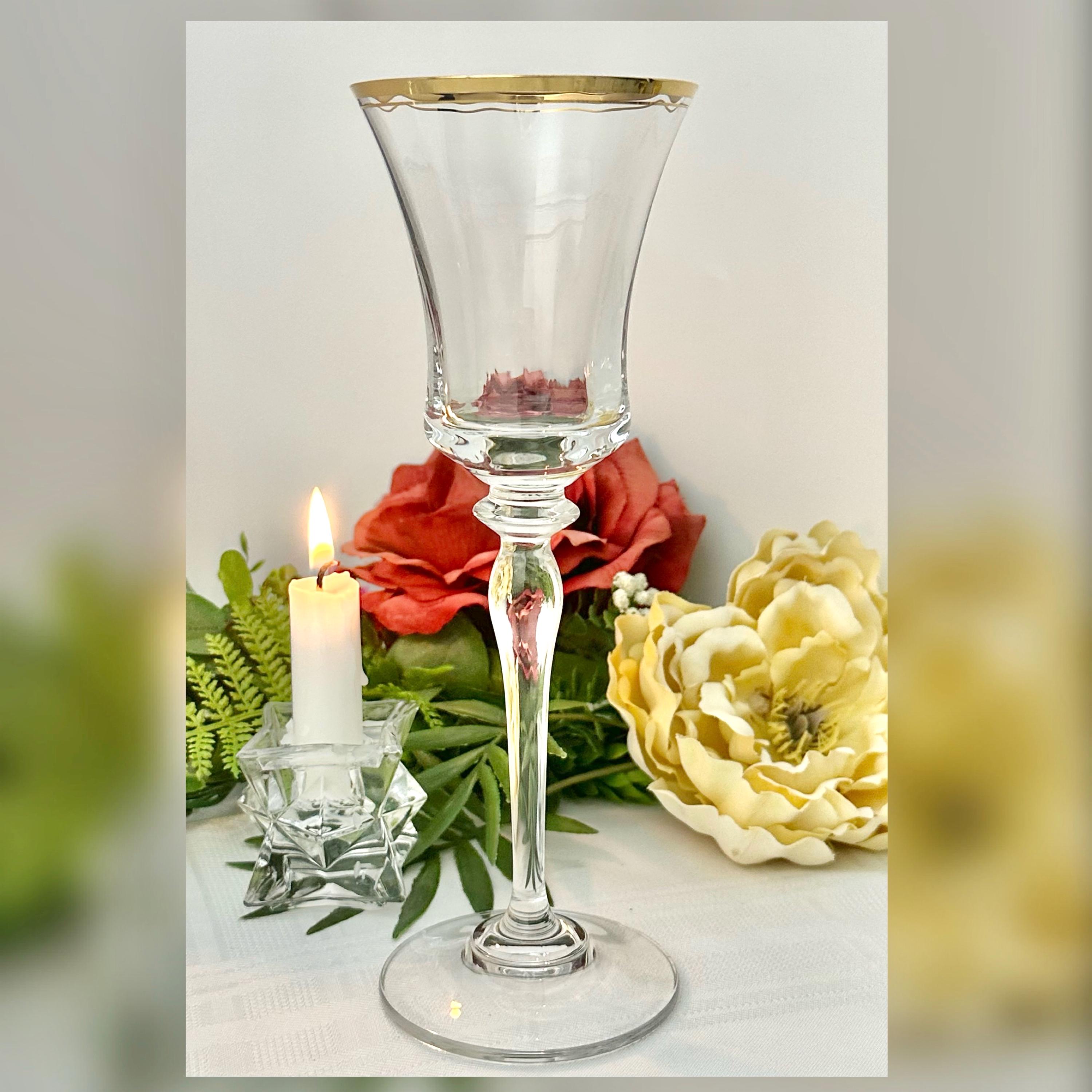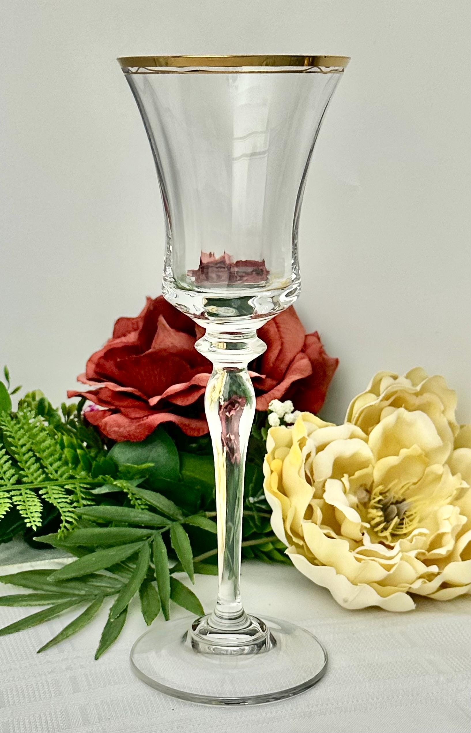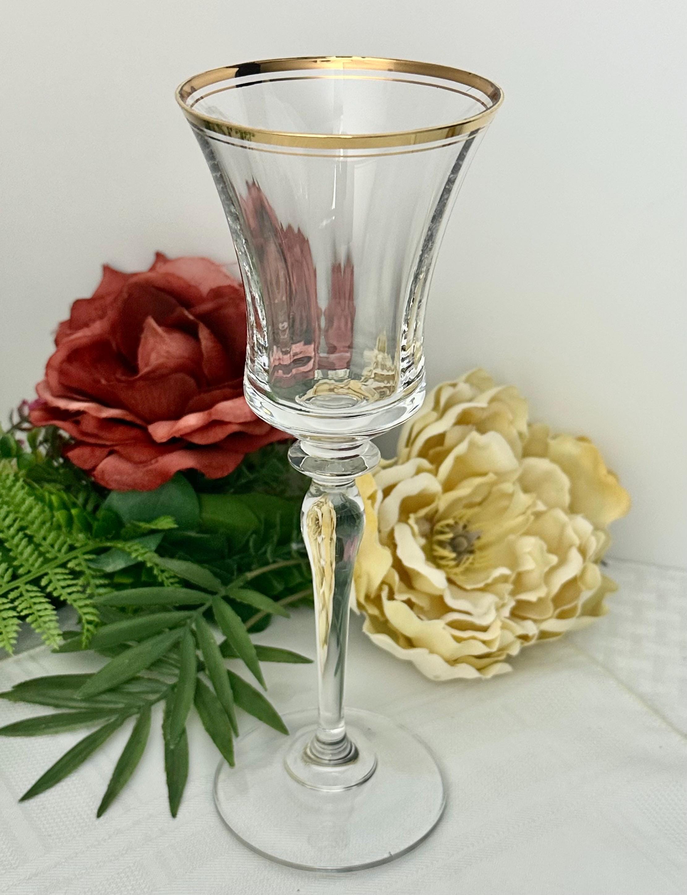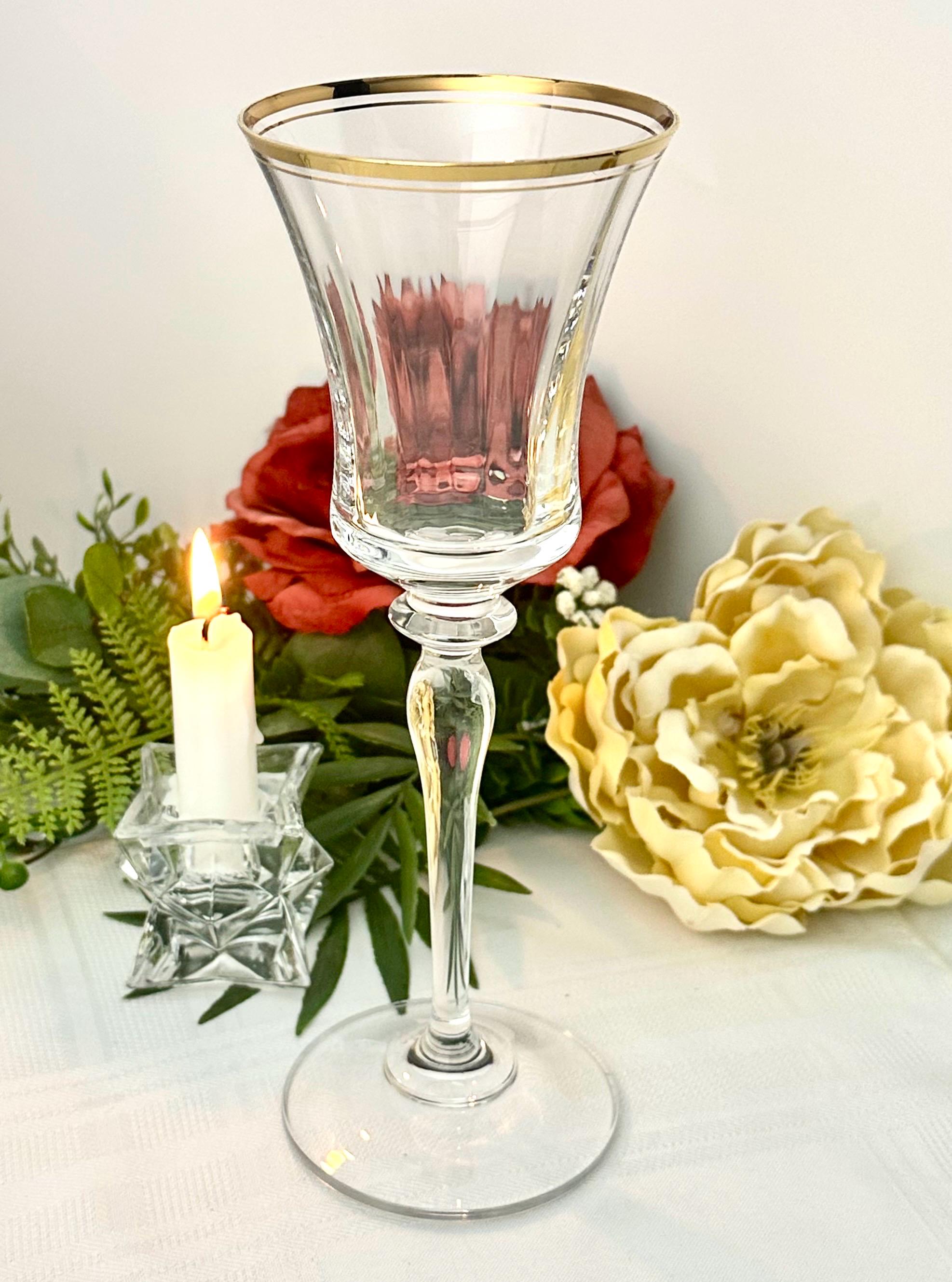 The water goblet measures: 8 3/4 inches tall x 3 1/8 inch in diameter. Altho this is called a water goblet this makes for a nice wine glass also. This is in wonderful condition including the gold trim and makes for a perfect replacement glass or to start a new set as there are no chips, cracks or water staining.
