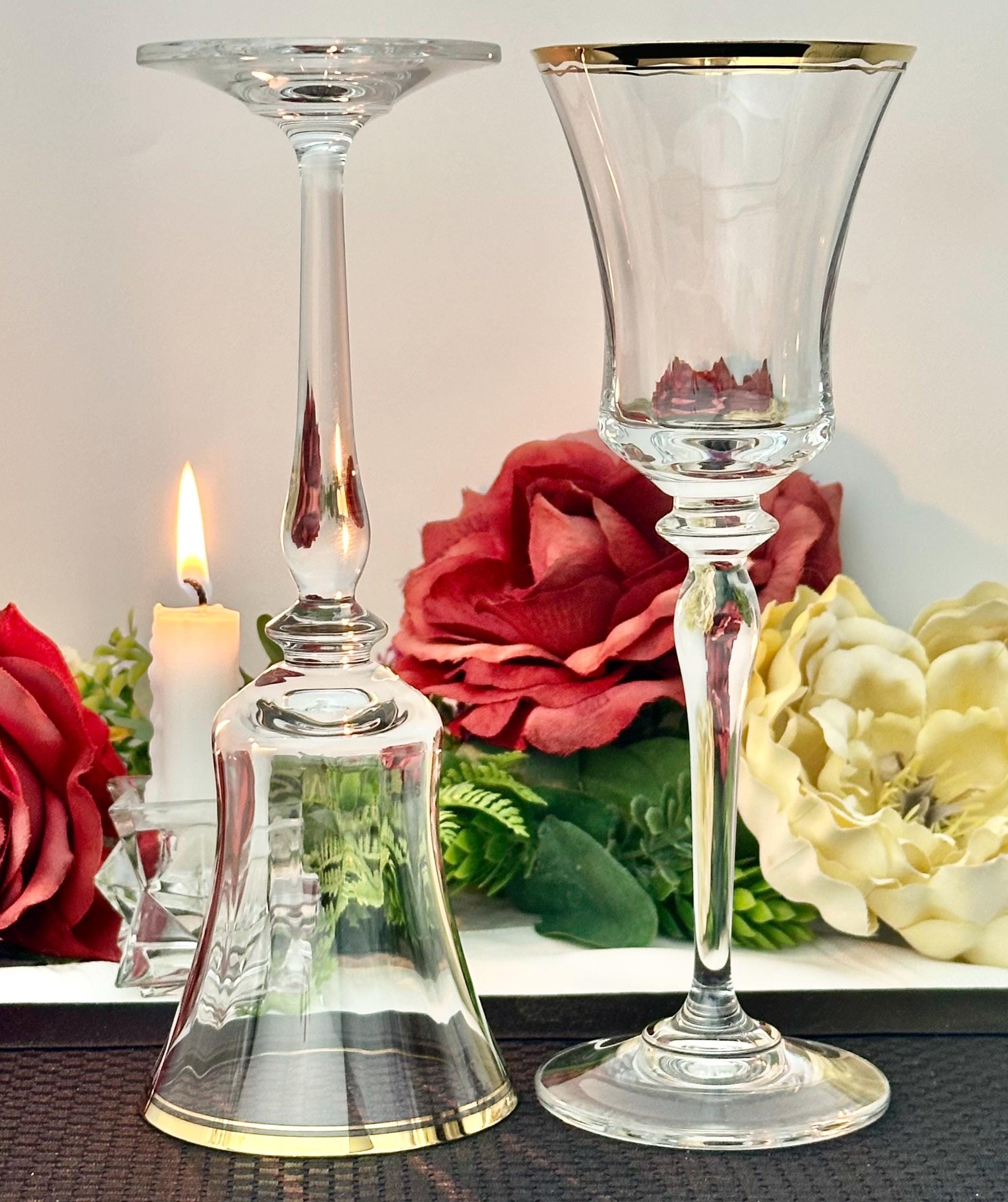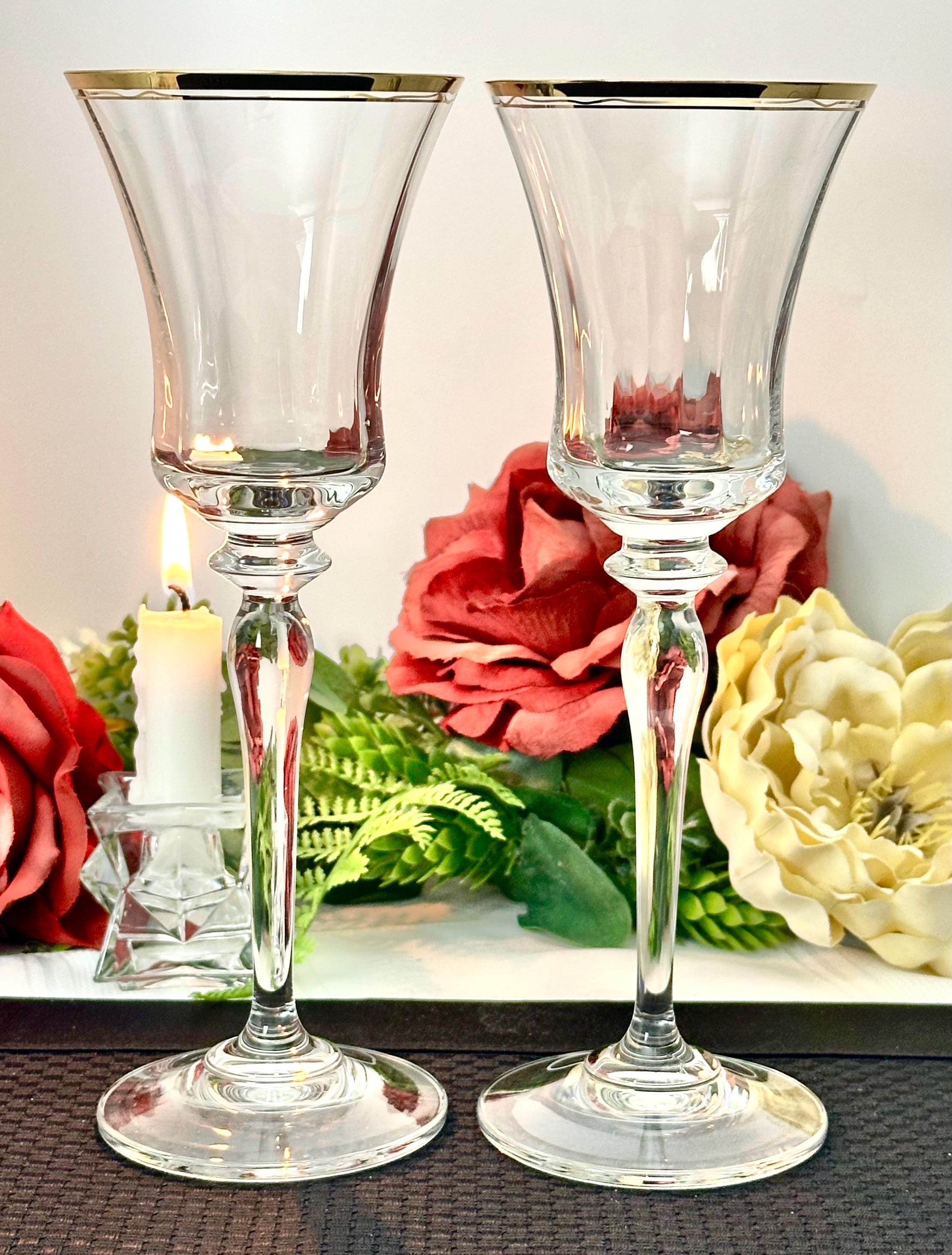 These wine glasses measure: 8 3/4 inches tall x 3 1/8 inch in diameter. These are in wonderful condition including the gold trim and they make for a perfect replacement pair of glasses or to start a new set as there are no chips, cracks or water staining.