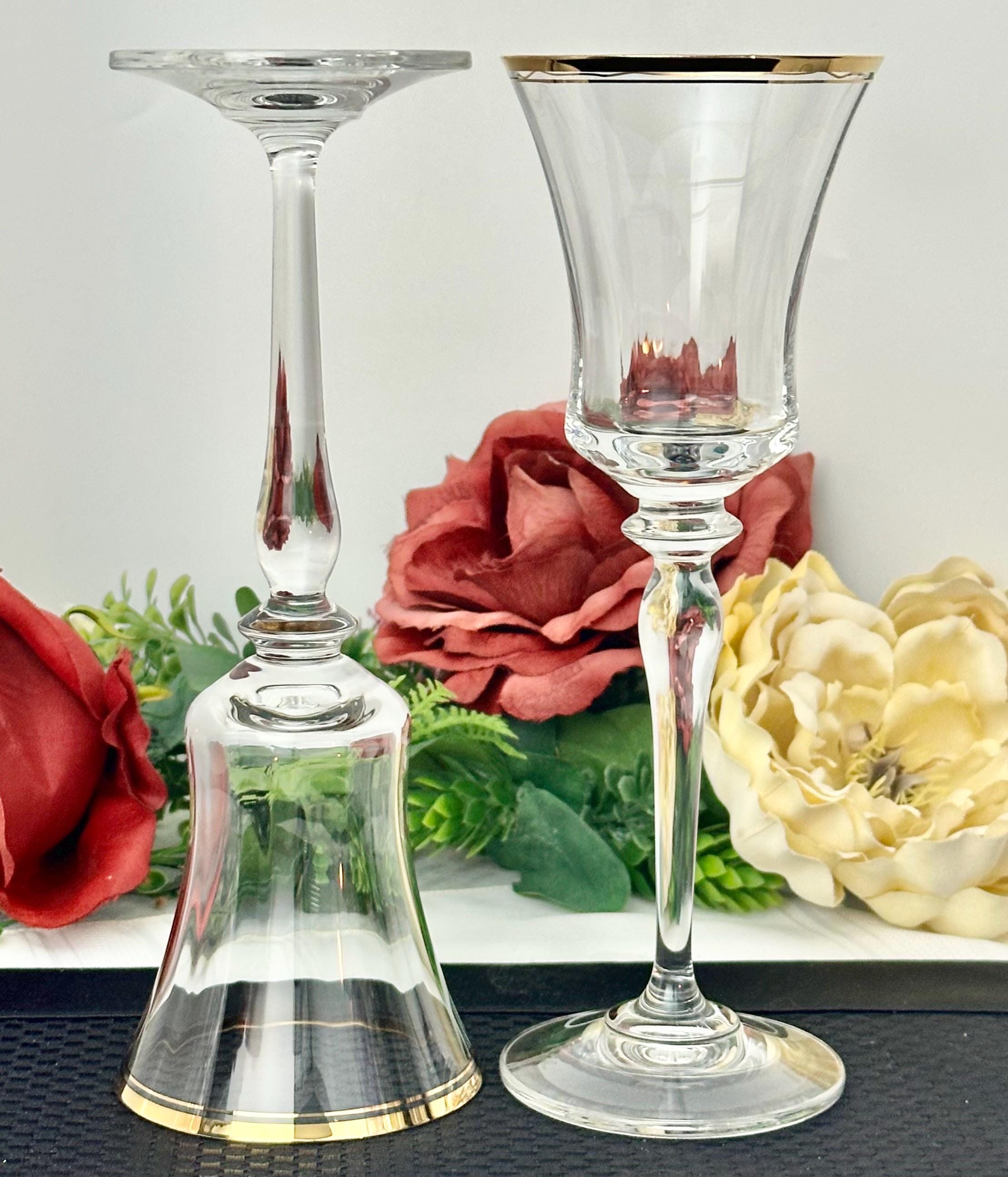 This is for a Pair of Mikasa Wine Glasses in the Jamestown pattern which are a clear glass with a gold rim. These have a clear wafer in the stem just under the bowl. These were produced starting in 1987 to 2010 and are now discontinued.