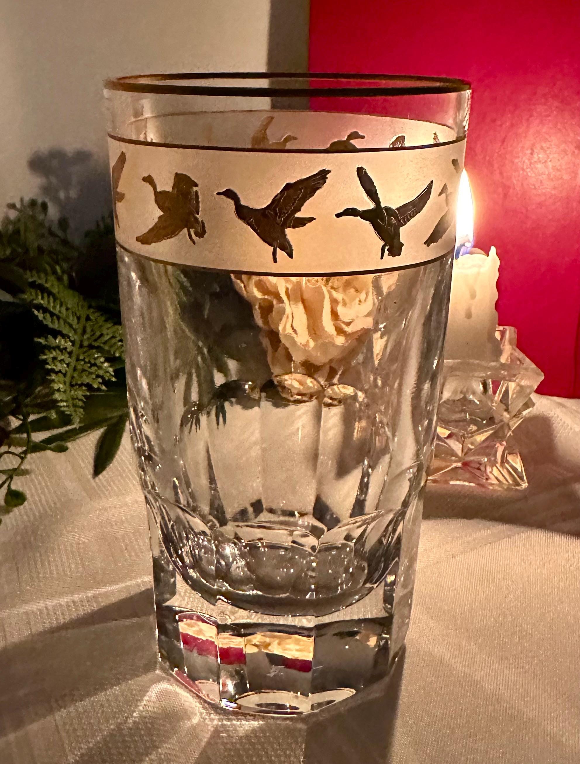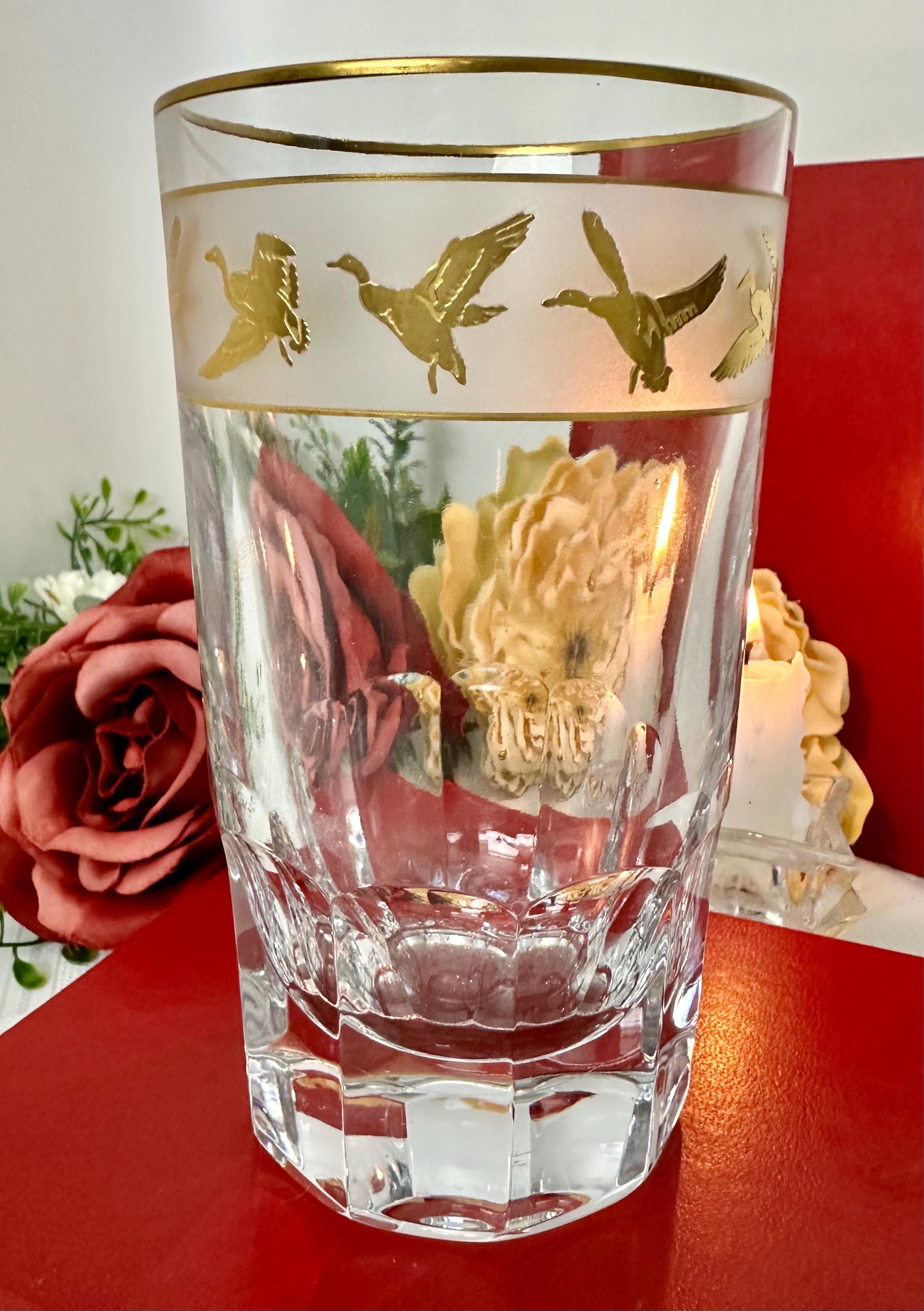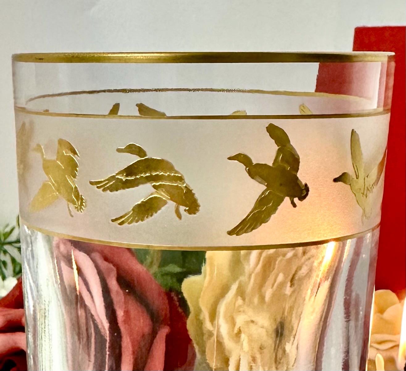 This is for 1 vintage mid century modern Val St Lambert Gold Mallard Highball Glass. The vintage barware glass features a design of gold flying mallard ducks. The glass has a frosted band with 22k gold accents.