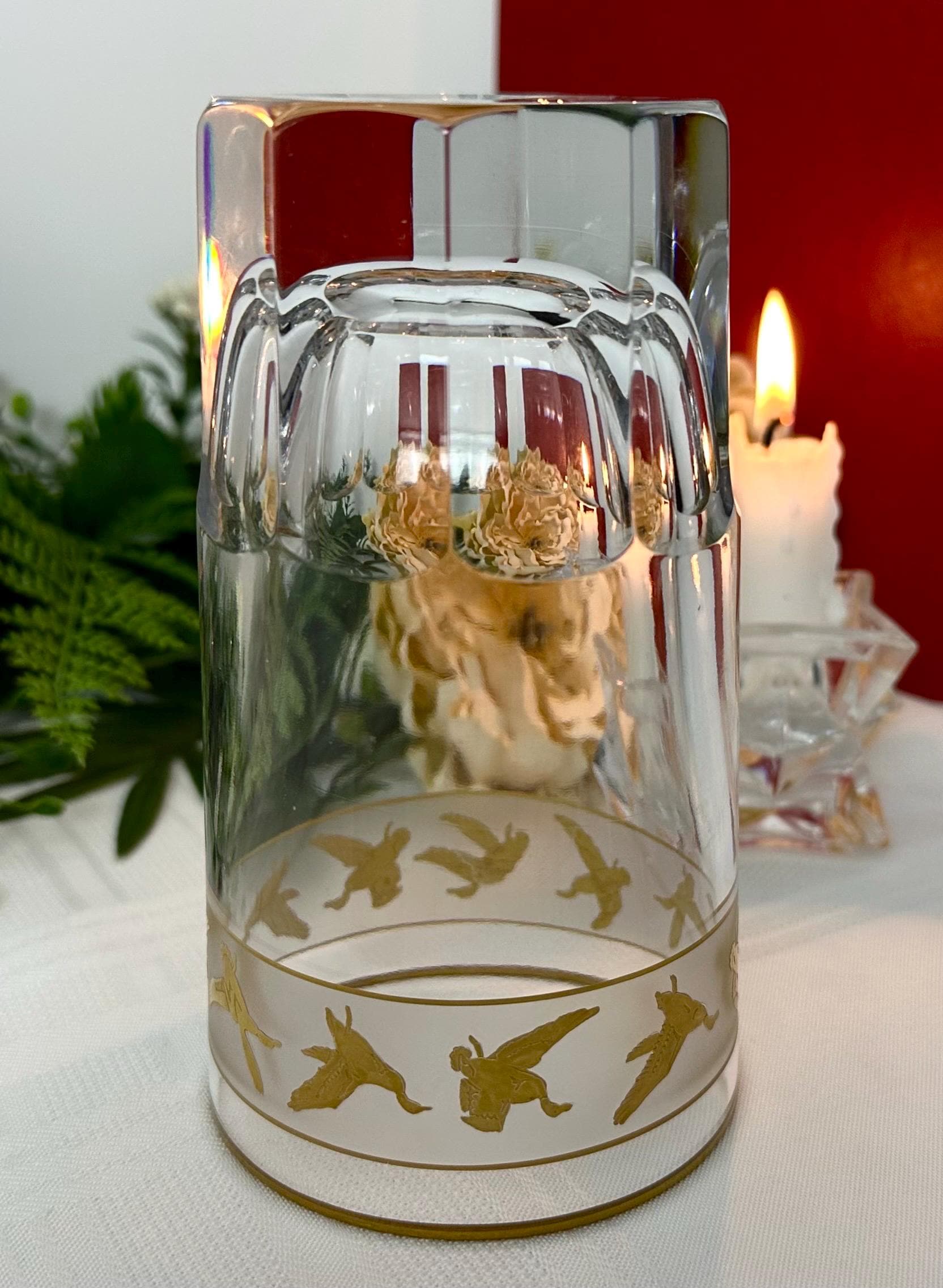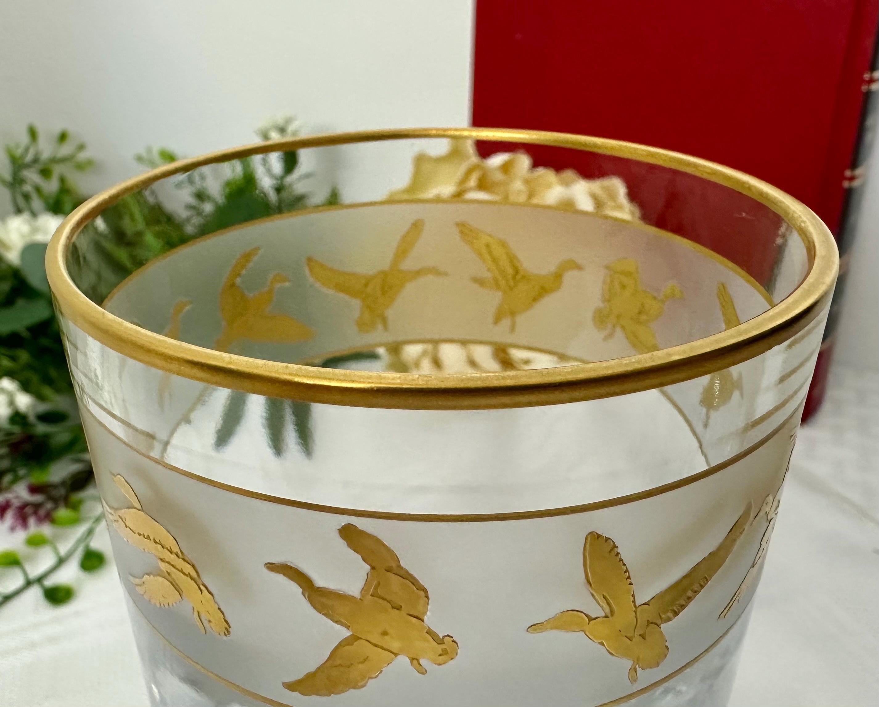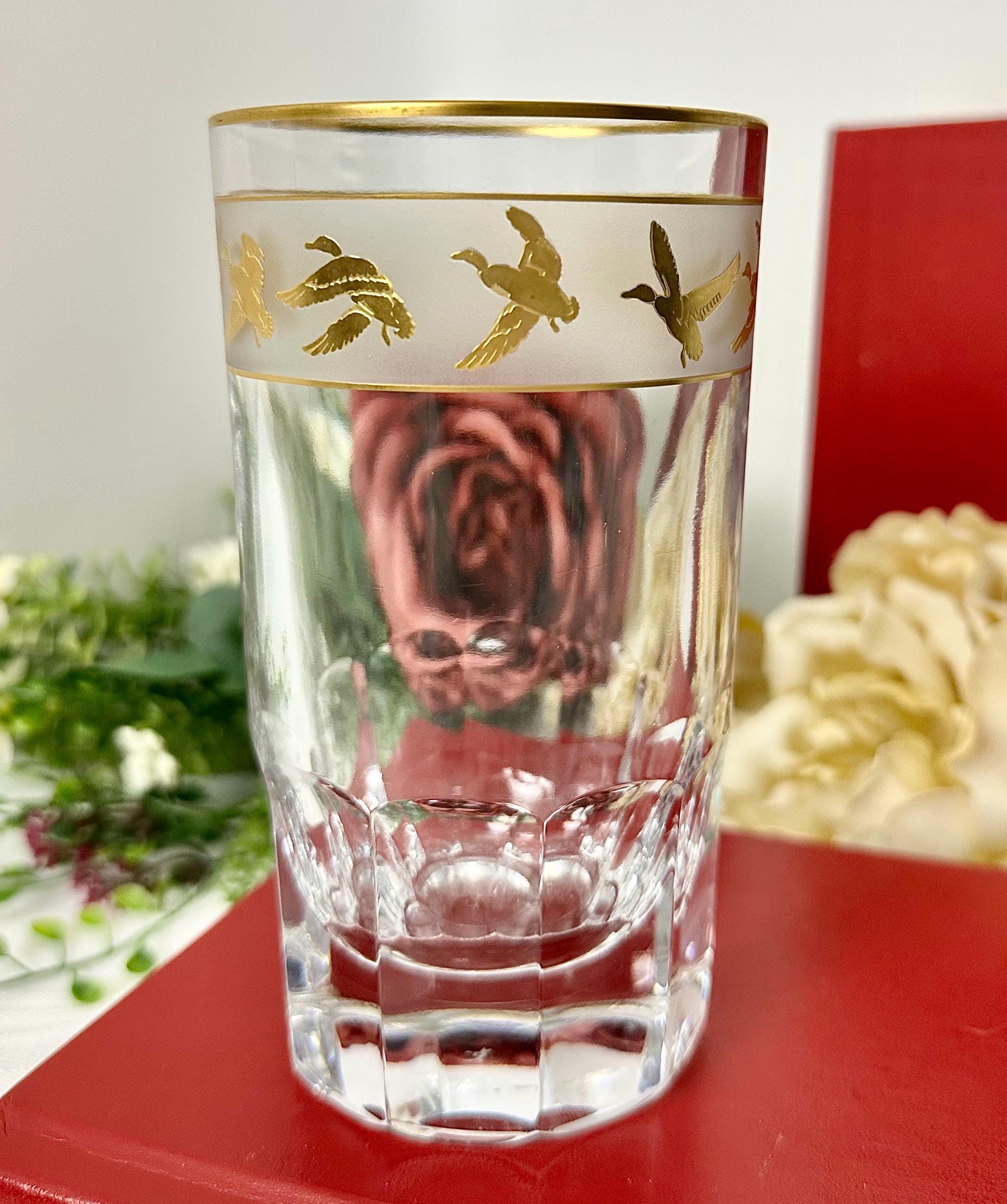 This is for 1 vintage mid century modern Val St Lambert Gold Mallard Highball Glass. The vintage barware glass features a design of gold flying mallard ducks. The glass has a frosted band with 22k gold accents.