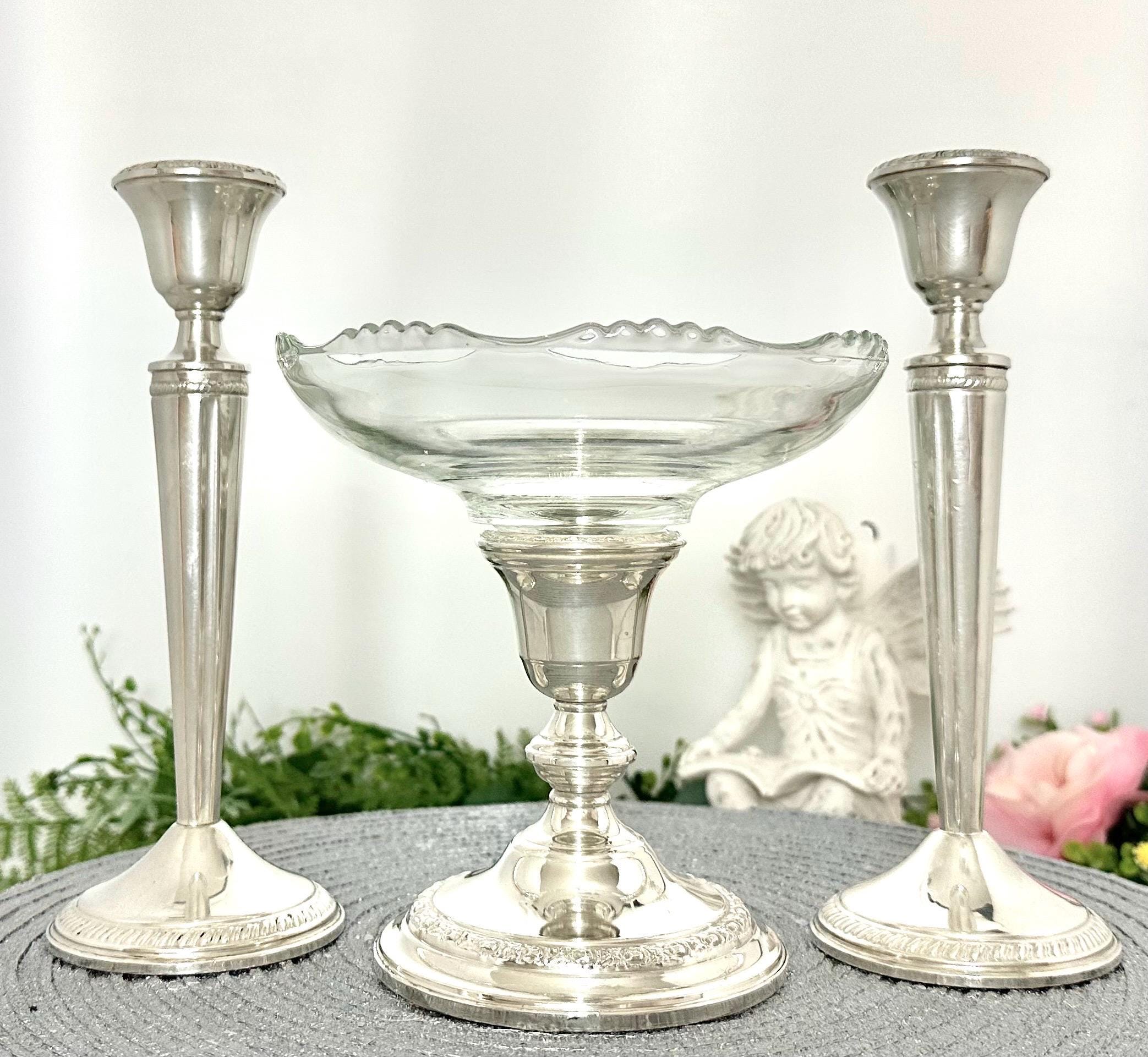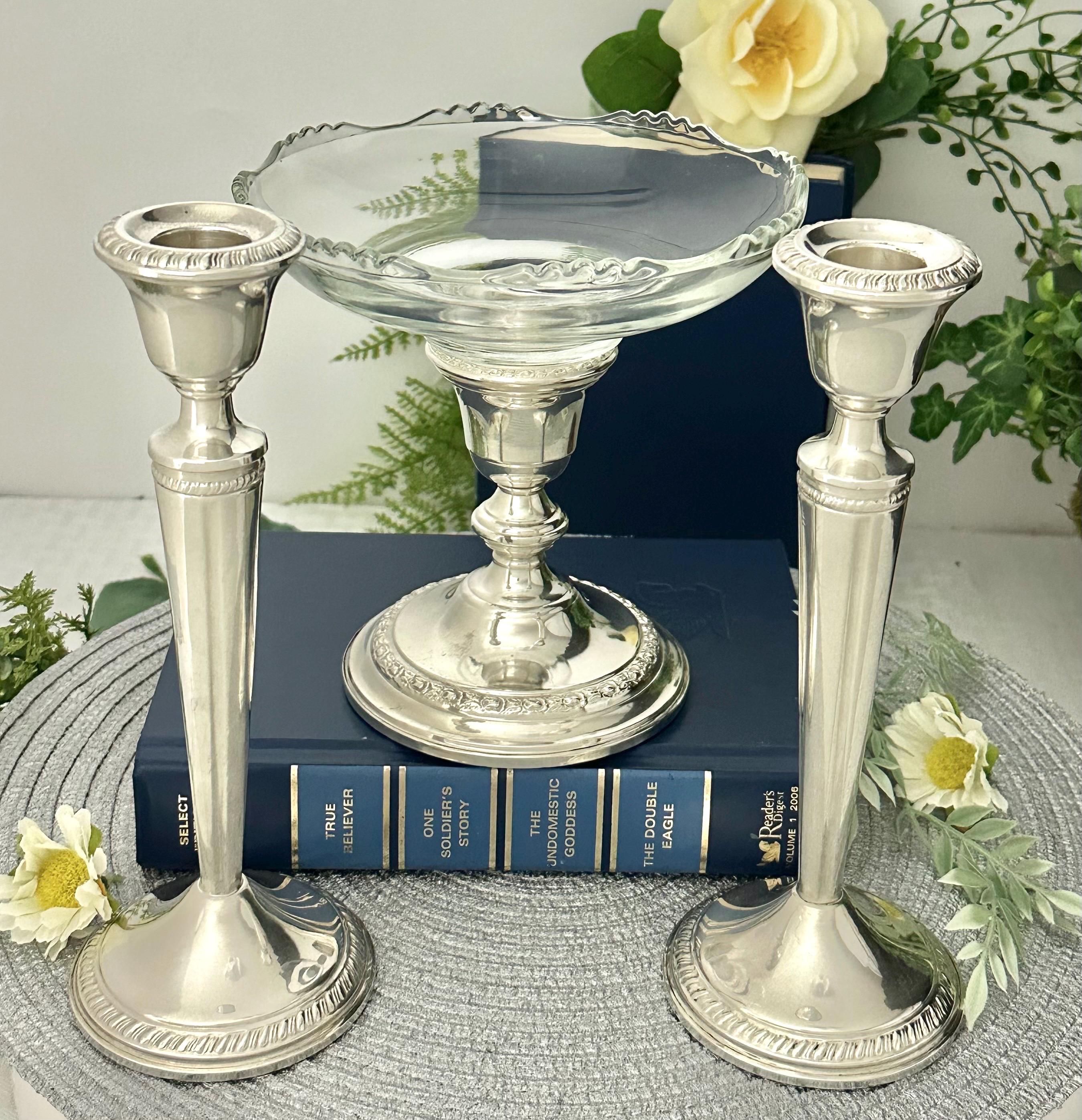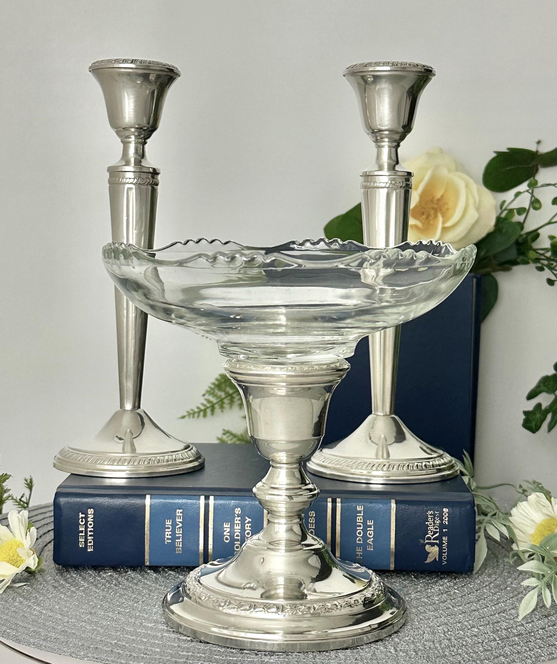 This is for 3 Vintage Sterling Silver candle holders by Crown Silver and Whiting Silver. All are crafted with a Victorian vintage styling. All 3 pieces are Crafted with .925 sterling silver. These console silver candlesticks are perfect for adding a touch of elegance to any space or dining table while the glass bowl can hold candles, candy to flowers. The glass bowl is removable so the third candle holder can also hold a taper dinner candle.