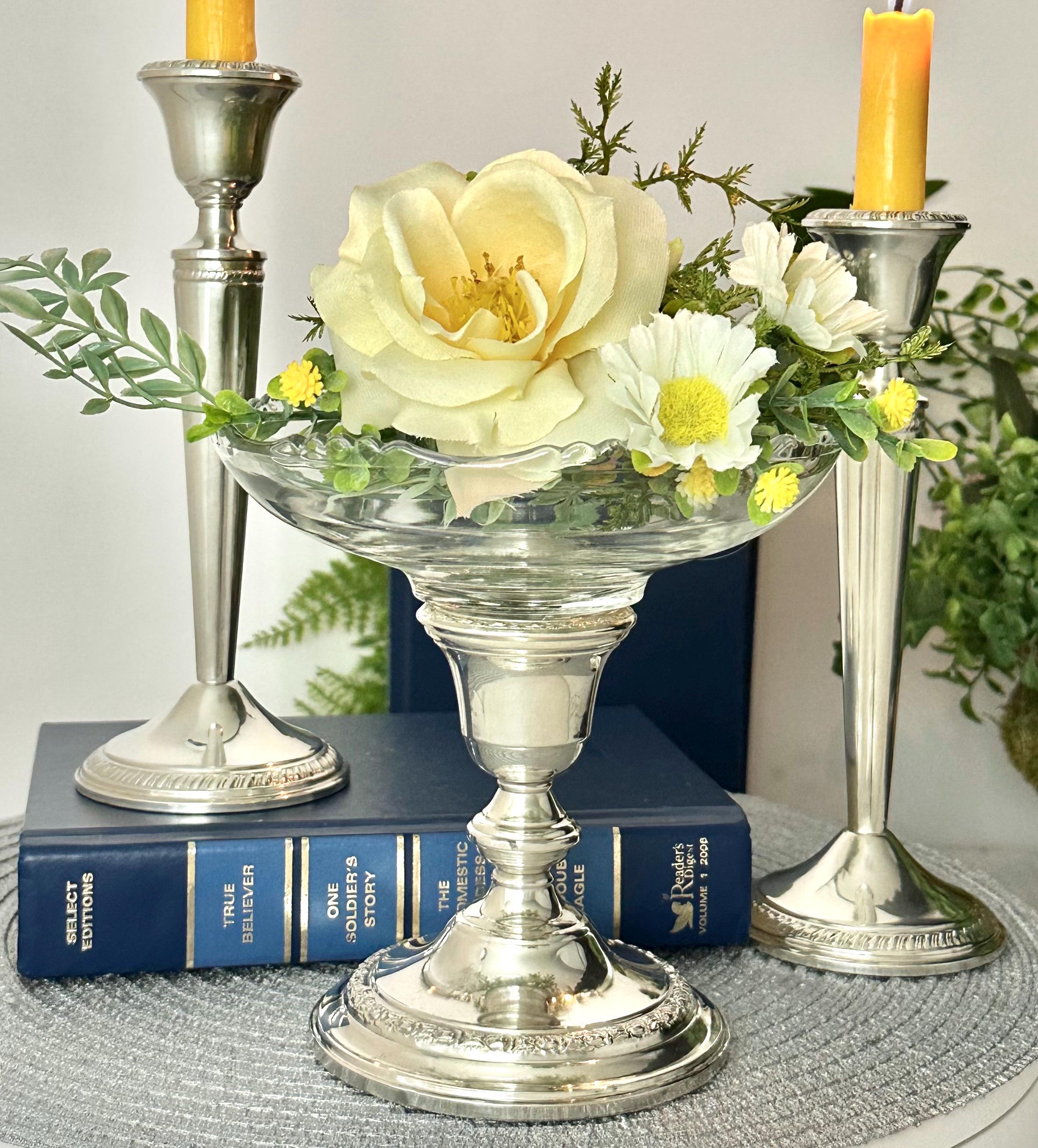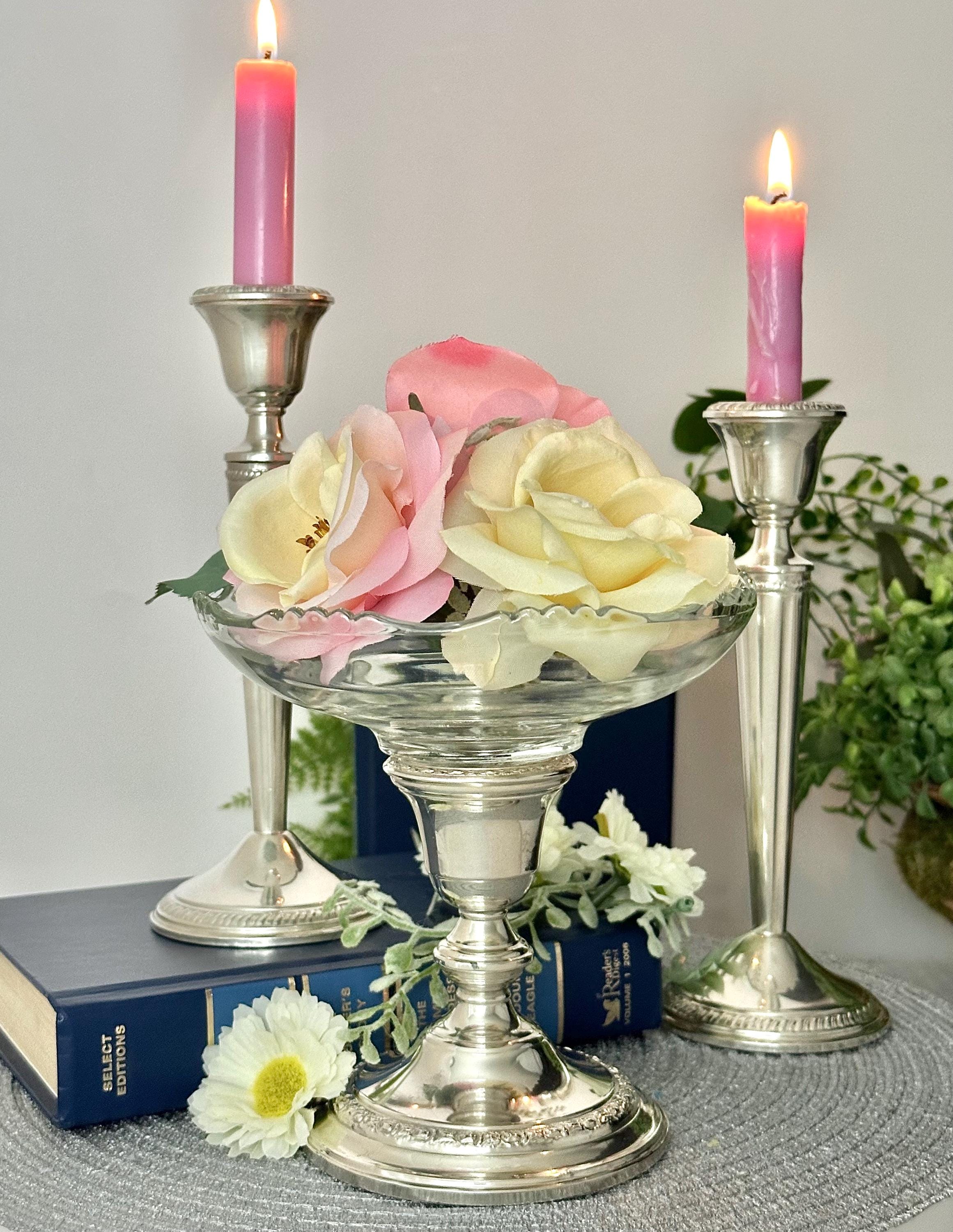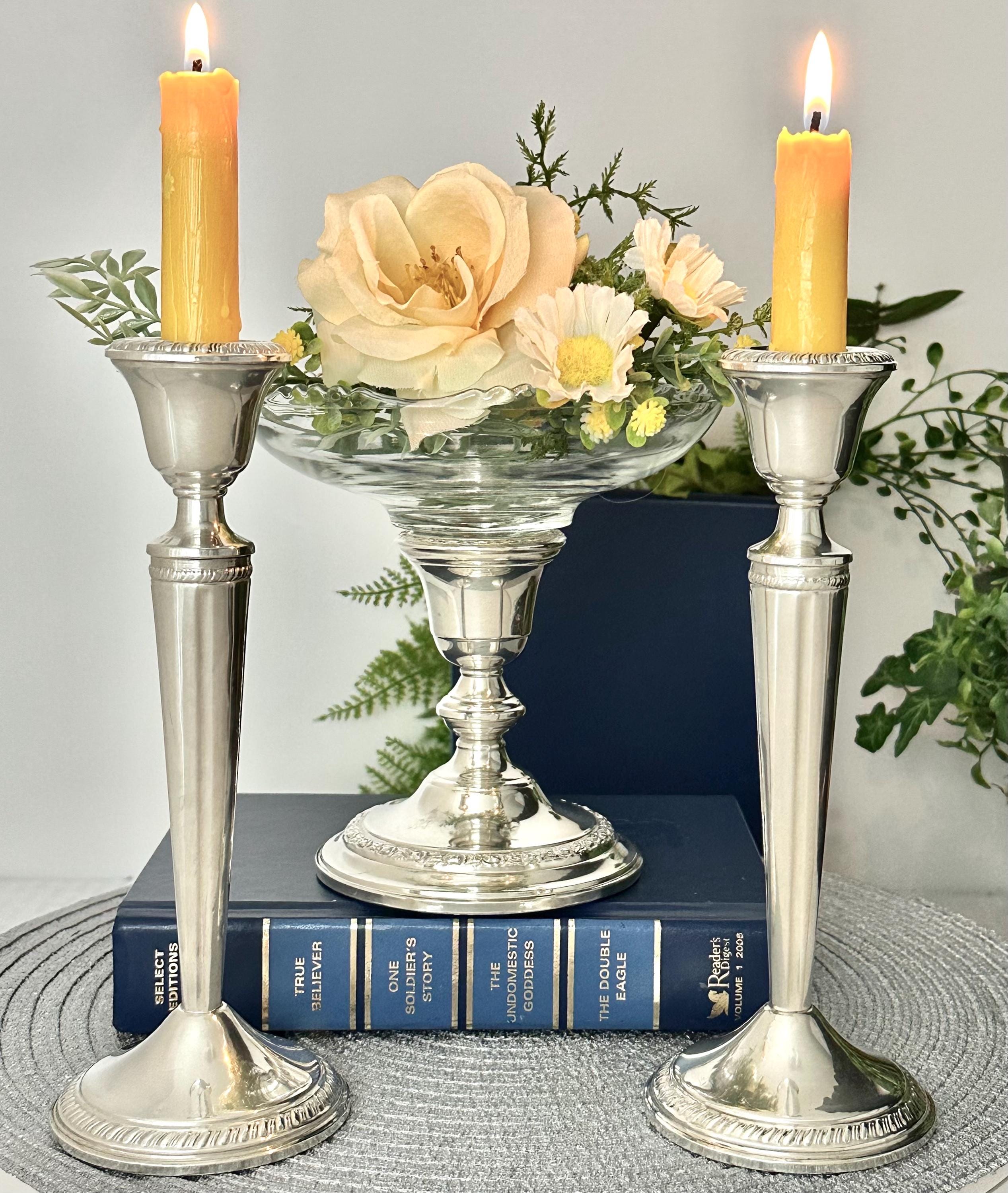 This is for 3 Vintage Sterling Silver candle holders by Crown Silver and Whiting Silver. All are crafted with a Victorian vintage styling. All 3 pieces are Crafted with .925 sterling silver. These console silver candlesticks are perfect for adding a touch of elegance to any space or dining table while the glass bowl can hold candles, candy to flowers. The glass bowl is removable so the third candle holder can also hold a taper dinner candle.