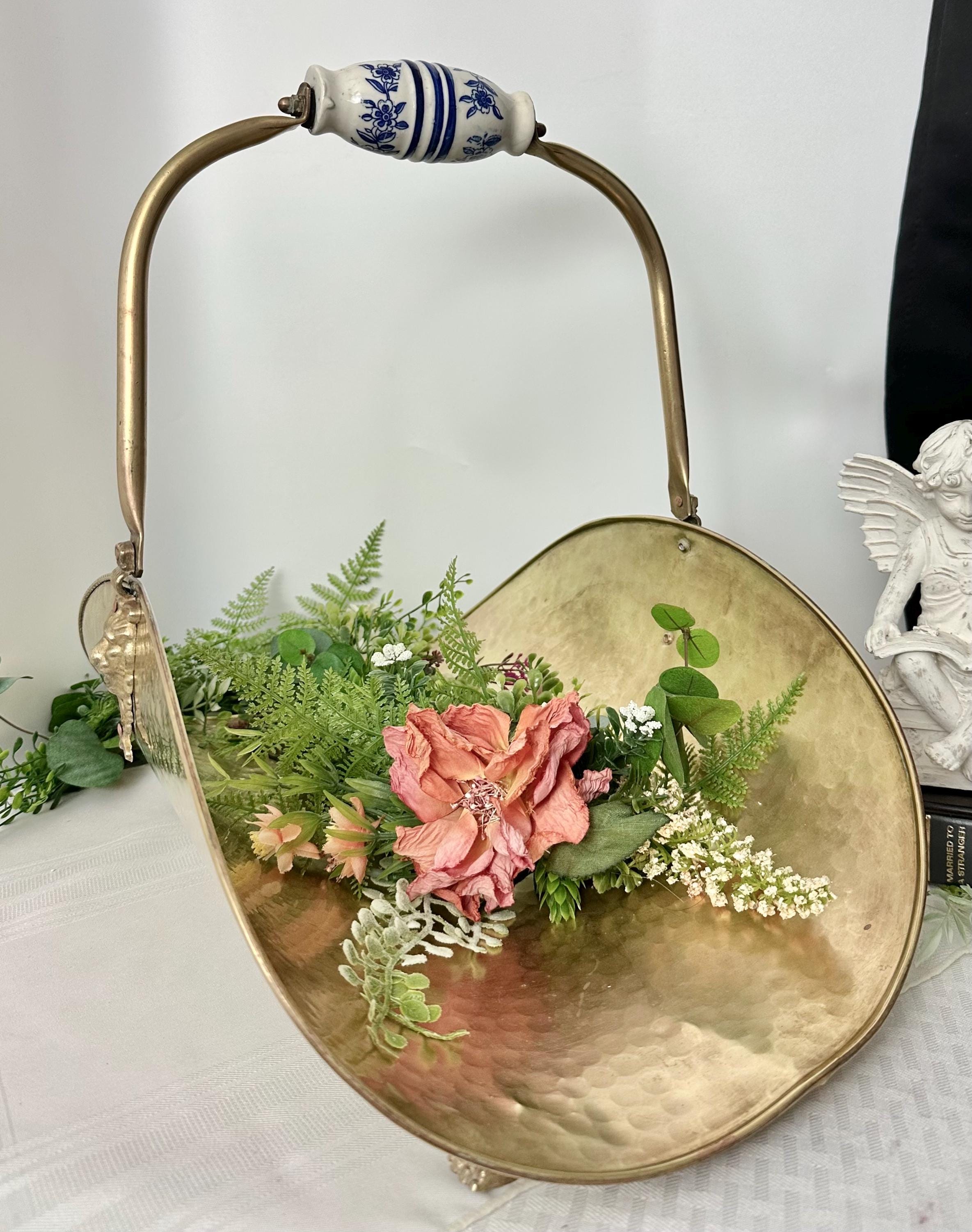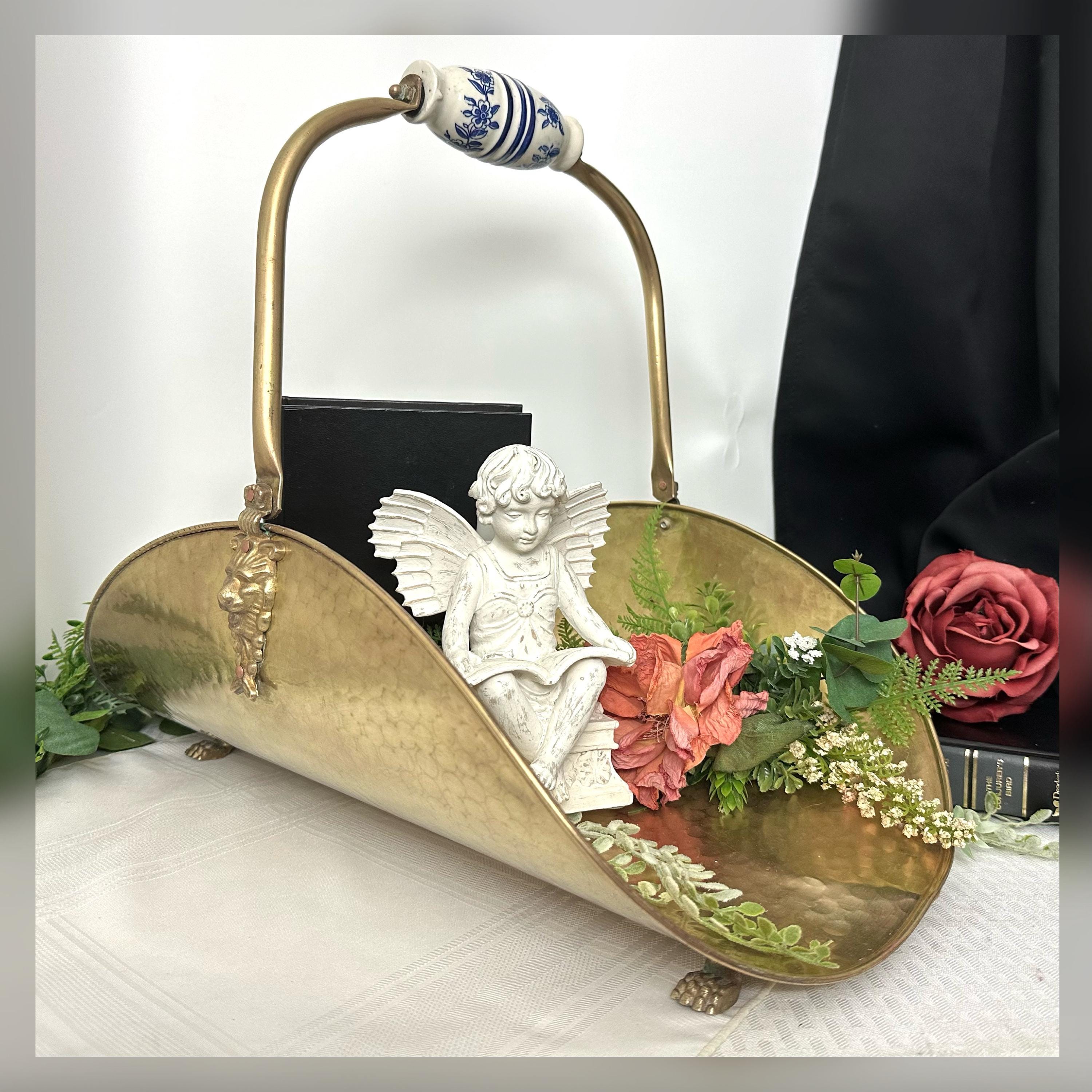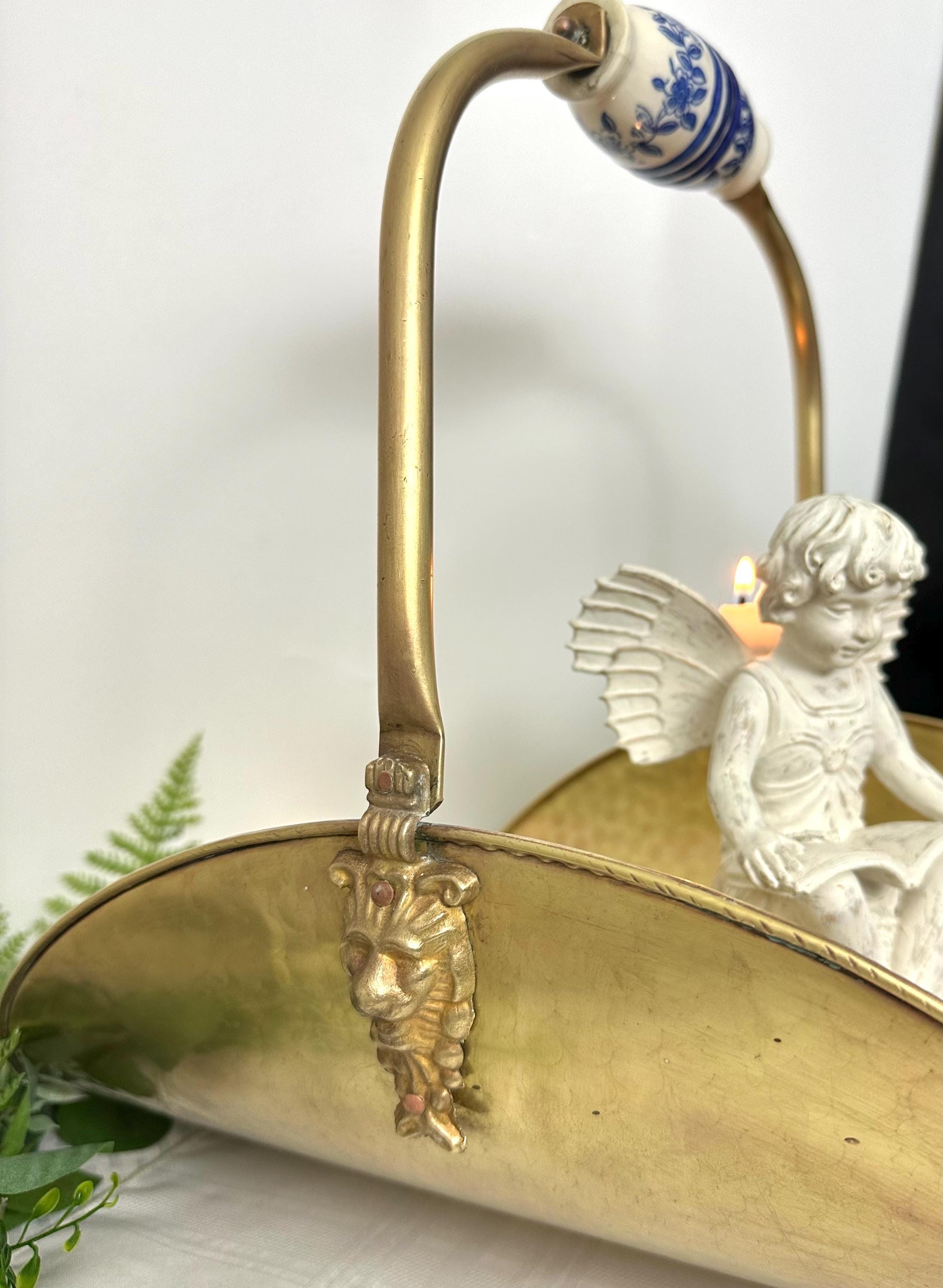 This is for a large vintage brass fireplace log holder that features lion paw feet and a Delft Blue handle, adding a touch of rustic elegance to any home / Cabin decor.