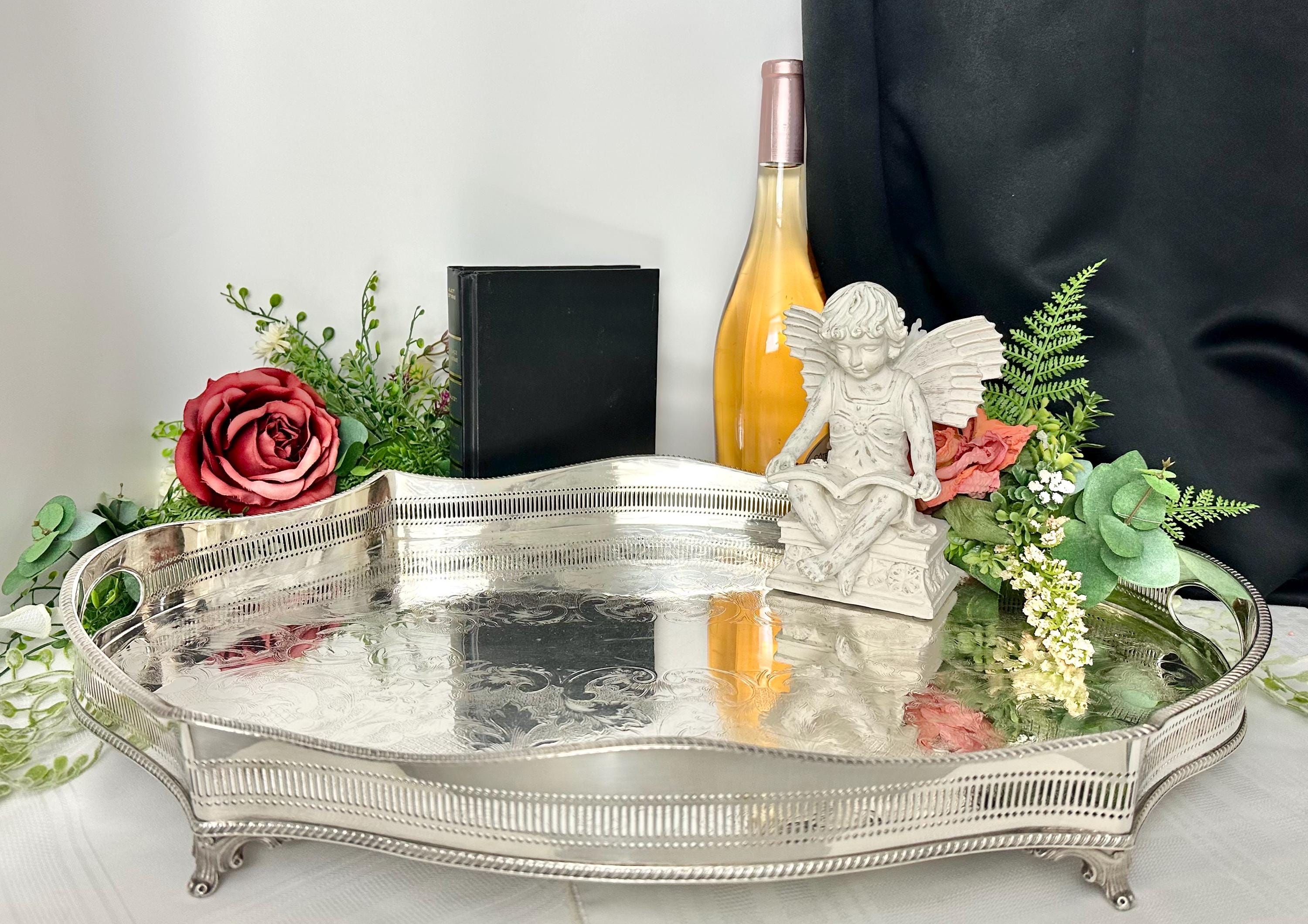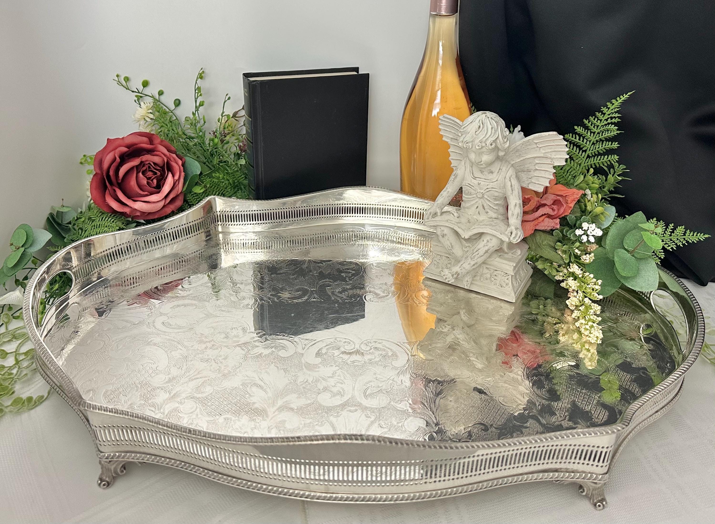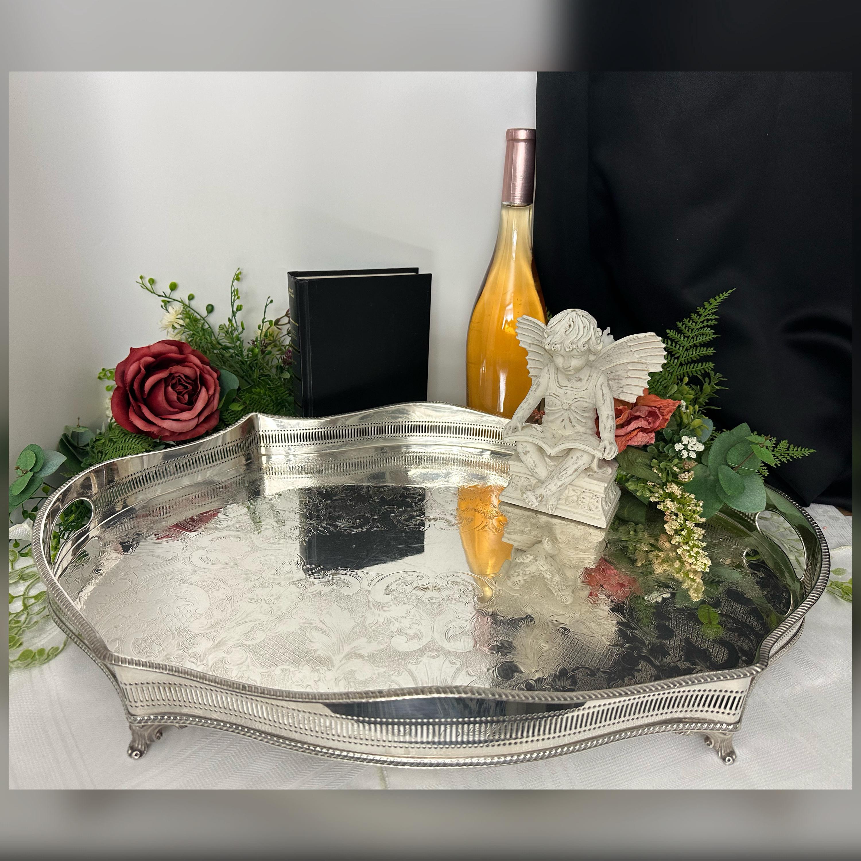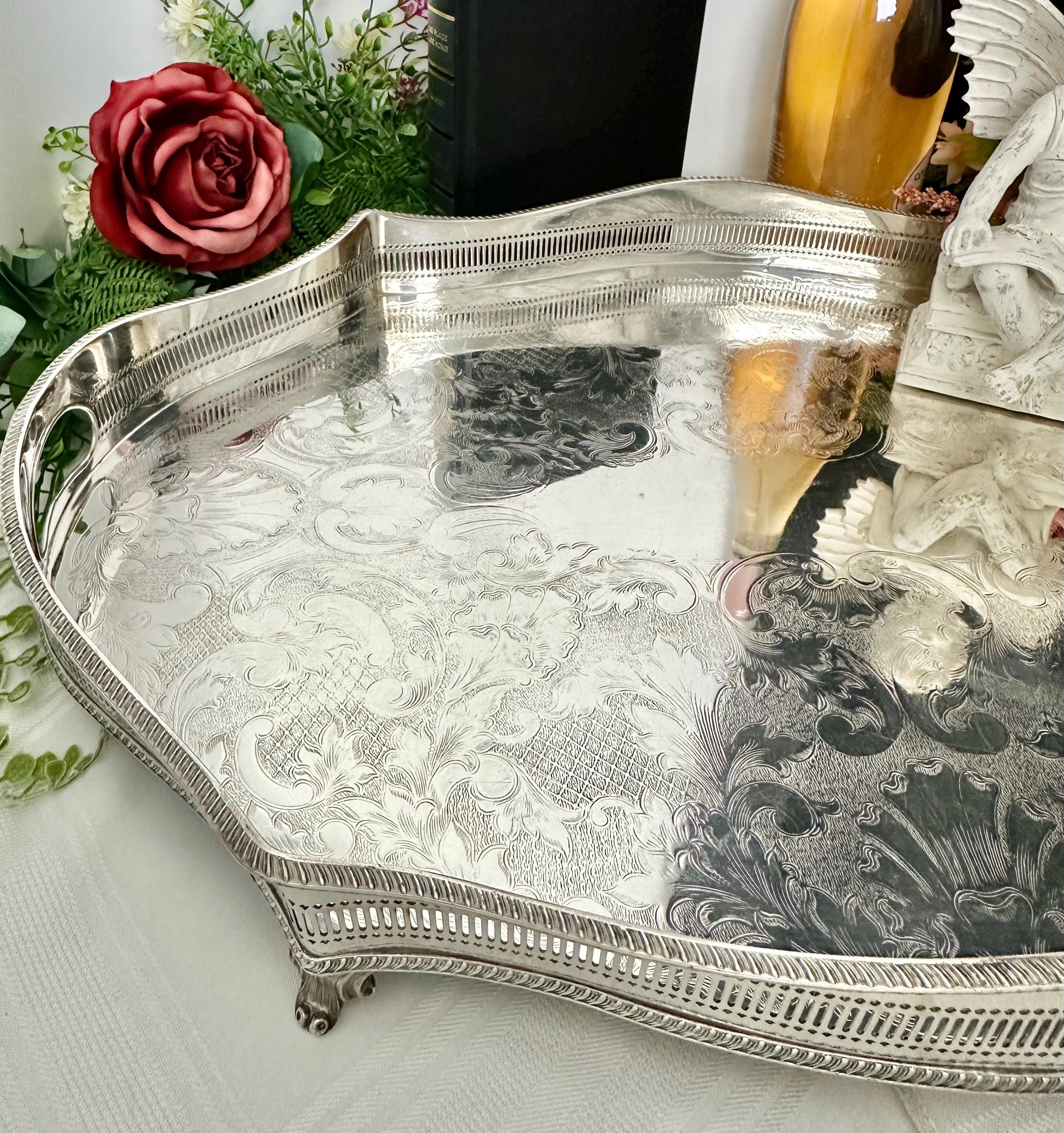 This is for a Sheffield silver-plated Gallery tray with a classic design and with beautiful craftsmanship. The reproduction piece, inspired by the silverware traditions of England it boasts a sophisticated American Victorian etched pattern that brings a touch of vintage opulence to any setting.