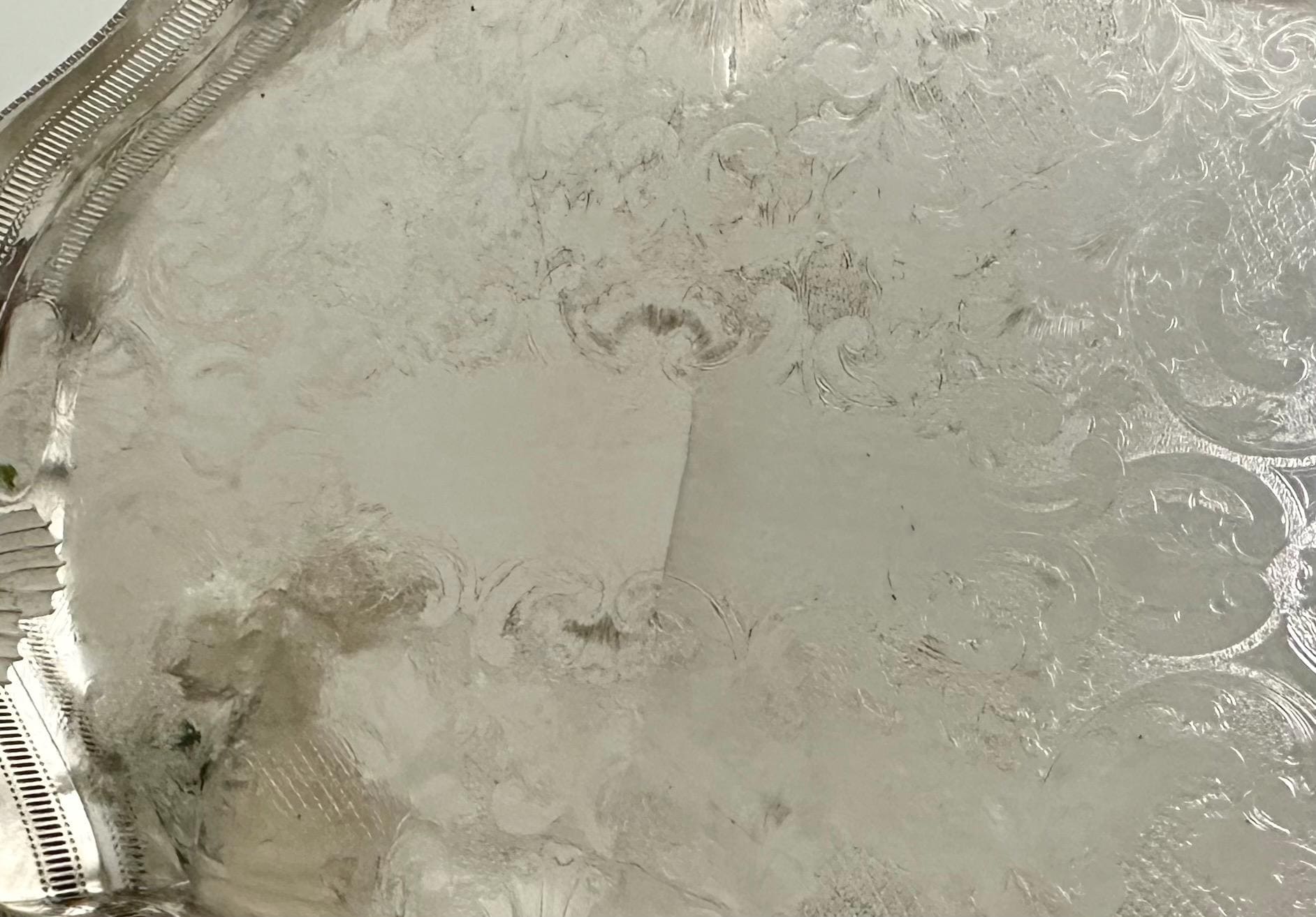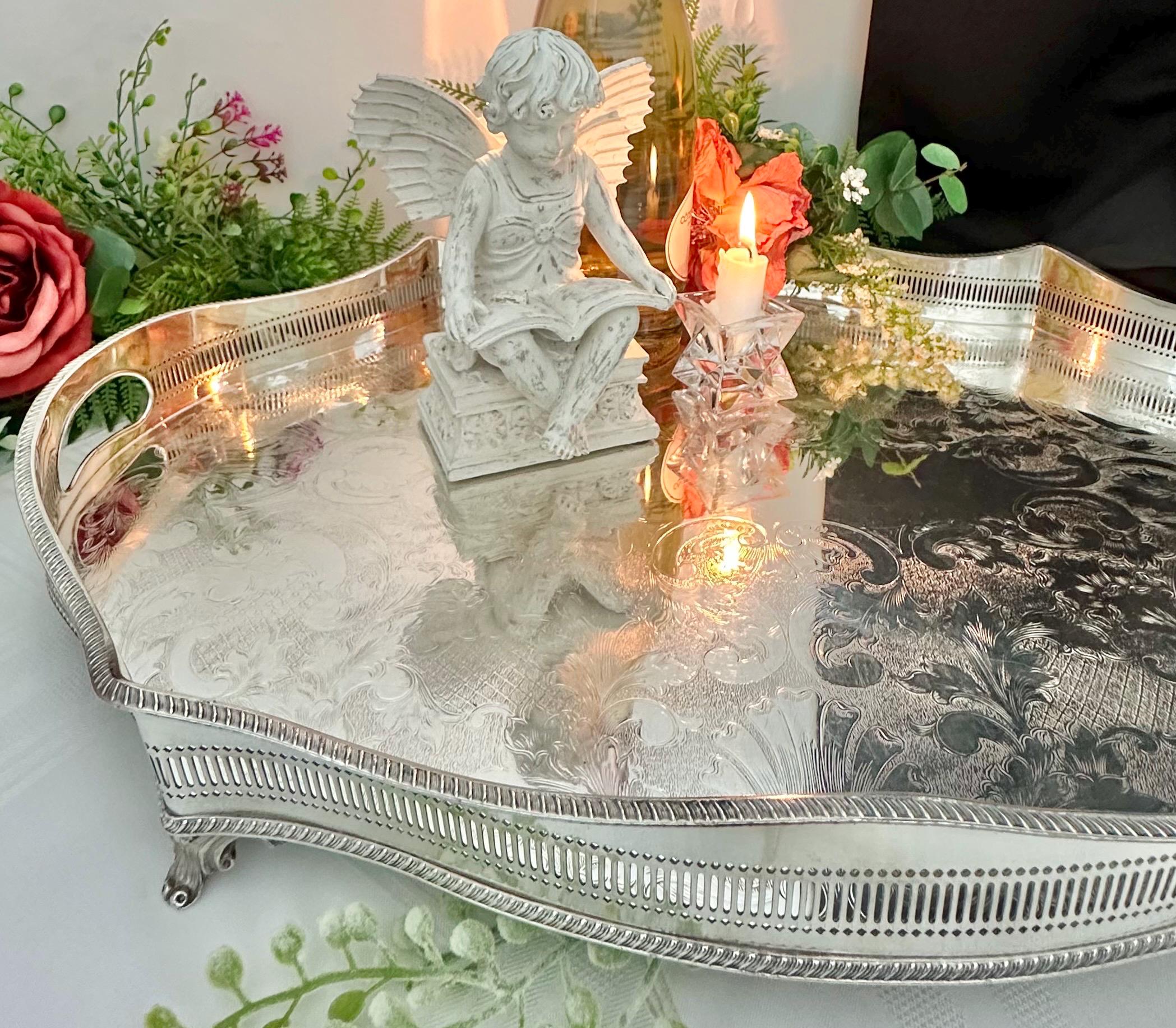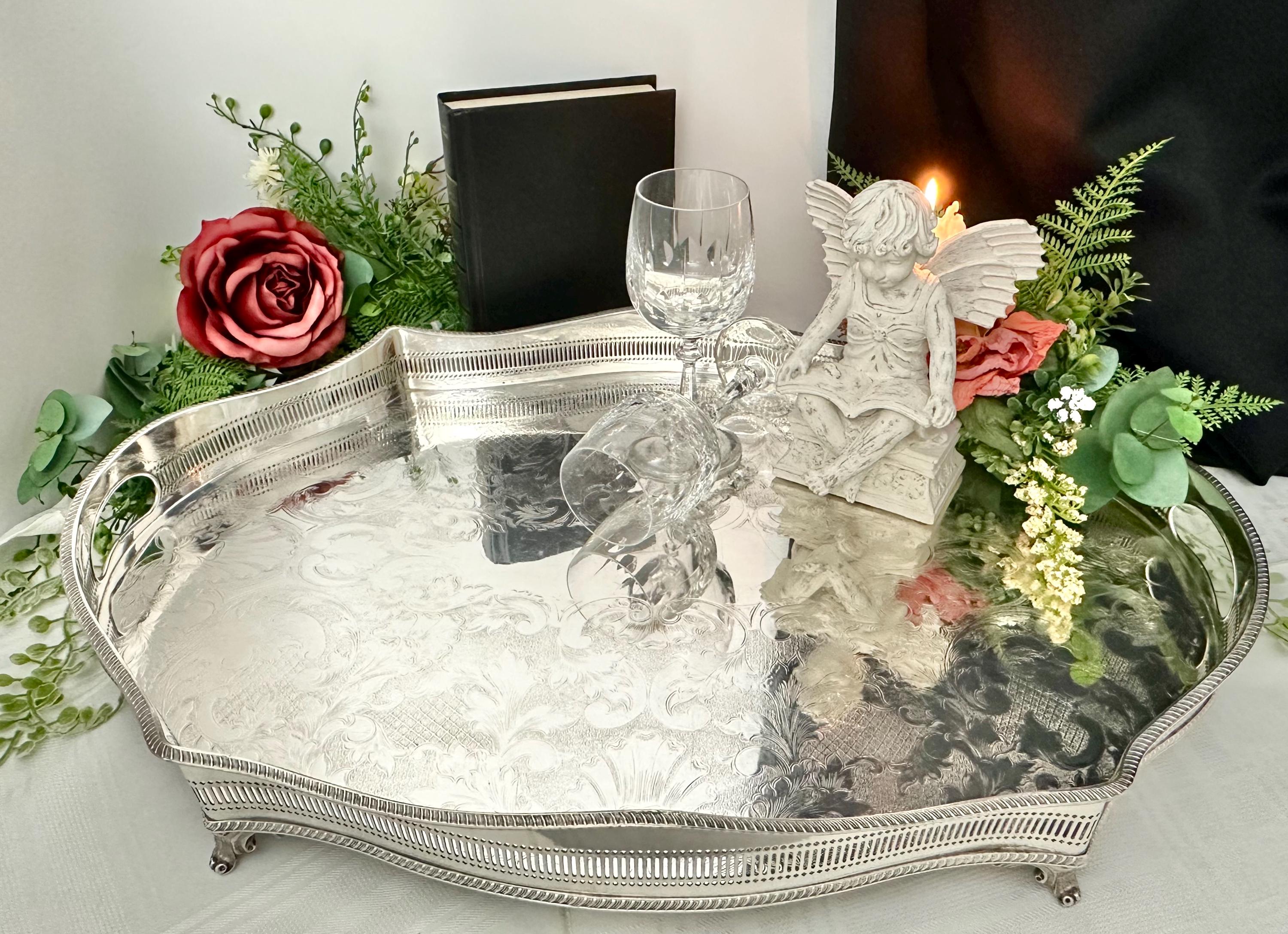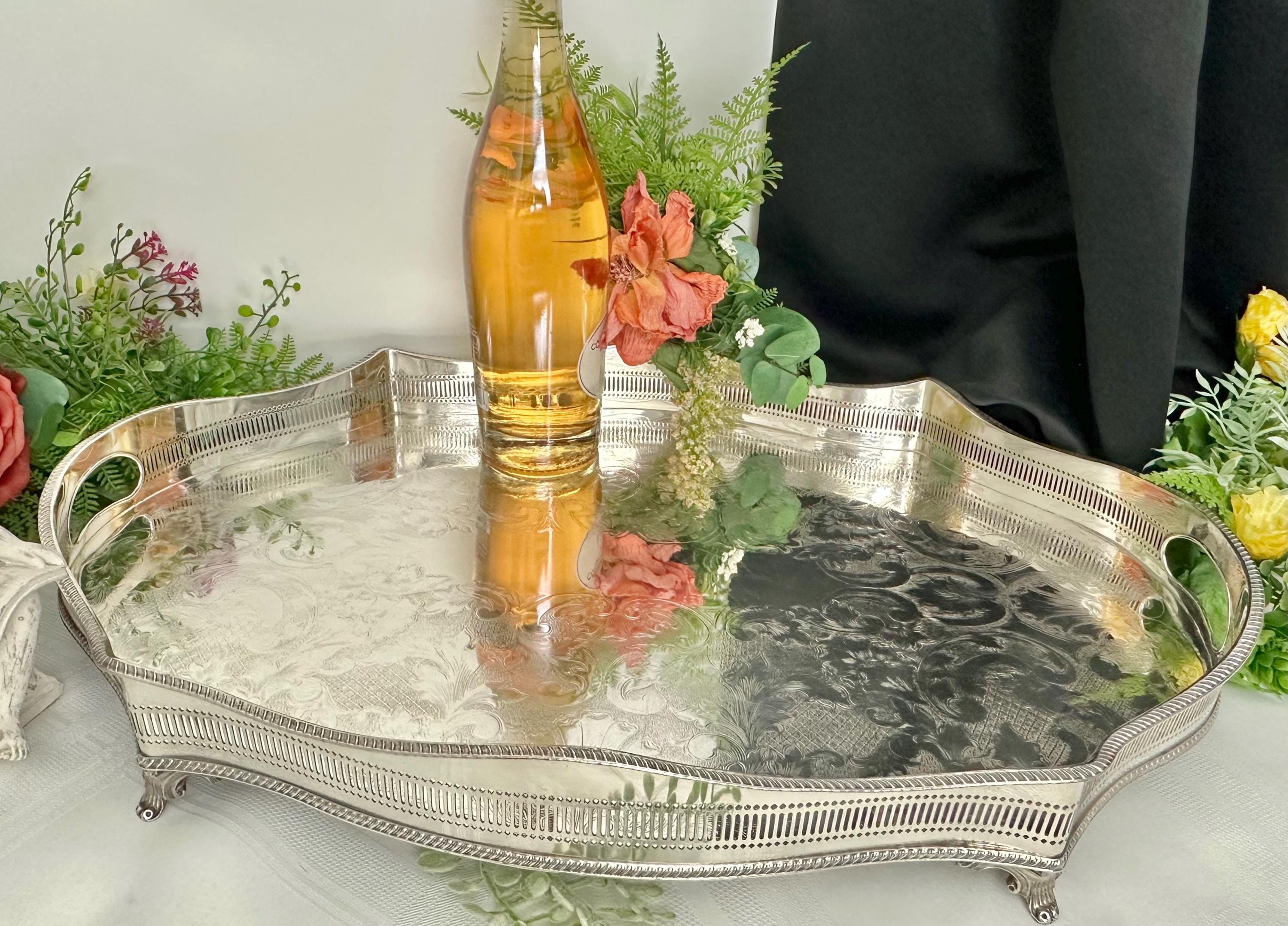 This is for a Sheffield silver-plated Gallery tray with a classic design and with beautiful craftsmanship. The reproduction piece, inspired by the silverware traditions of England it boasts a sophisticated American Victorian etched pattern that brings a touch of vintage opulence to any setting.
