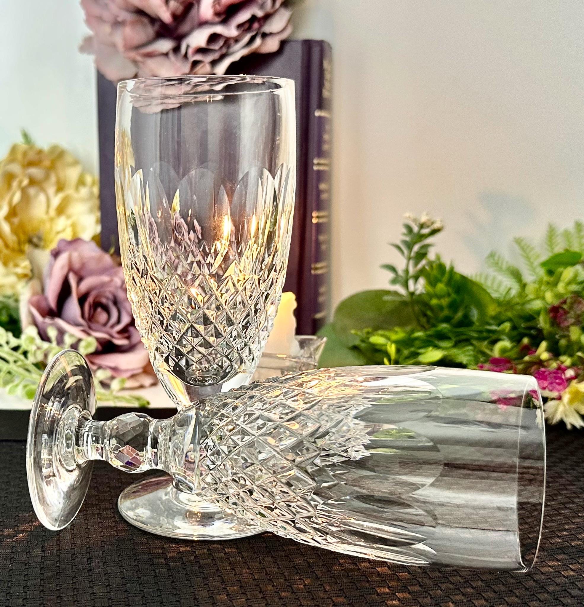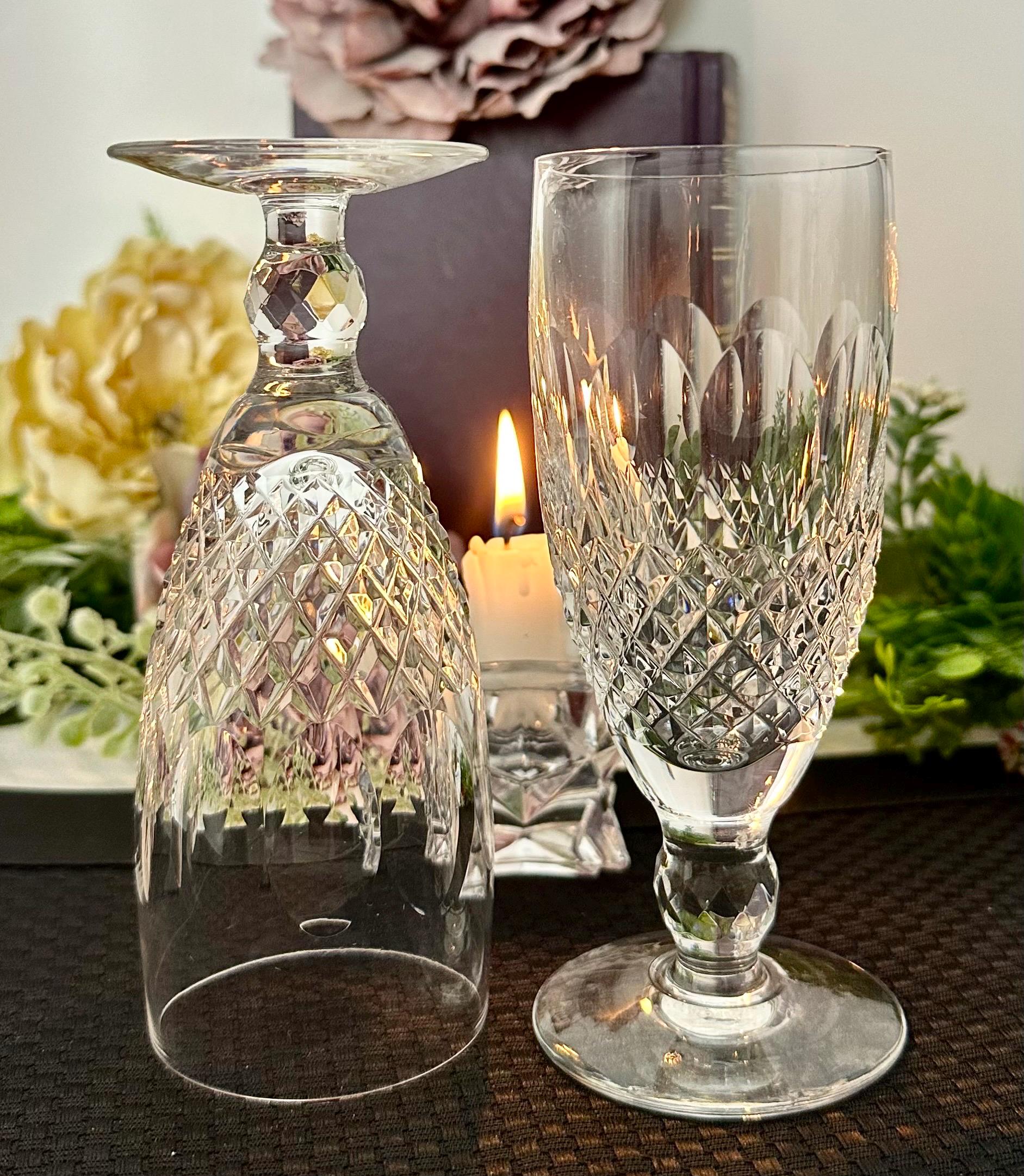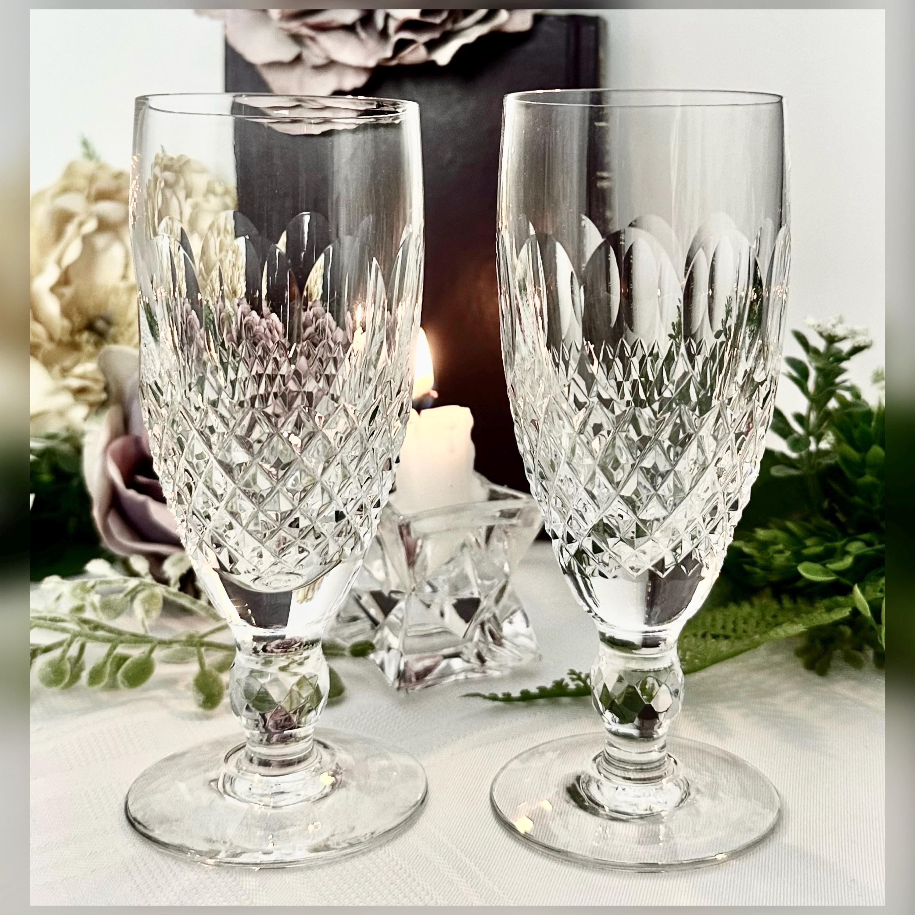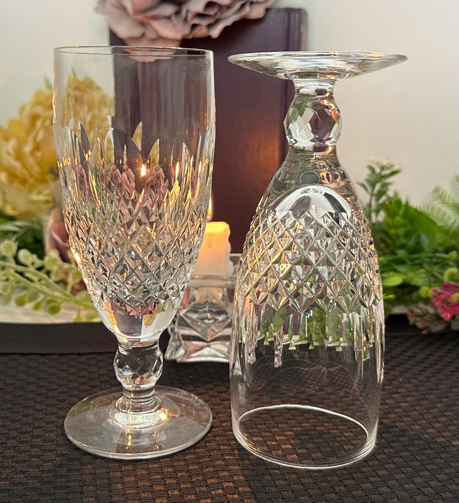 Handmade in Ireland, these stemmed champagne flutes feature a crisscross and oval cut design, adding a touch of sophistication to any toast. They have a cut knob in the stem and a plain foot. They are watermarked with the Waterford name.