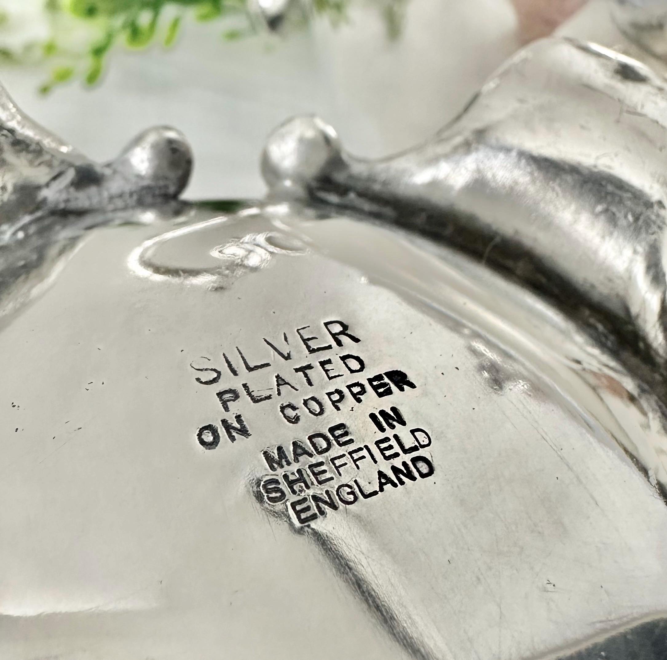 The finals on the pieces are leaves with acorns. These pieces are very heavy and are silver plated over copper, and marked Made in Sheffield England. The items have swirls on the handles to clean decorative lines on the rims with thick statement piece feet.