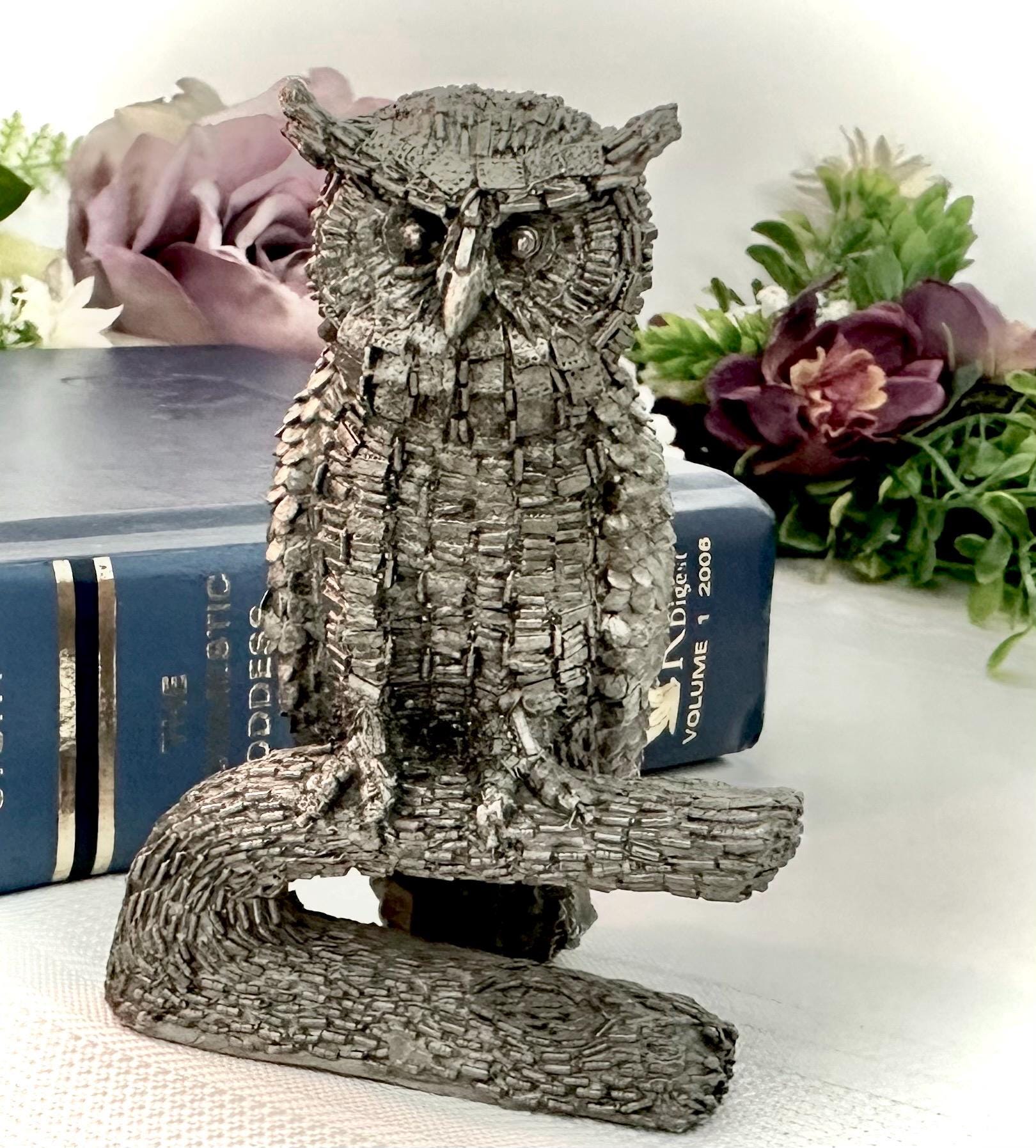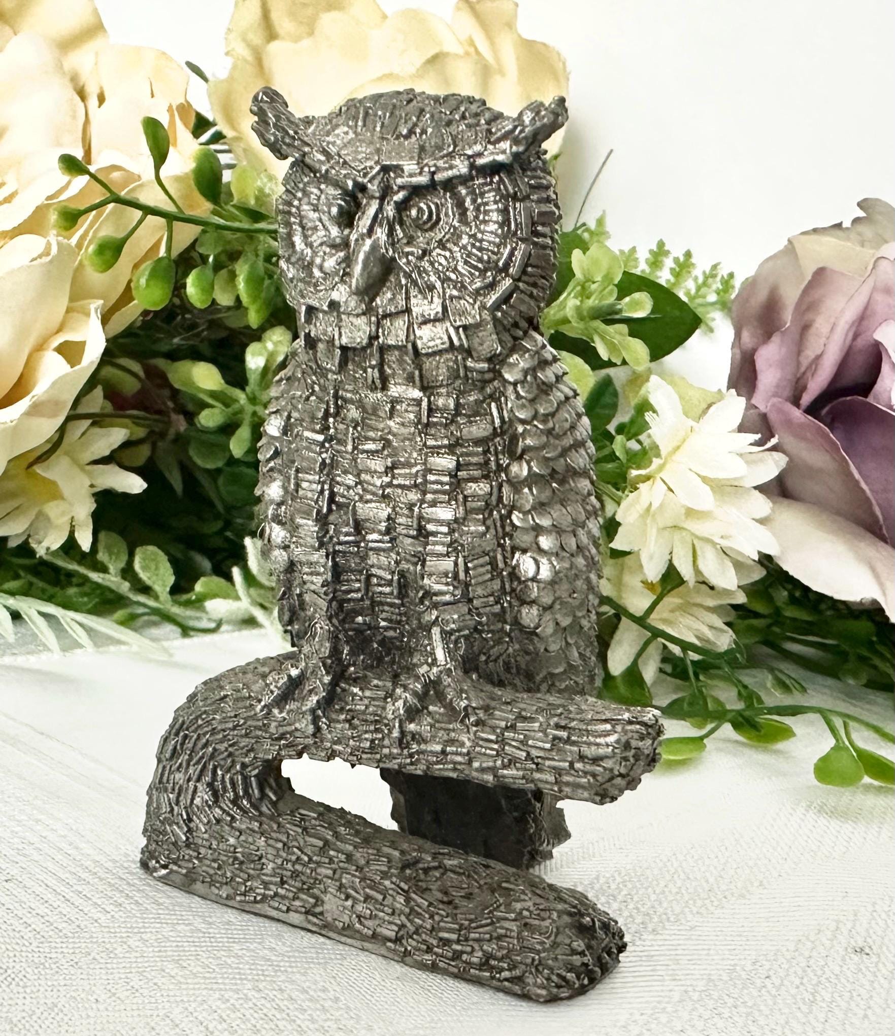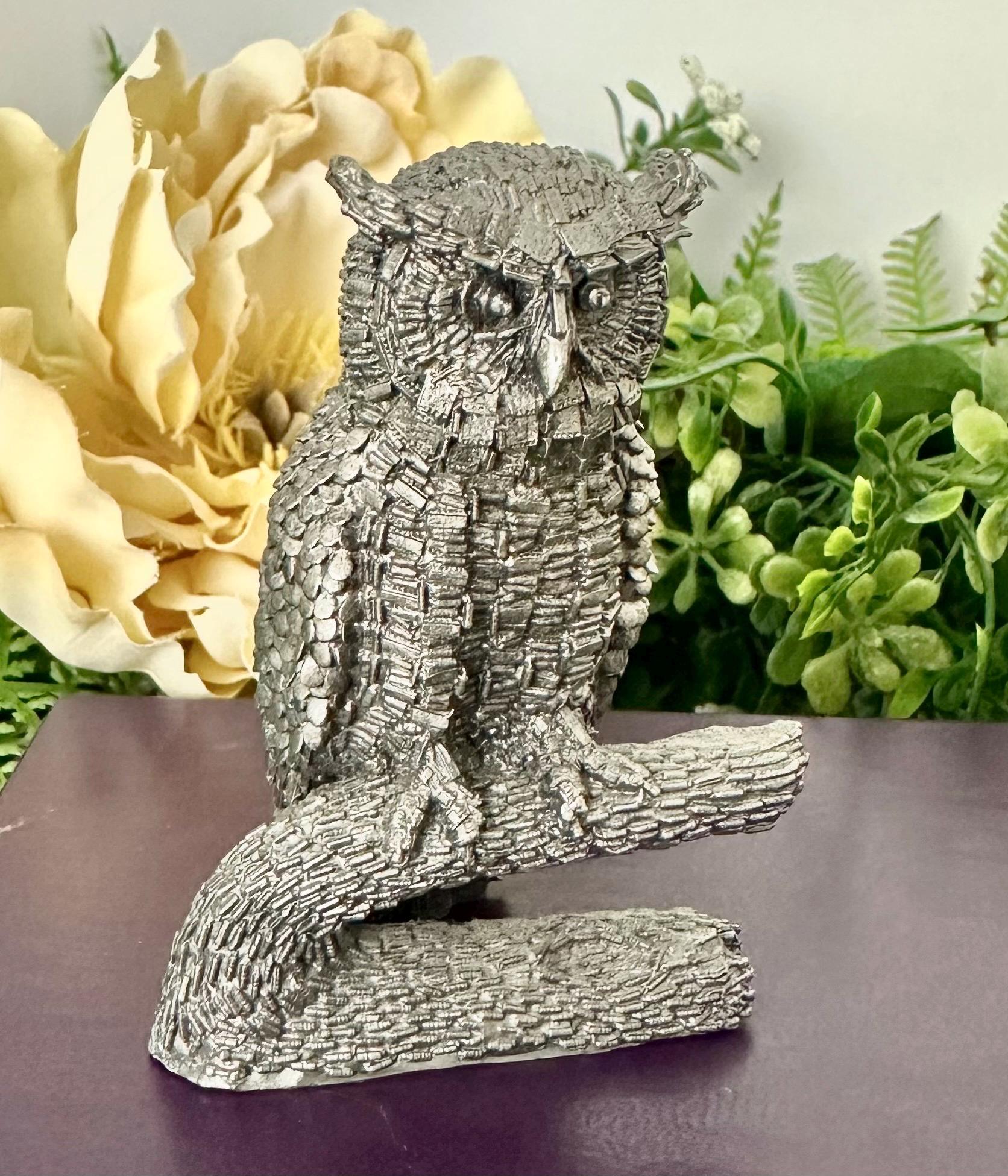 This is for a Vintage Honeywell Hudson Pewter Wise Owl Paperweight / Statue / Figurine. This is a charming desk decor piece standing at 3 inches tall. Made of pewter, this figurine features a wise owl design that adds a touch of whimsy to any space.