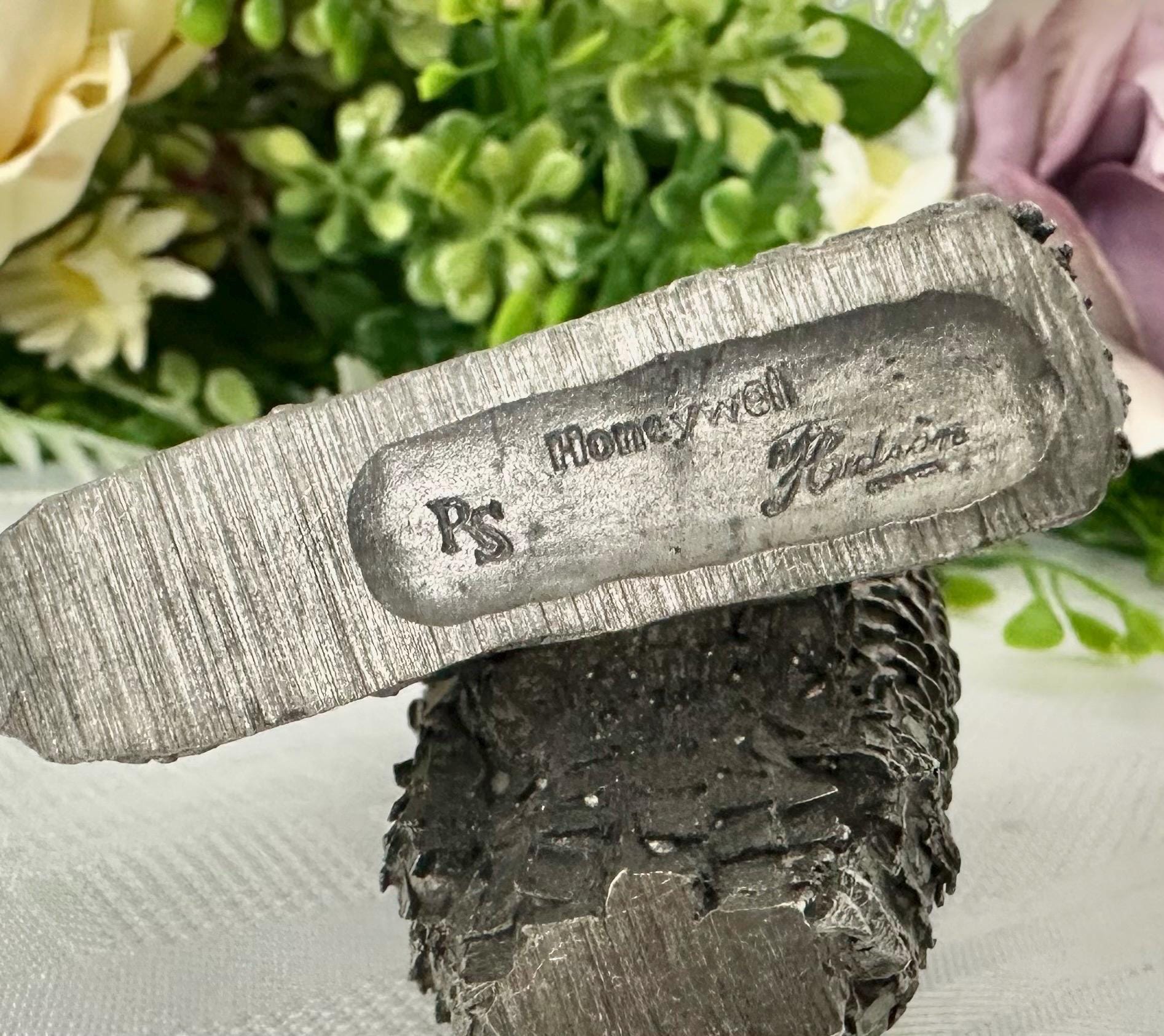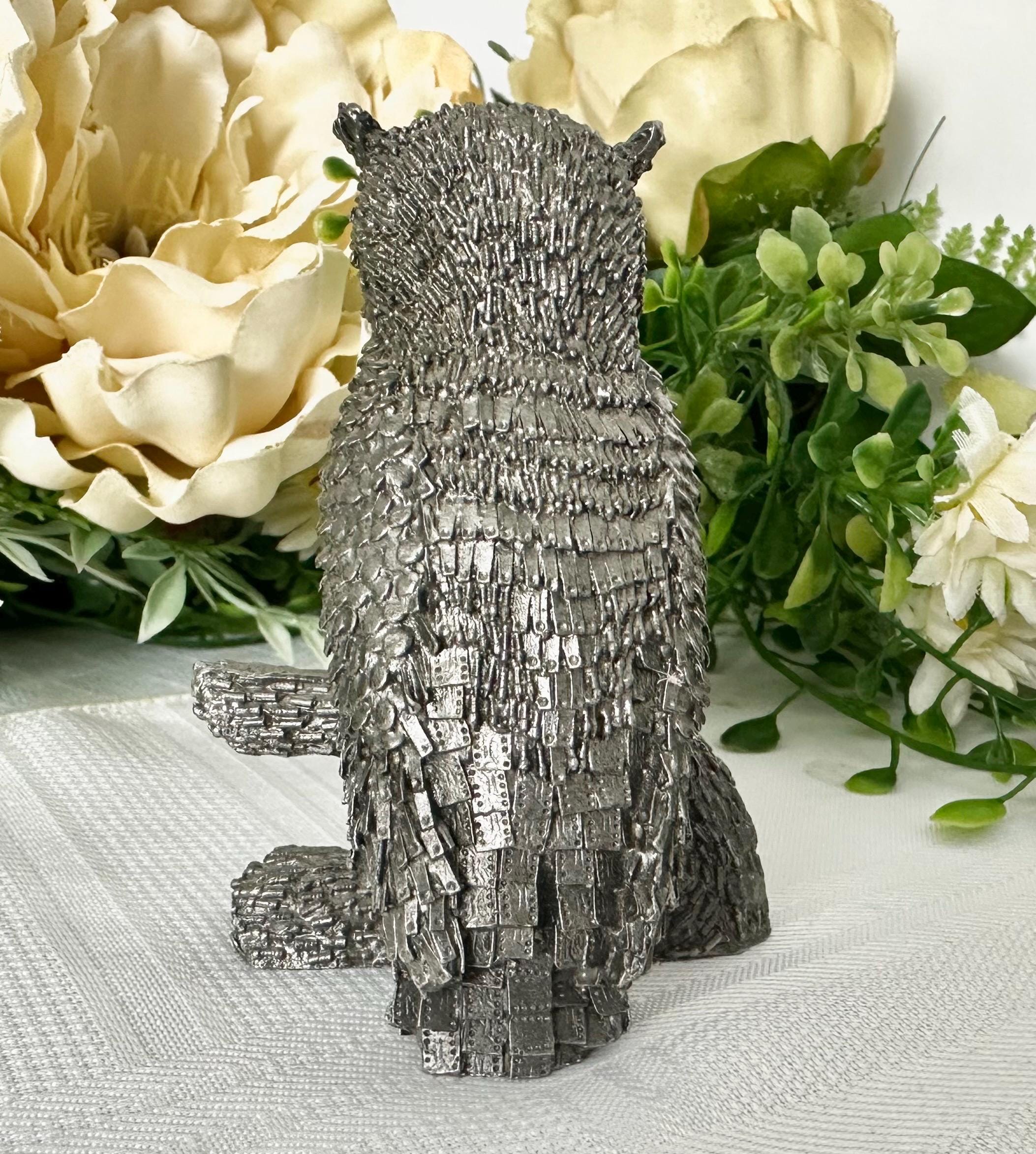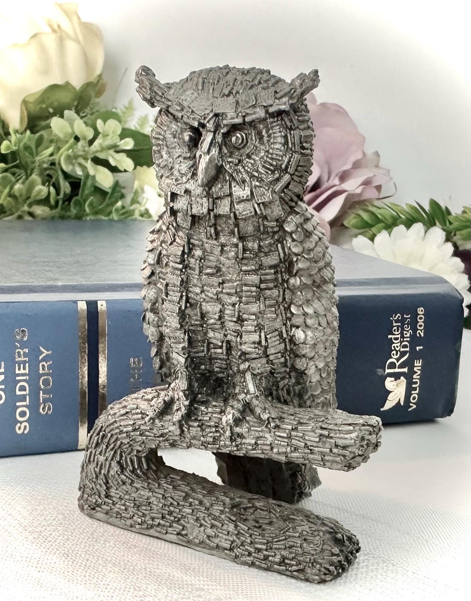 This is for a Vintage Honeywell Hudson Pewter Wise Owl Paperweight / Statue / Figurine. This is a charming desk decor piece standing at 3 inches tall. Made of pewter, this figurine features a wise owl design that adds a touch of whimsy to any space.