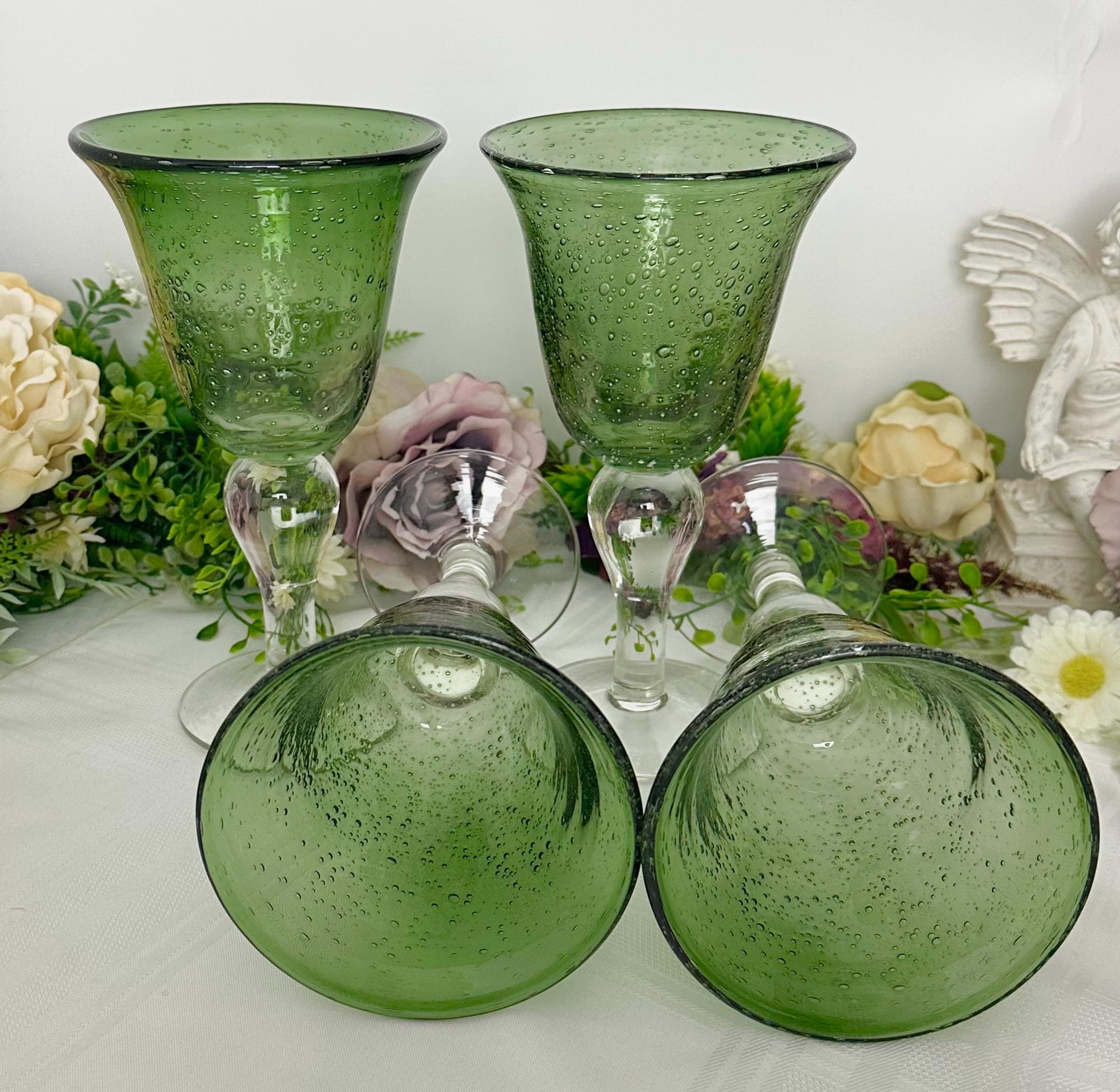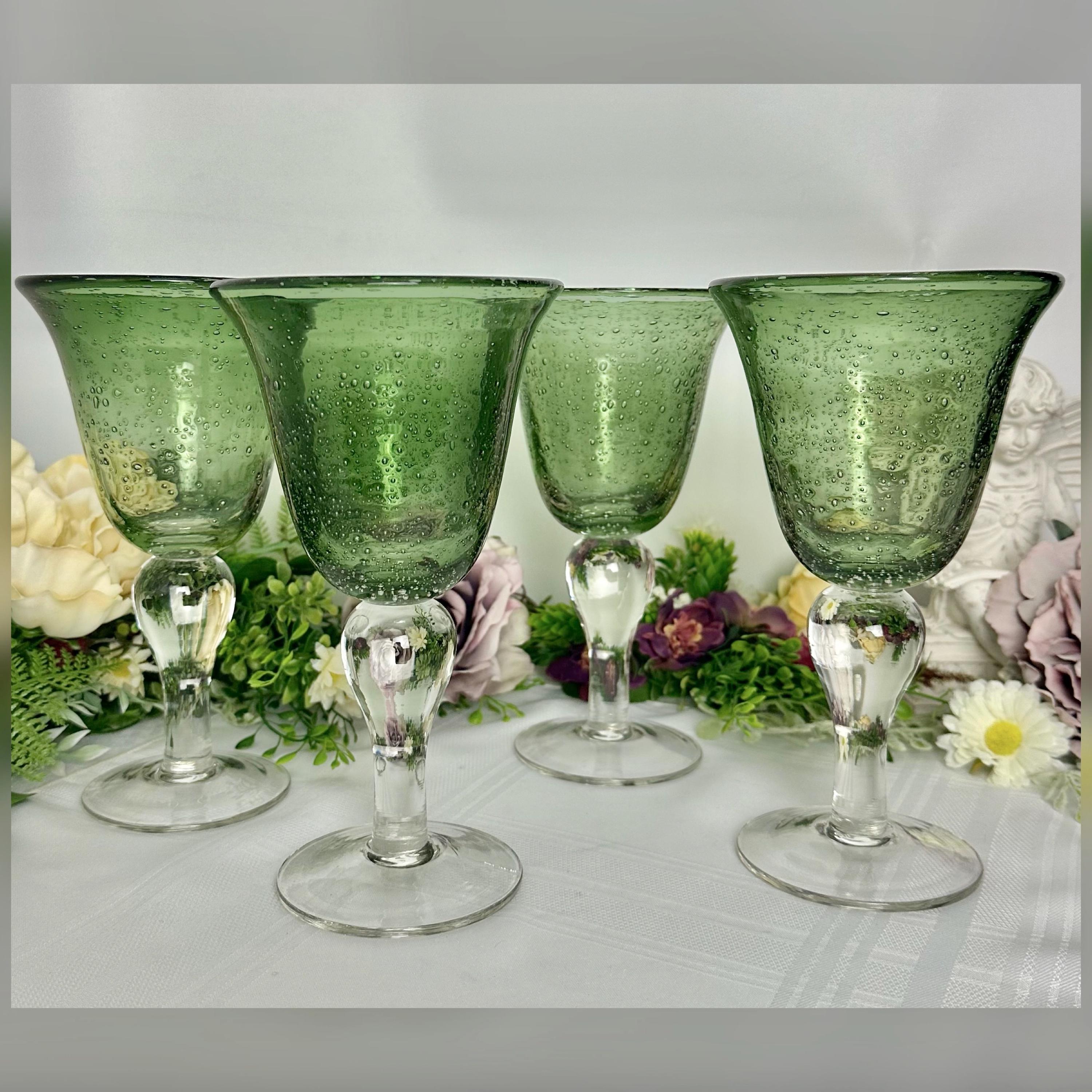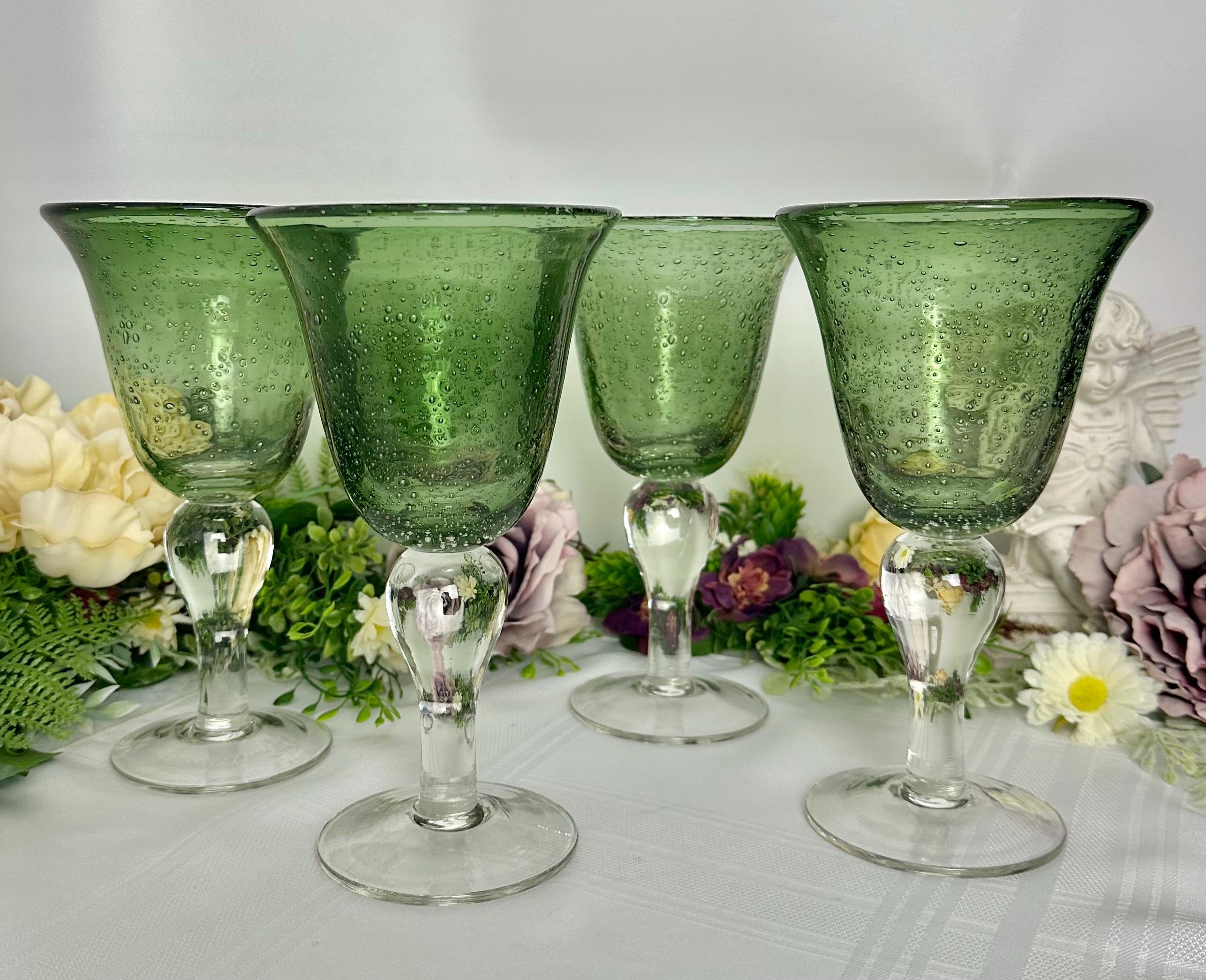 This is for a set of 4 colored Artland Iris Green Bubble glasses with a clear bulbous stem. The glasses hold approx 14 Oz of liquid. These measure approx 8 1/8 inches tall with a diameter of 4 1/2. These being hand crafted there are slight variations in the exact heigh of the glasses.