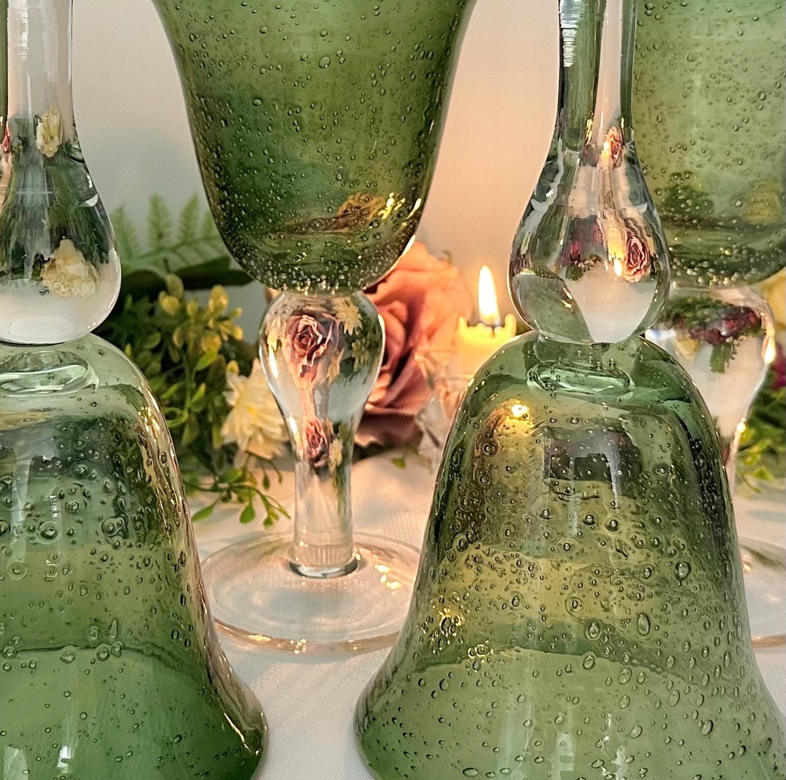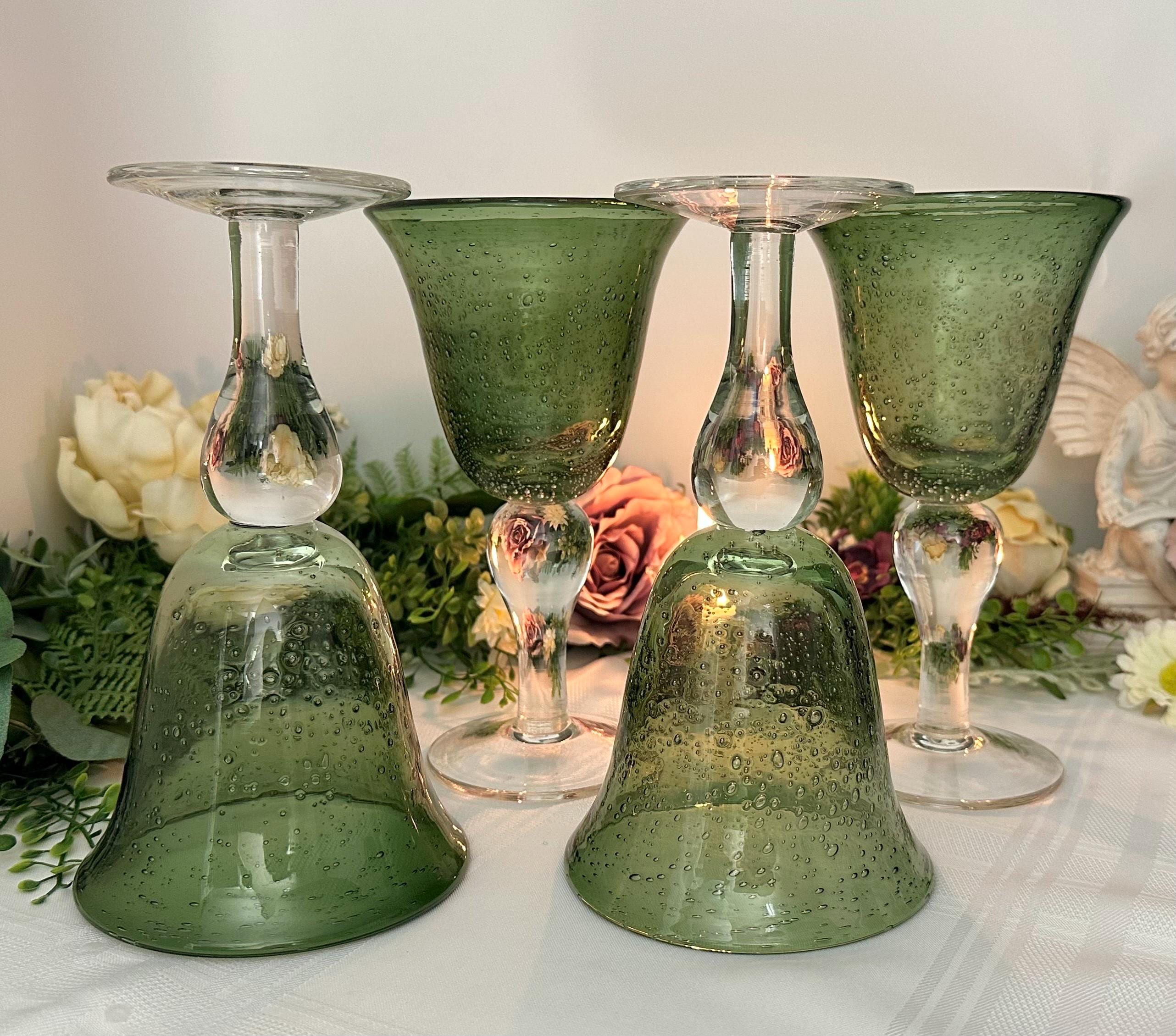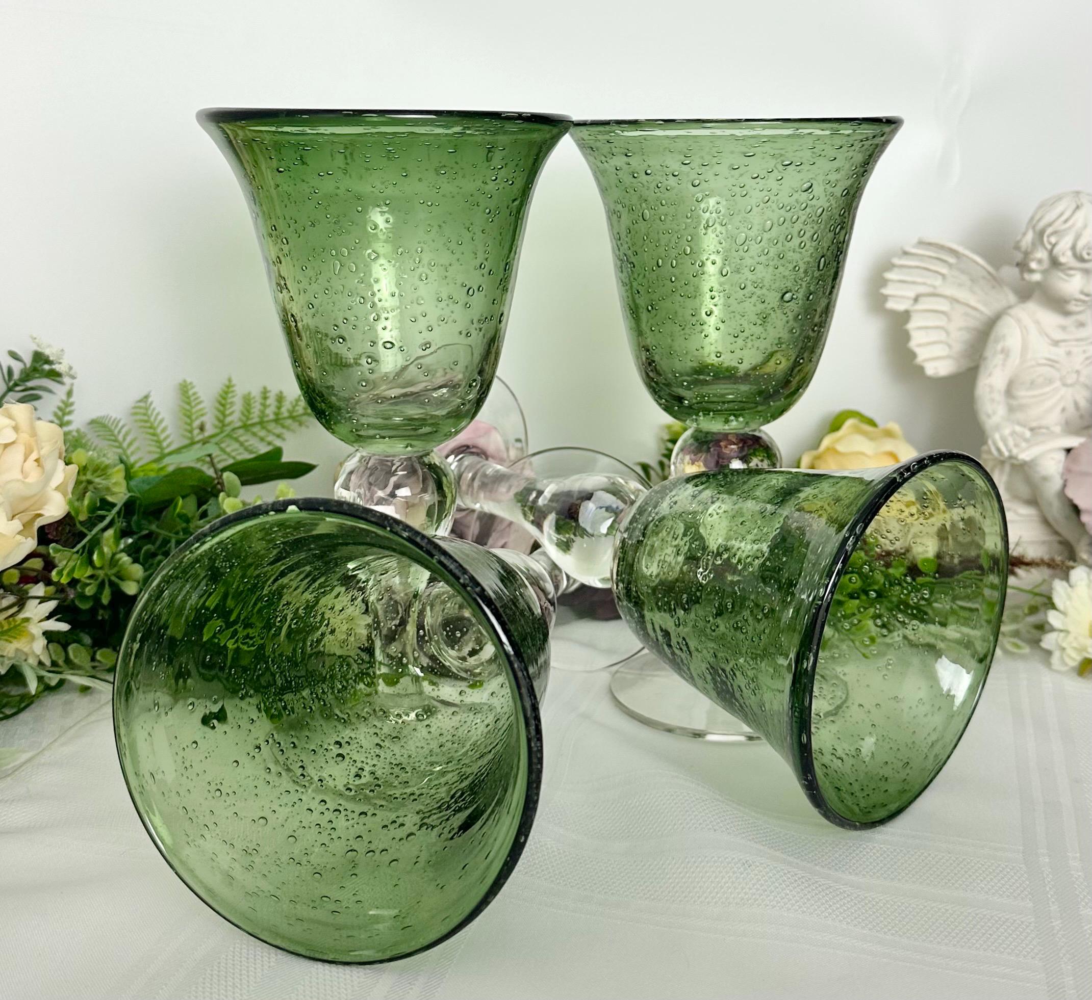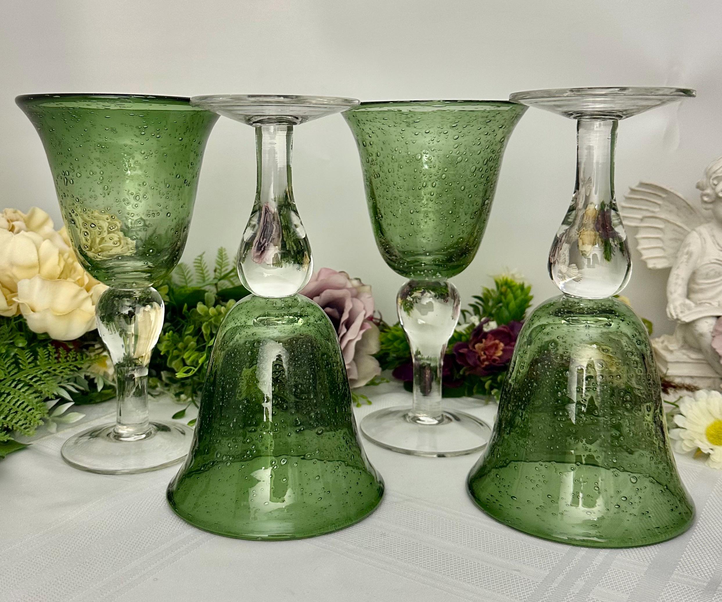 This is for a set of 4 colored Artland Iris Green Bubble glasses with a clear bulbous stem. The glasses hold approx 14 Oz of liquid. These measure approx 8 1/8 inches tall with a diameter of 4 1/2. These being hand crafted there are slight variations in the exact heigh of the glasses.