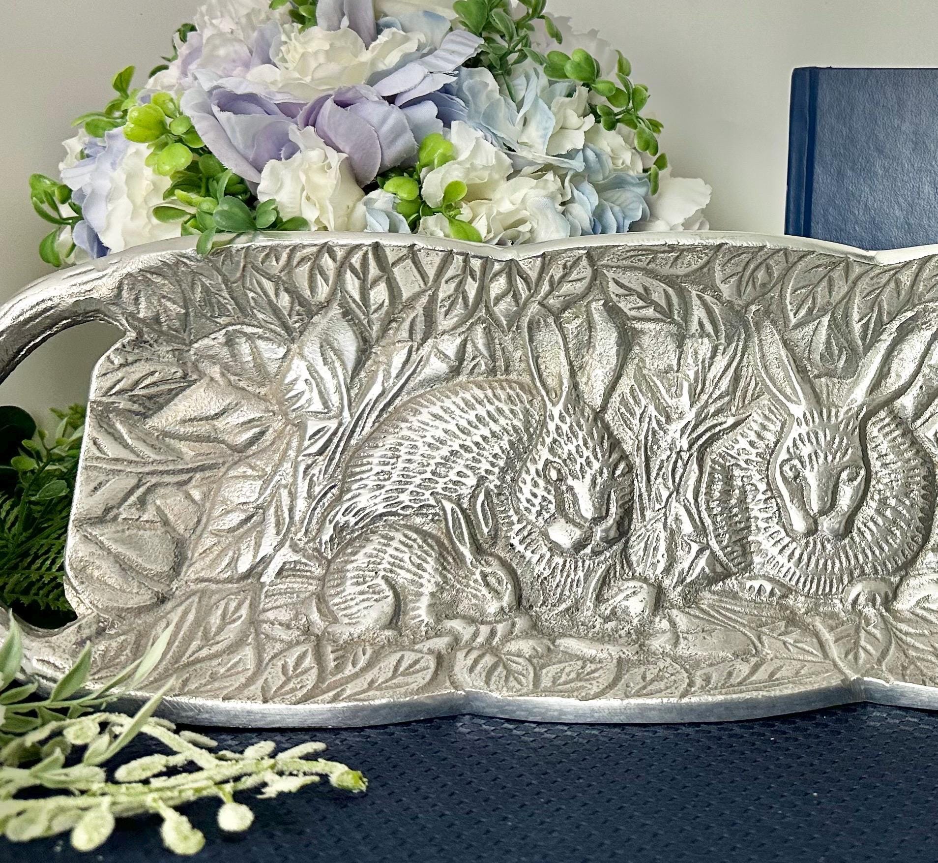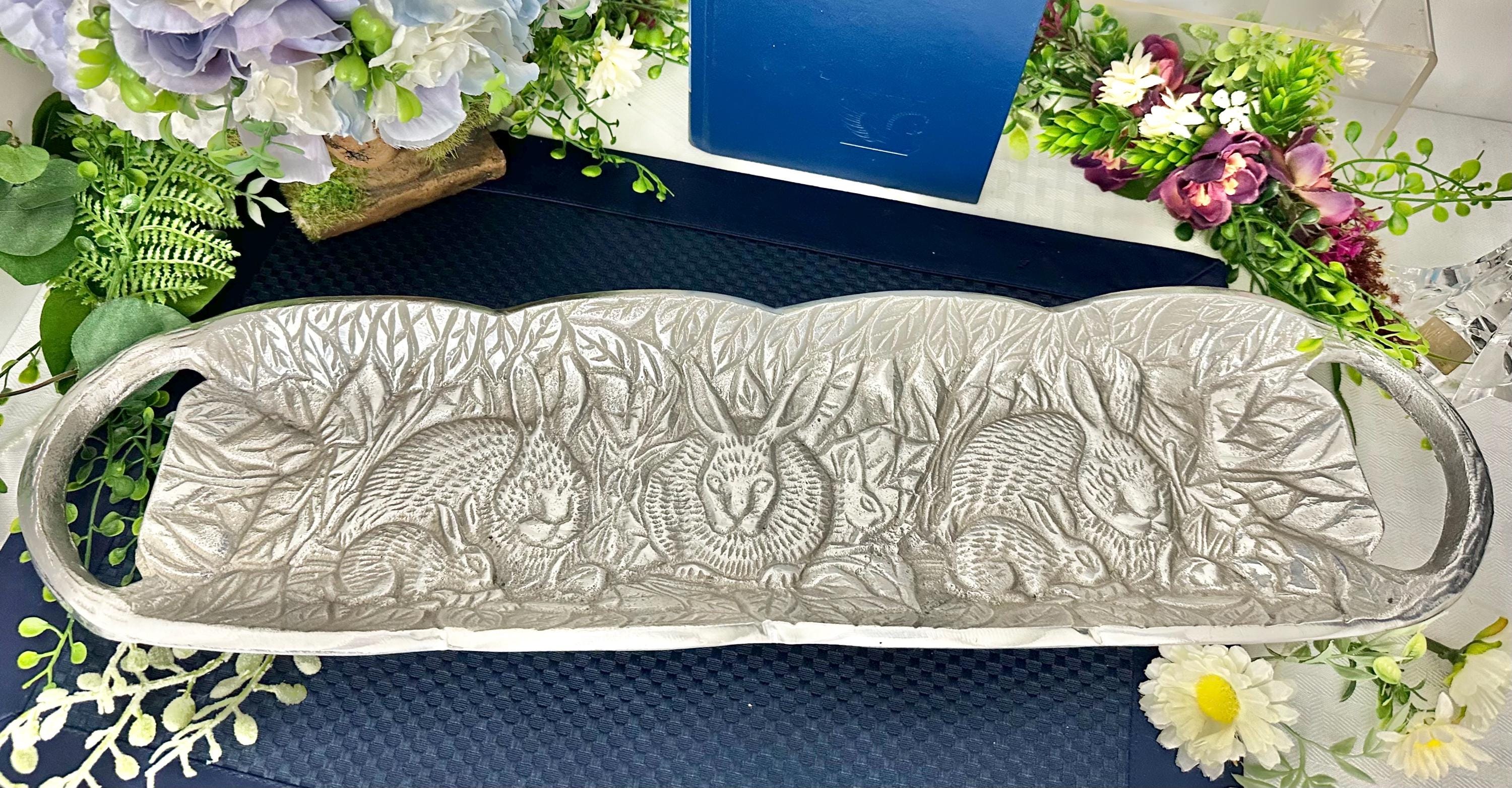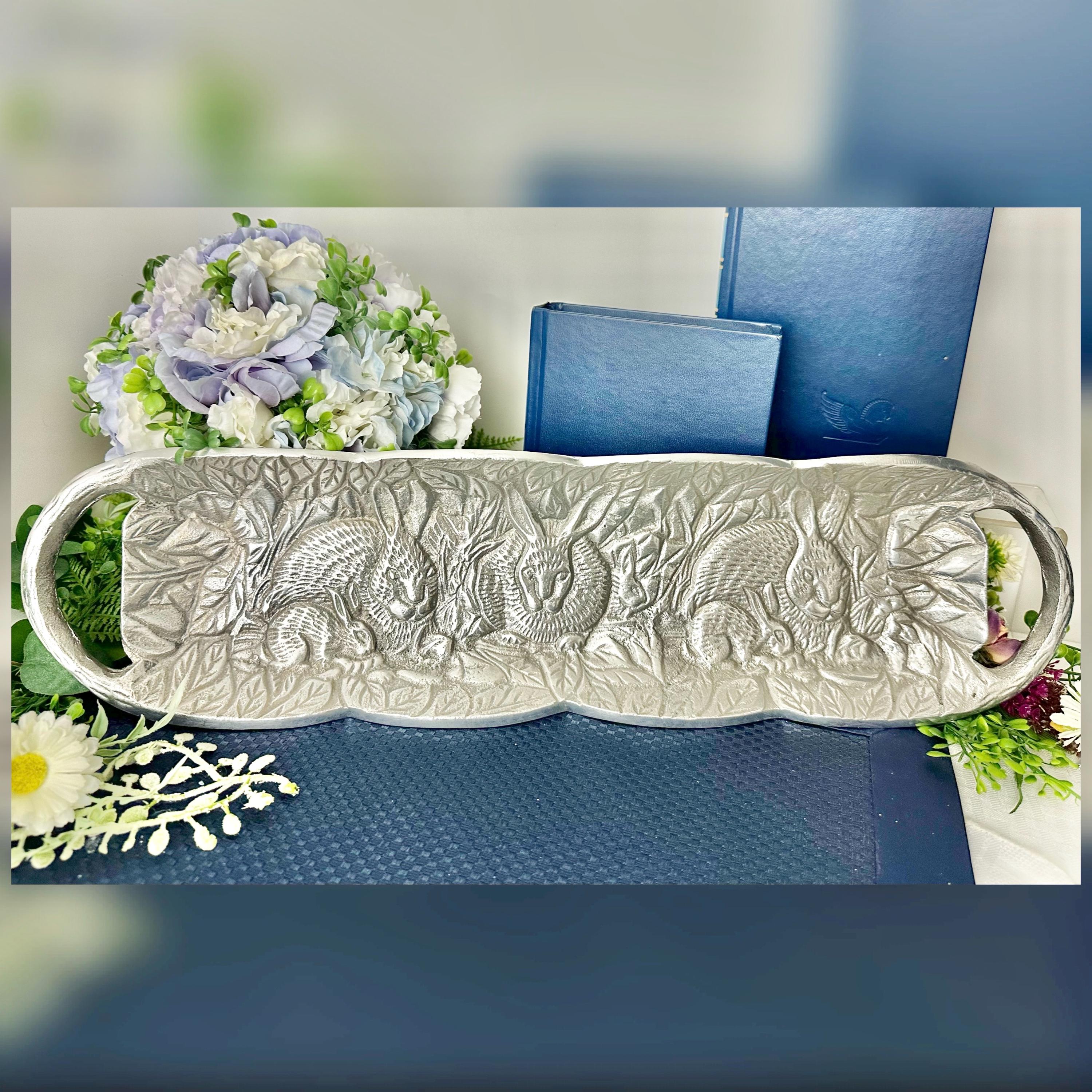 This is for a vintage Wilton Armetale Bunny Rabbit Tray. This vintage pewter serving tray is decorated fully with charming bunny rabbits, perfect for Spring and Easter decor.