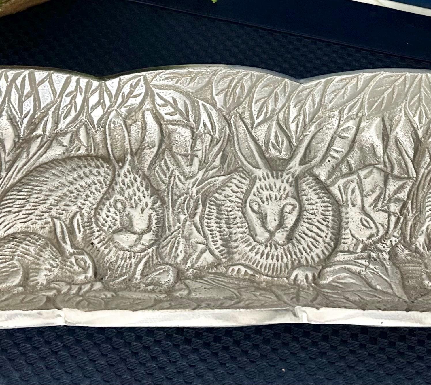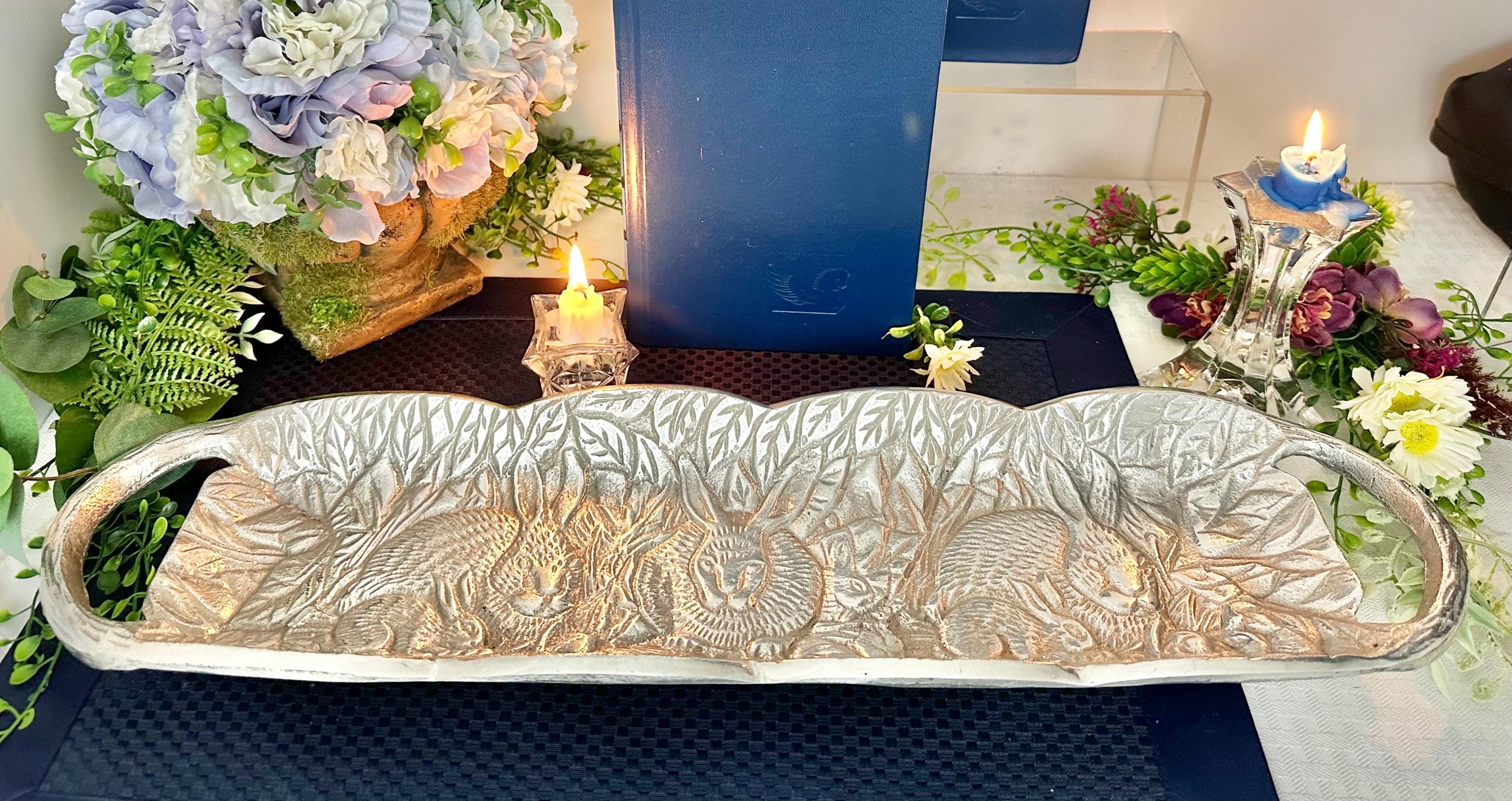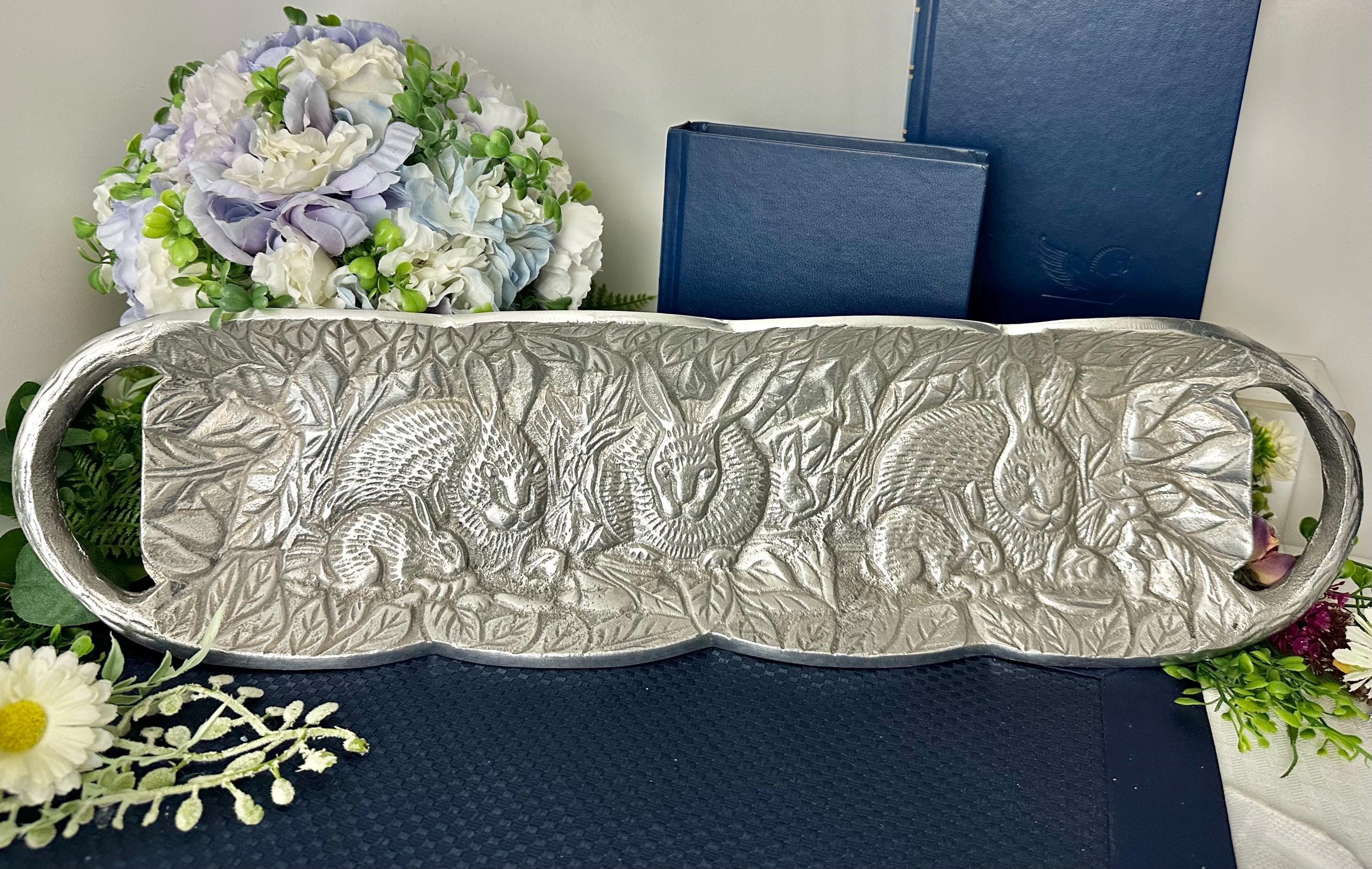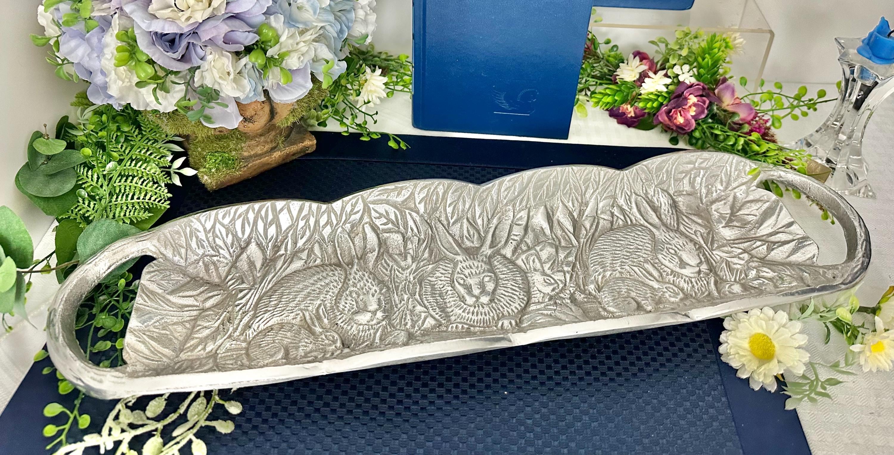 This is for a vintage Wilton Armetale Bunny Rabbit Tray. This vintage pewter serving tray is decorated fully with charming bunny rabbits, perfect for Spring and Easter decor.