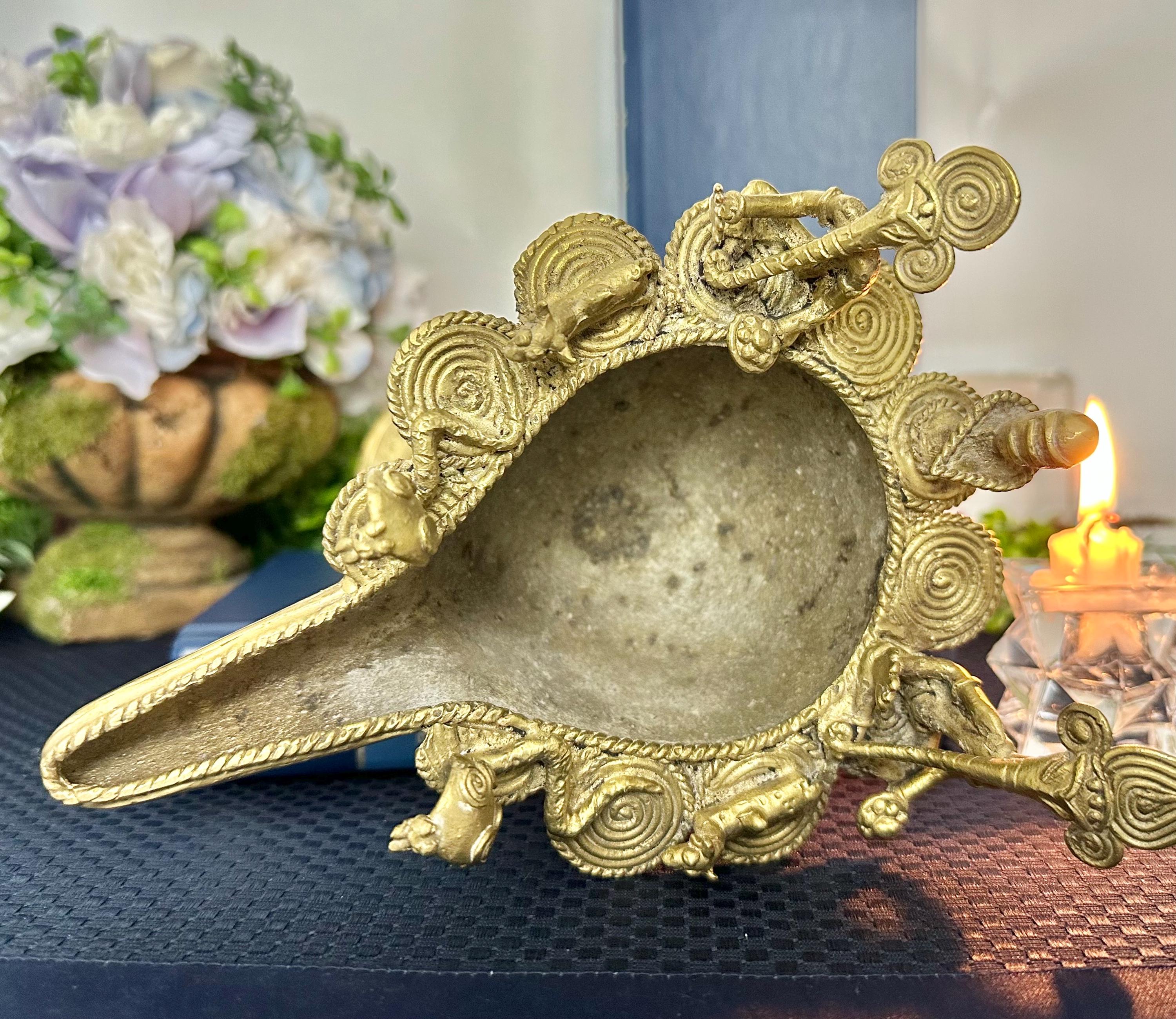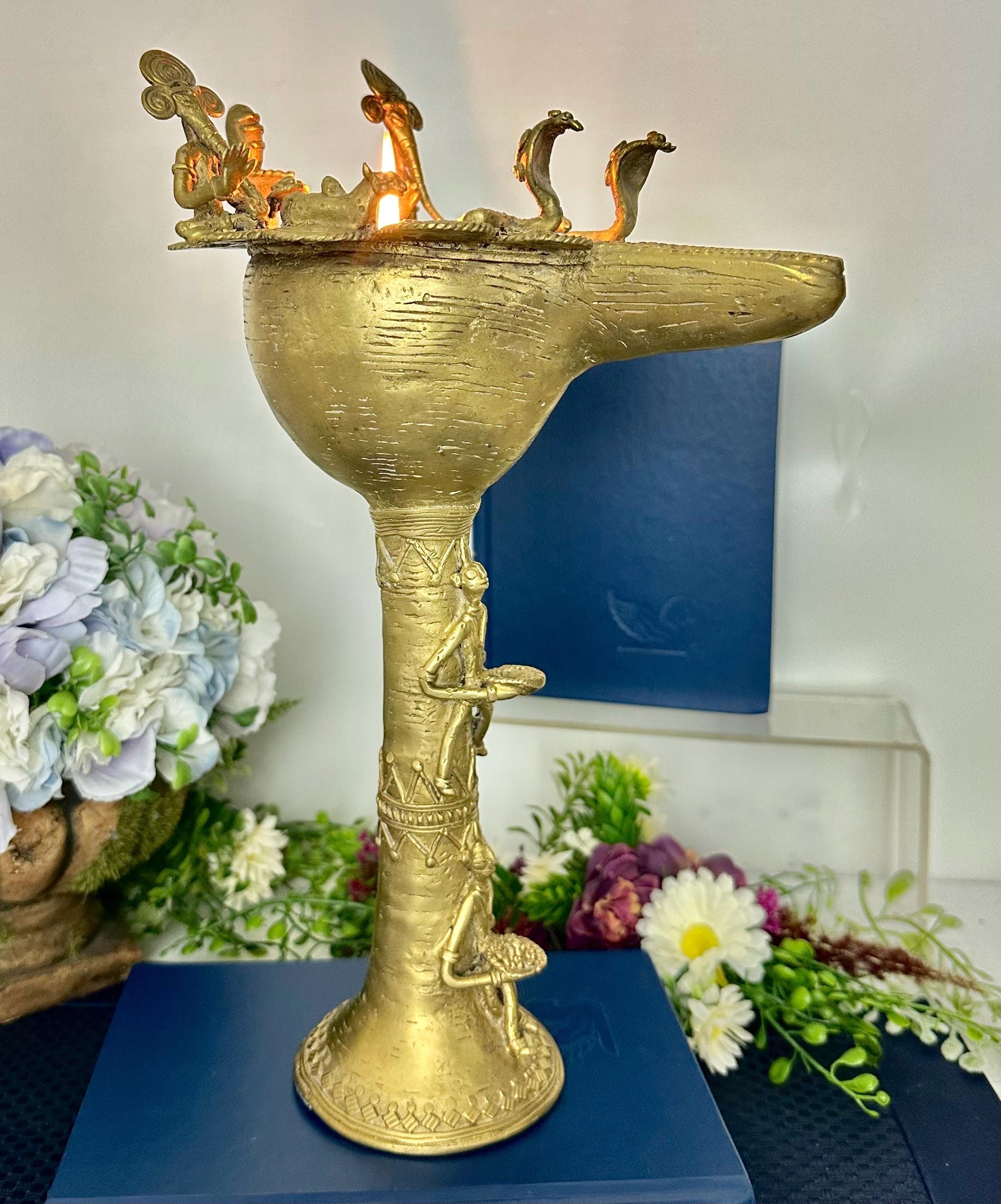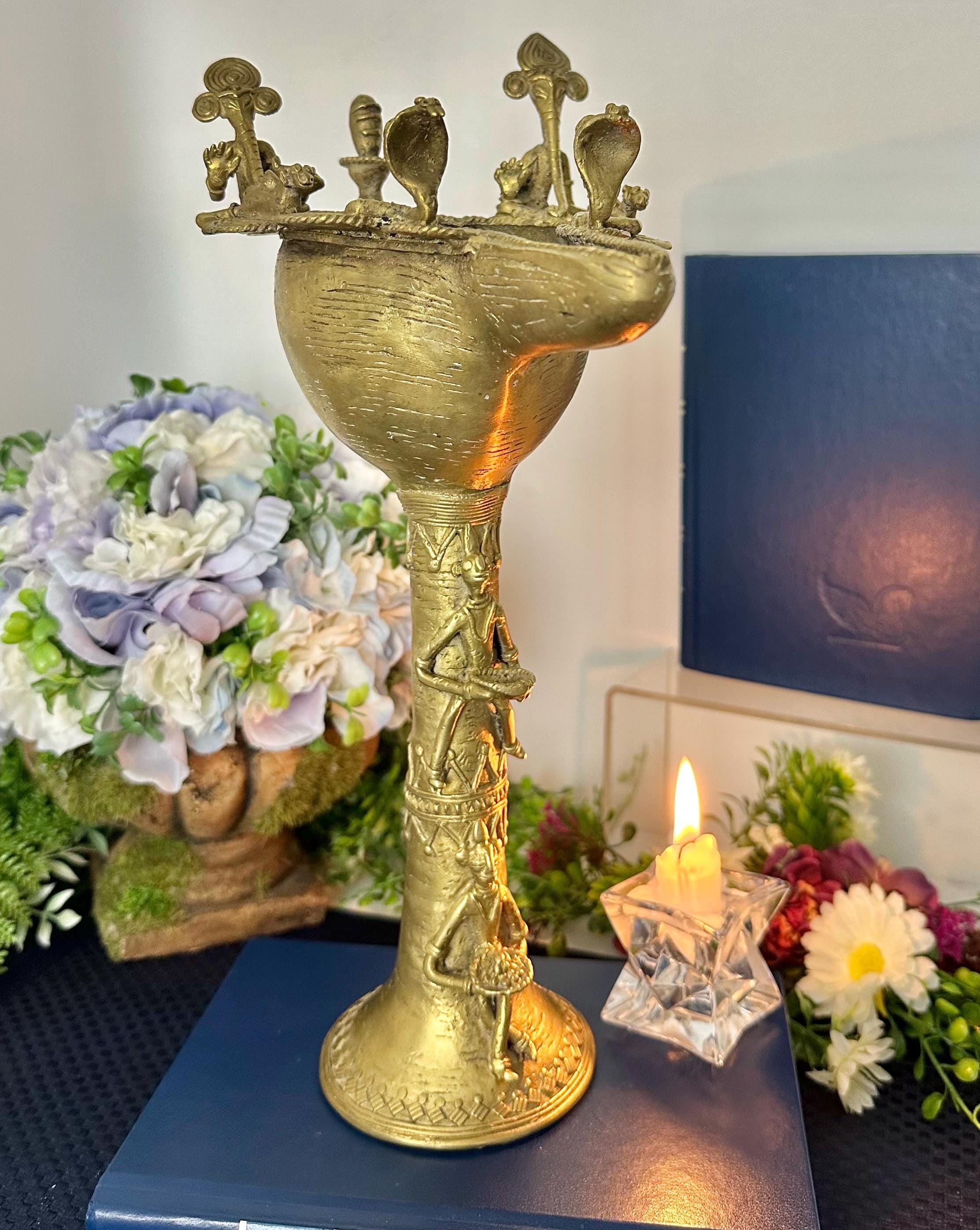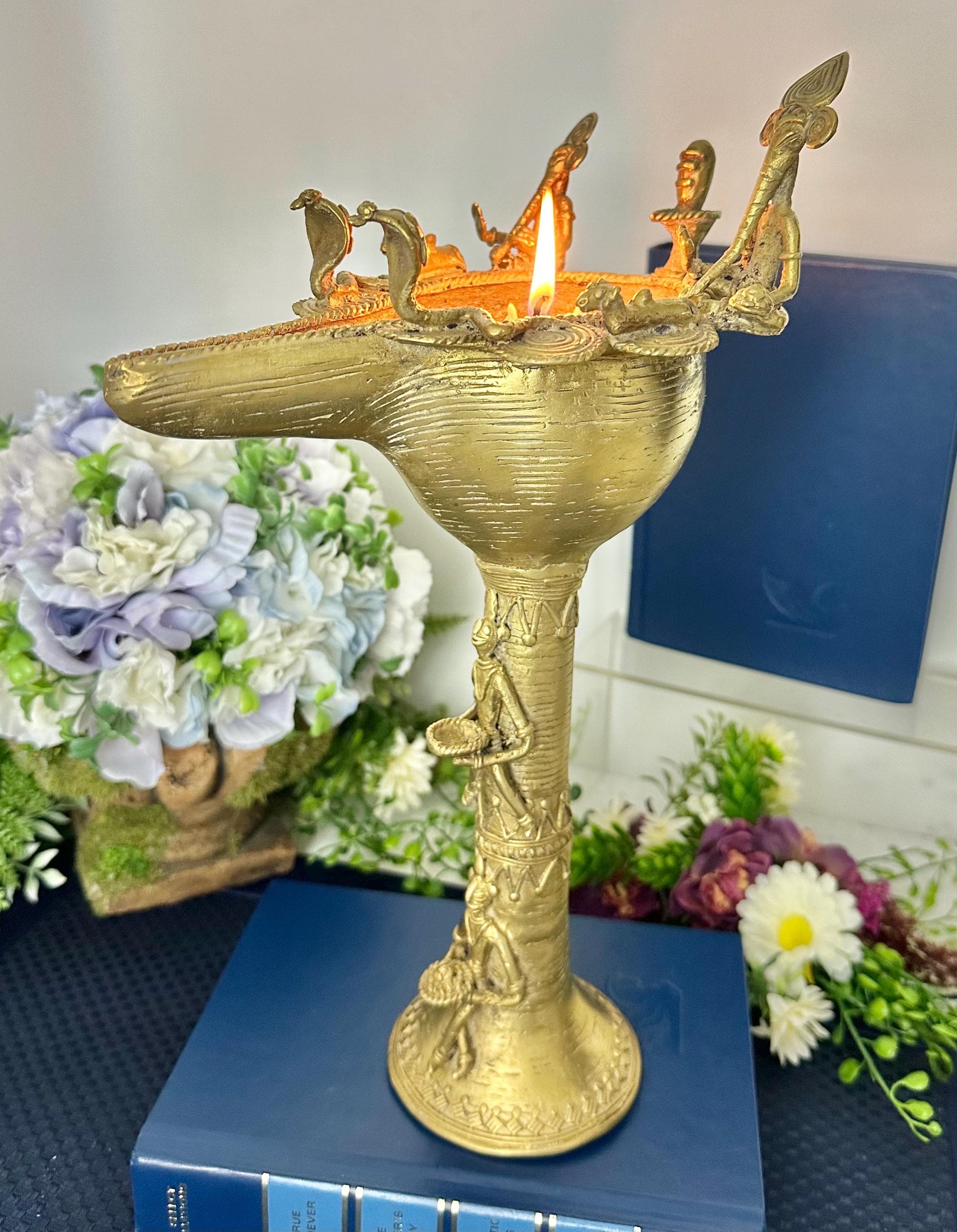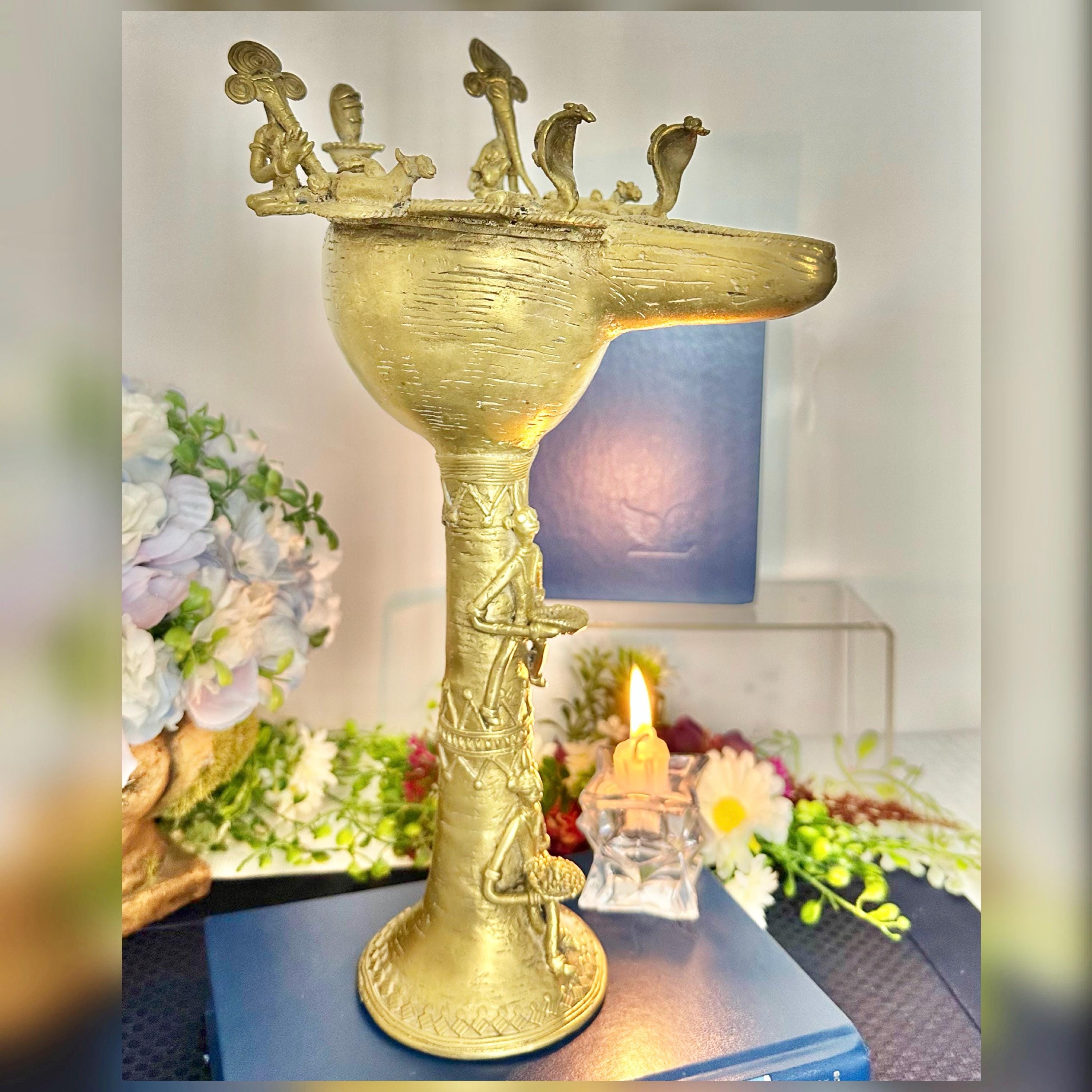 This is for a vintage Dhokra lost-wax cast Century Oil Lamp / Hindu oil lamp. The oil lamp has a significant role in the Hindu Religion and in their homes and temples.